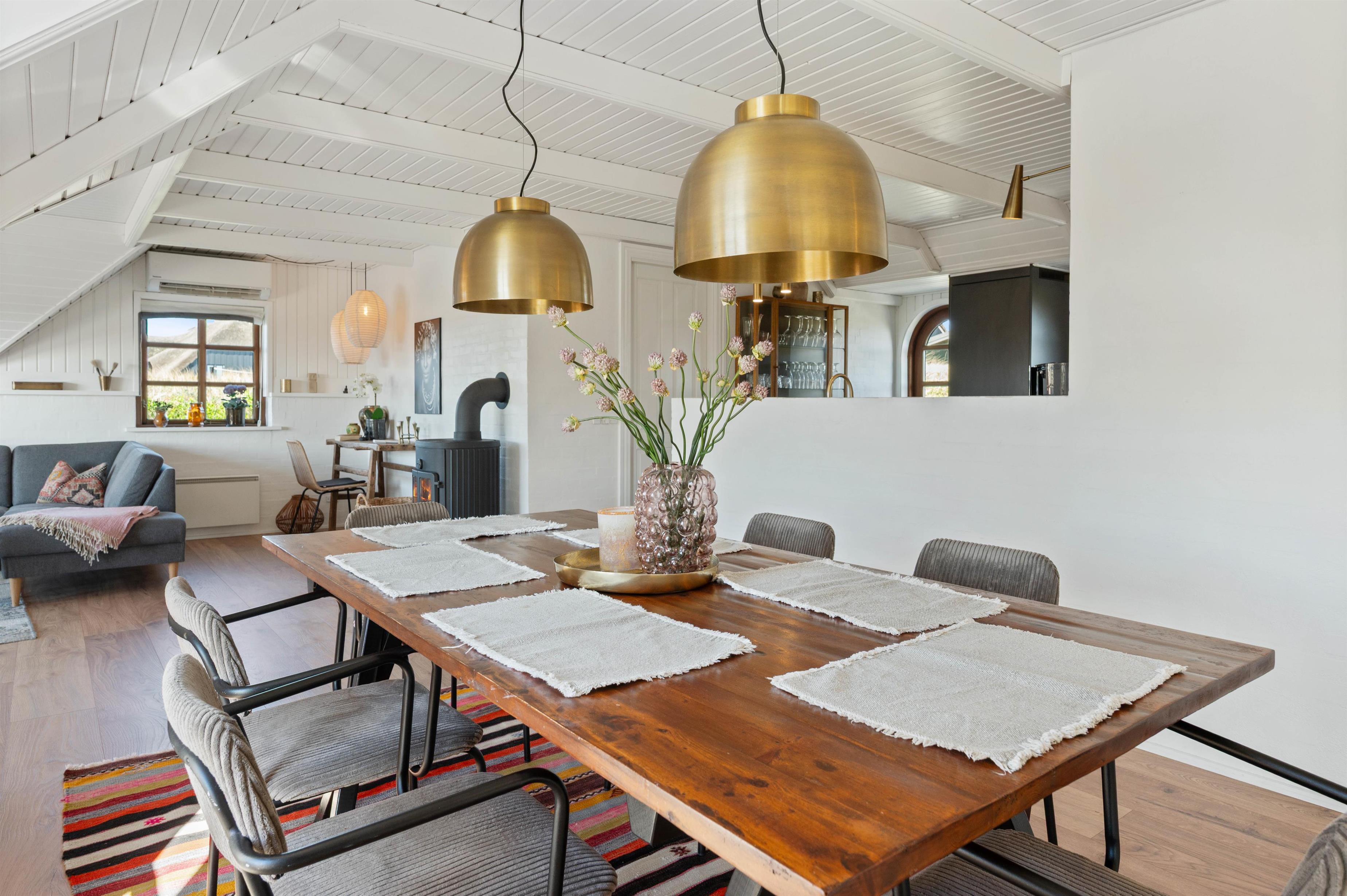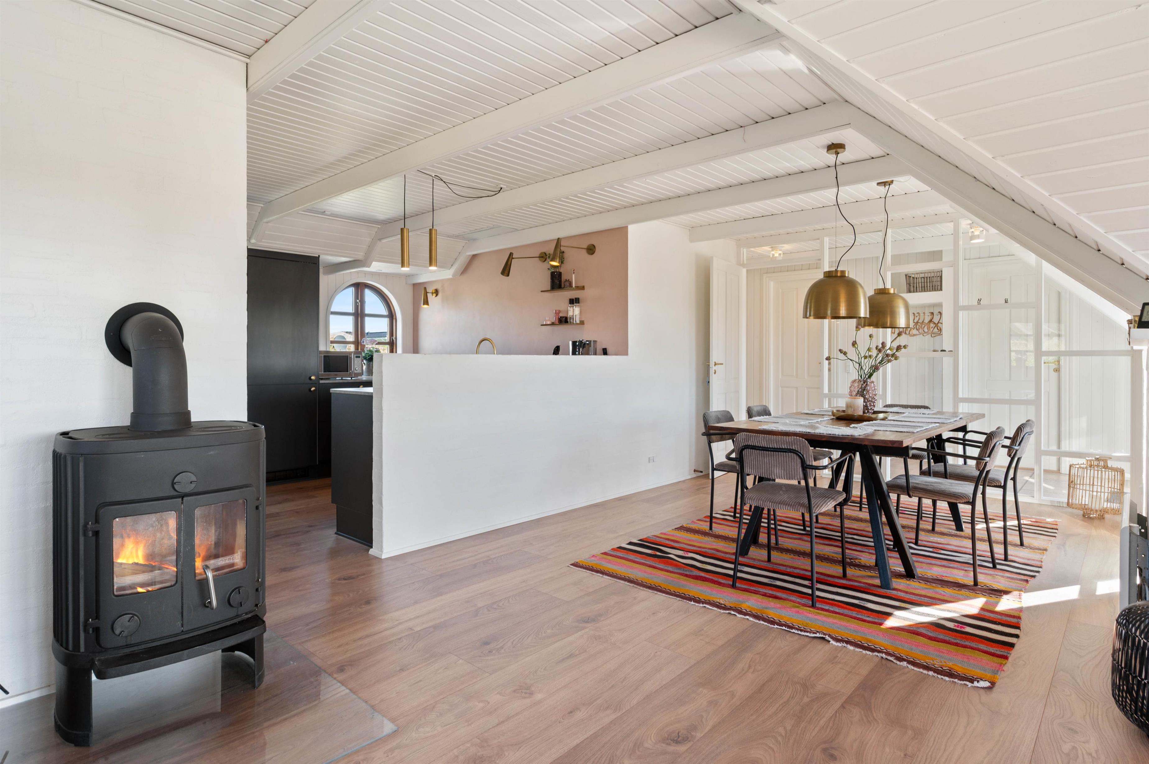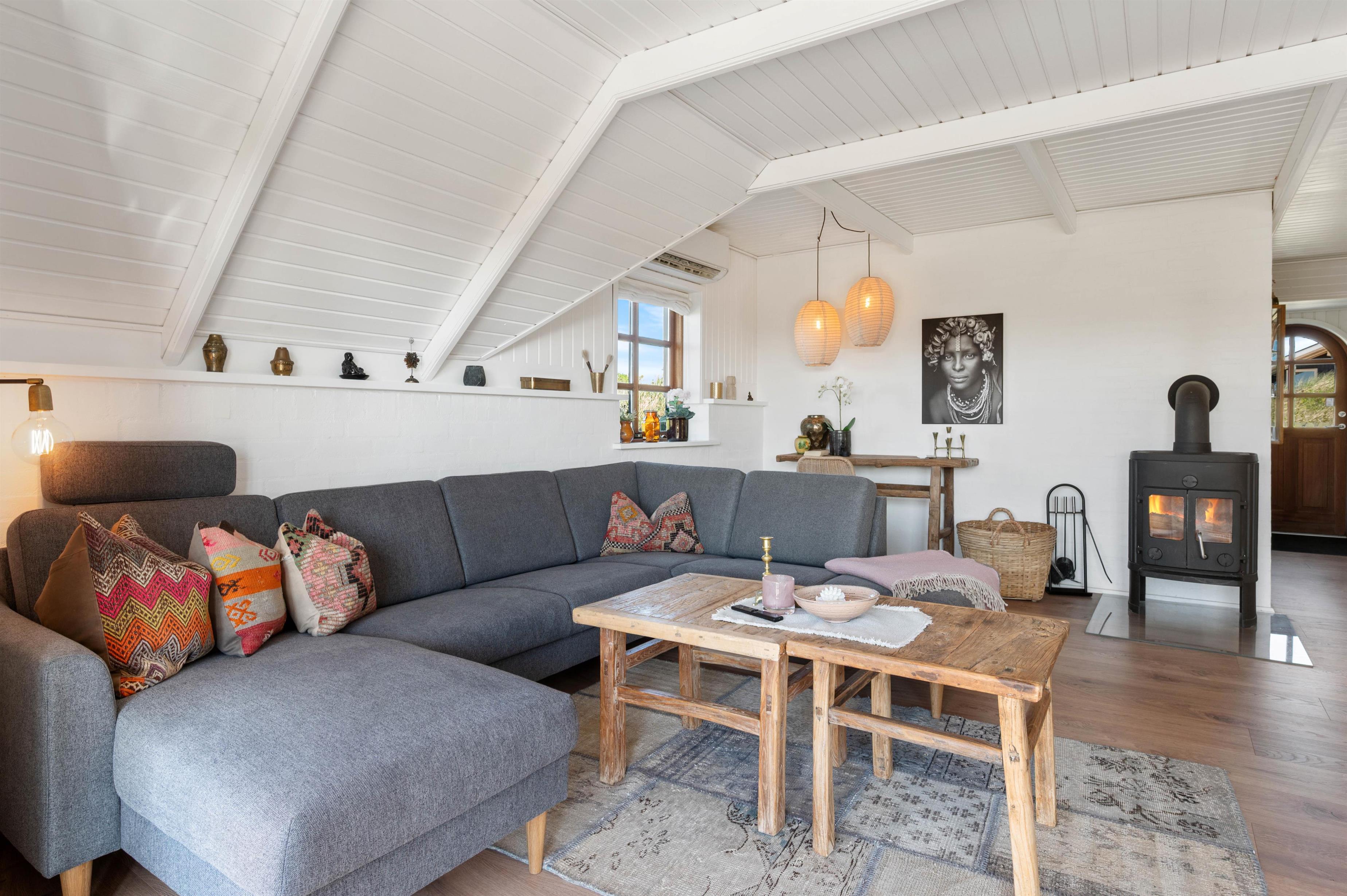 Feriehuset som også er hyggeligt udefra, er mindst lige så hyggelig indvendigt. De hyggelige farver som er på badeværelset og i køkkenet, er med til at give et spændende twist. I stuen har I en hyggelig brændeovn til rådighed, der i den grad kan bidrage til den hyggelige stemning.