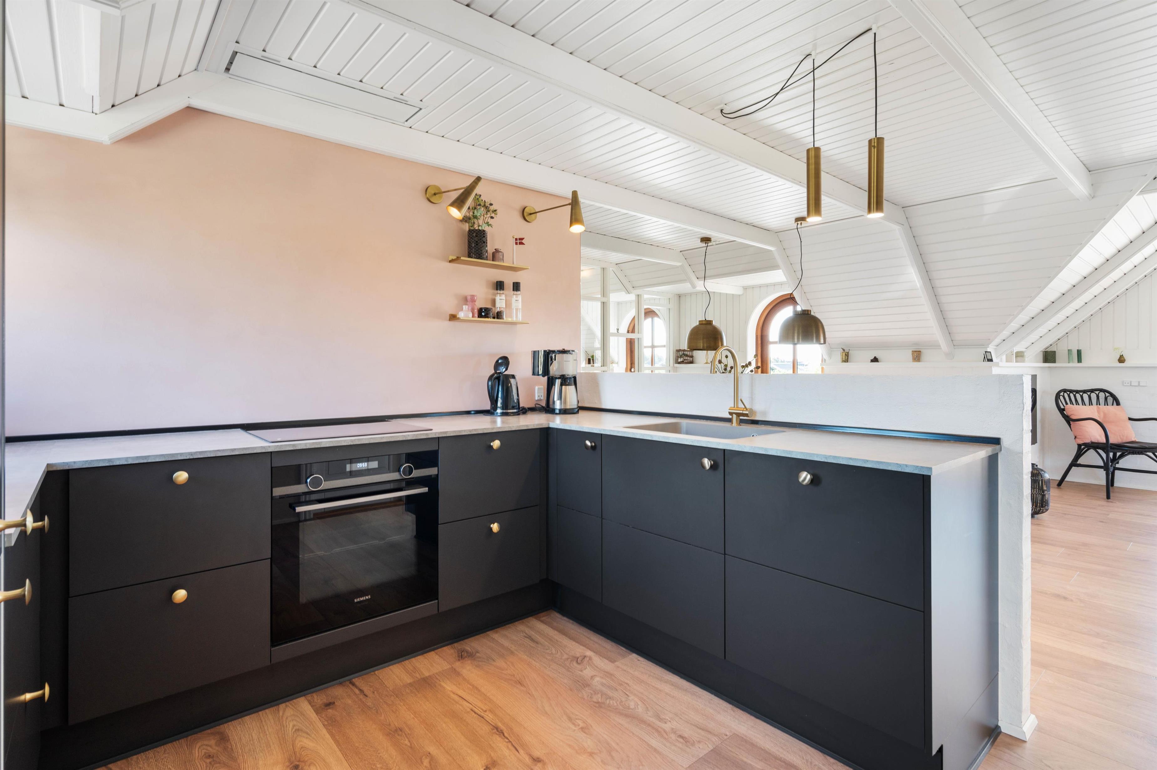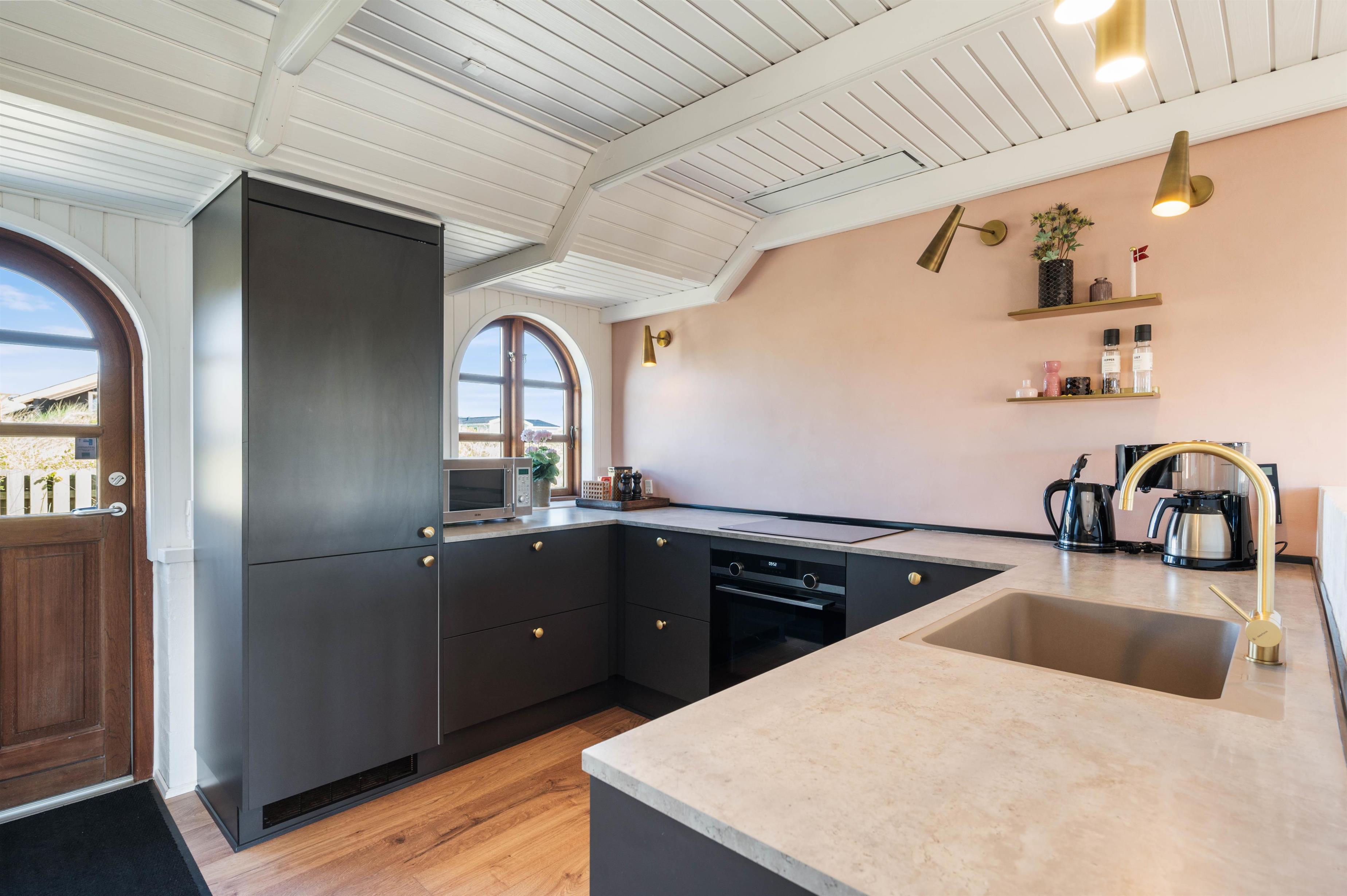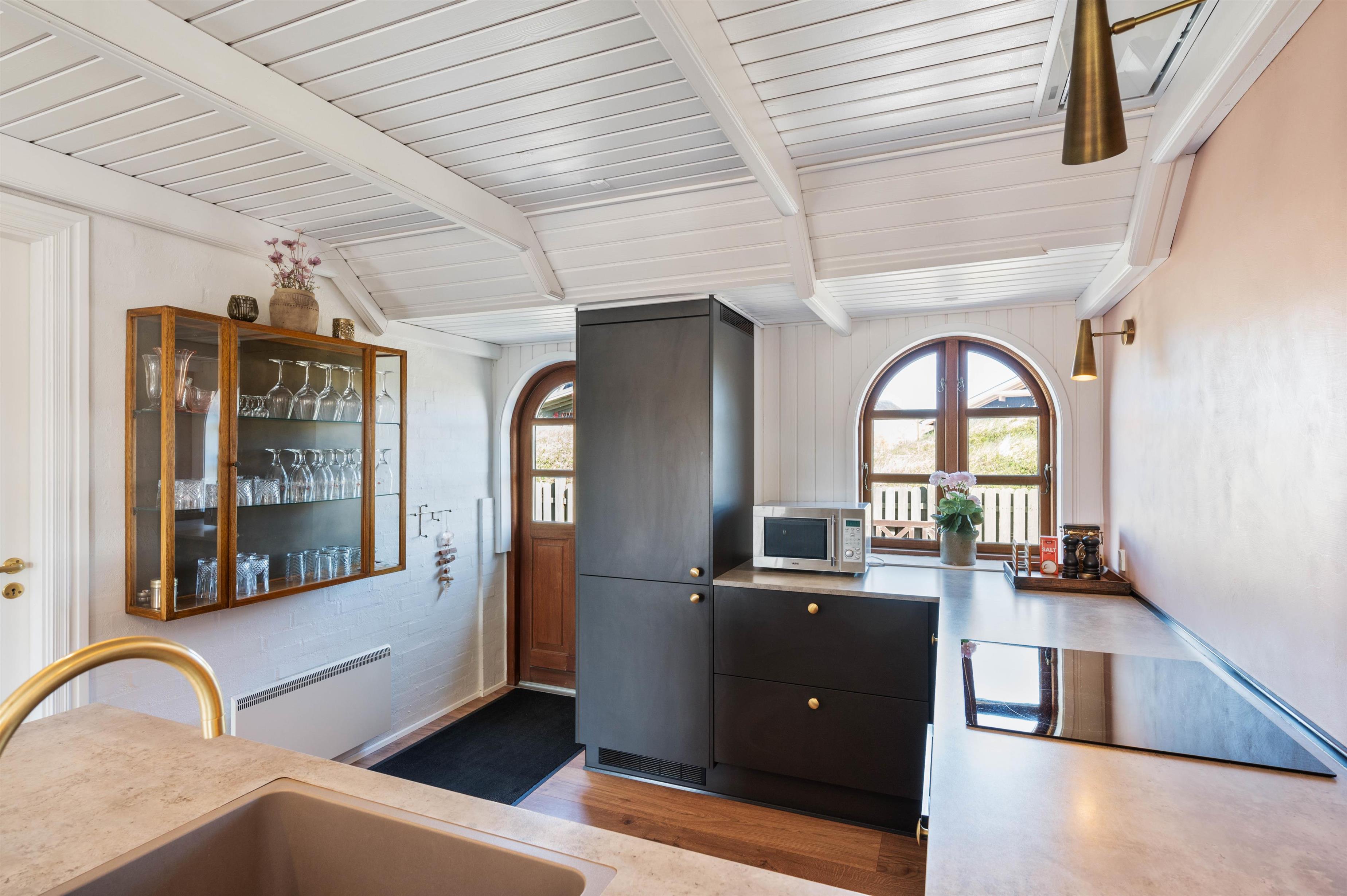 Feriehuset som også er hyggeligt udefra, er mindst lige så hyggelig indvendigt. De hyggelige farver som er på badeværelset og i køkkenet, er med til at give et spændende twist. I stuen har I en hyggelig brændeovn til rådighed, der i den grad kan bidrage til den hyggelige stemning.