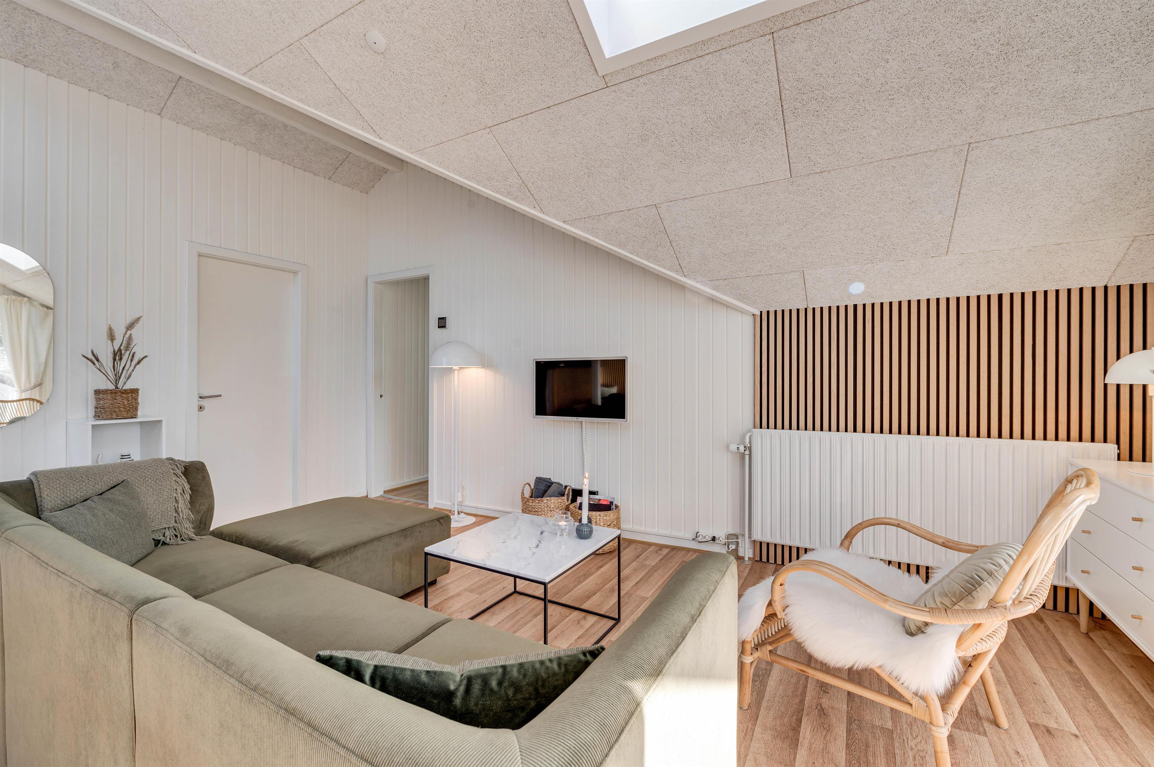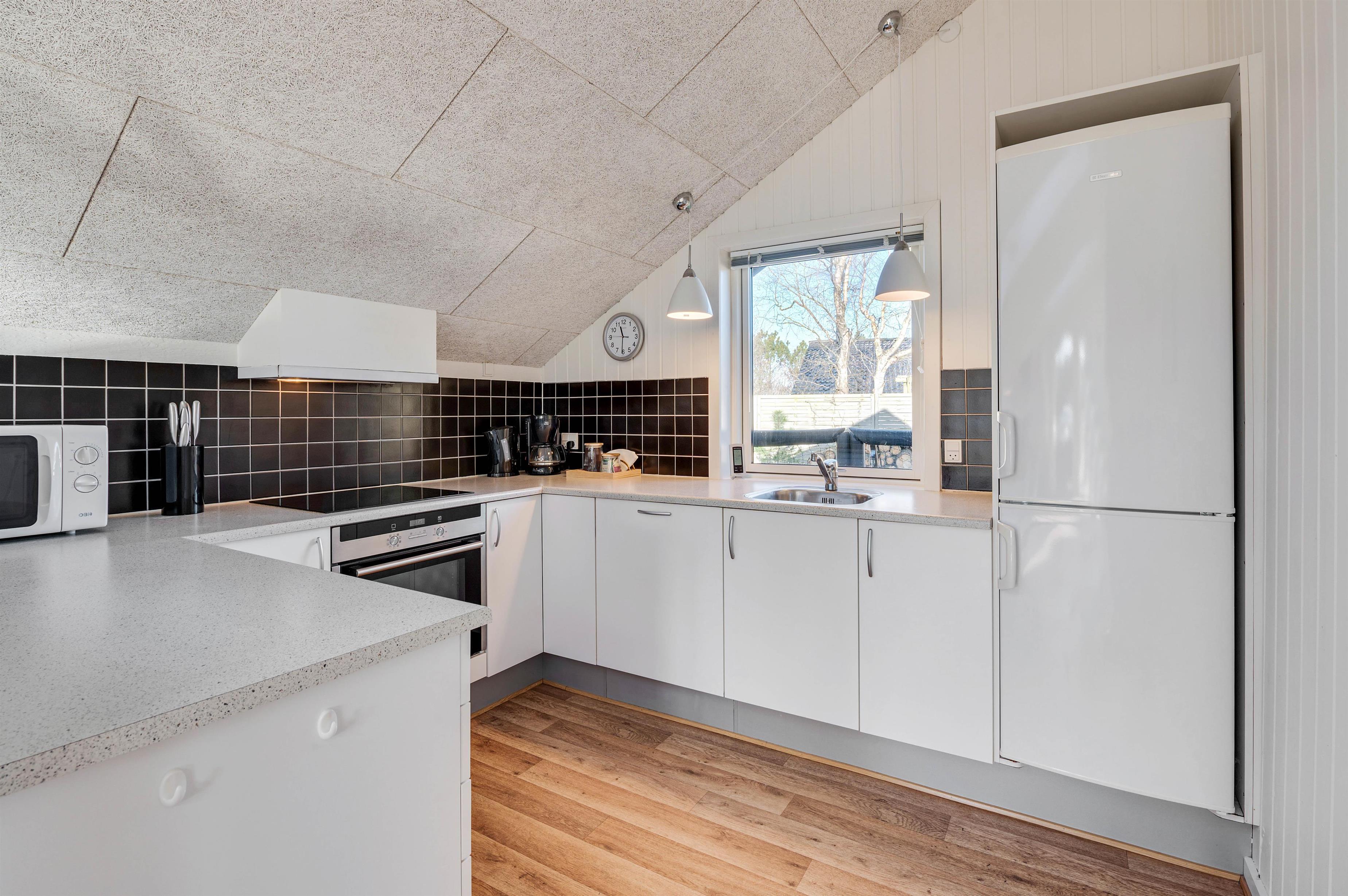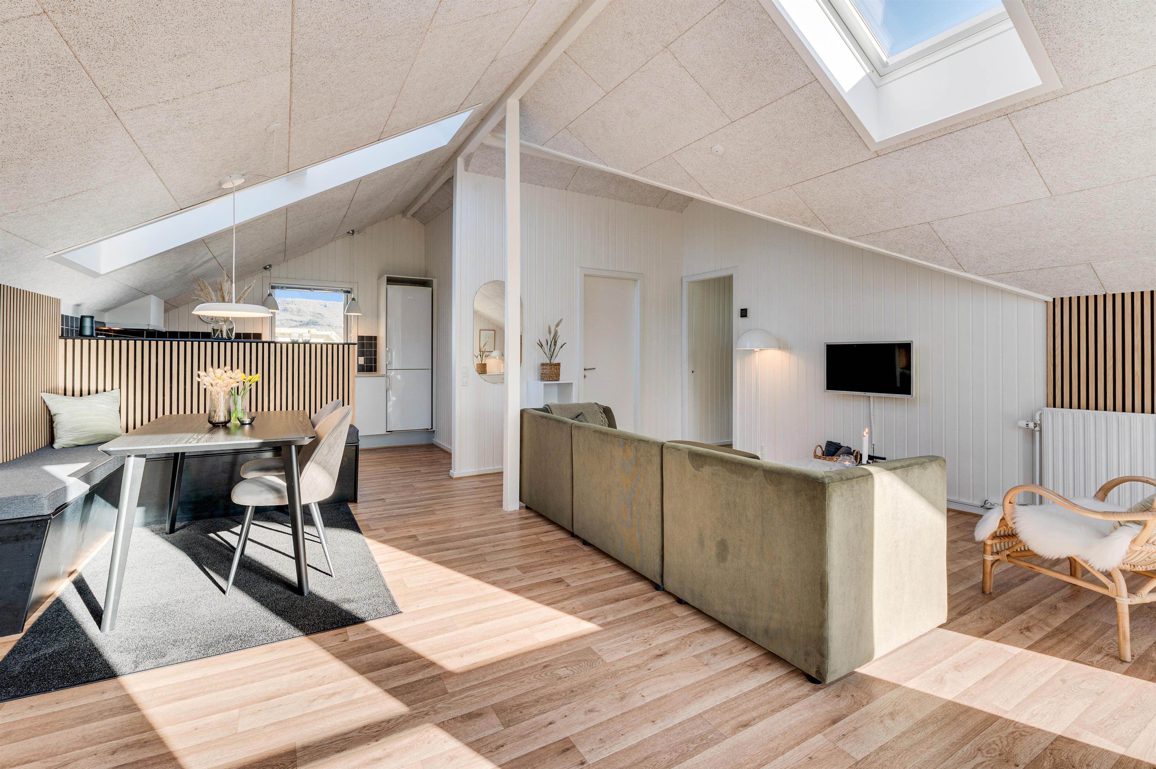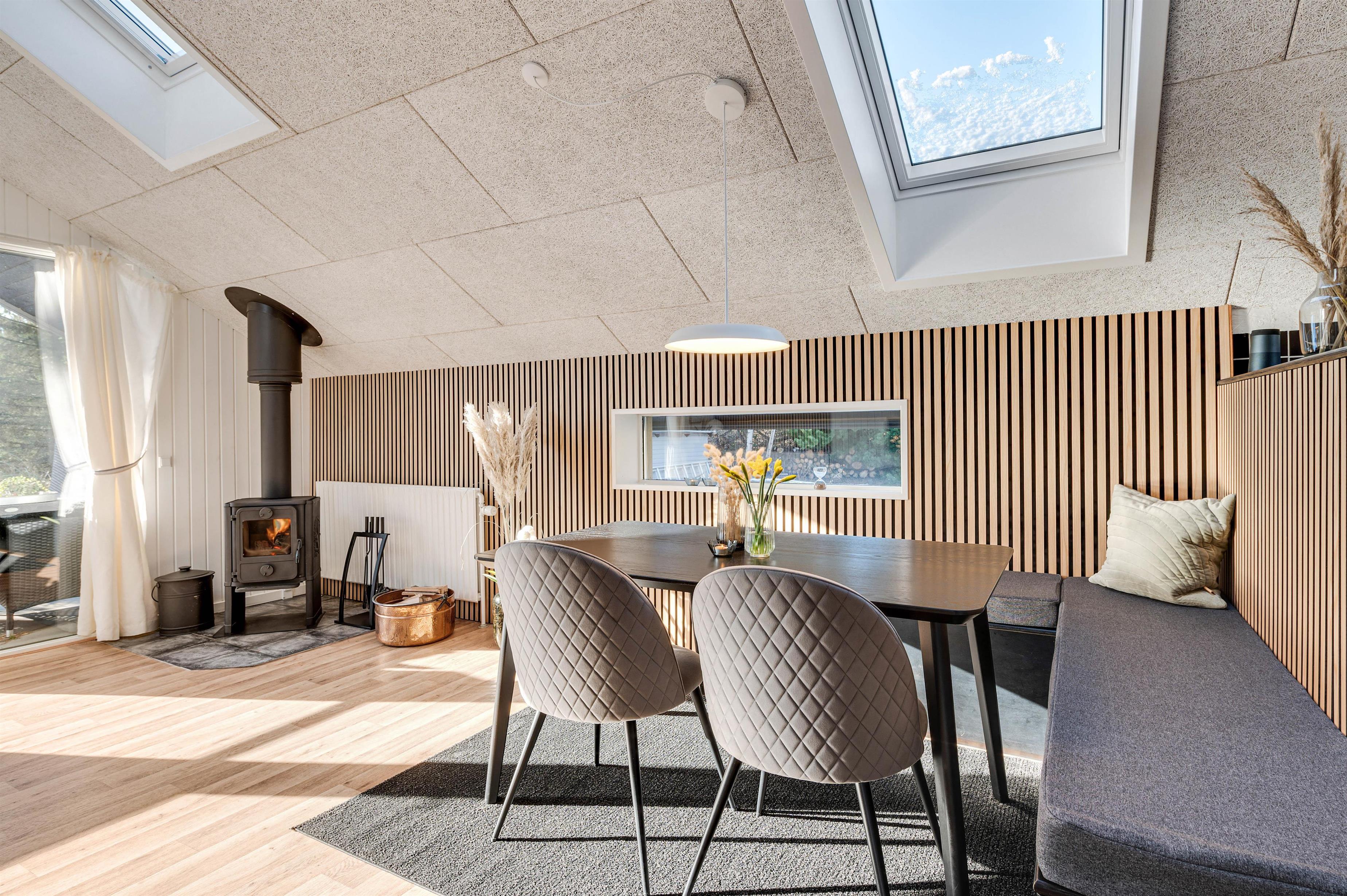 Fra første øjeblik I træder indenfor, vil I straks føle jer hjemme. I det store køkkenalrum skaber de varme træfarver og hyggelige nips en indbydende atmosfære. Med loft til kip, store ovenlysvinduer og vinduespartier føles omgivelserne endnu mere rummelige, og I får et dejligt lysindfald. Skal der krydres med lidt ekstra feriestemning, kan I selvfølgelig også tænde op i brændeovnen, som giver en hyggelig stemning i køkken/alrummet.