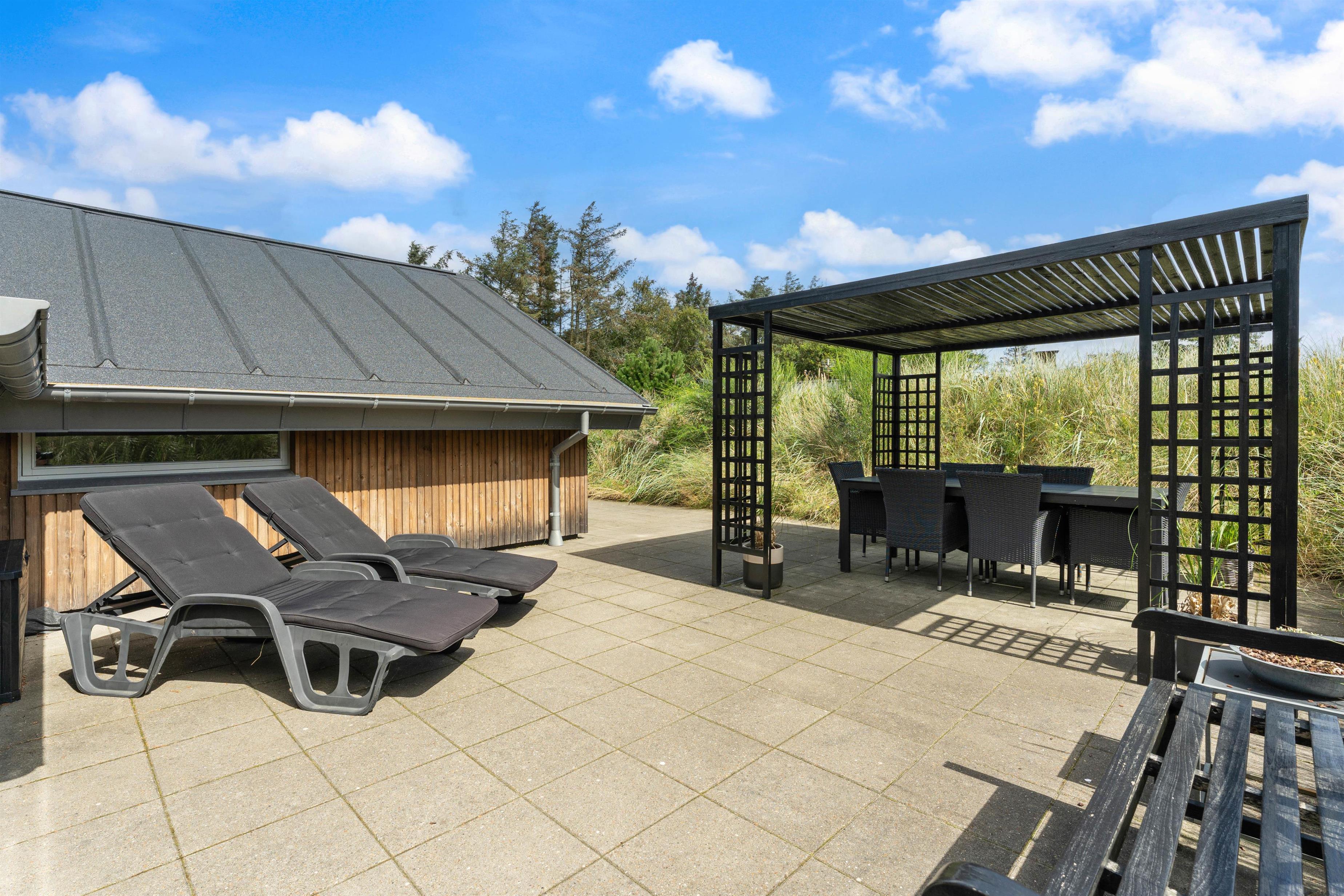Fra opholdsstuen kan I træde direkte ud på sommerhusets lækre ugenerede terrasse. Terrassen løber næsten hele vejen rundt om sommerhuset, så I altid kan finde jer et godt spot i solen, hvor I kan læne jer tilbage i havemøblerne og liggestolene. Er vinden til den friske side, kan I sidde i læ under den overdækkede del af terrassen, der også er afskærmet.