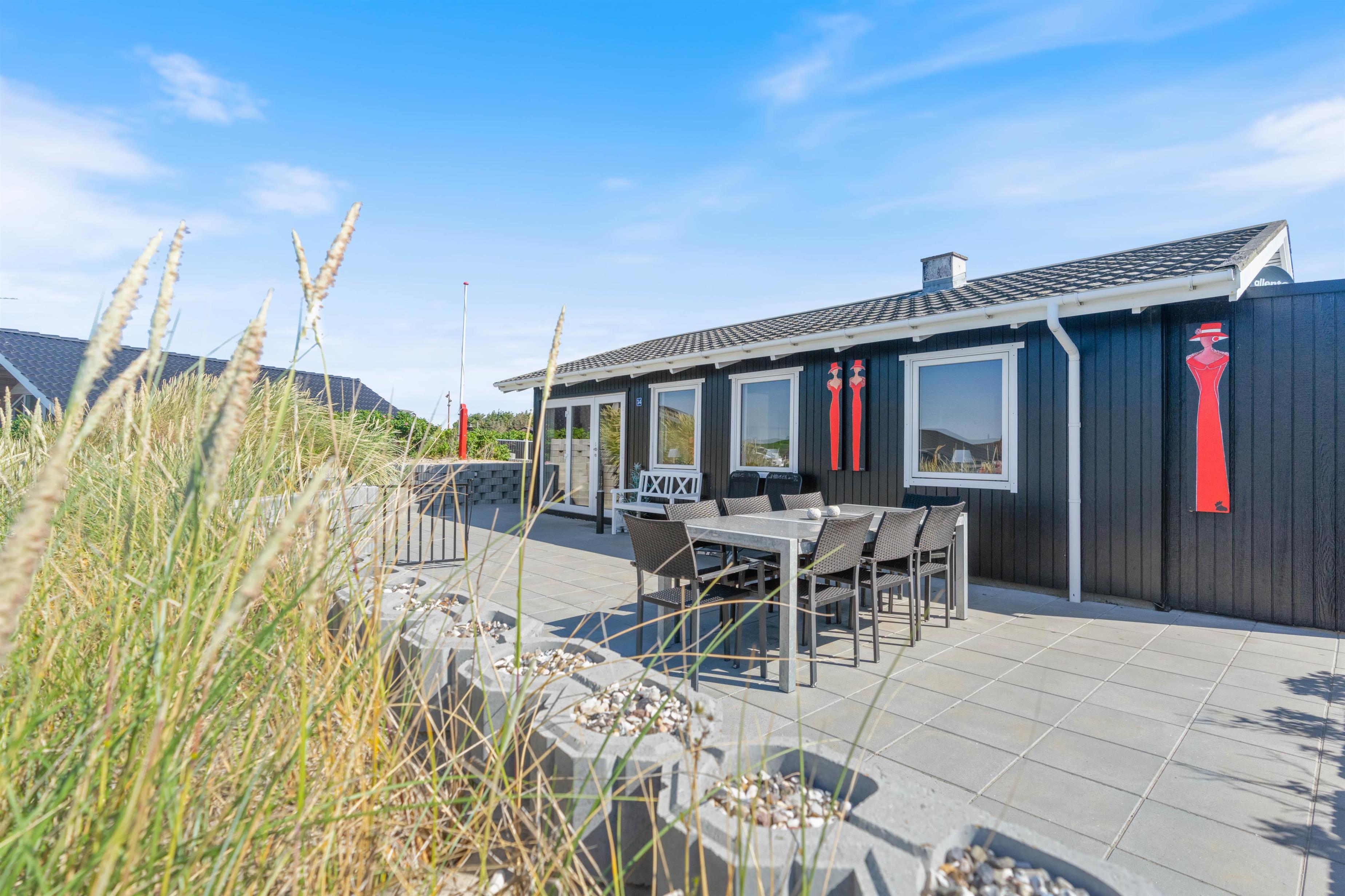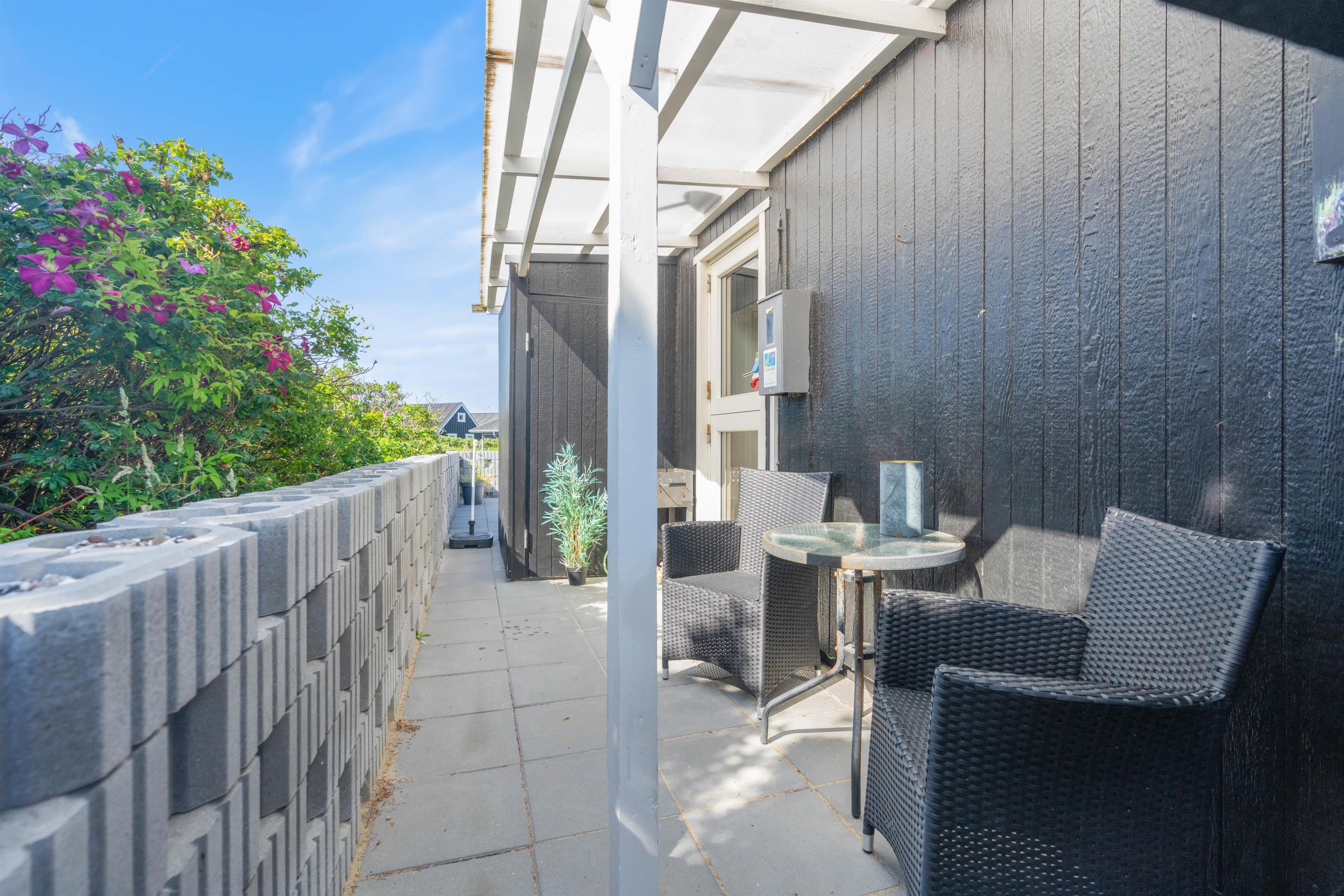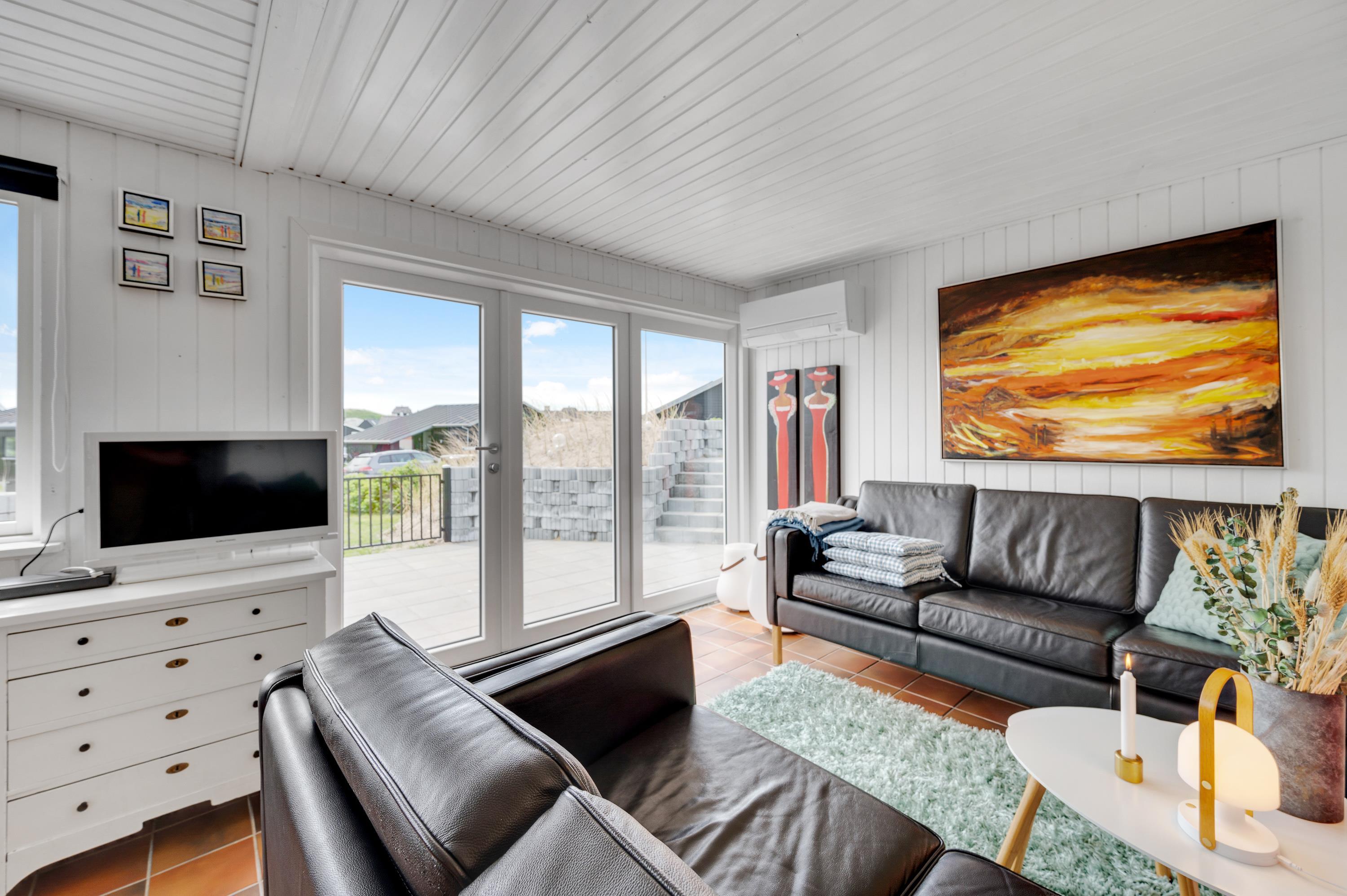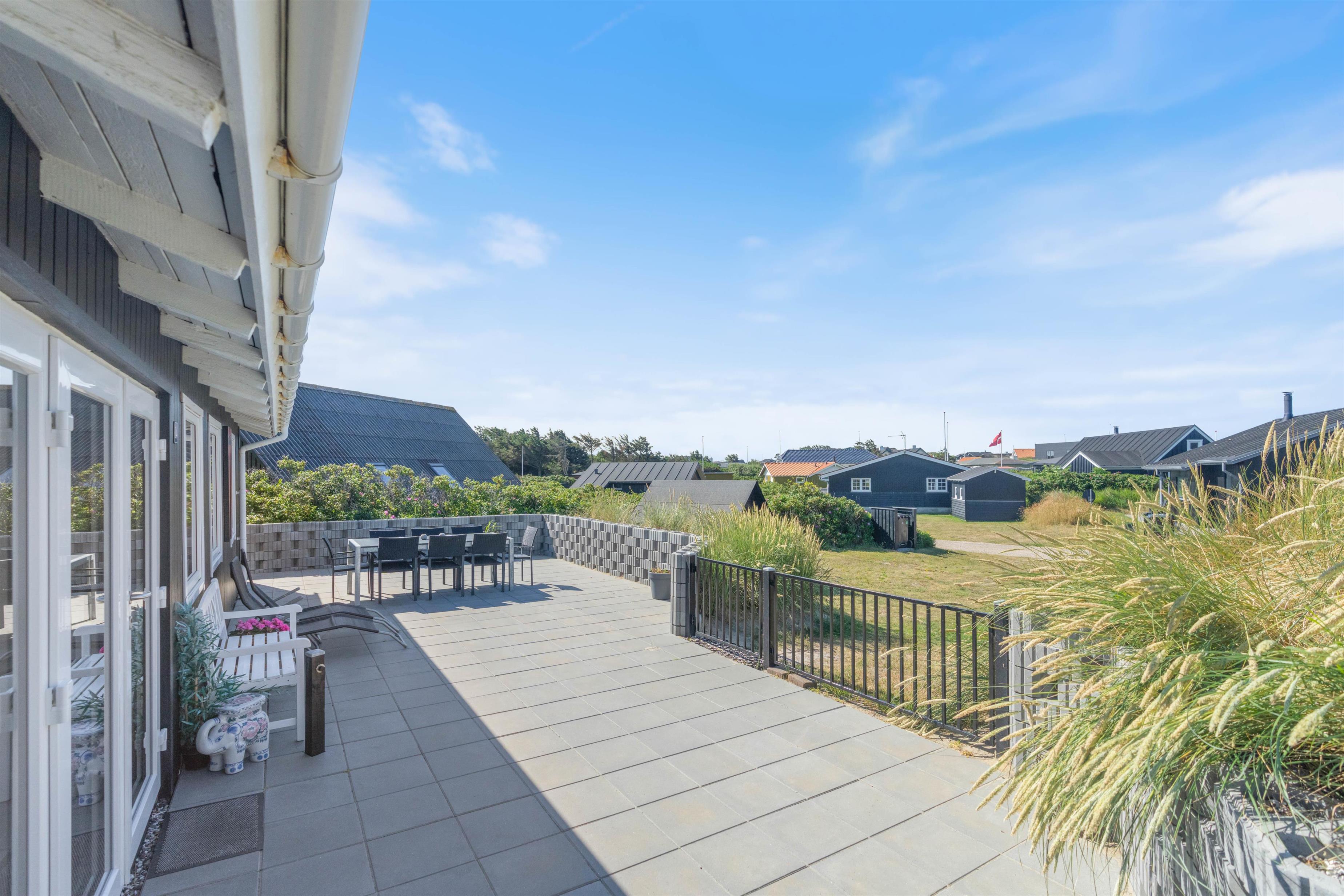Fra stuen og det ene af feriehusets soveværelser er der udgang til en stor lukket og delvist overdækket terrasse, hvor I kan nyde de gode solskinsdage og den friske, vestjyske luft i fulde drag.