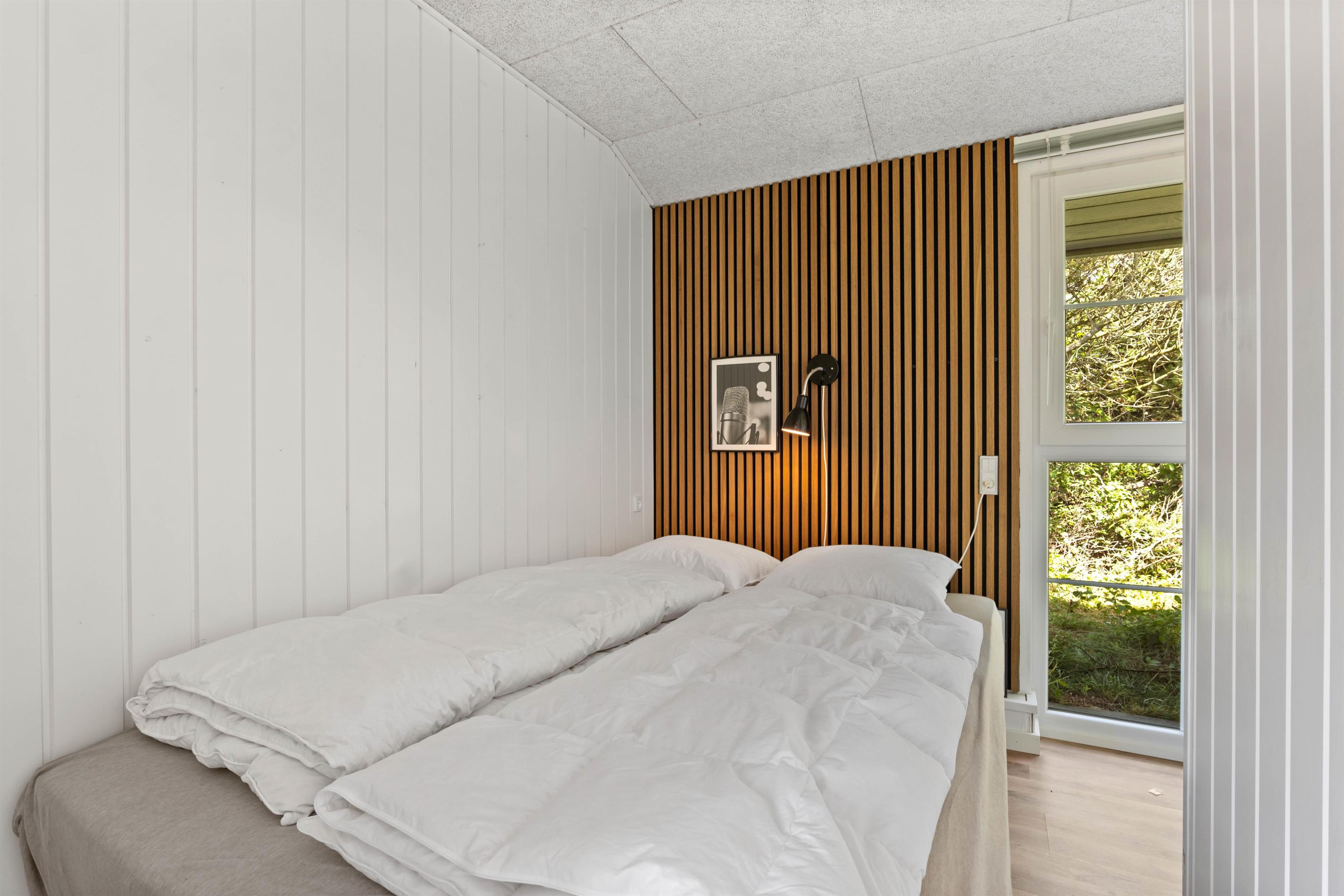I kan også vælge at placere jer i det hyggelige sofaområde foran den knitrende brændeovn og nyde varmen, mens I ser en god film. Sommerhuset har lyse trævægge og lofter, og de synlige loftsbjælker er bare prikken over i’et, der giver dette charmerende træsommerhus den helt rigtige feriestemning.