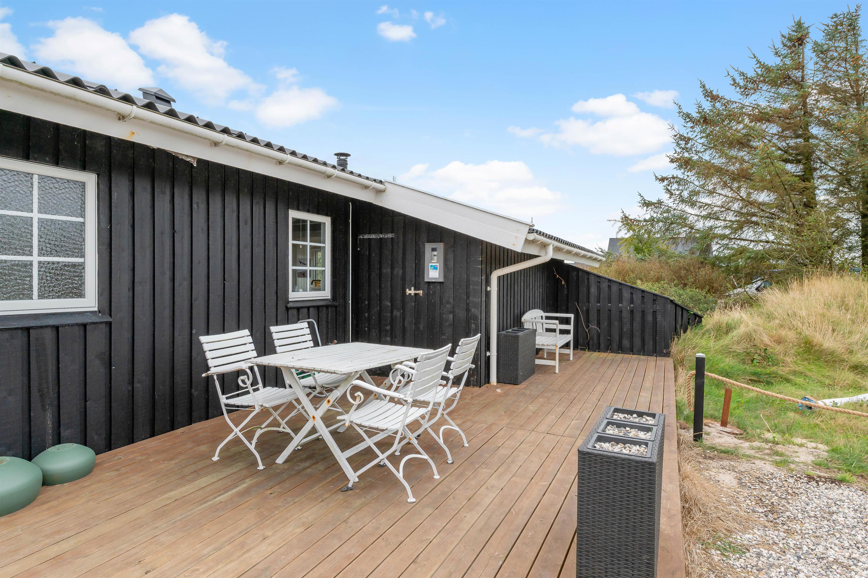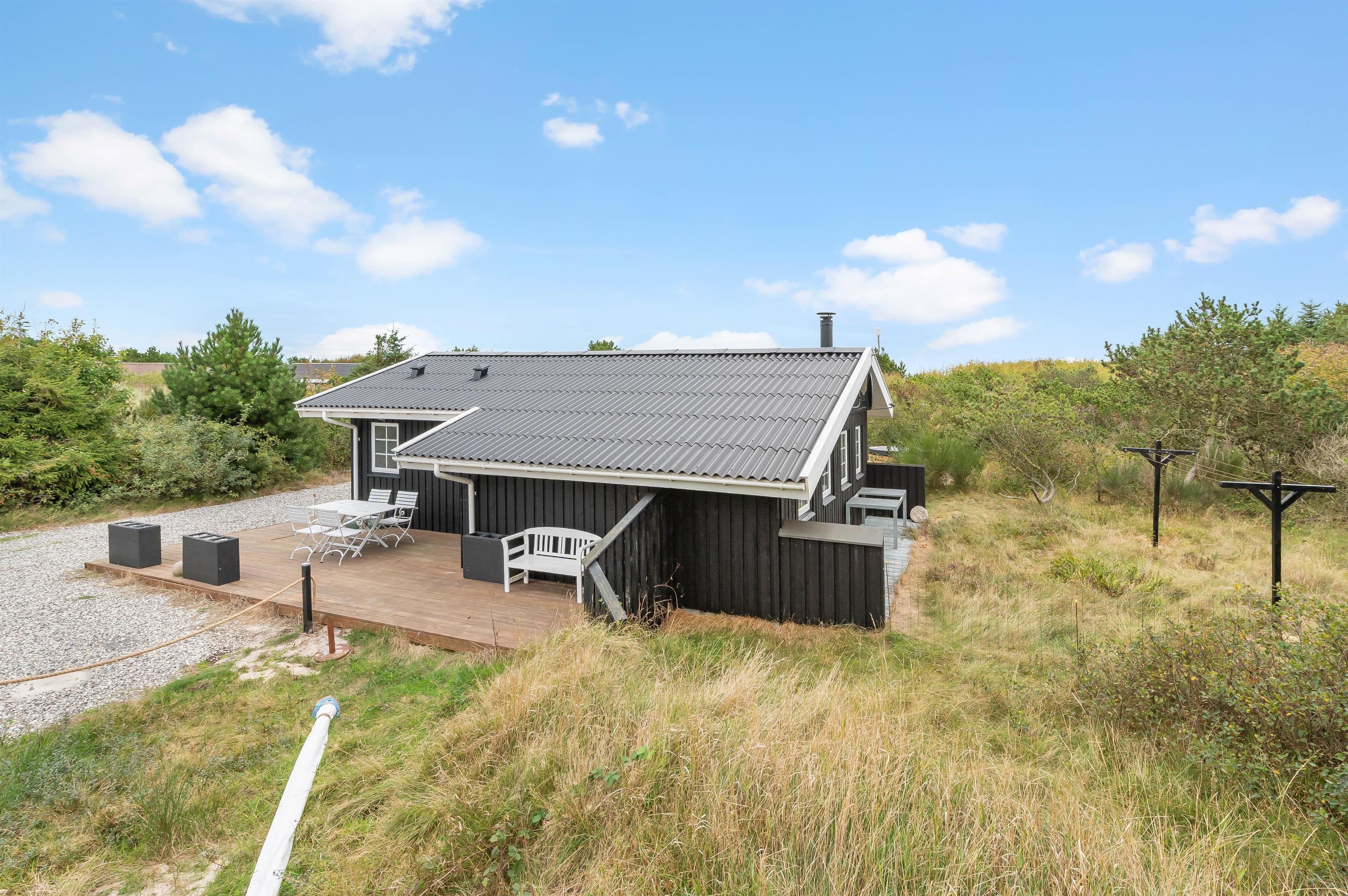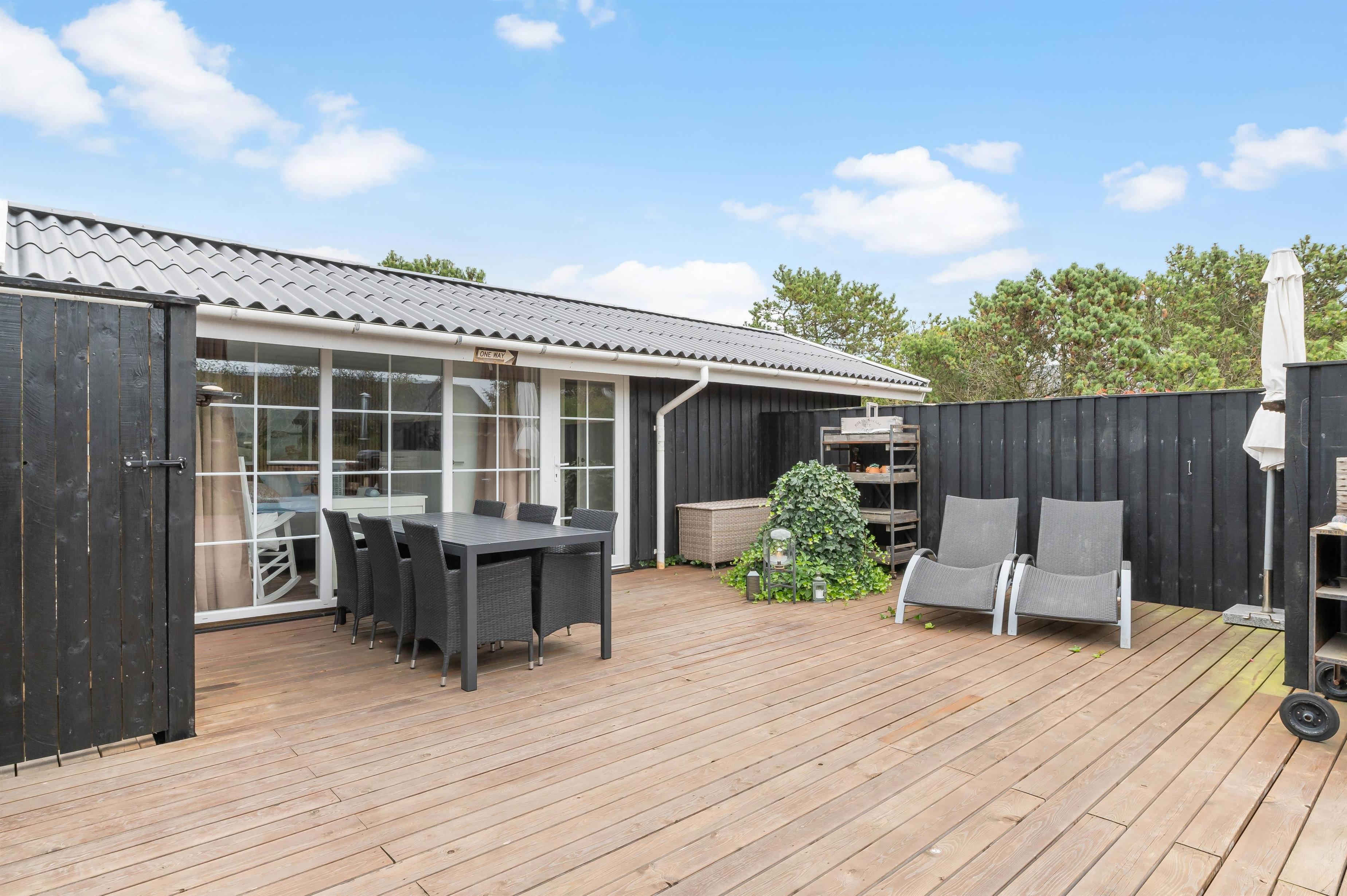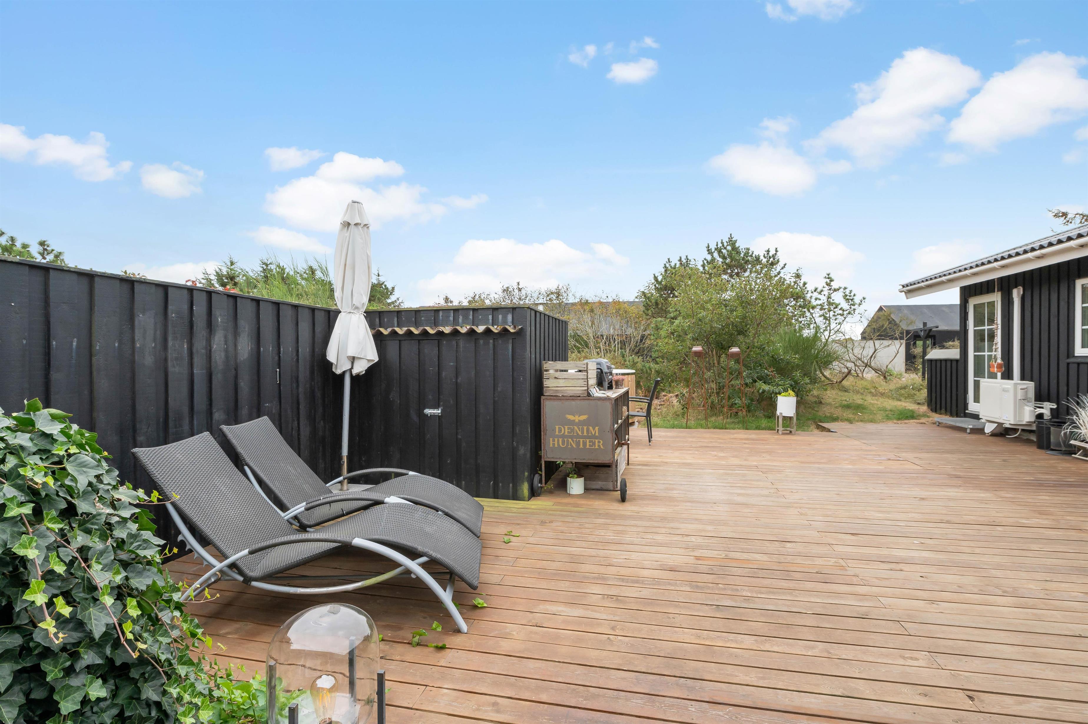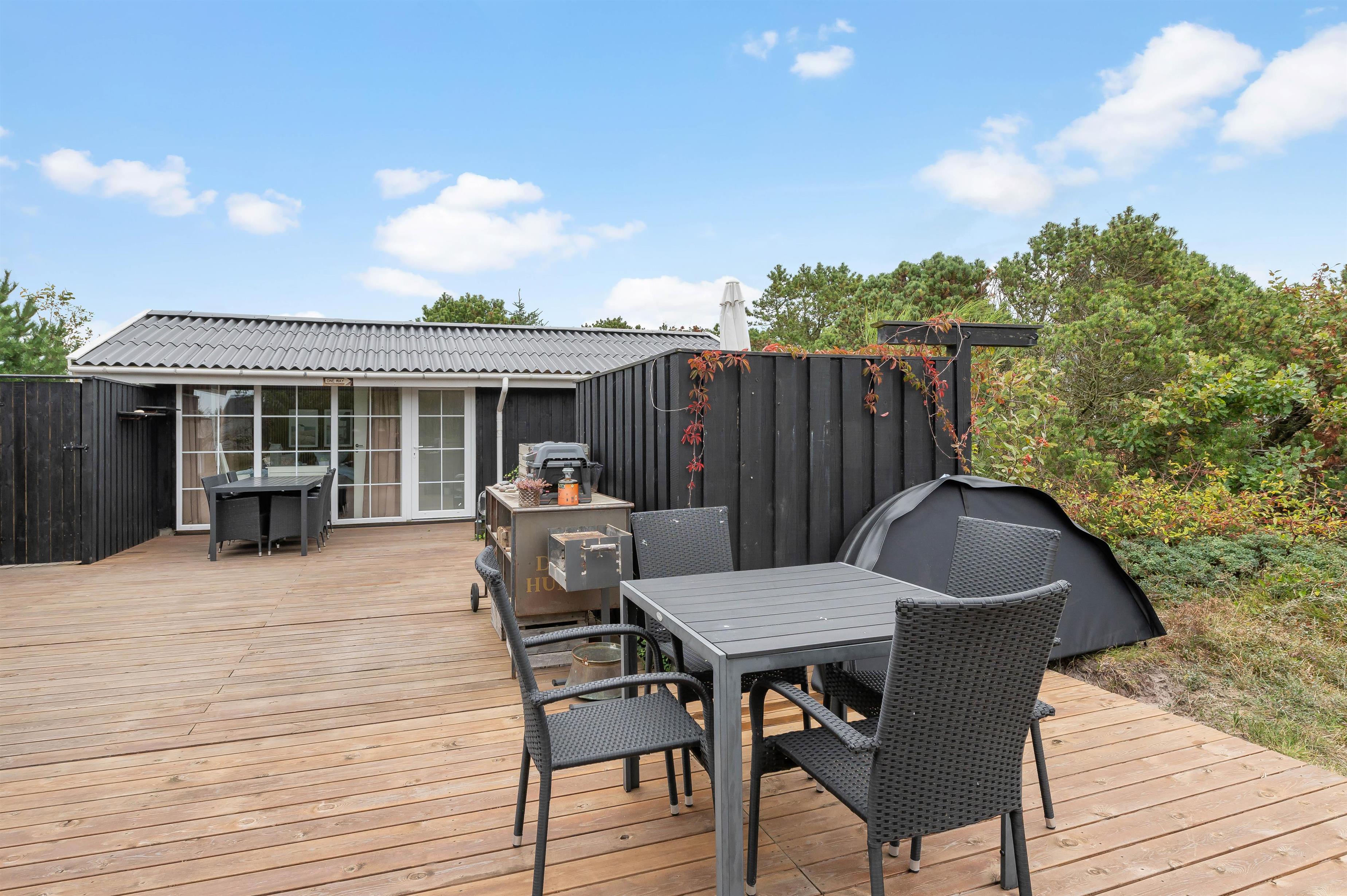 Sommerhuset har yderligere en nord- vestvendt terrasse, hvor aftenkaffen kan nydes. Det er derfor rig mulighed for at finde læ på én af de to terrasser, og I kan altid finde en dejlig hyggekrog. Hvis I er klar til en frisk dukkert, så ligger Vesterhavets brusende bølger bare 1250 meter fra huset. Tæt på findes en put and take sø for de, der ønsker at fiske. Det her er et rigtig dejligt, charmerende og yderst velholdt sommerhus, der har alt, hvad der skal til for at få god ferie.