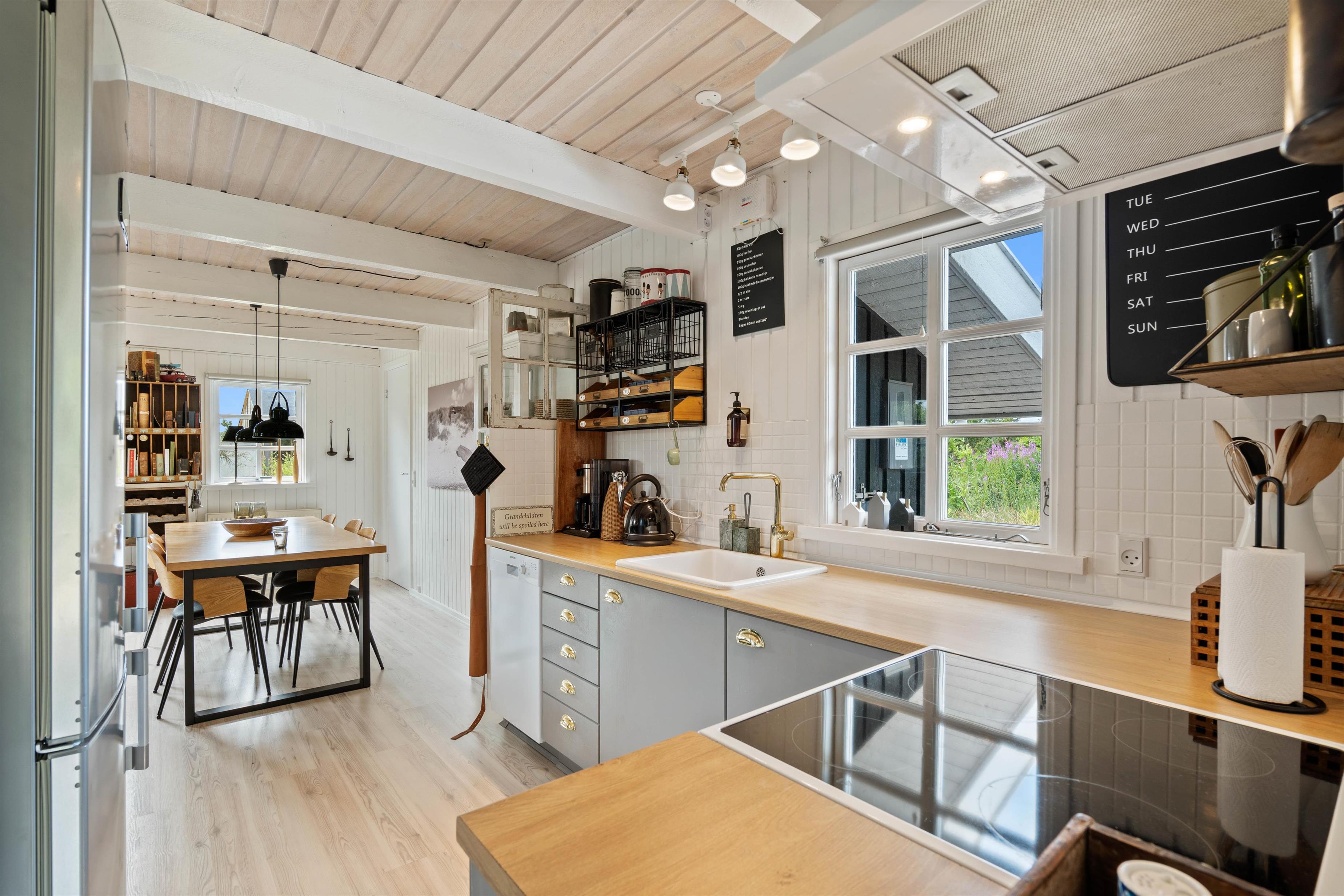 Dette charmerende sommerhus har plads til en lille familie på 6 personer plus hund, som ønsker at bo naturnært og i familievenlige omgivelser. Sommerhuset er pænt og lyst indrettet, fyldt med en masse spændende sanseindtryk og rigtig gode møbler. Det kombinerede køkken og opholdsrum har et flot lysindfald med sine store vinduespartier mod syd, og her kan I rigtigt nyde de naturskønne omgivelser.
