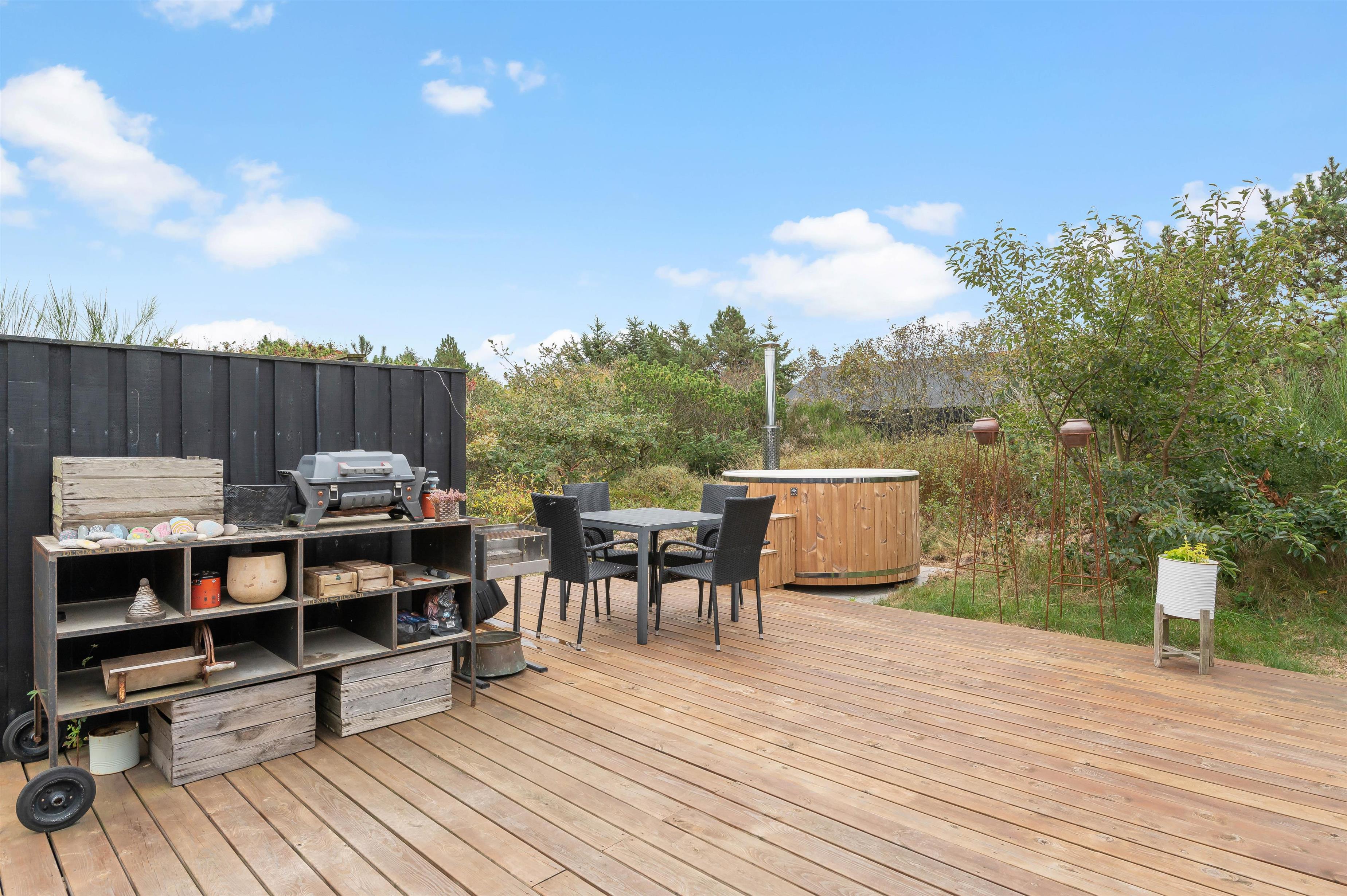På terrassen har sommerhuset et skønt udekøkken med masser af bordplads og en vask, som gør tilberedningen af maden lidt lettere. Den syd- østvendte terrasse ligger komplet ugenert og naturlig afskærmet af de høje fyr- og nåletræer, og indbyder virkelig til skønne aftner med en tændt grill og et glas vin. Grunden er desuden indhegnet ome den den store terrasse. For enden af den store terrasse står husets vildmarksbad. Her kan I sidde og slappe af og lade tankerne flyve. Terrassen er naturligvis indrettet med gode havemøbler og liggestole, hvor I kan nyde jeres ferie i fulde drag.