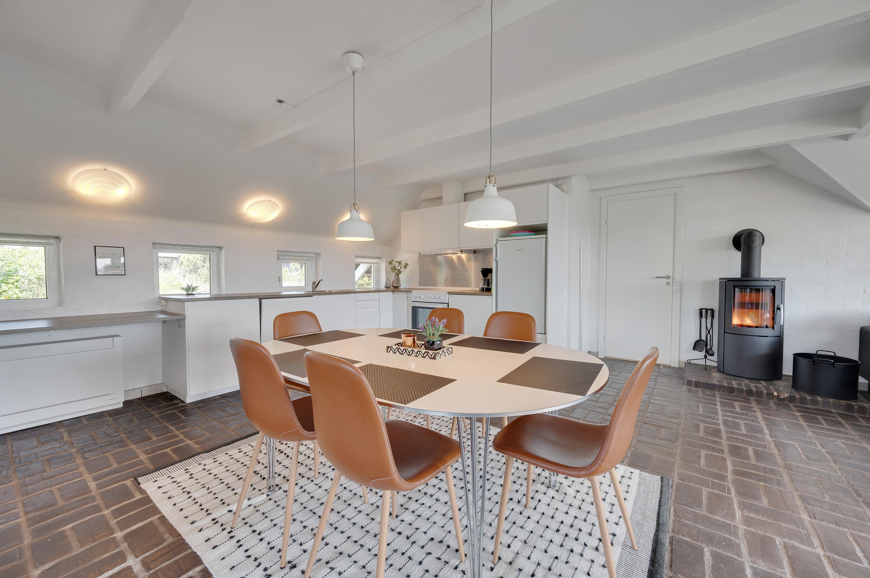 Sommerhusets smagfulde indretning kombineret med det rustikke klinkegulv giver jer den rigtige feriefølelse fra første minut. Det åbne køkken-alrum giver jer mulighed for samvær og hygge, lige meget hvor I opholder jer. Brændeovnen sørger for ekstra hygge og varme, både når I spiller brætspil ved spisebordet, og når I hygger med en god film i den rummelige hjørnesofa. I sommerhuset finder I generelt mange hyggekroge, der indbyder til afslapning og hygge.