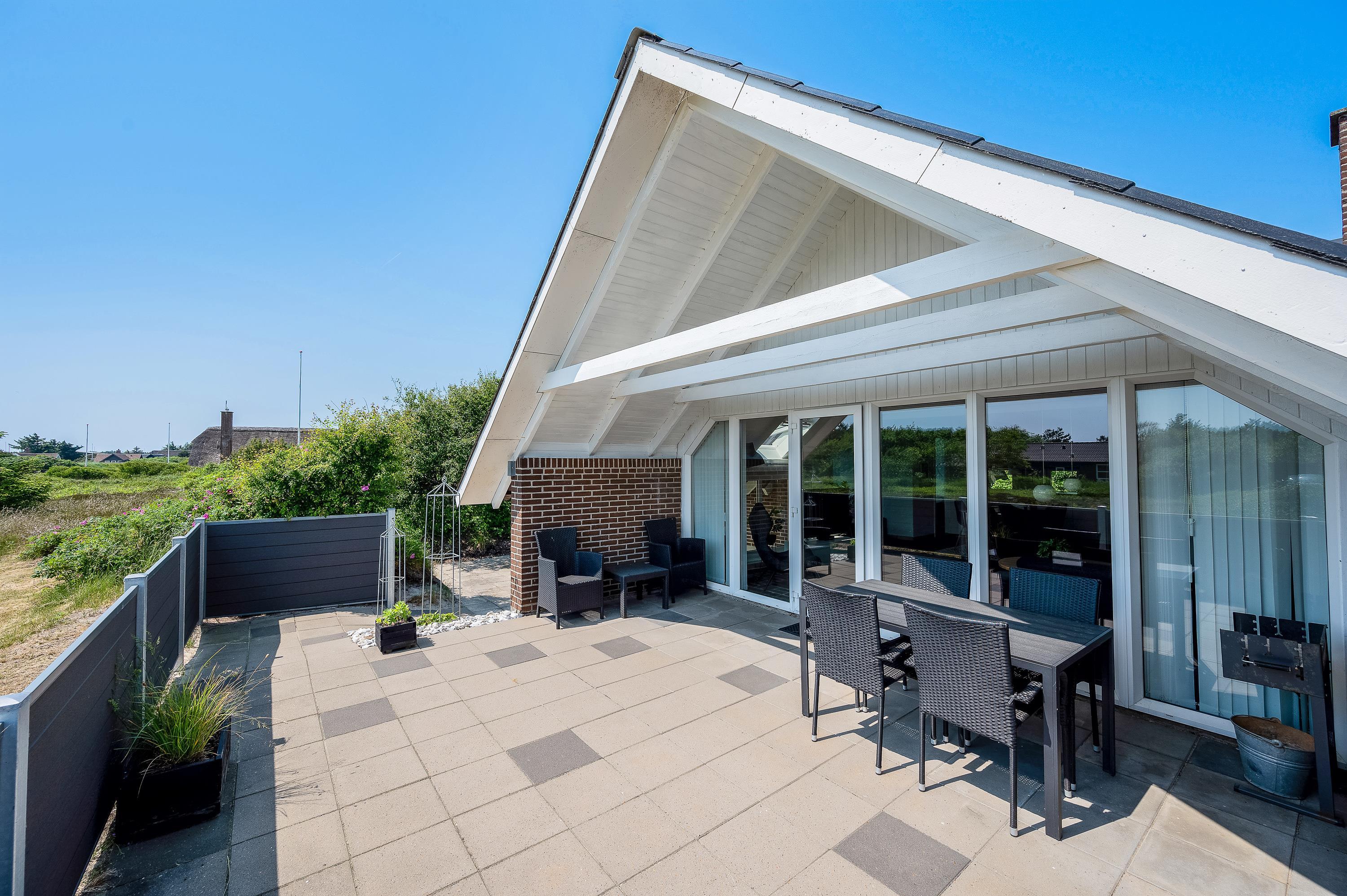 Gennem terrassedøren kommer I ud på den overdækkede og afskærmede terrasse mod syd. Ud over den sydvendte terrasse finder I rundt om sommerhuyset flere andre gode og afskærmede terrasser, så I næsten altid kan finde en plads i læ og følge solen rundt. Her lægges op til mange hyggelige grillaftener under åben himmel.