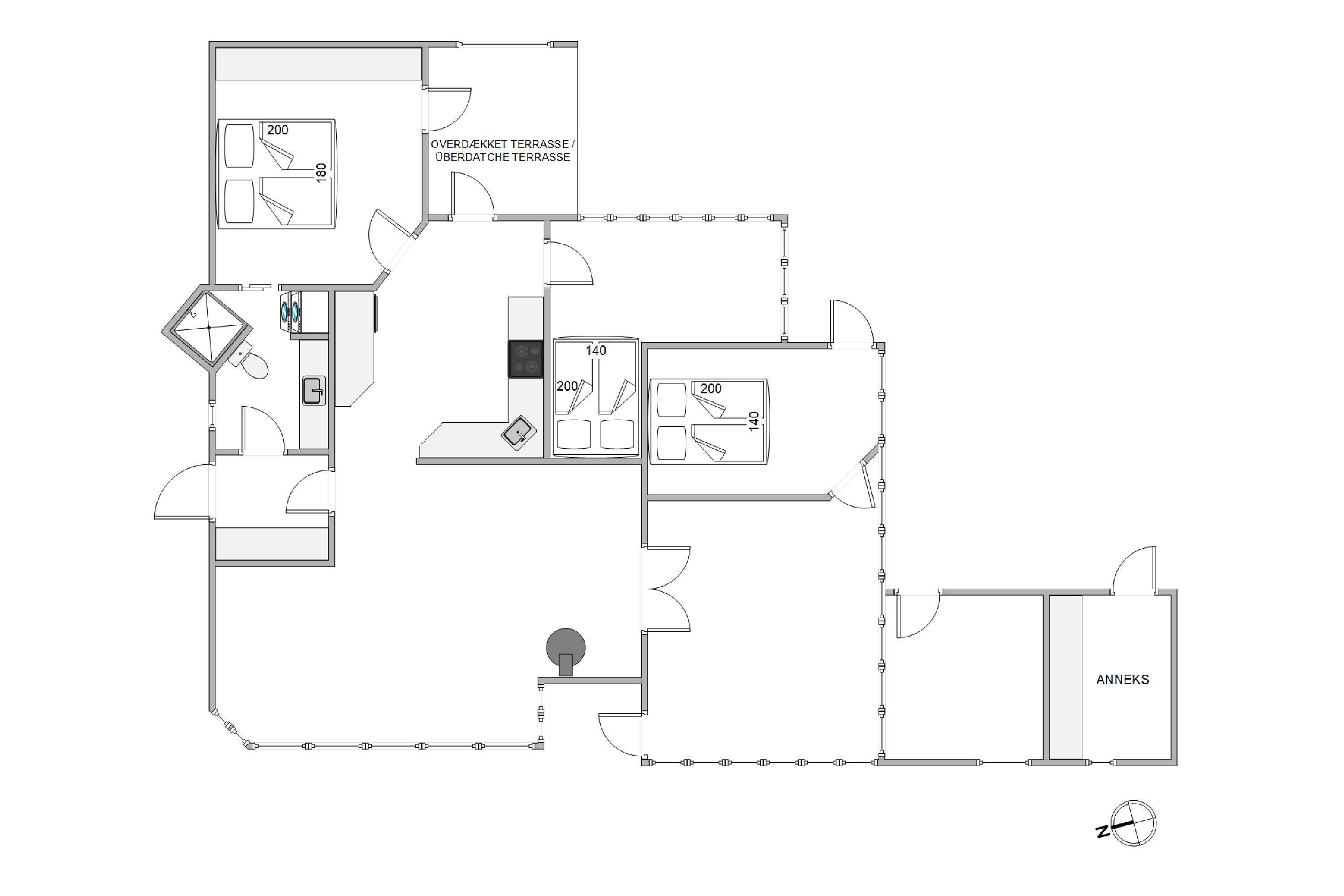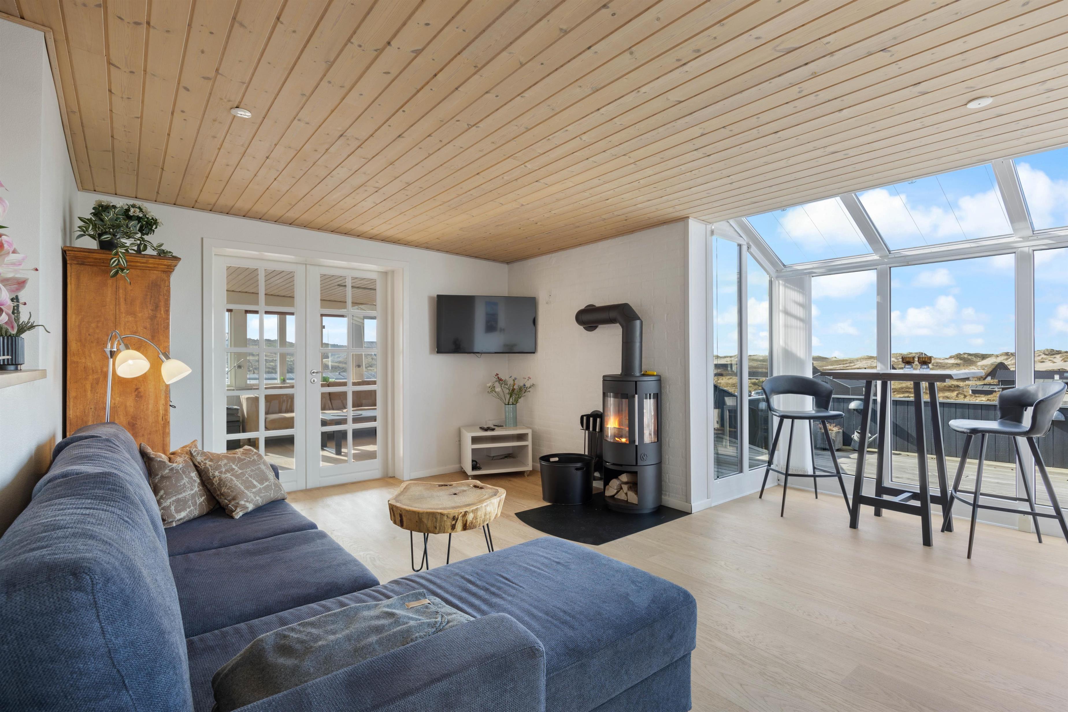 Når I træder ind i feriehuset, bliver I mødt af et hyggeligt sommerhus, der giver jer masser af naturligt lys takket være de mange vinduer. Det store opholdsrum, som kombinerer køkken, stue og spiseplads, er det perfekte sted til at lave mad sammen, tilbringe tid sammen og spille spil. Det store vinduesparti i stuen giver jer en fantastisk panoramaudsigt over de skønne omgivelser i Søndervig. Brændeovnen i stuen giver en ekstra dosis hygge og sørger for ægte sommerhusstemning.