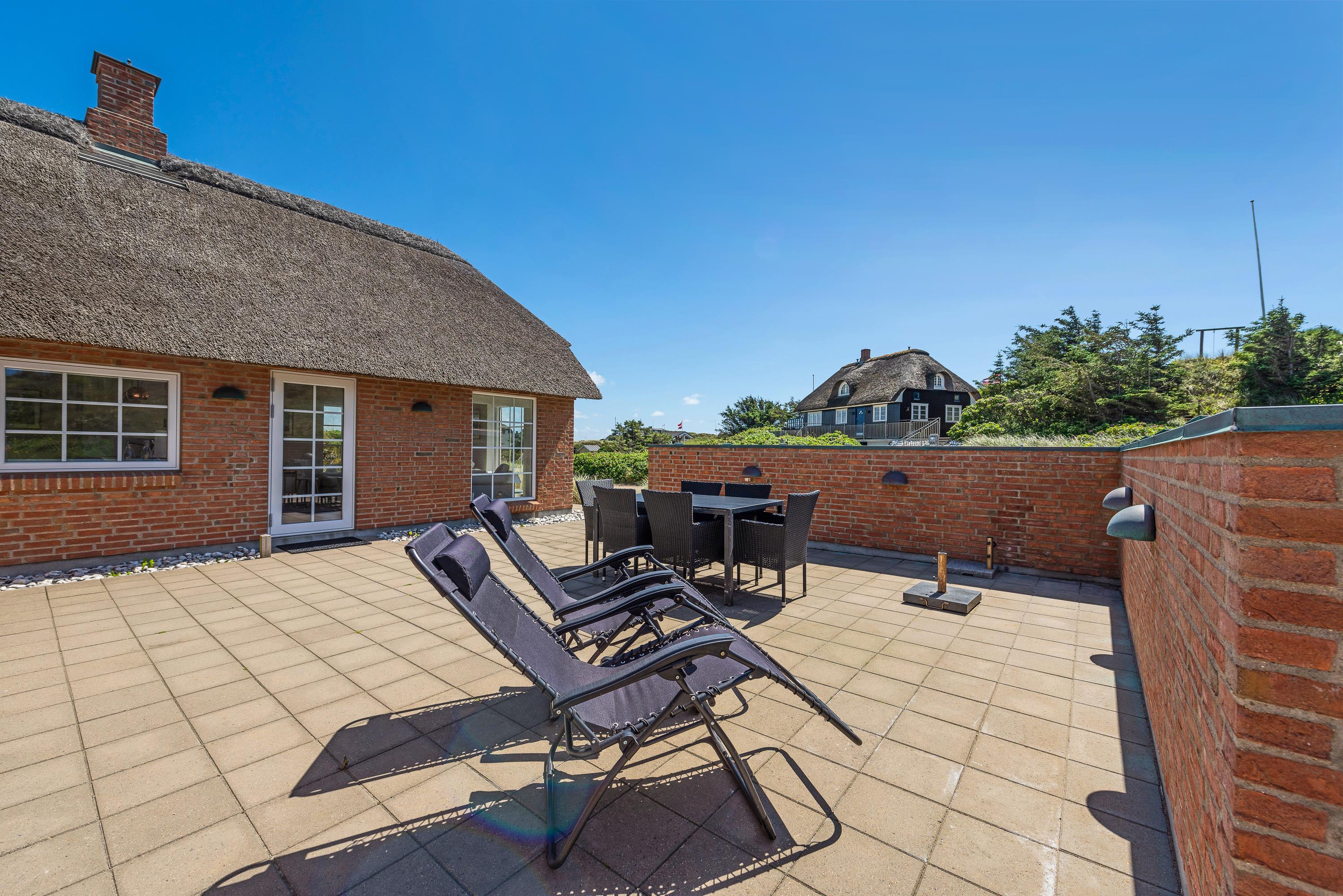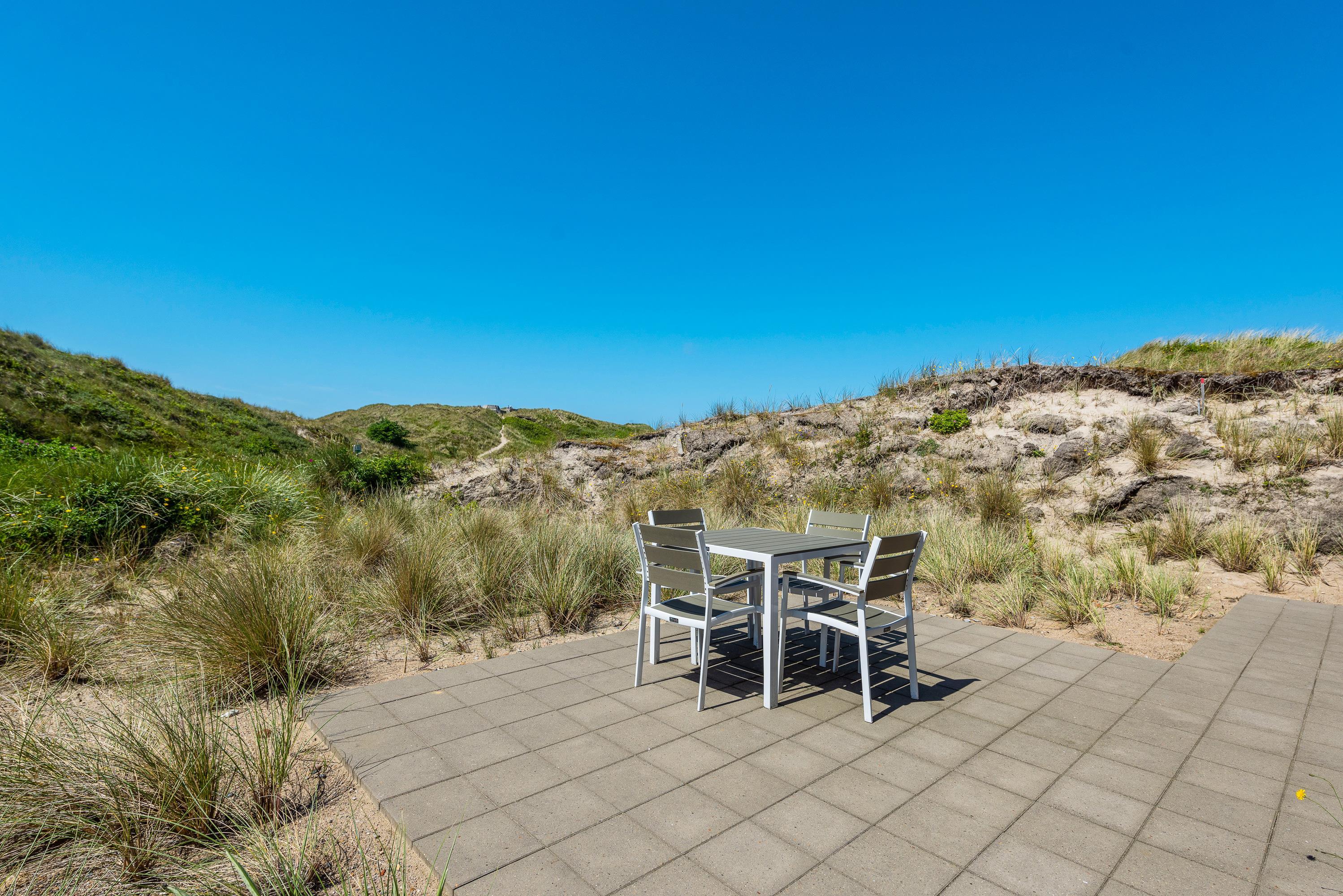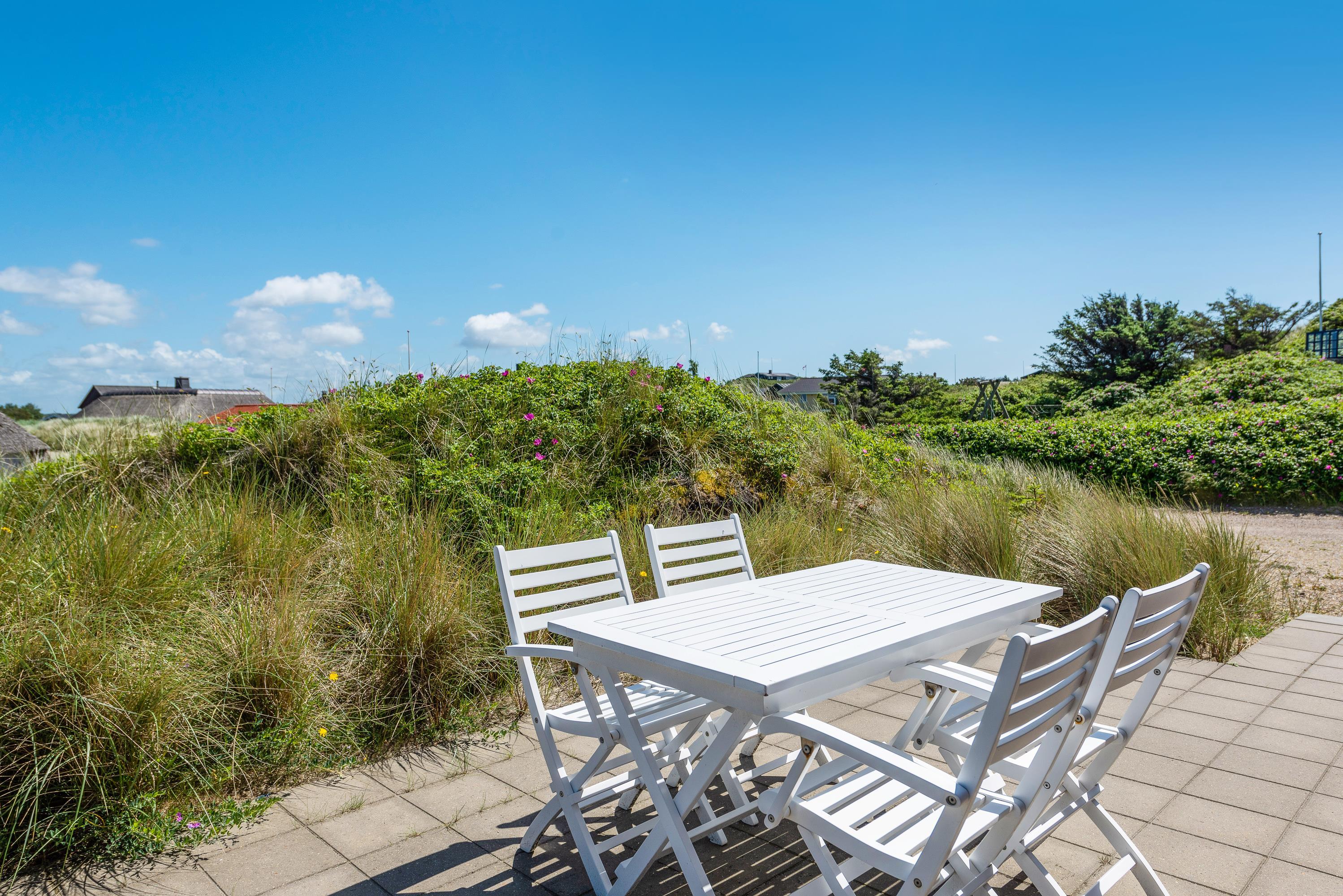 Der er flere terrasser rundt om sommerhuset, så I stort set dagen lang kan følge solens gang. Den ene terrasse er desuden afskærmet, og de er alle forbundet af en flisesti. Fra terrasserne har I en flot udsigt ud over det lyngklædte klitlandskab, og I kan høre havet bruse på den anden side af klittoppen.