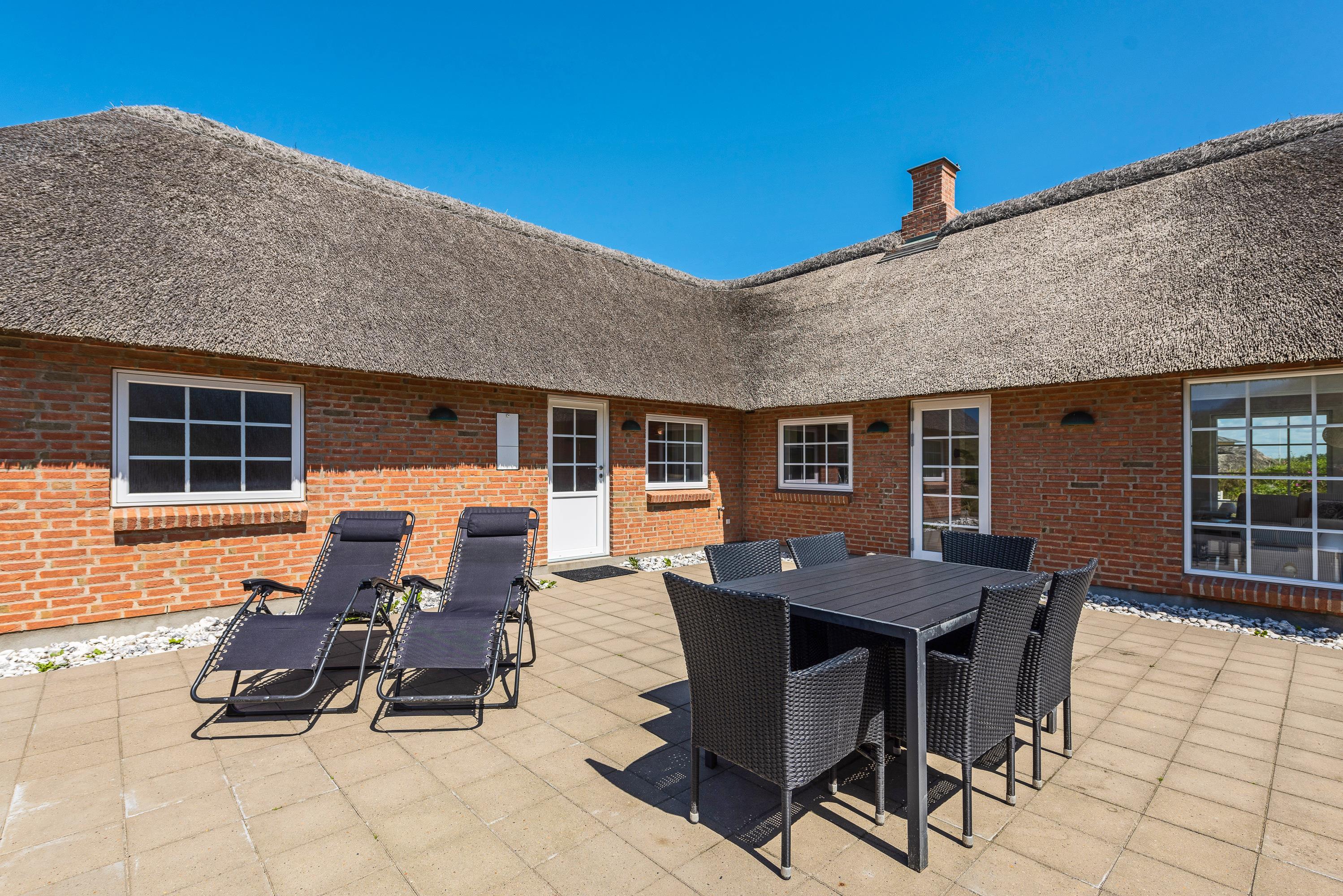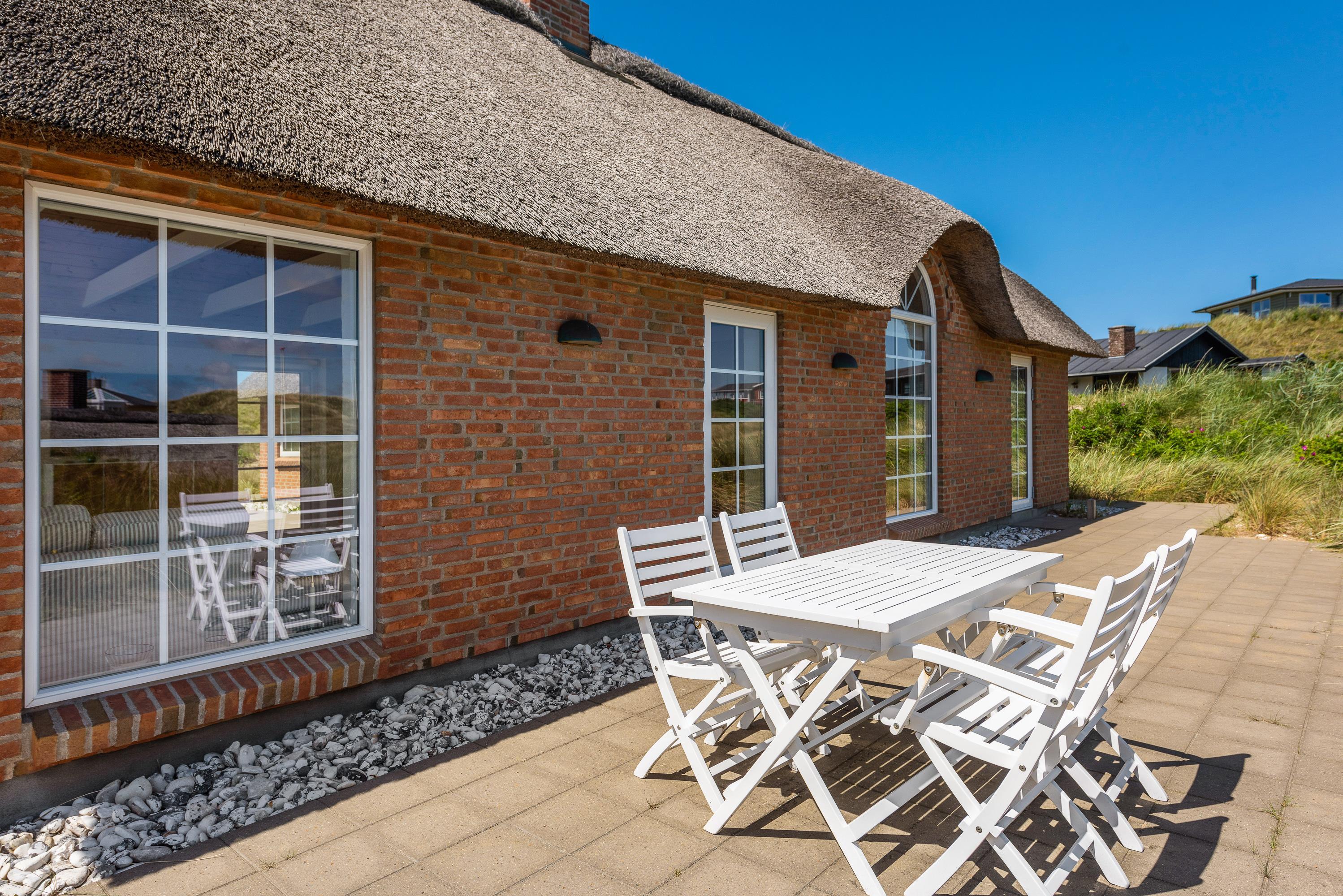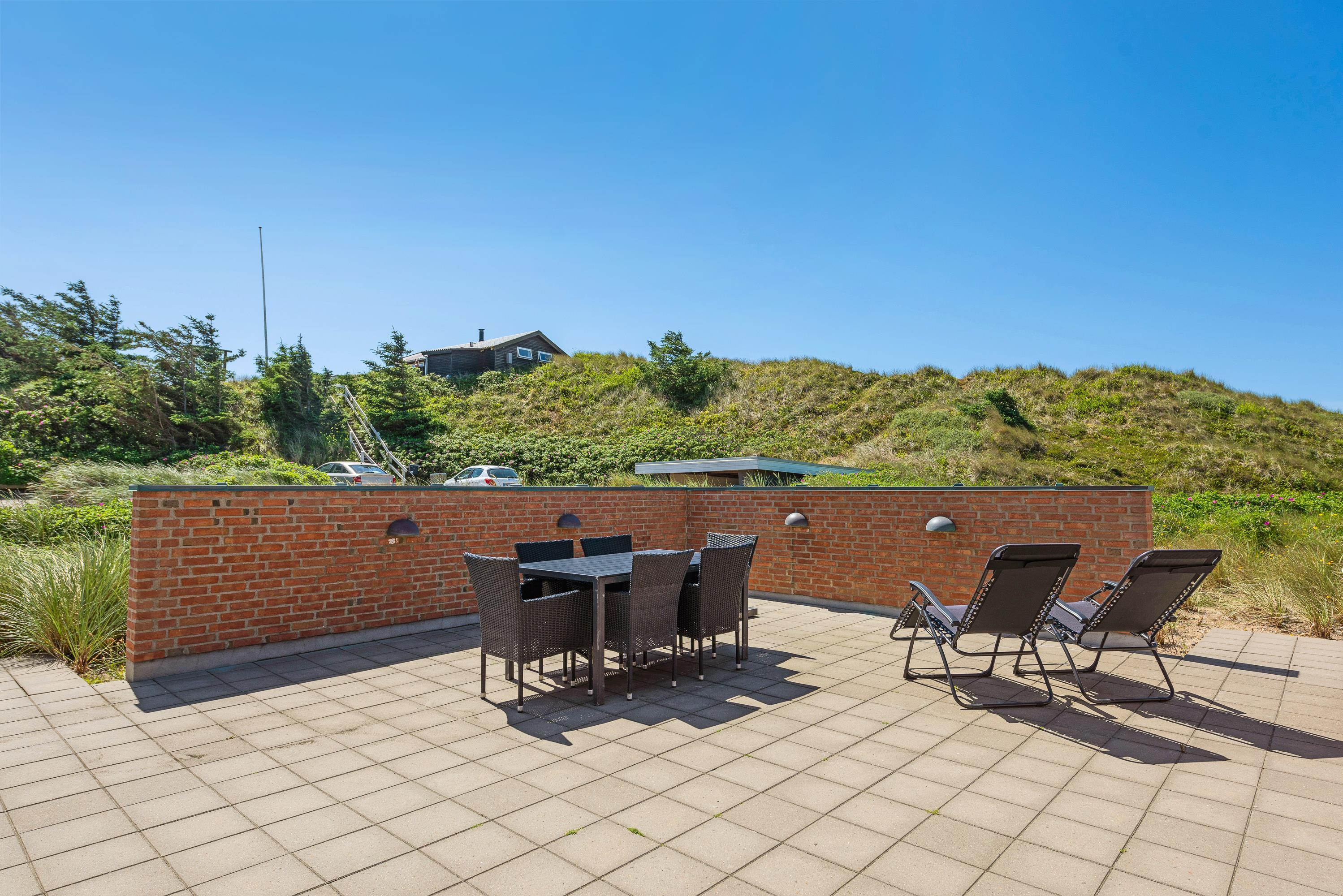 Der er flere terrasser rundt om sommerhuset, så I stort set dagen lang kan følge solens gang. Den ene terrasse er desuden afskærmet, og de er alle forbundet af en flisesti. Fra terrasserne har I en flot udsigt ud over det lyngklædte klitlandskab, og I kan høre havet bruse på den anden side af klittoppen.