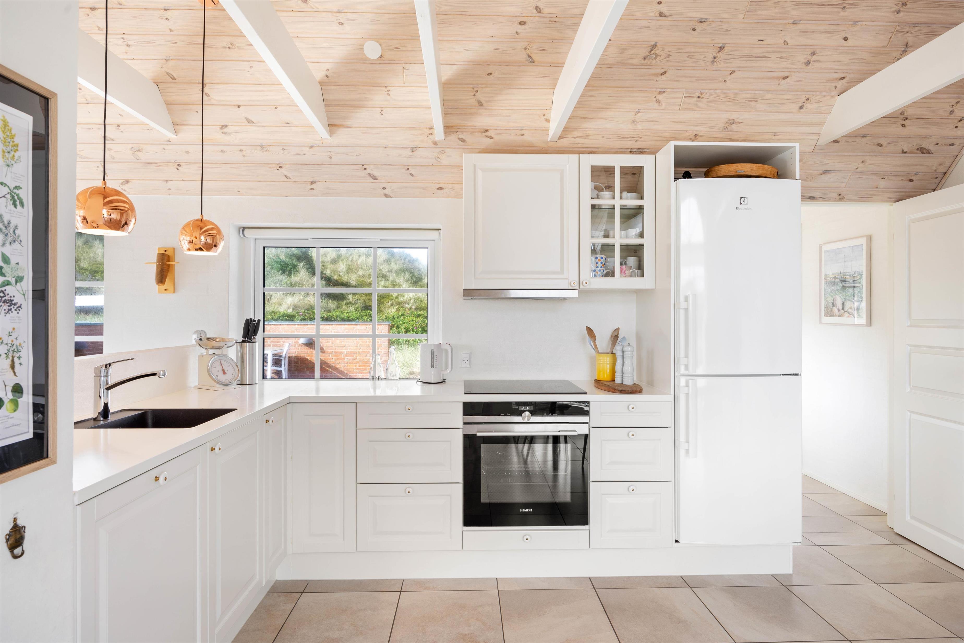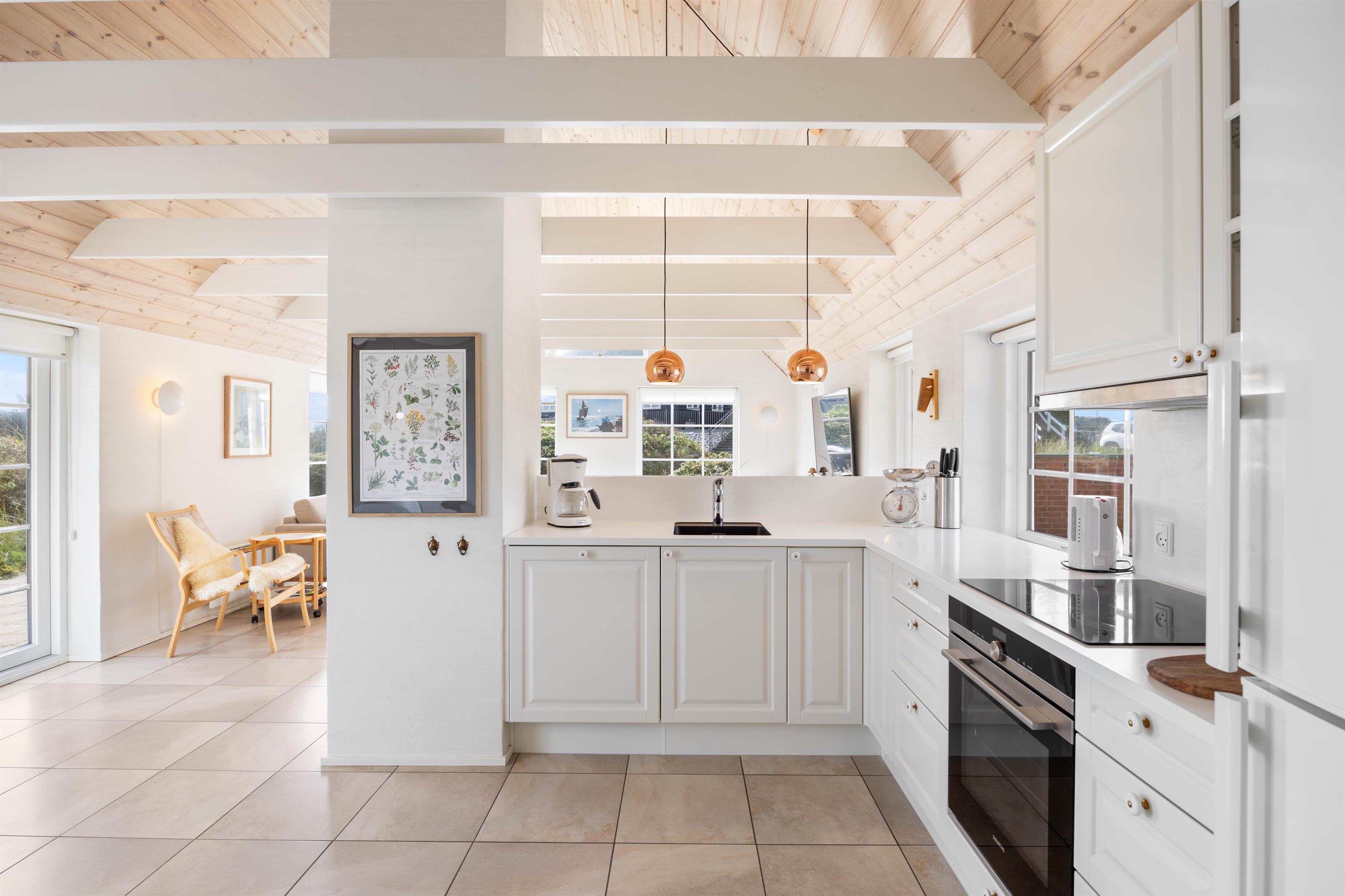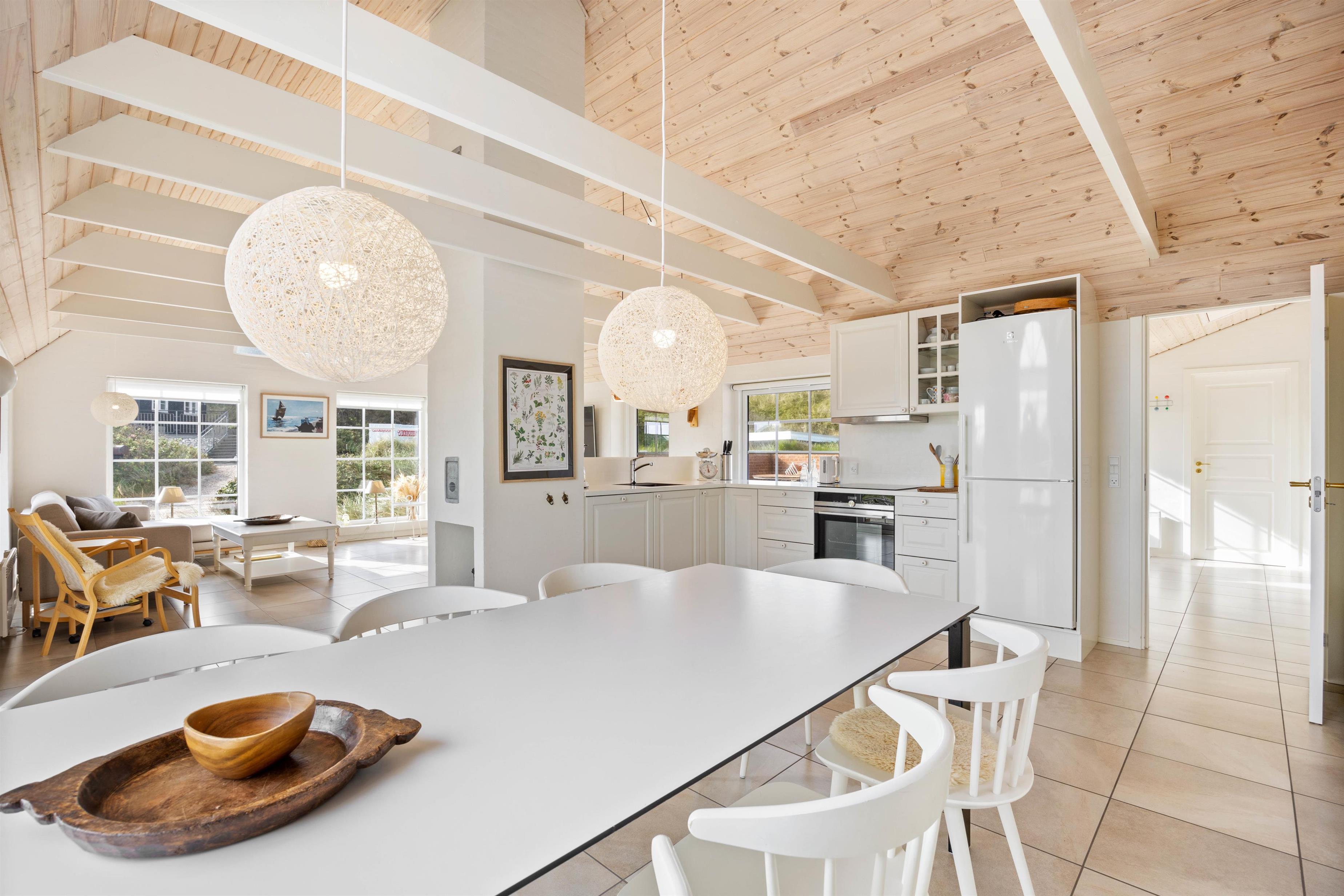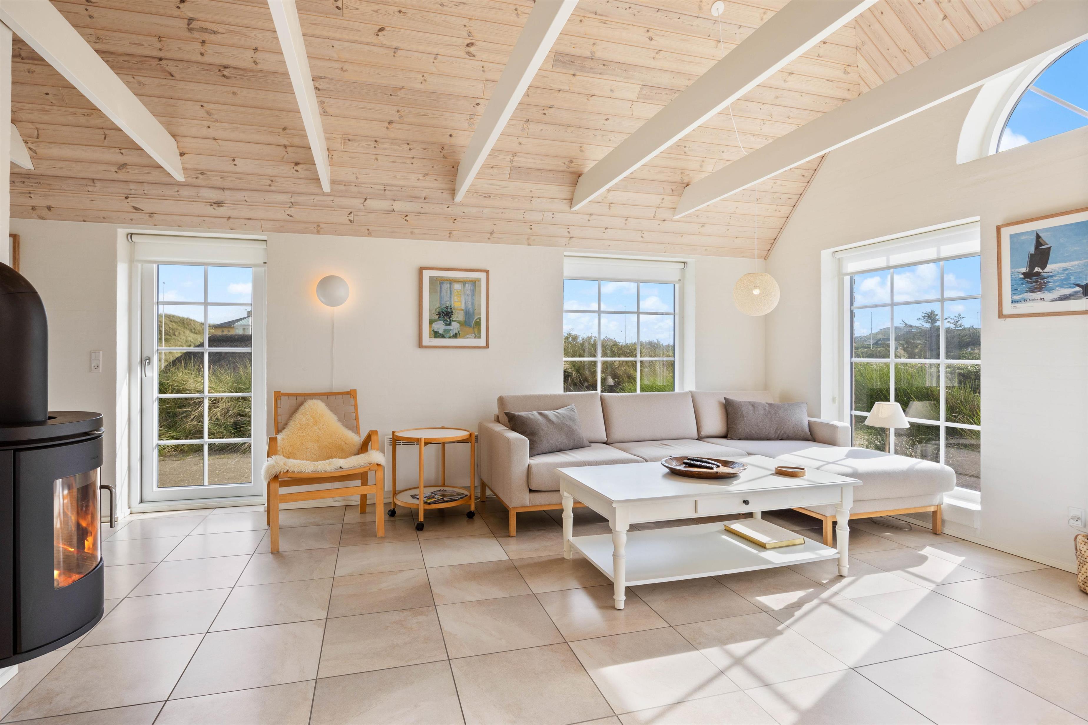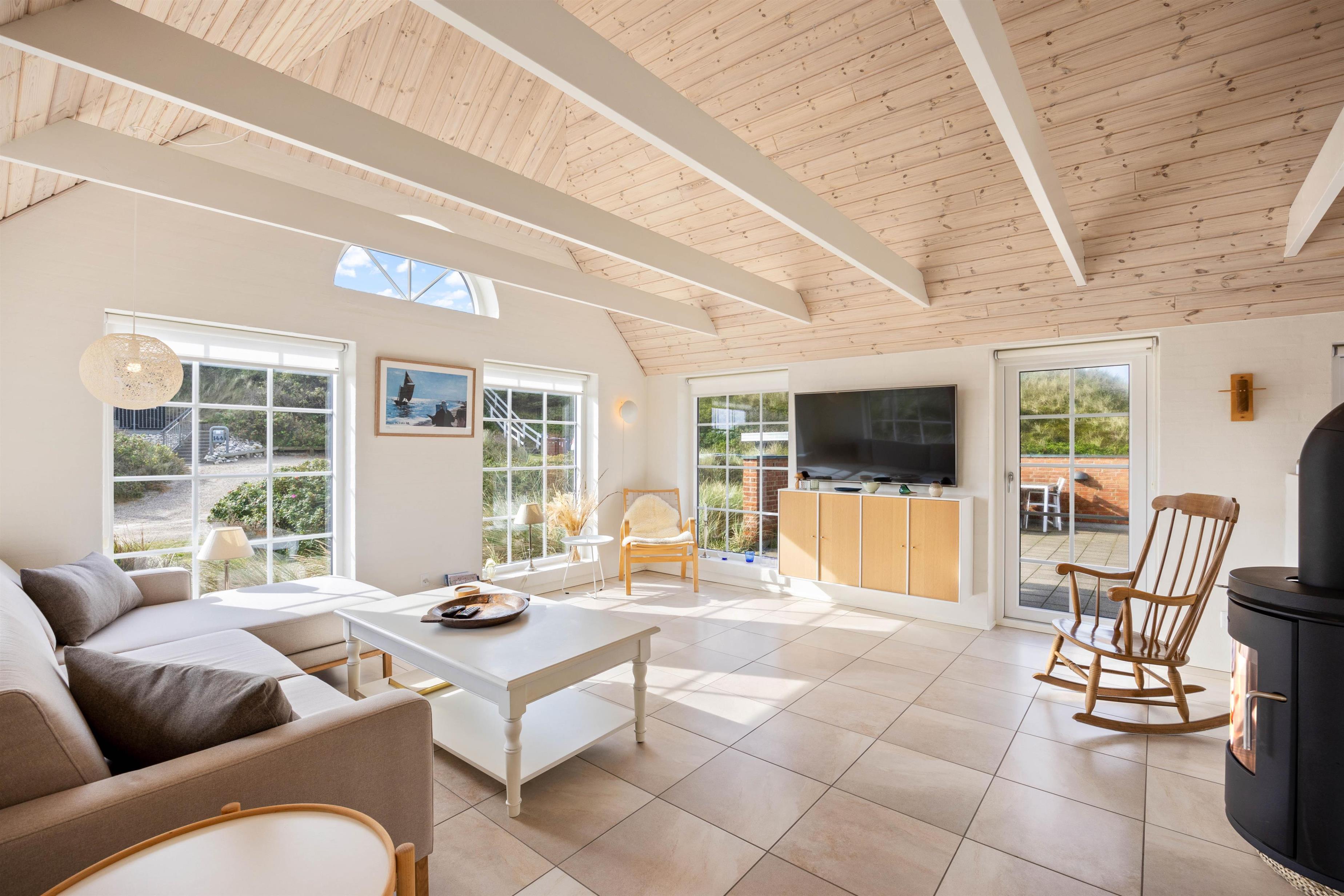 Sommerhuset på Nordsøvej 134 emmer af charme med sit stråtækte tag og sin skønne beliggenhed midt i klitterne. I får en virkelig indbydende indretning med lyse farver og højt til loftet, og de mange vinduer inviterer solens stråler og den vestjyske natur indenfor.