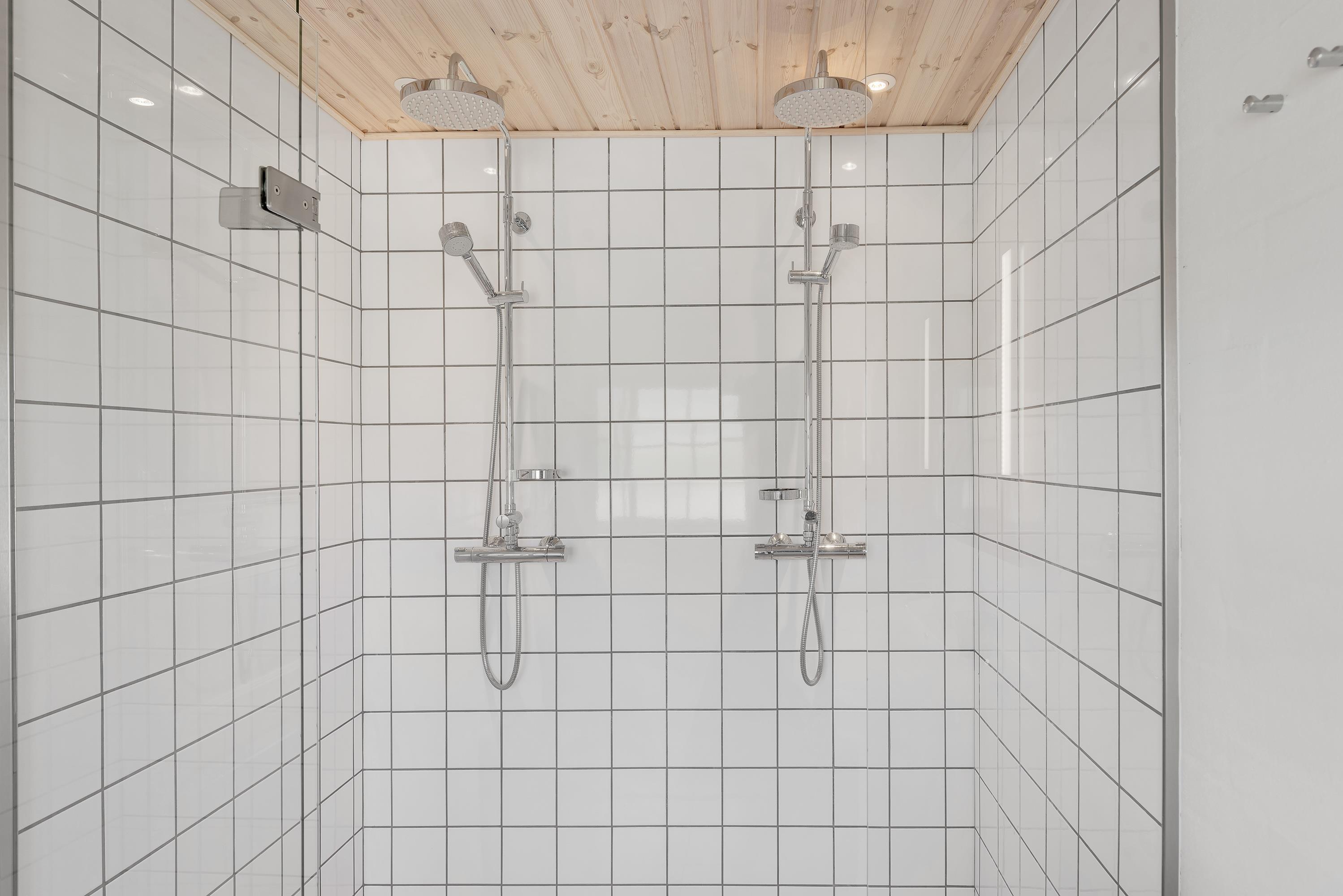 Sommerhuset er indrettet med to badeværelser, hvilket er meget praktisk, hvis der bliver fuldt hus. Mens det ene badeværelse er udstyret med dobbeltbruser, gemmer det andet badeværelse på en lille, privat wellness-oase med sauna og spabad.