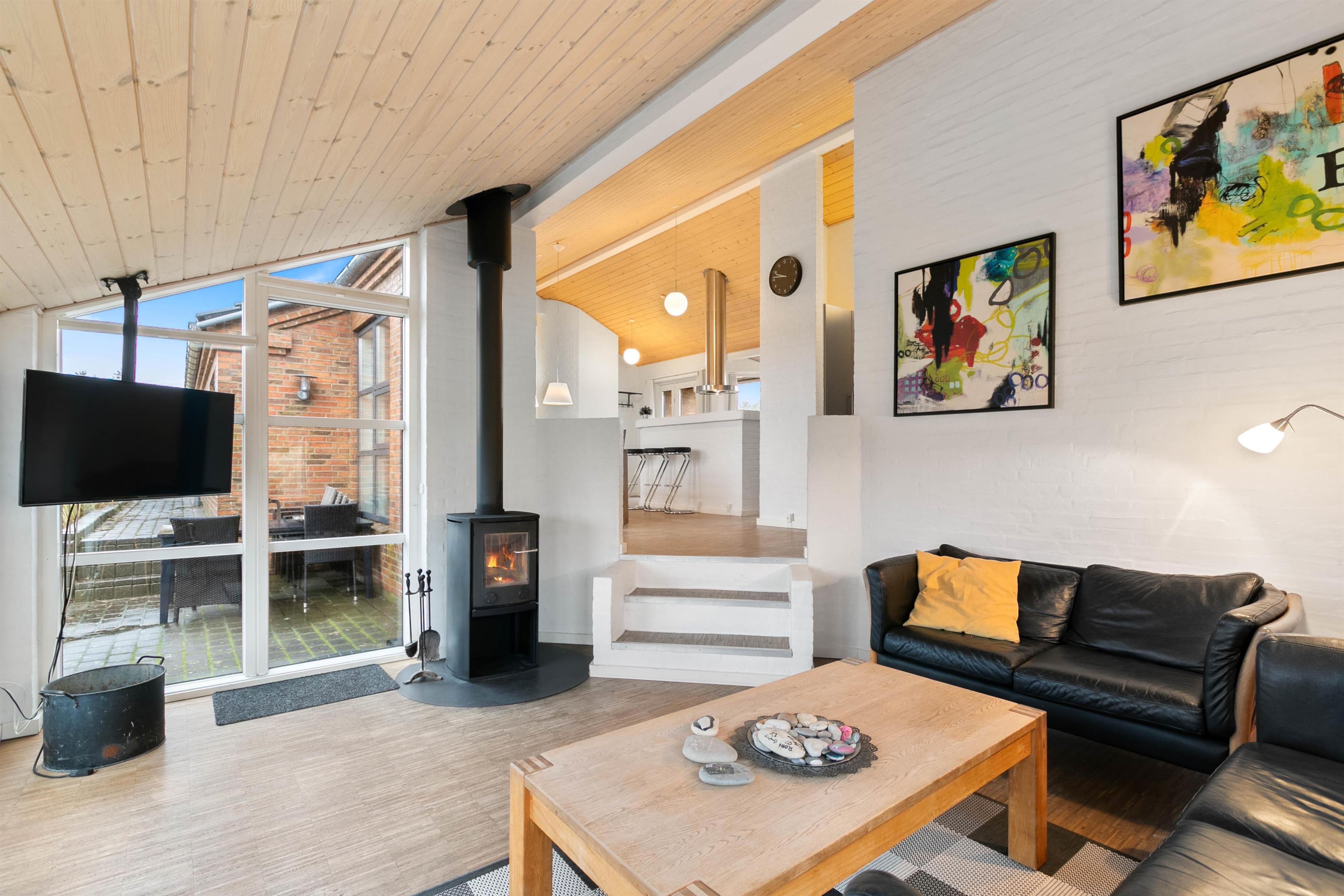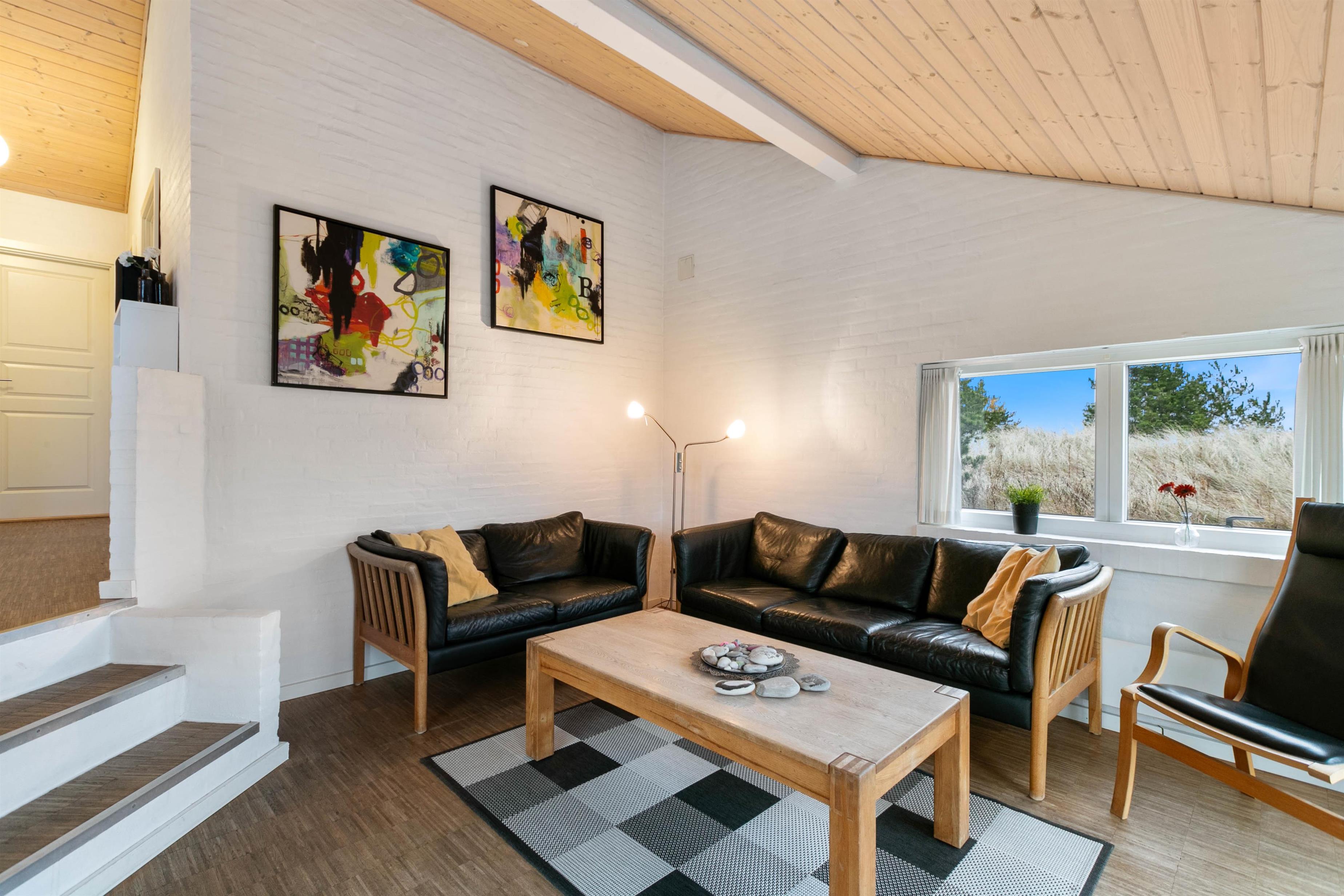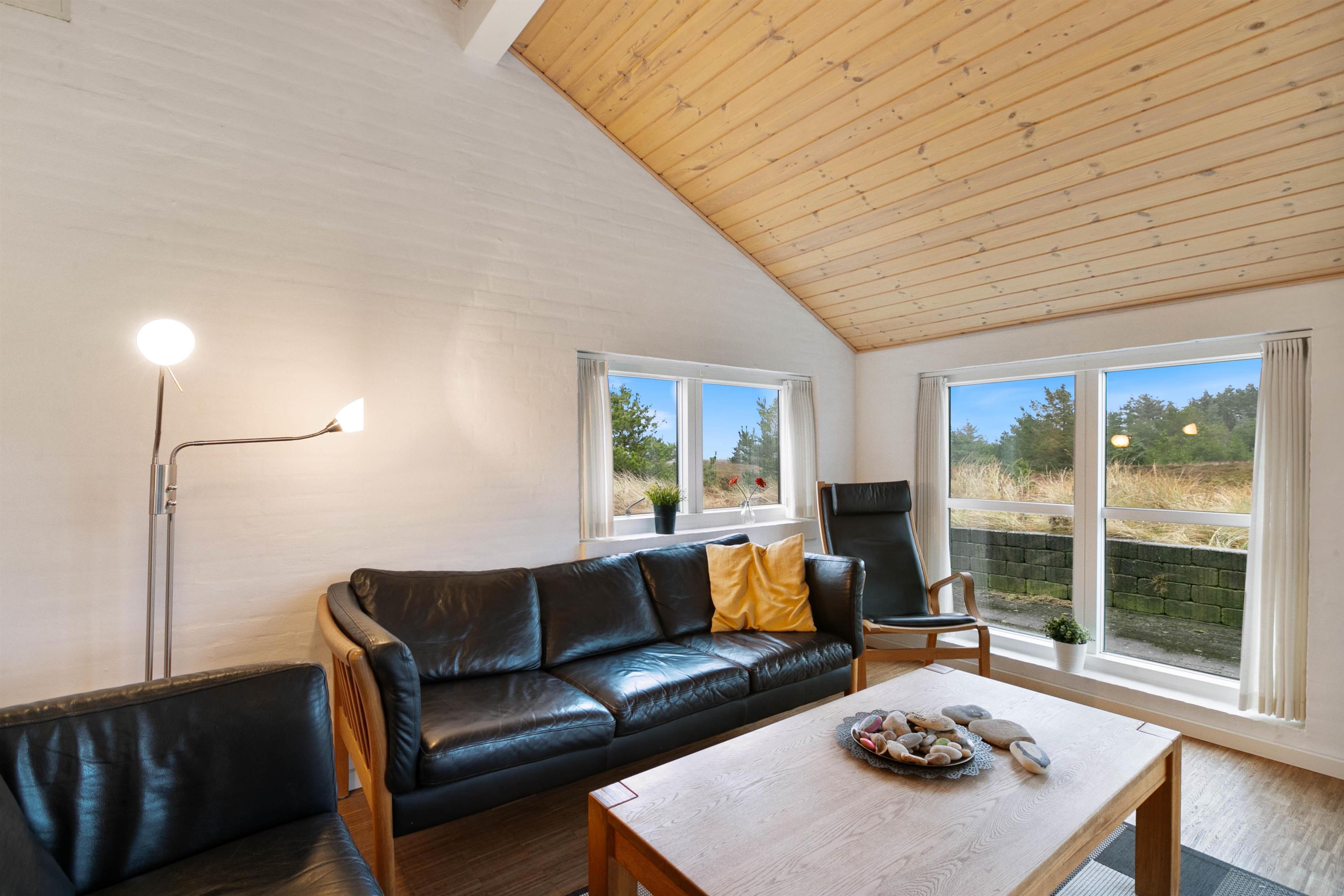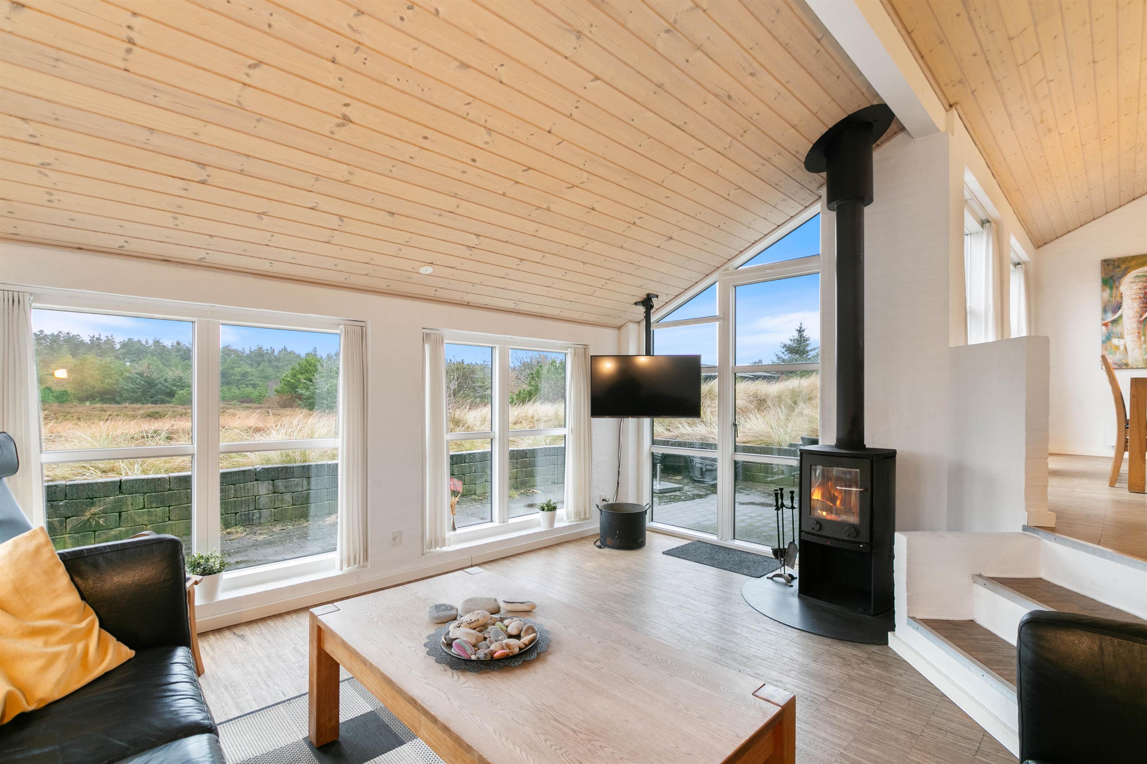 Sommerhuset er opført efter moderne standarder. Huset råder over et dejligt opholdsrum, hvor I finder spiseplads og en stue, som ligger i forskudt plan med spisestuen. Stuen er velindrettet, og her er masser af plads til at hele familien kan samles. Fra den forsænket stue har du et imponerende kig ud over Ringkøbing Fjord, mens det flotte gulv går igennem hele huset og er med til at give huset et klassisk og indbydende look. Det er også i stuen, hvor I kan finde husets brændeovn, der er klar til at sprede en masse hygge og varme.