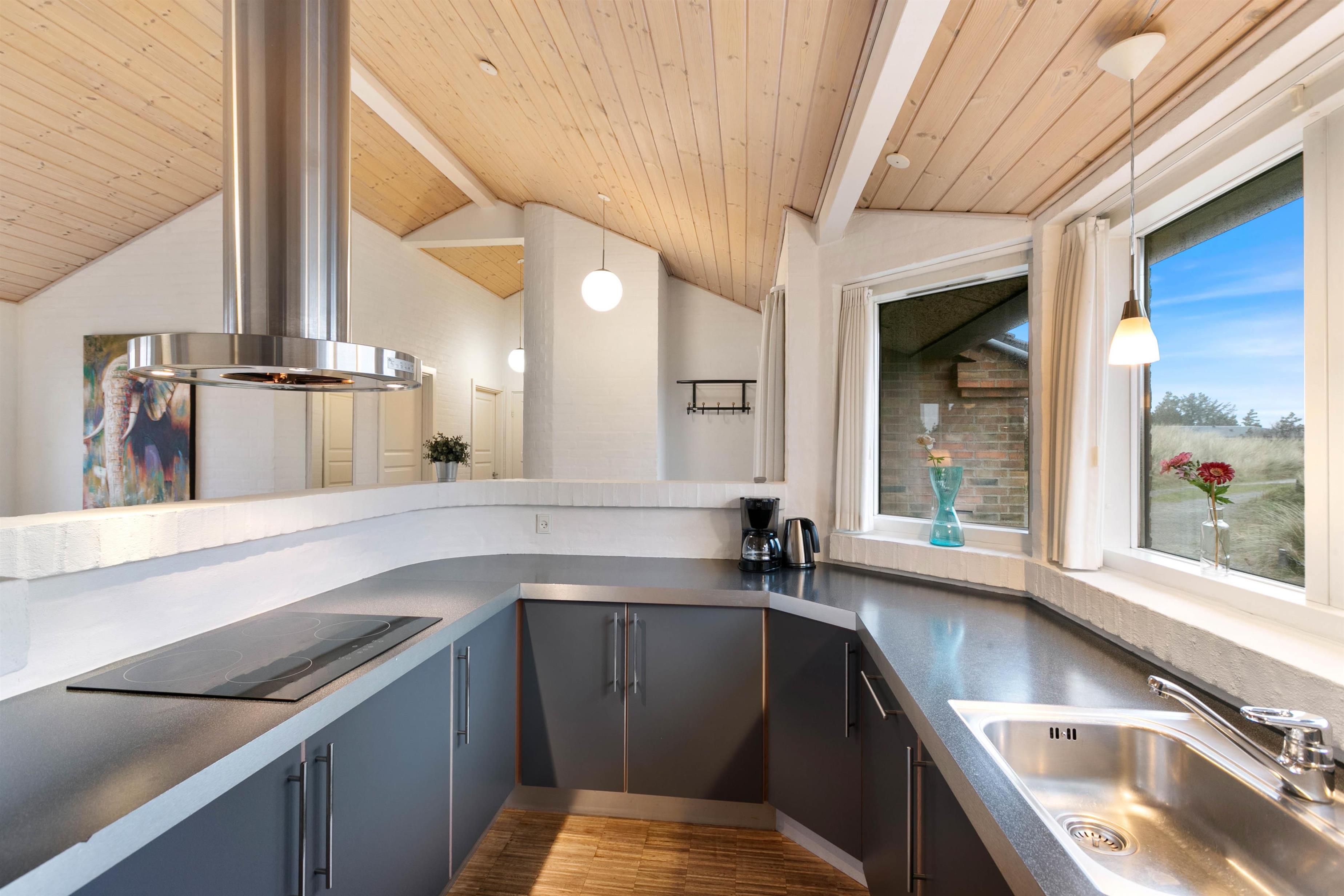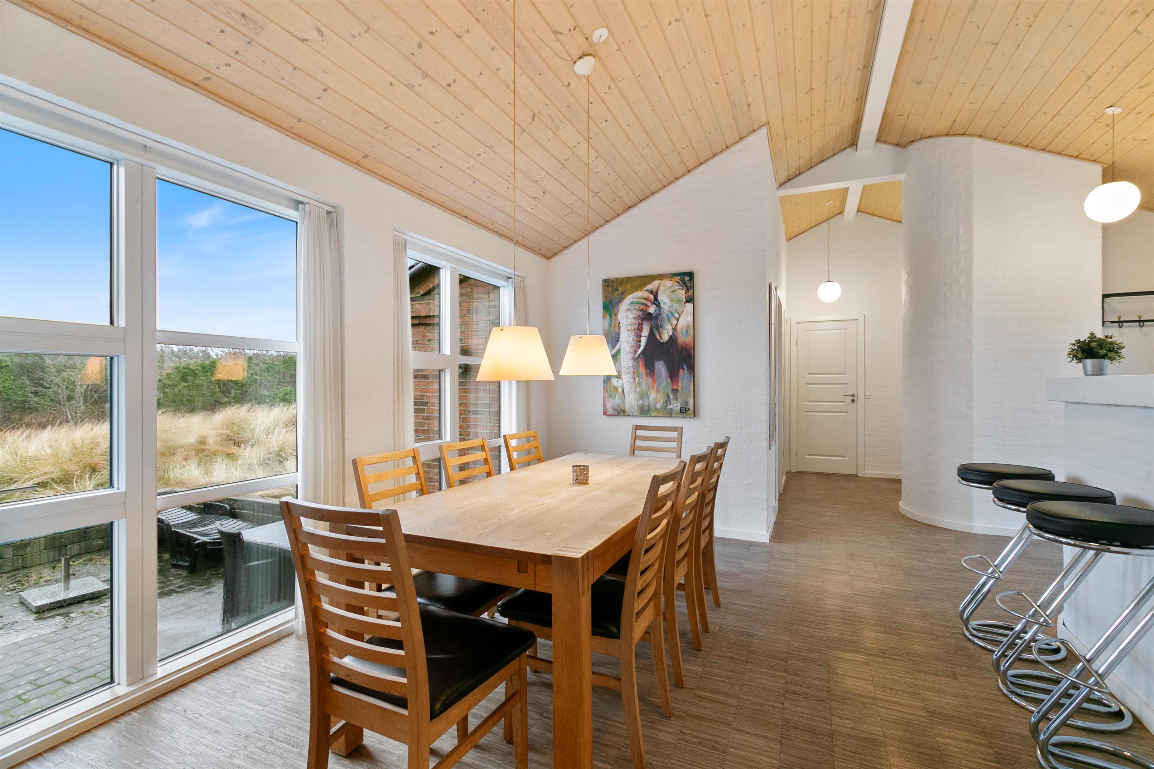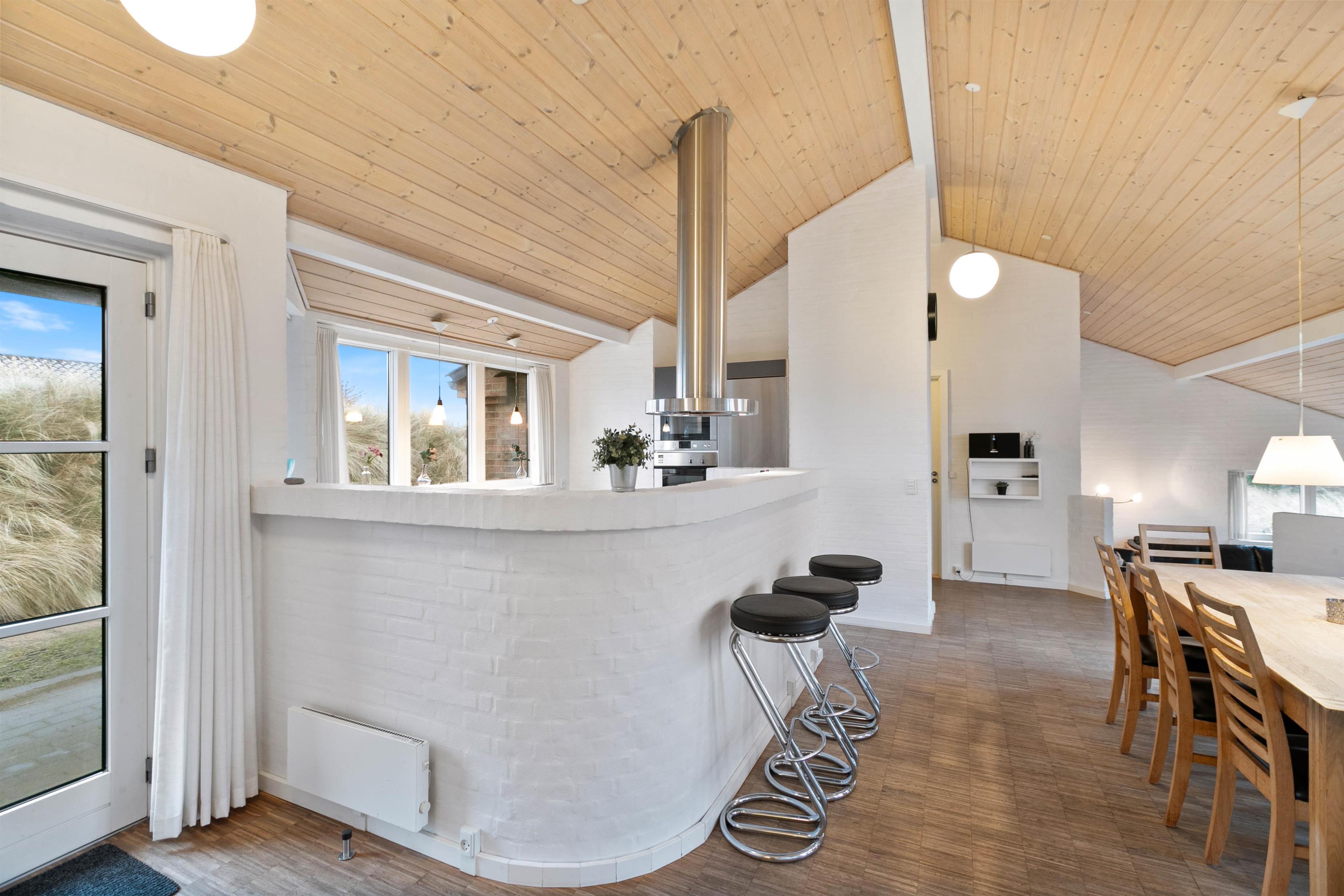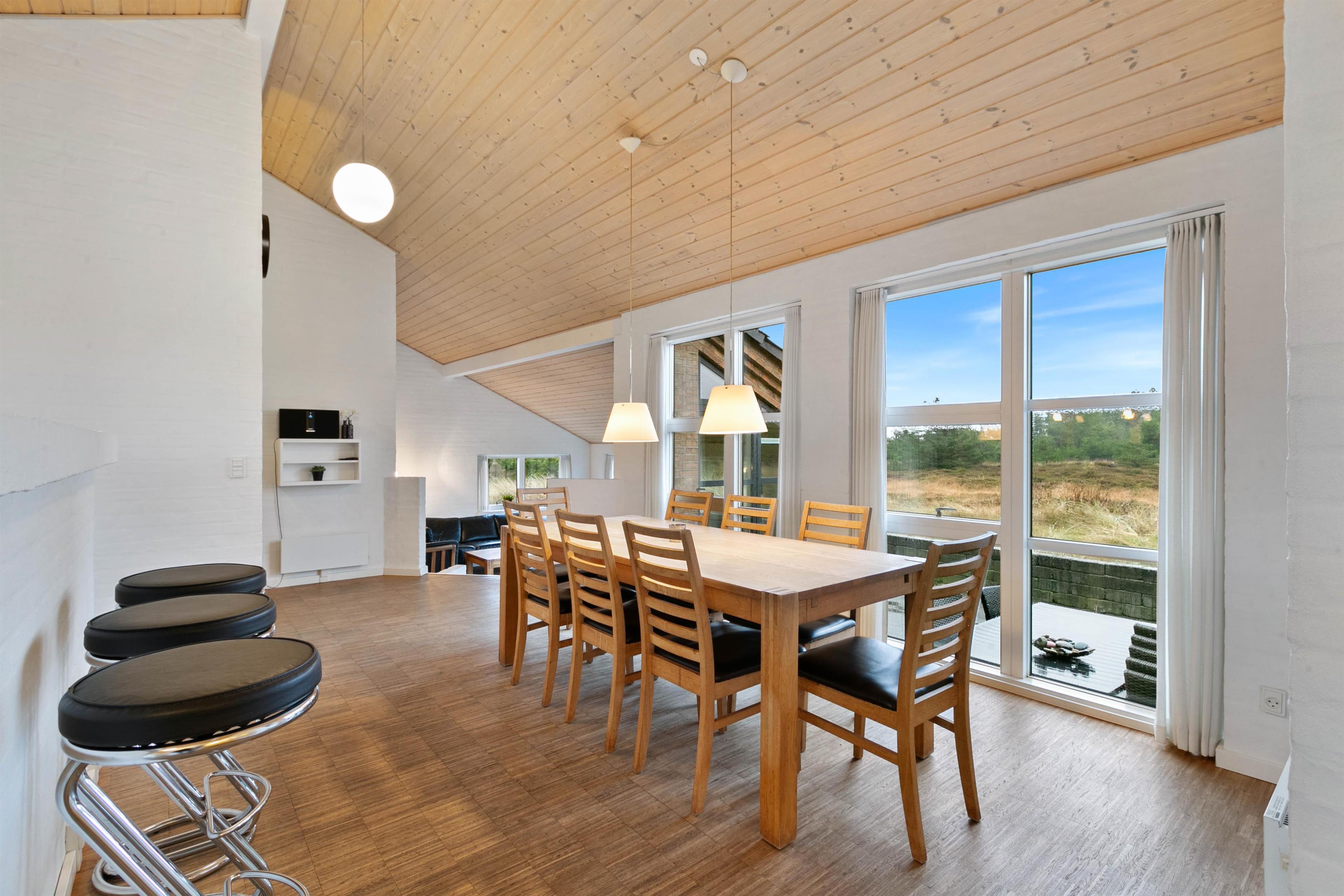 Sommerhuset er opført efter moderne standarder. Huset råder over et dejligt opholdsrum, hvor I finder spiseplads og en stue, som ligger i forskudt plan med spisestuen. Stuen er velindrettet, og her er masser af plads til at hele familien kan samles. Fra den forsænket stue har du et imponerende kig ud over Ringkøbing Fjord, mens det flotte gulv går igennem hele huset og er med til at give huset et klassisk og indbydende look. Det er også i stuen, hvor I kan finde husets brændeovn, der er klar til at sprede en masse hygge og varme.