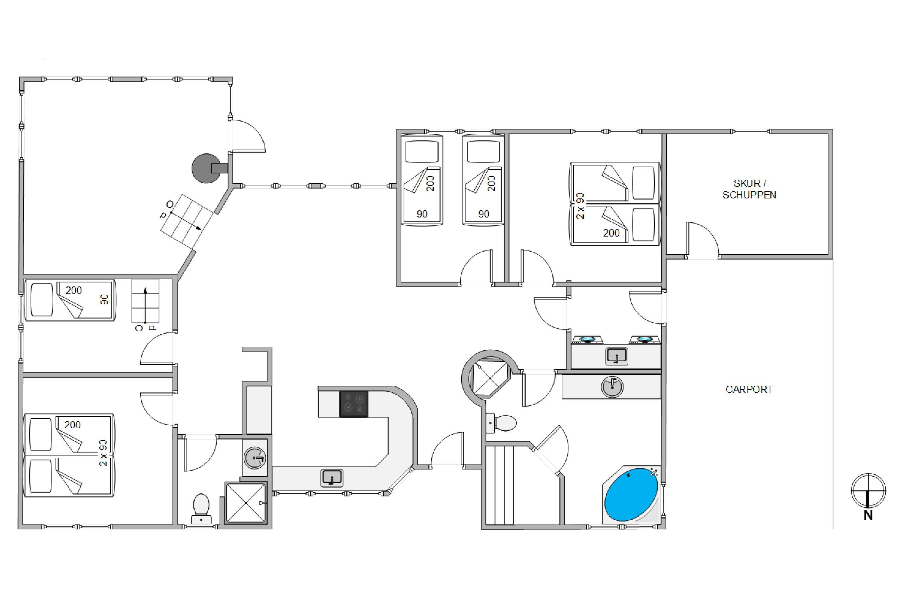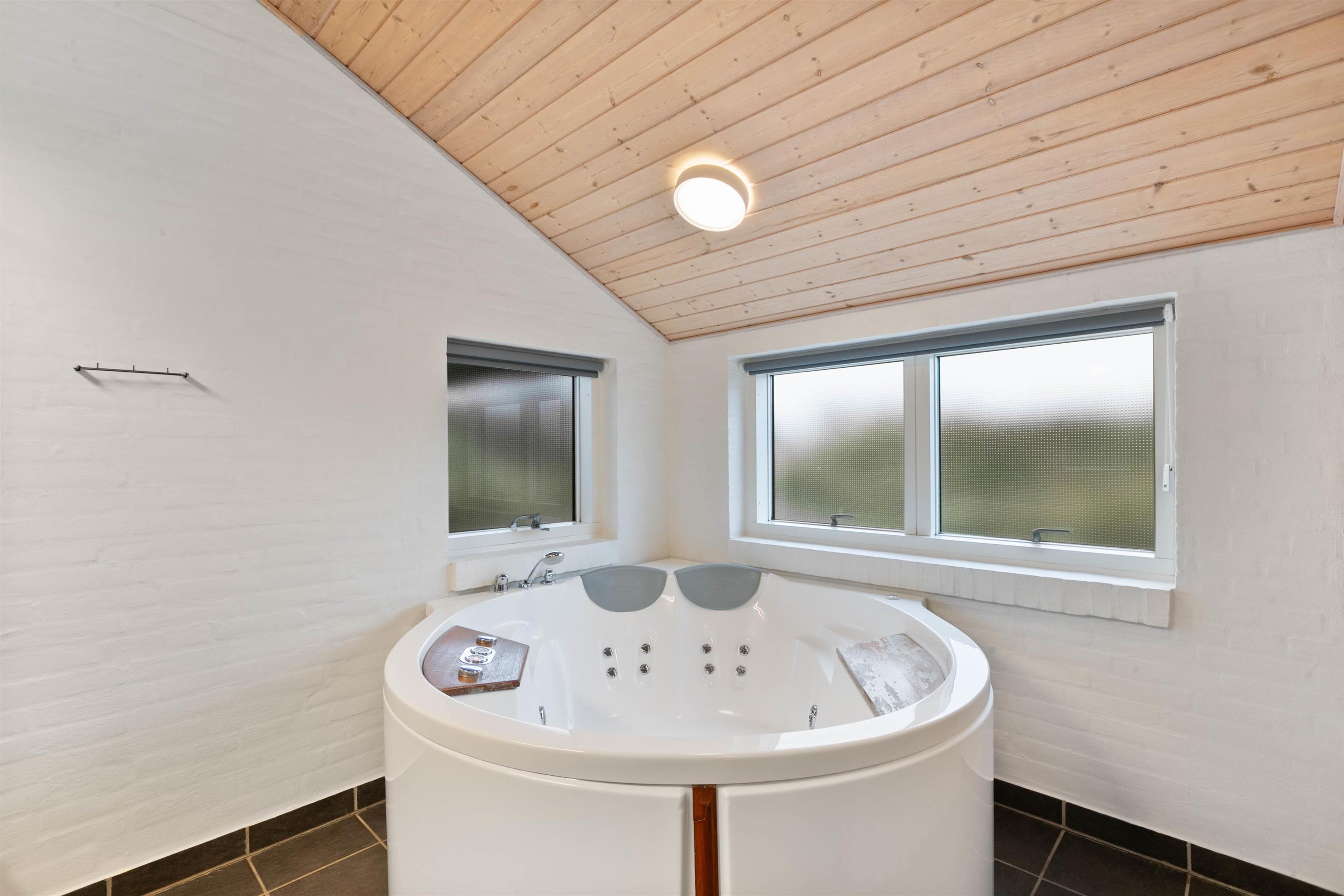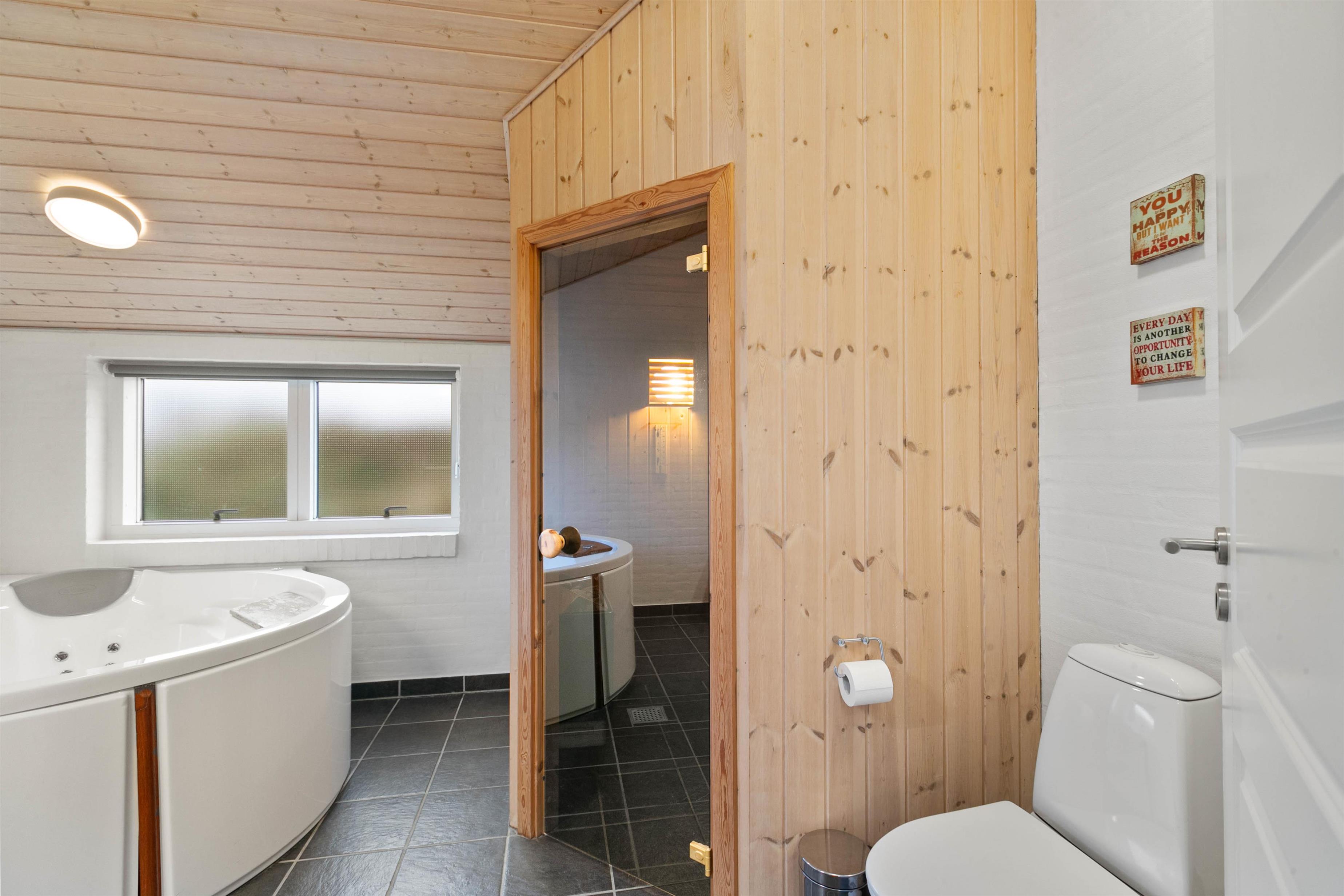 Sommerhuset er klar til at imødekomme alle jeres ønsker. Køkkenet er yderst praktisk med både opvaskemaskine og en separat fryser på 60 liter, hvilket altid er skønt og bidrager til at gøre madlavningen nemmere og mere bekvem. På badeværelserne, hvoraf det ene er udstyret med gulvvarme, kan I slappe af med en skøn tømmespa og saunaoplevelse.