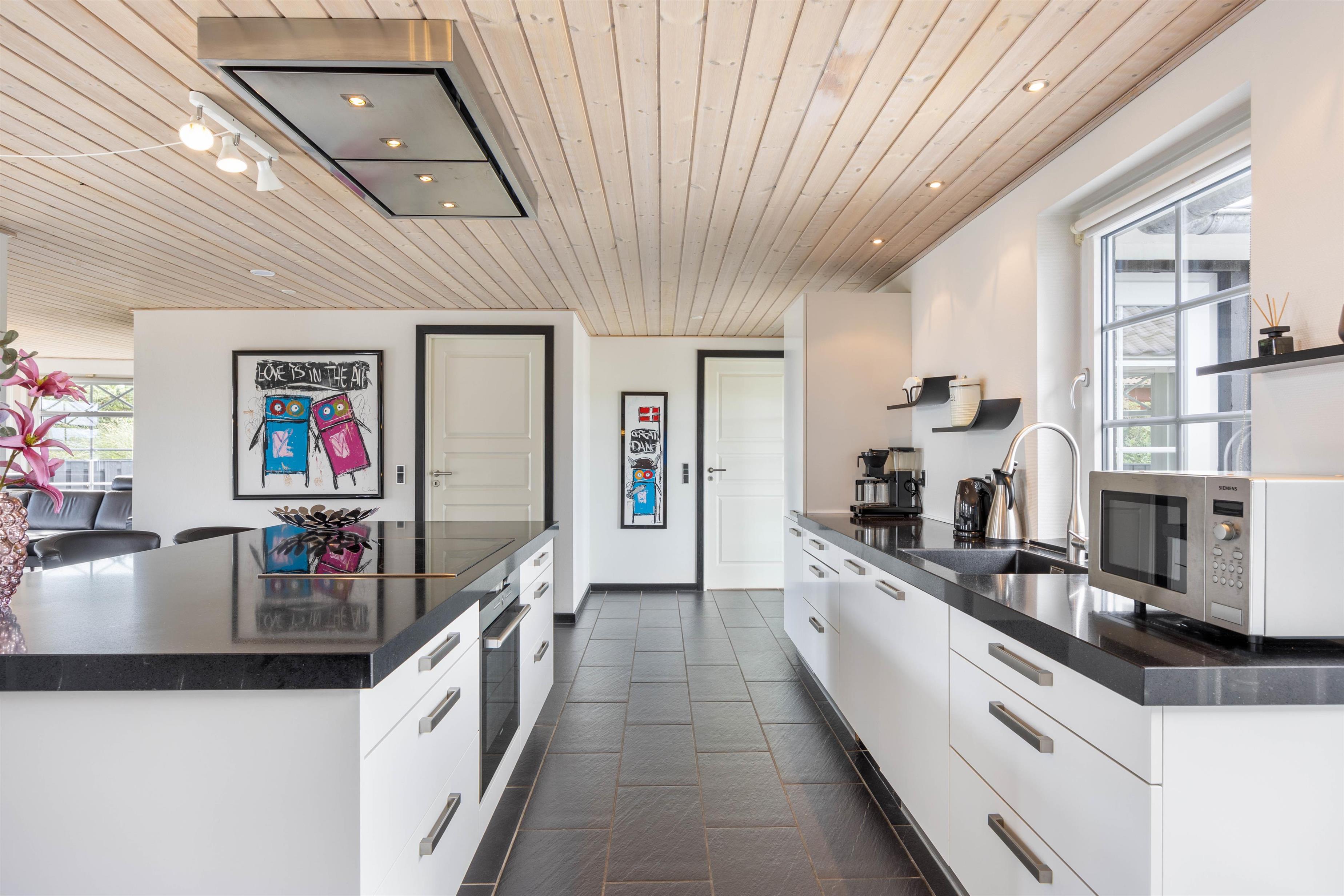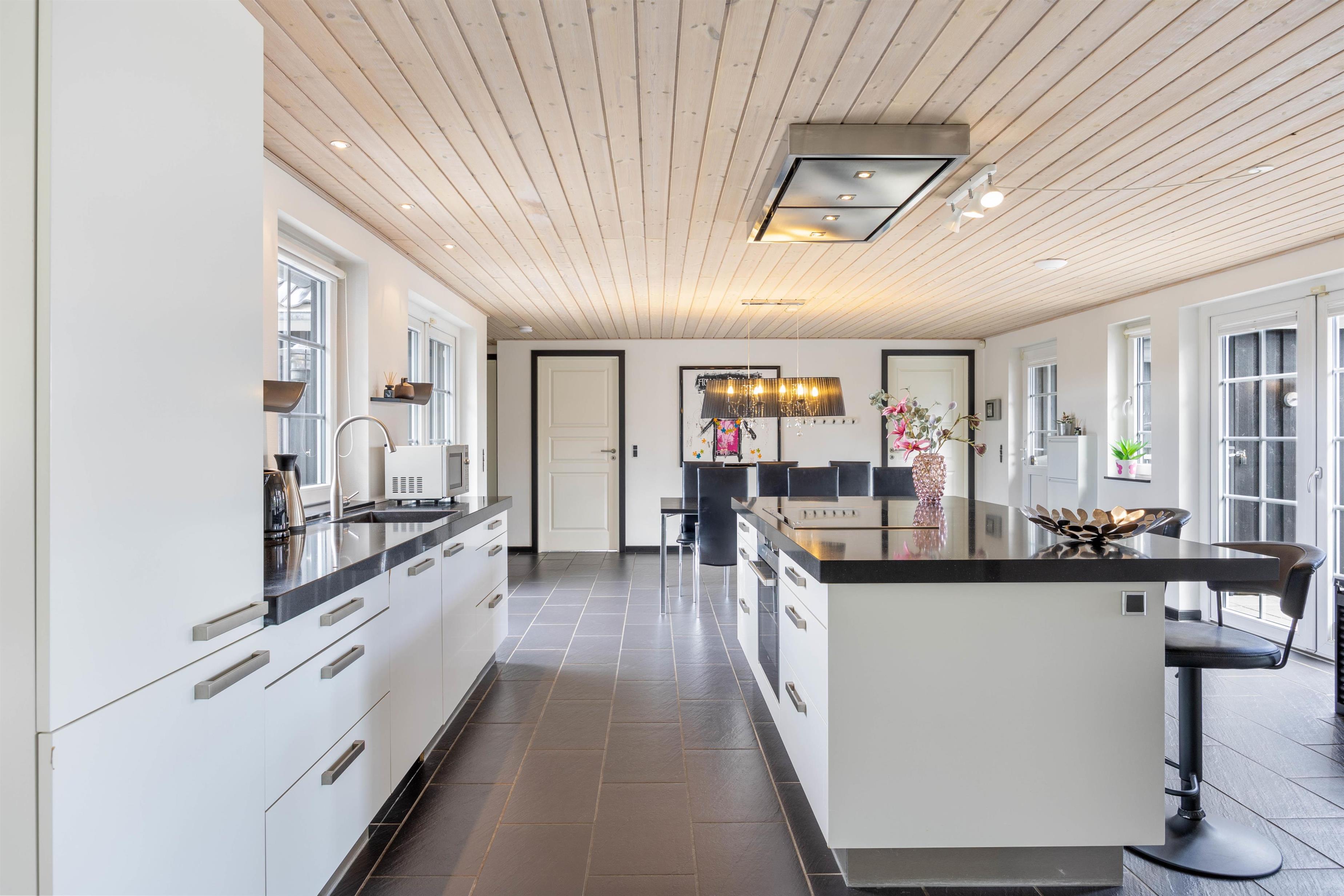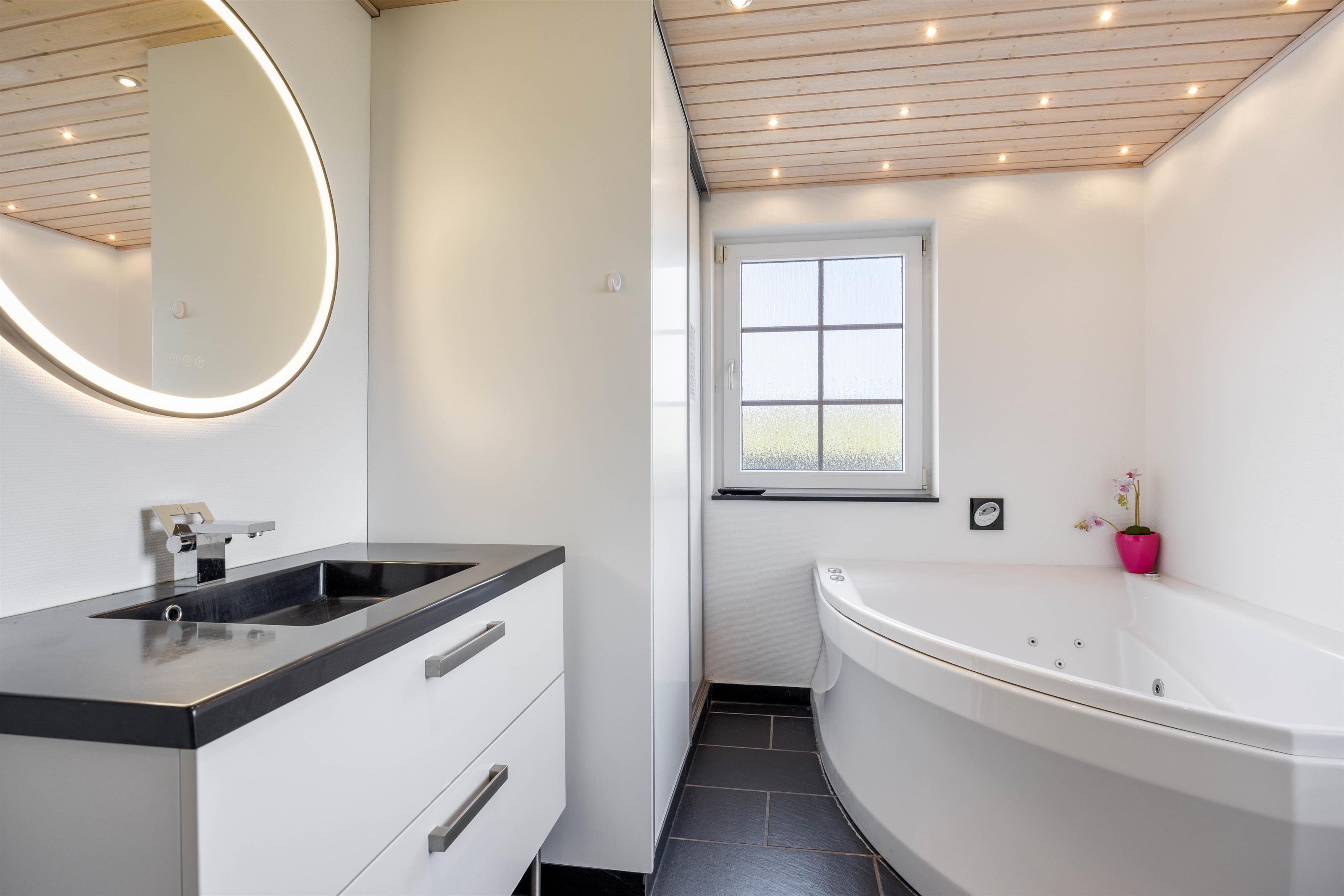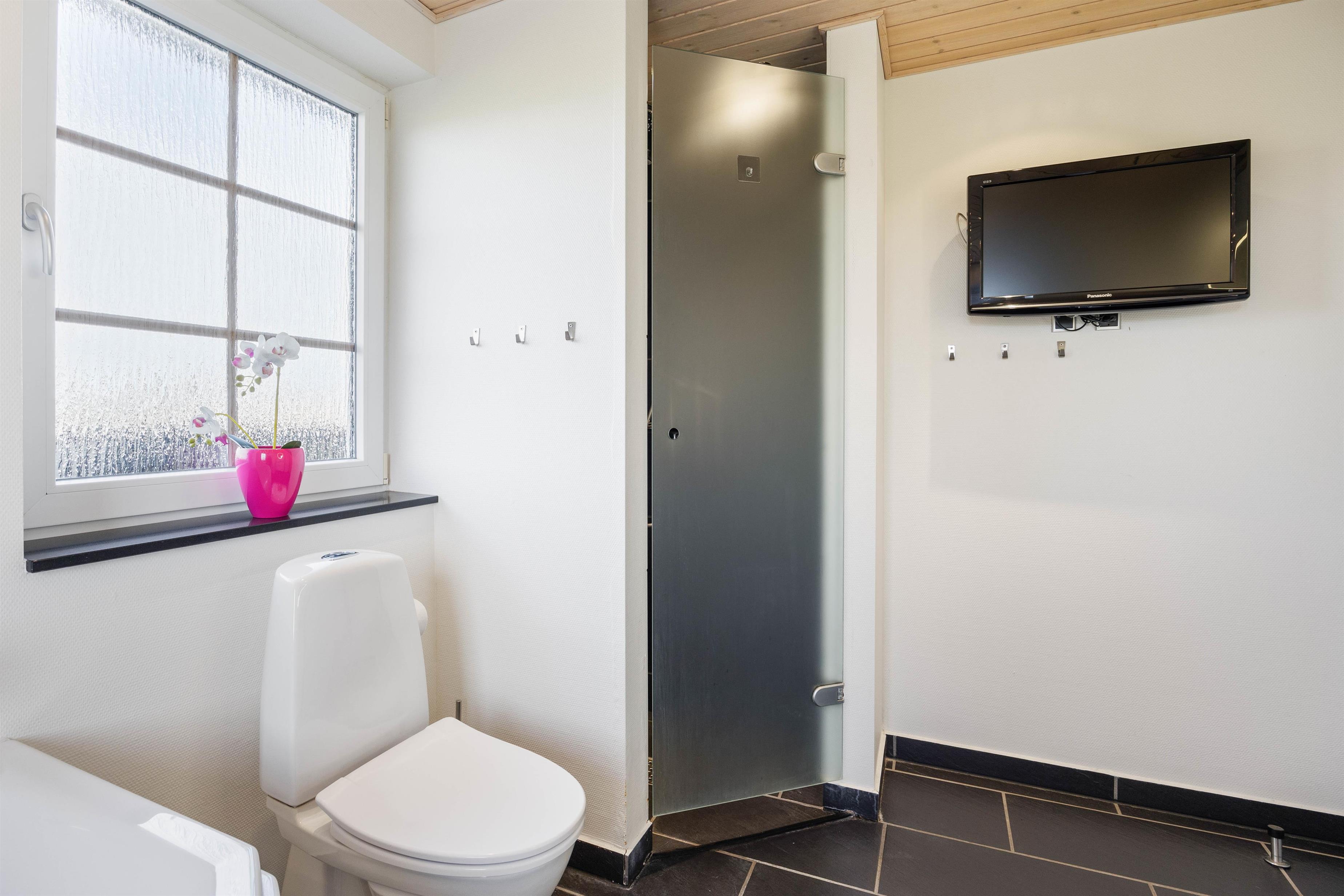 Der er 2 badeværelser begge med bruseniche. På det store badeværelse finder I en hjørnespa, vaskemaskinen og tørretumbleren er gemt bag skydedørsskabene. Der er et fladskærms-TV på væggen. Køkkenet er placeret midt i huset, og er det naturlige omdrejningspunkt. Her er masser af plads til hele familien.
