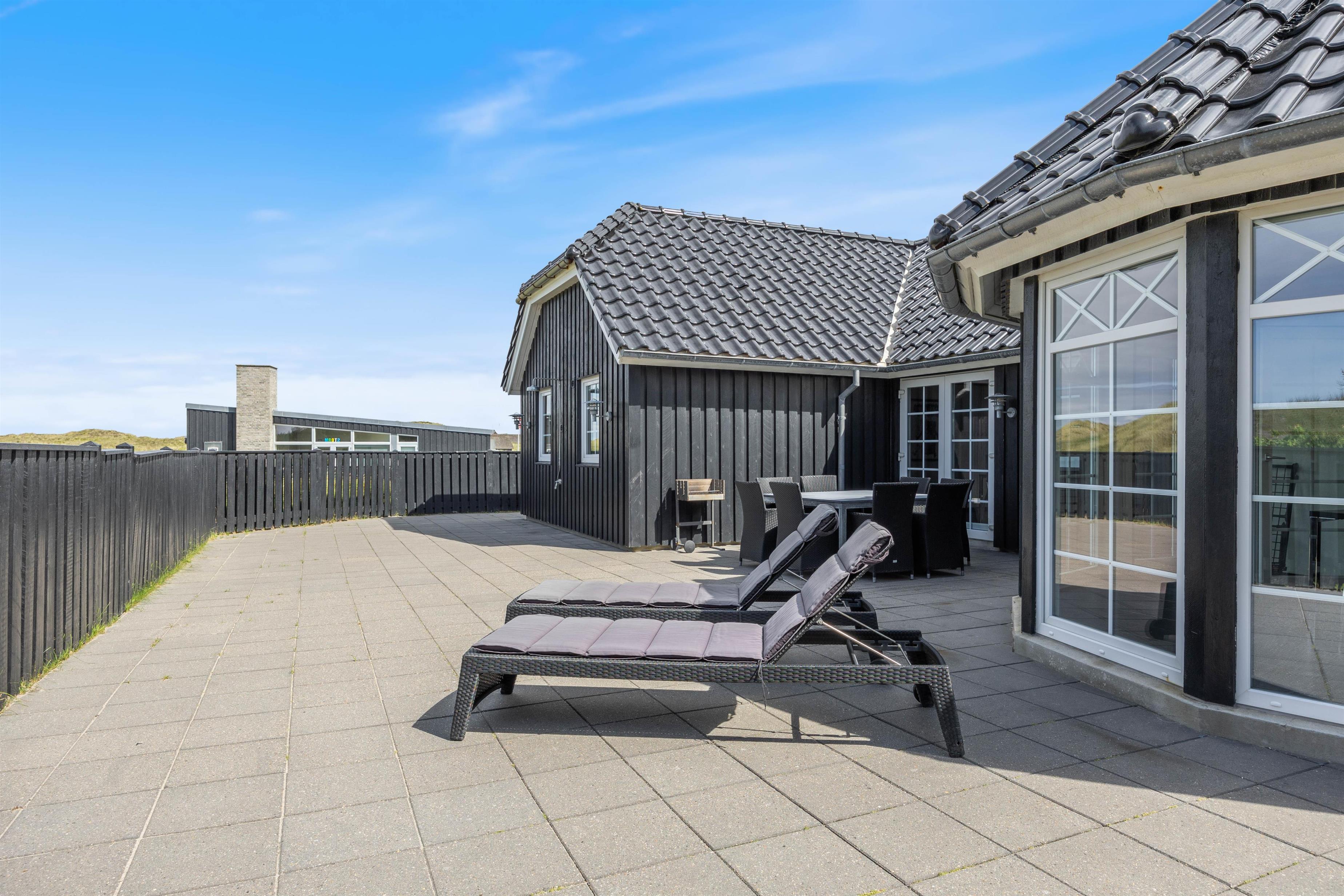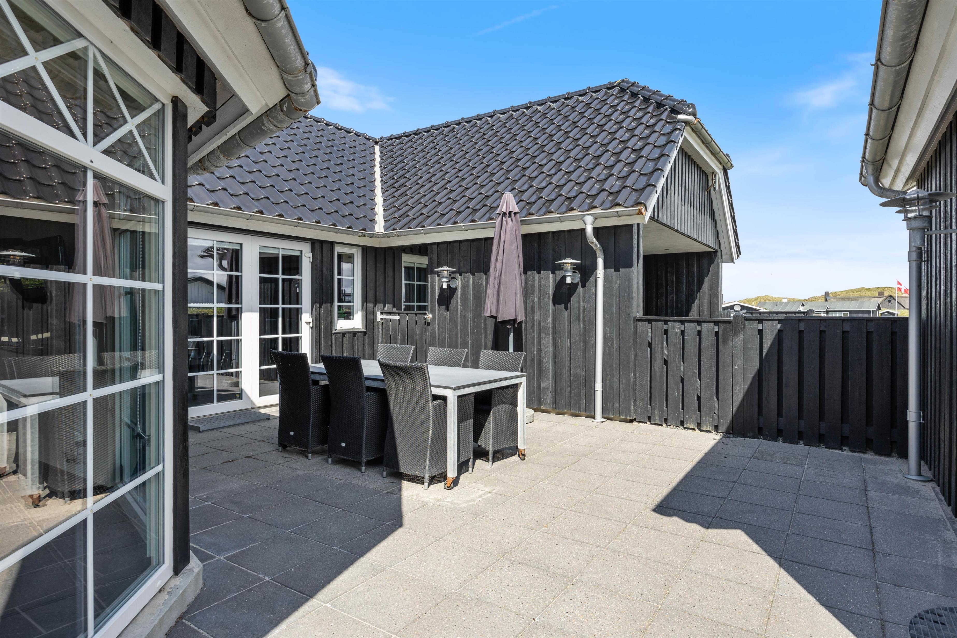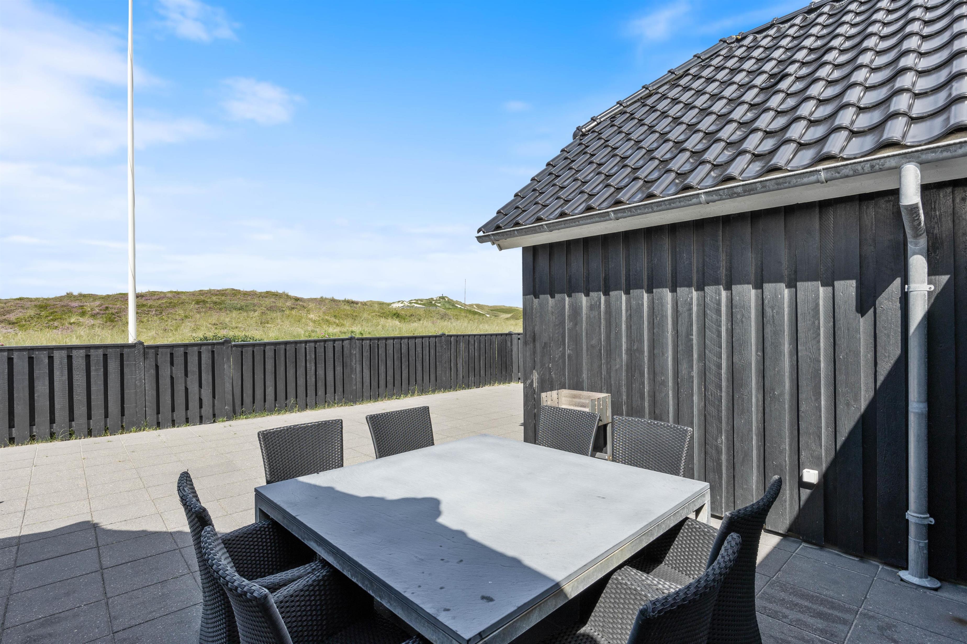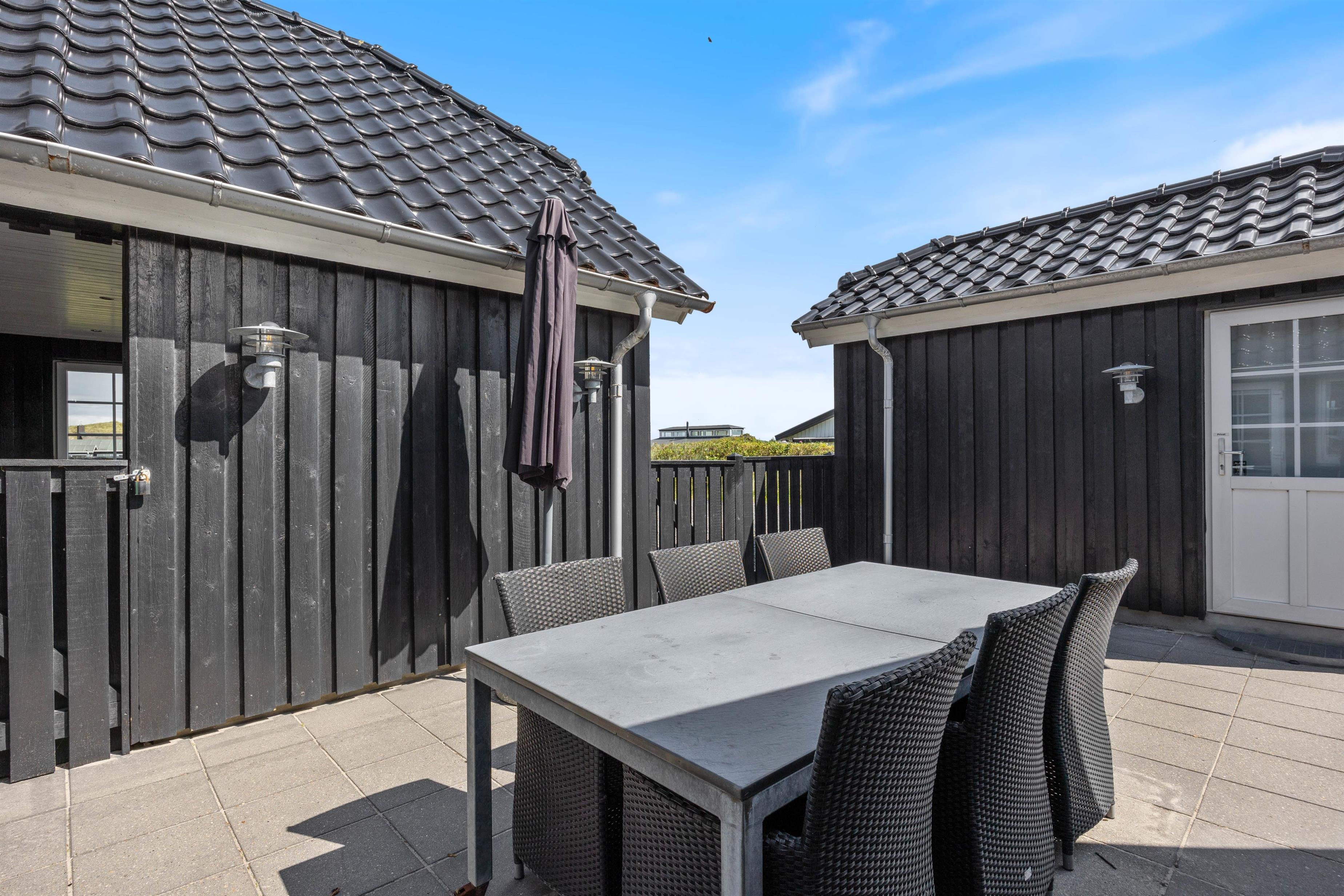 Der hører en en meget skøn terrasse til dette dejlige feriehus. Den er helt lukket, så både børn og hund kan færdes frit omkring og hele familien kan føle sig i trygge omgivelser. Derudover er der mulighed for at nyde solen hele dagen, ligesom der altid vil være mulighed for at finde læ, idet husets arkitektur danner grundlag for læfyldte områder. På terrassen er der endvidere en udebruser, så sandet kan skylles af efter turen til stranden. I perioden fra april til november kan udebruseren bruges.