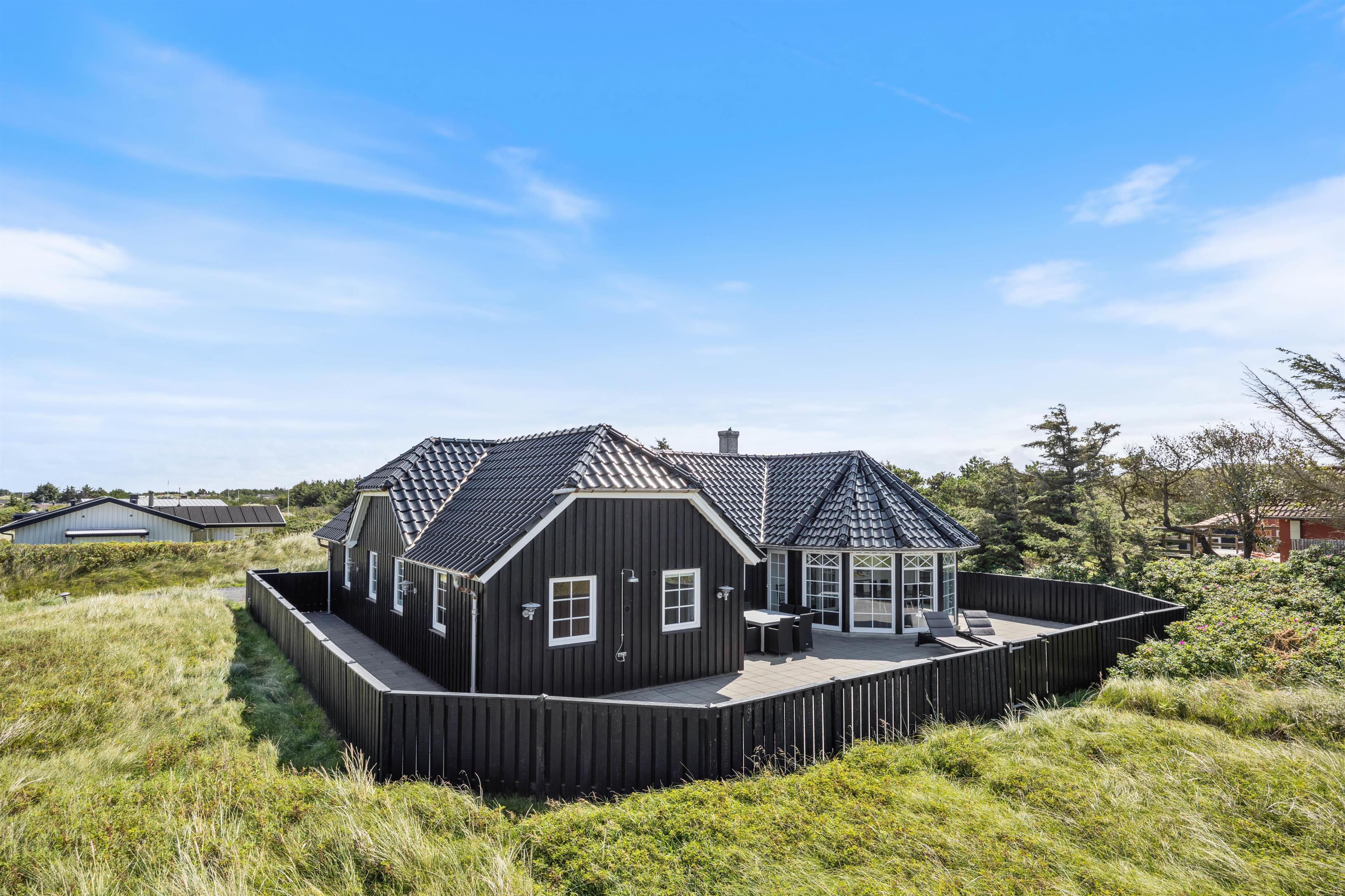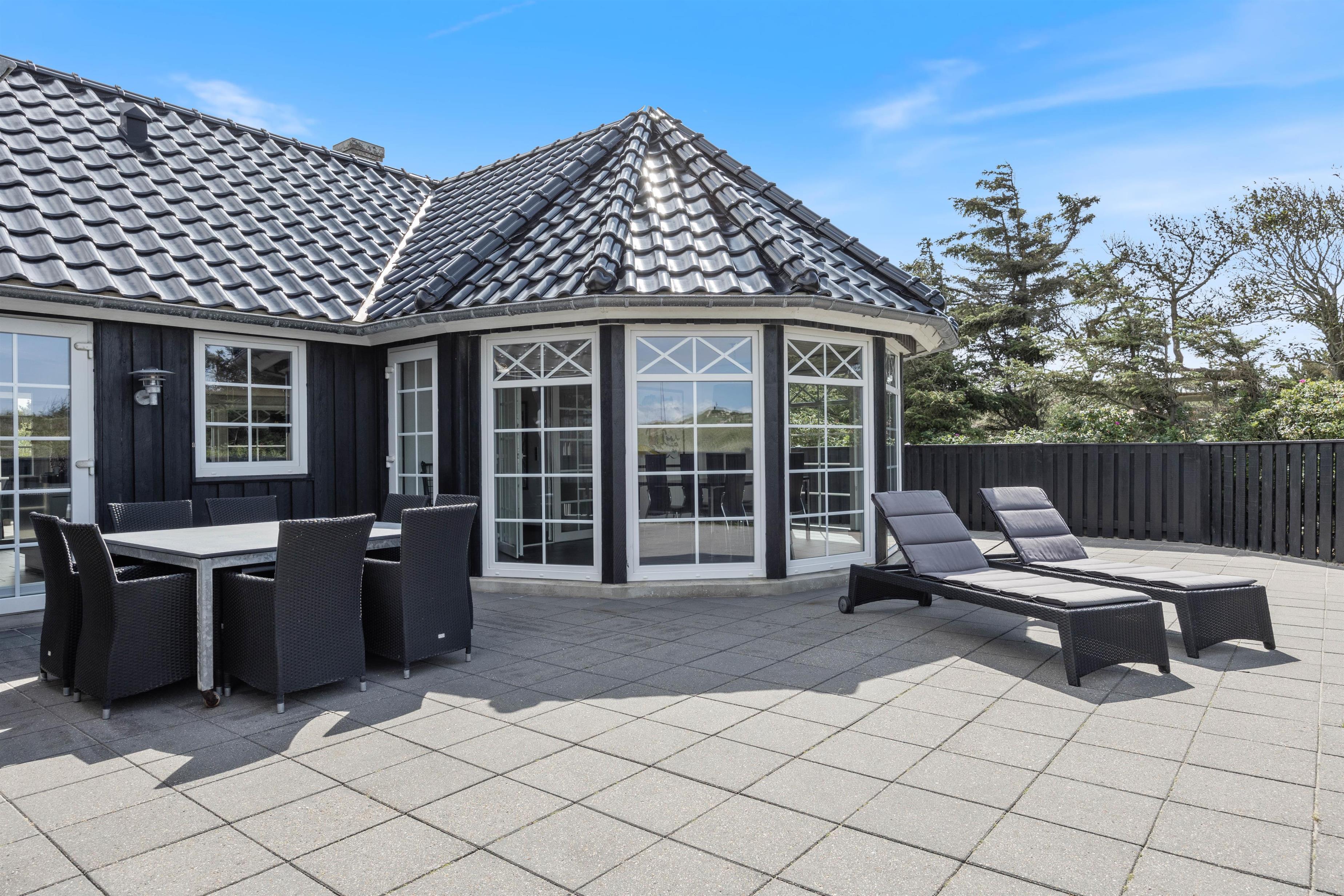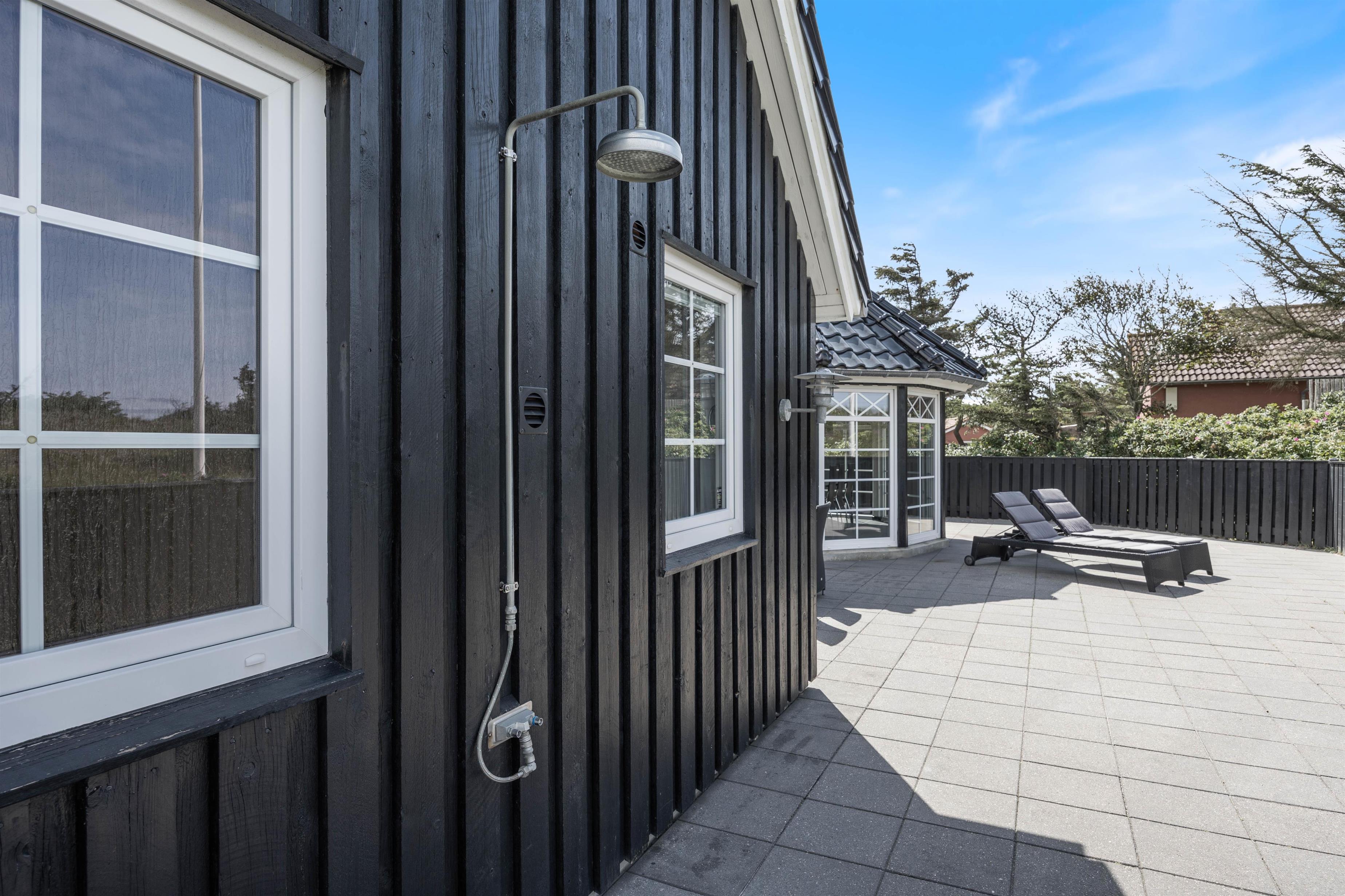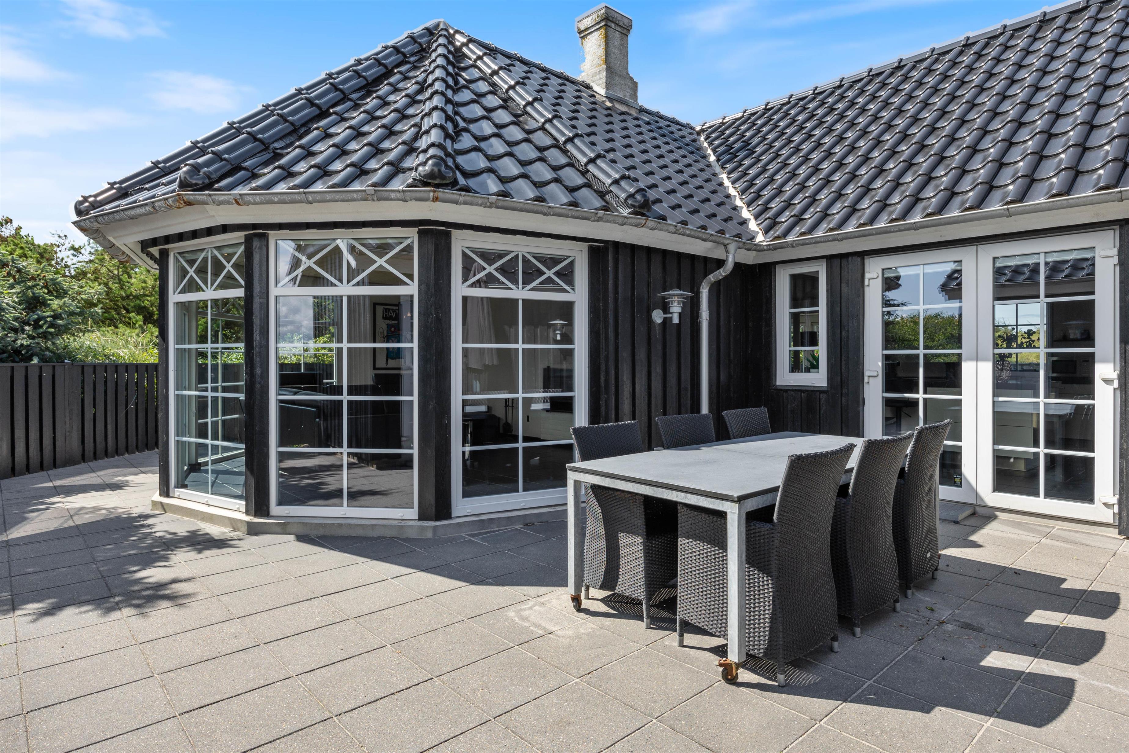 Der hører en en meget skøn terrasse til dette dejlige feriehus. Den er helt lukket, så både børn og hund kan færdes frit omkring og hele familien kan føle sig i trygge omgivelser. Derudover er der mulighed for at nyde solen hele dagen, ligesom der altid vil være mulighed for at finde læ, idet husets arkitektur danner grundlag for læfyldte områder. På terrassen er der endvidere en udebruser, så sandet kan skylles af efter turen til stranden. I perioden fra april til november kan udebruseren bruges.