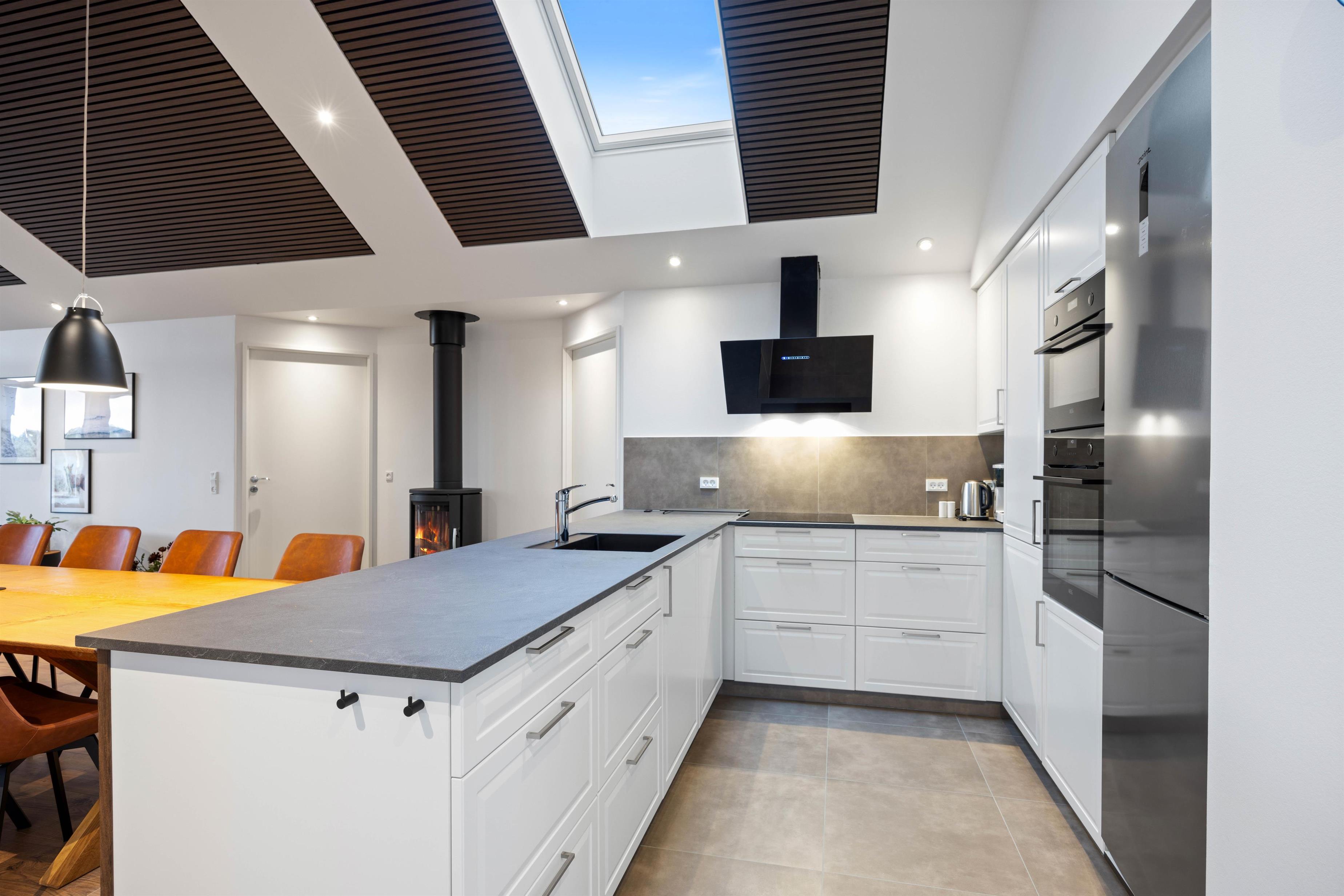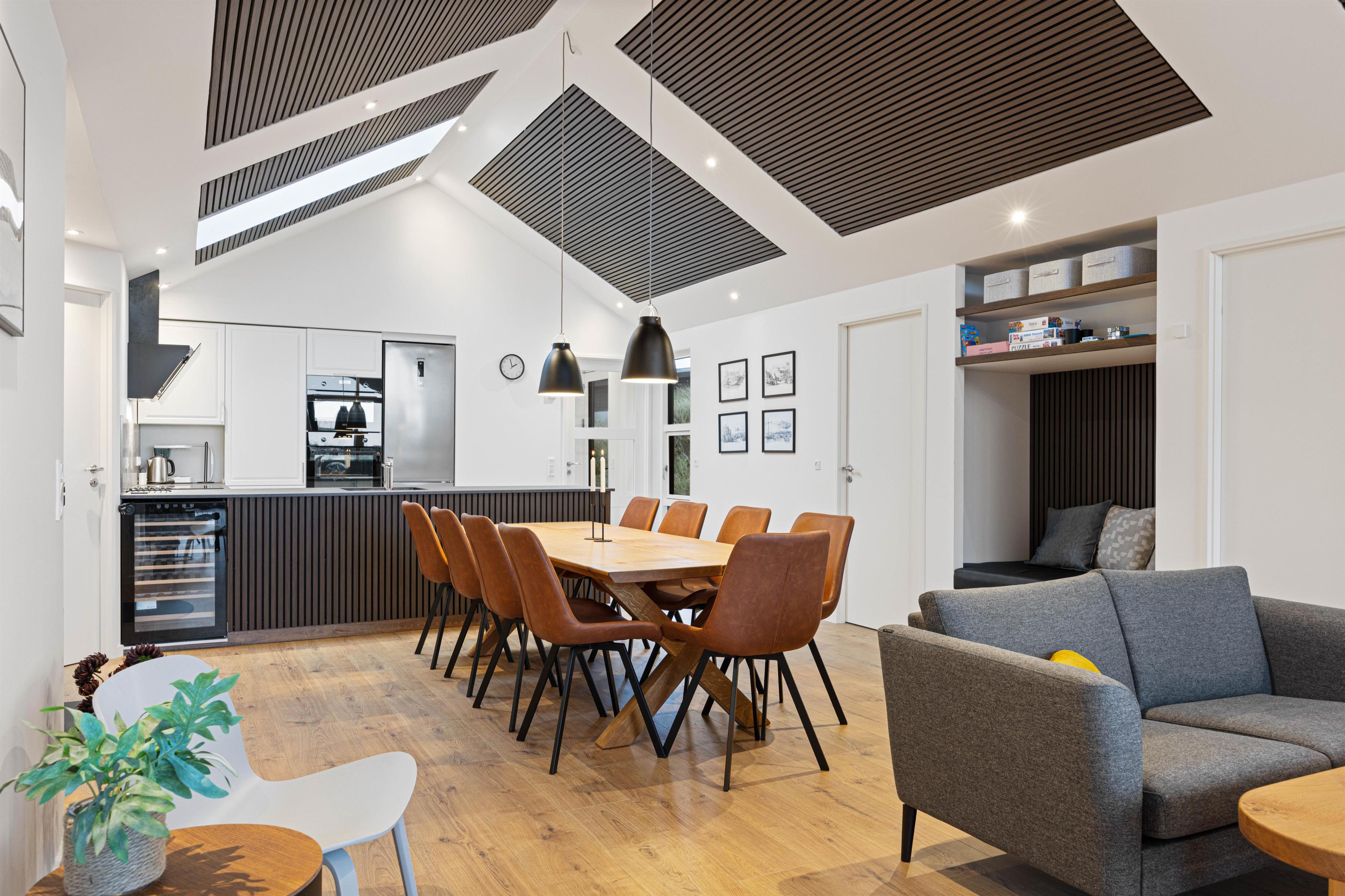 Feriehuset er opført i 2024 og byder jer velkommen med et moderne interiør. Feriehusets midtpunkt er opholdsstuen, som kombinerer køkken, stue og spiseplads. Her kan I sammen afprøve nye opskrifter, bruge kvalitetstid sammen eller dyste i diverse selvmedbragte kort- og brætspil. I mellemtiden skaber brændeovnen i stuen den klassiske sommerhusstemning med sin knitrende ild og hyggelige varme.