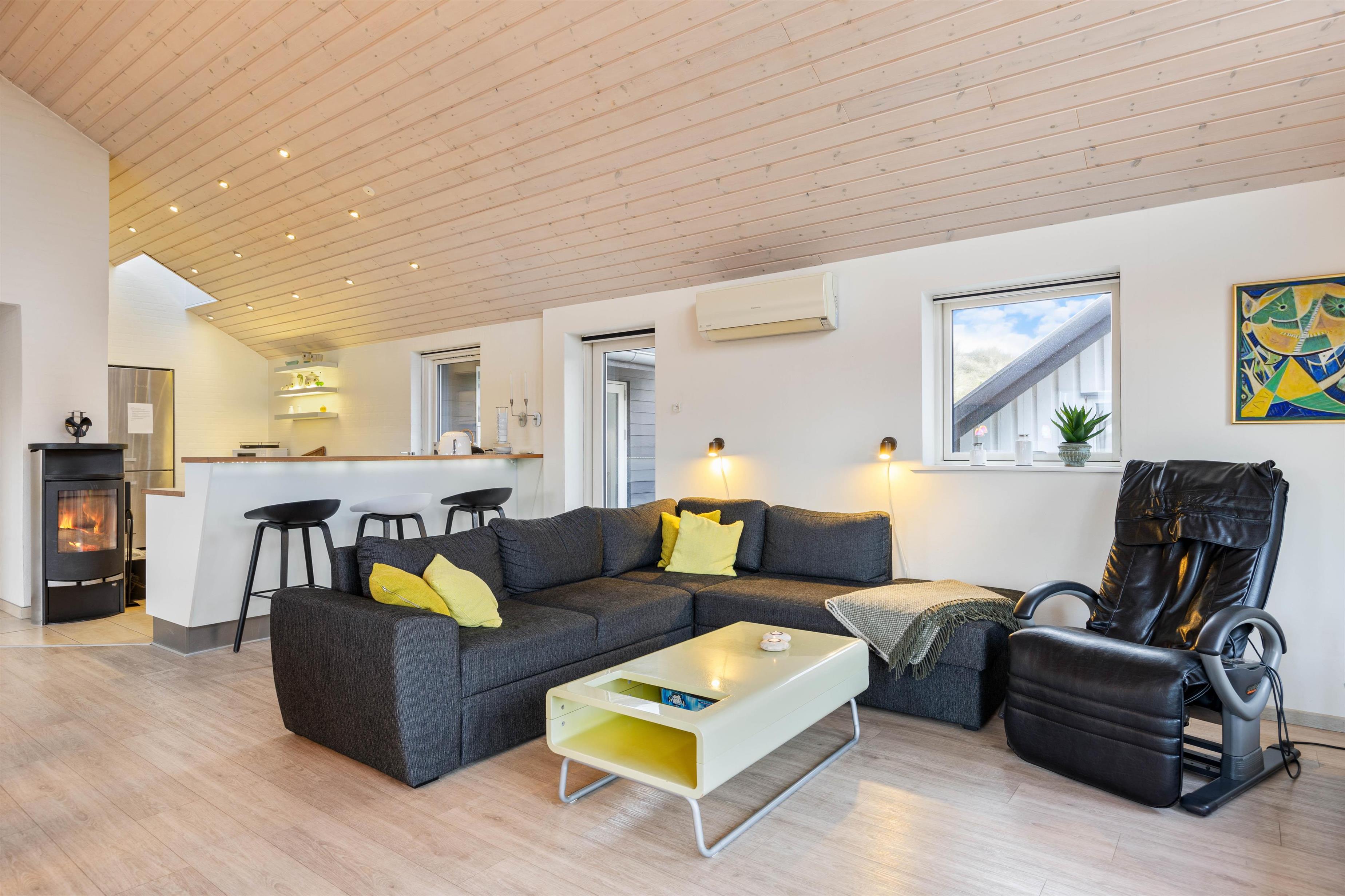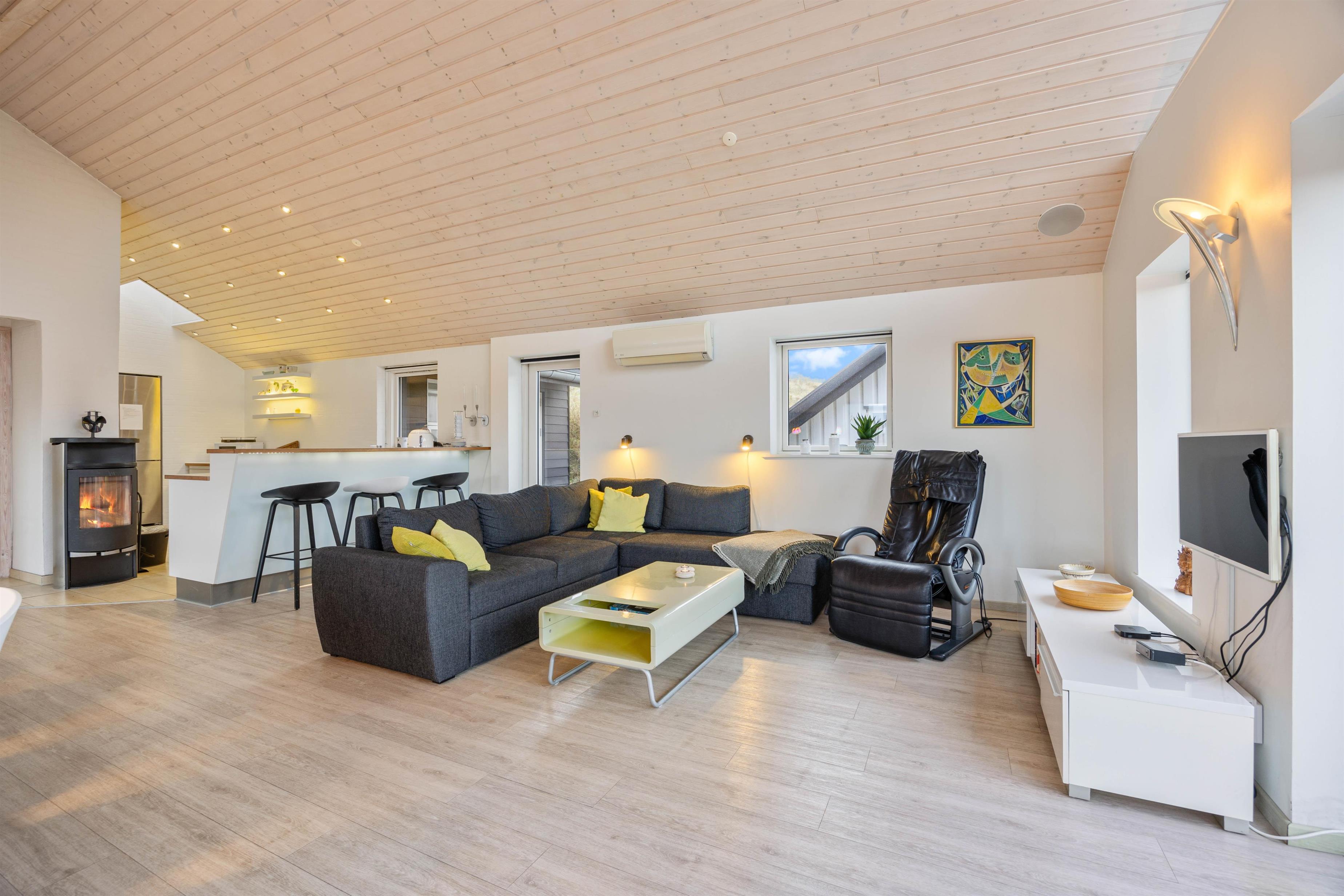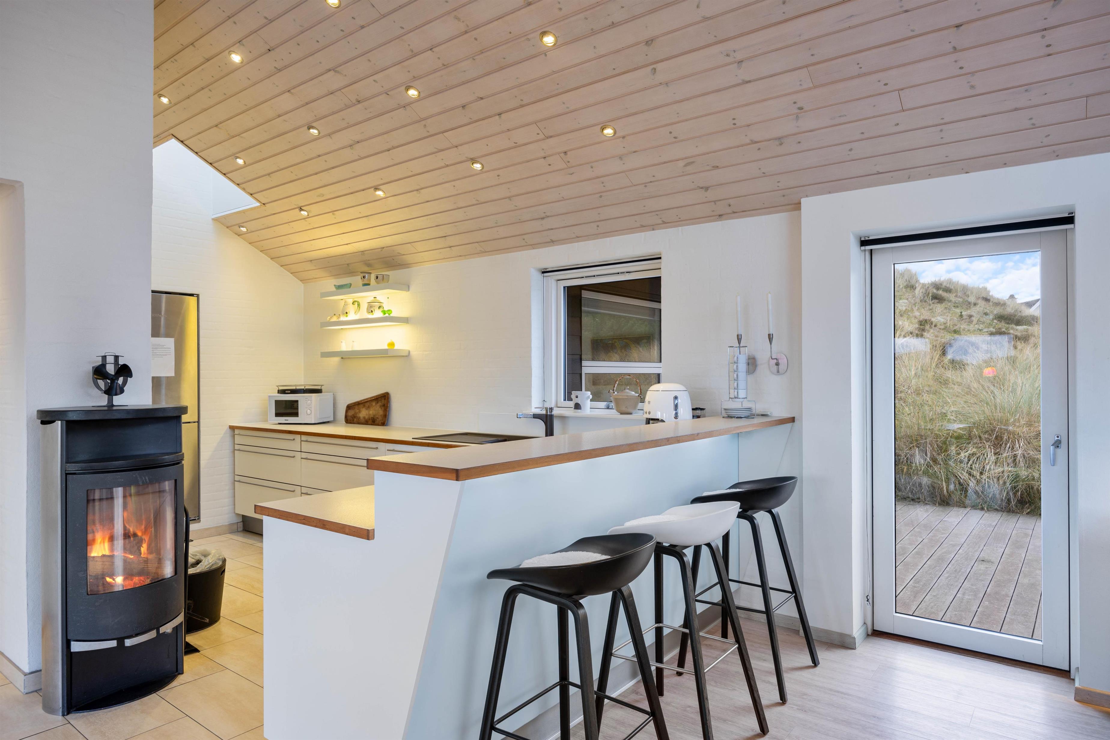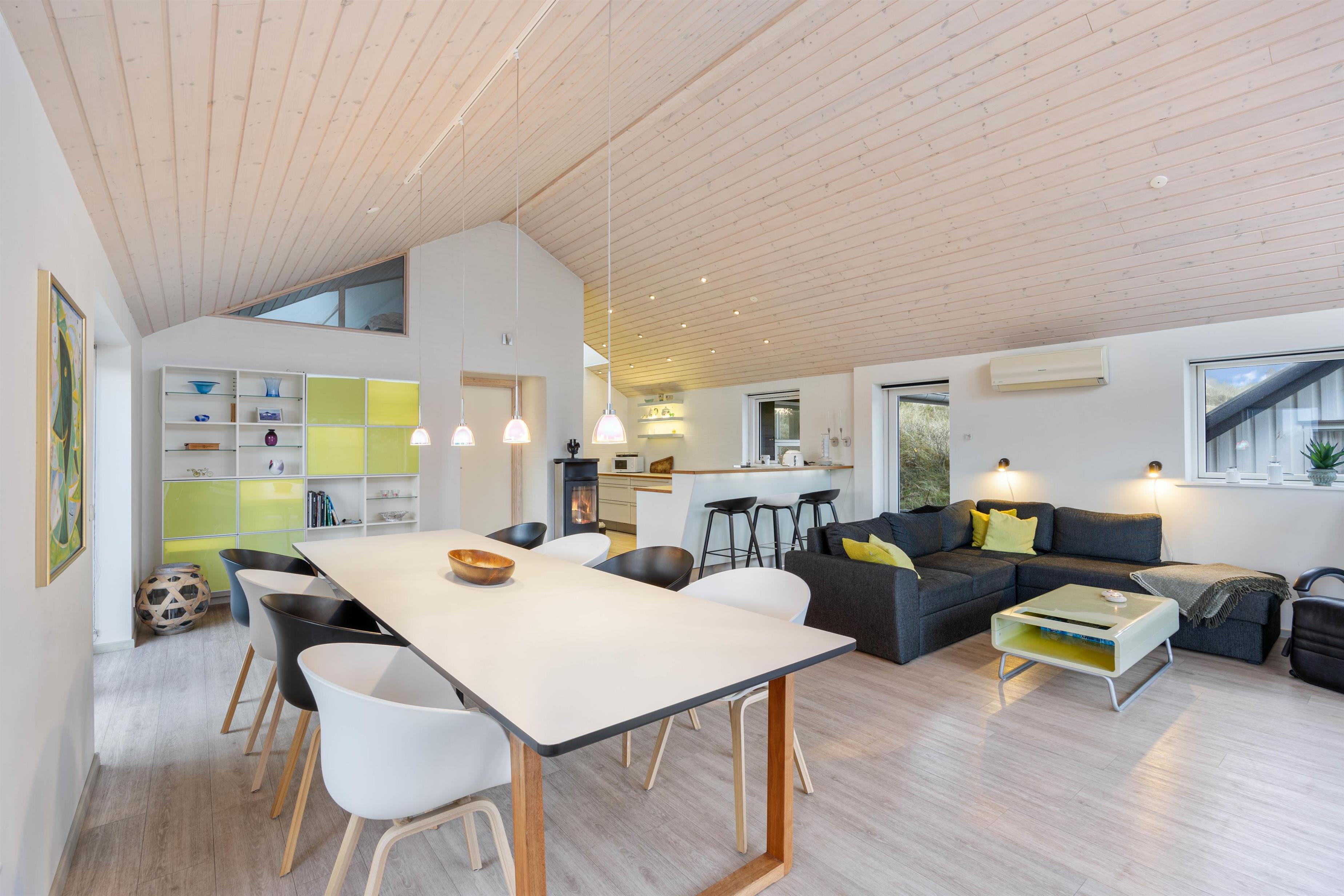 Fra første ferieøjeblik vil I blive mødt af de lyse og lækre omgivelser, som præger huset fra ende til anden. I vil især befinde jer godt i det store opholdsrum, der både indeholder spisestue og køkken og fungerer som sommerhusets hjerte og feriens mødested med et langt spisebord, et hyggeligt sofahjørne og den knitrende brændeovn.