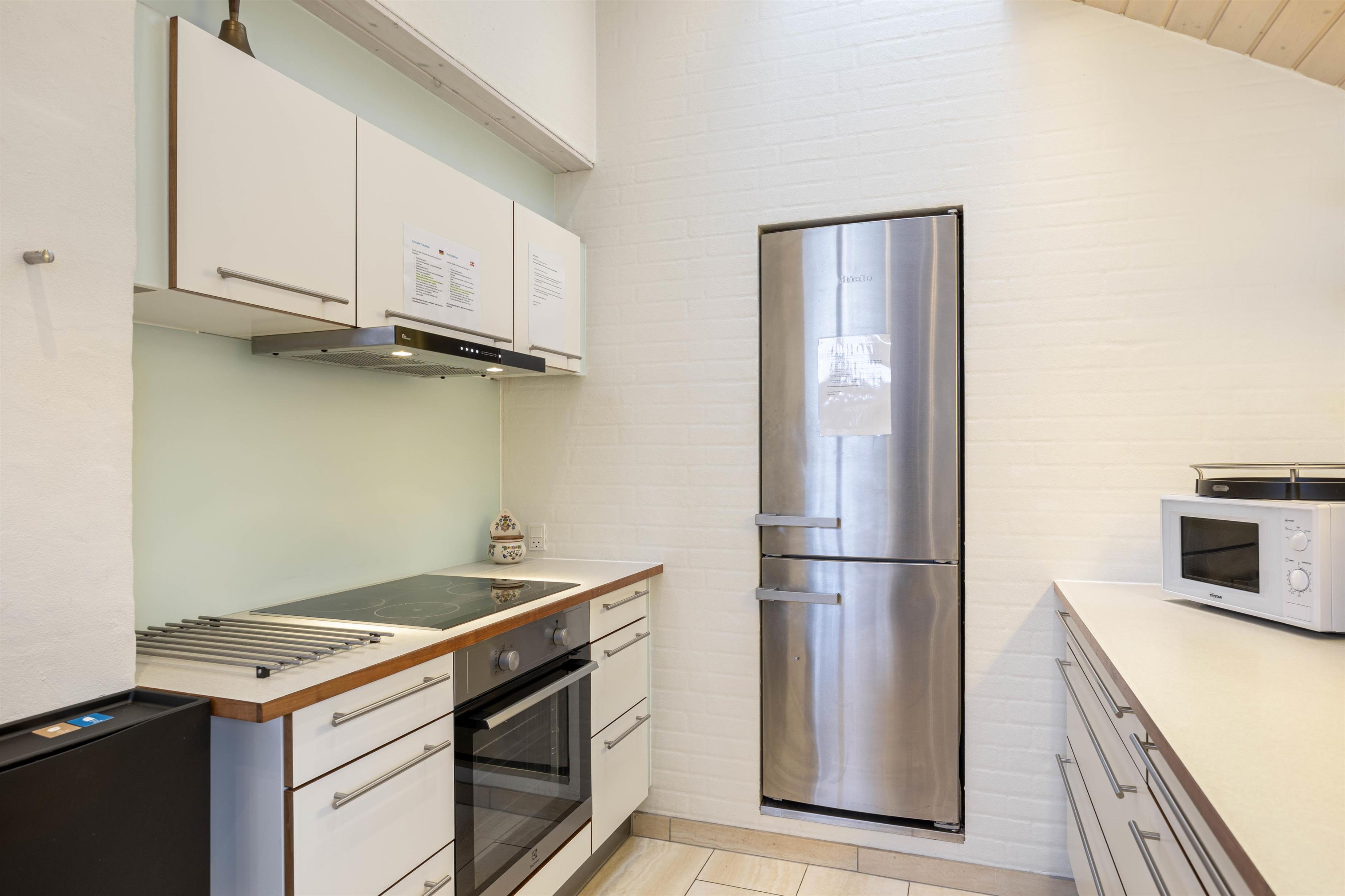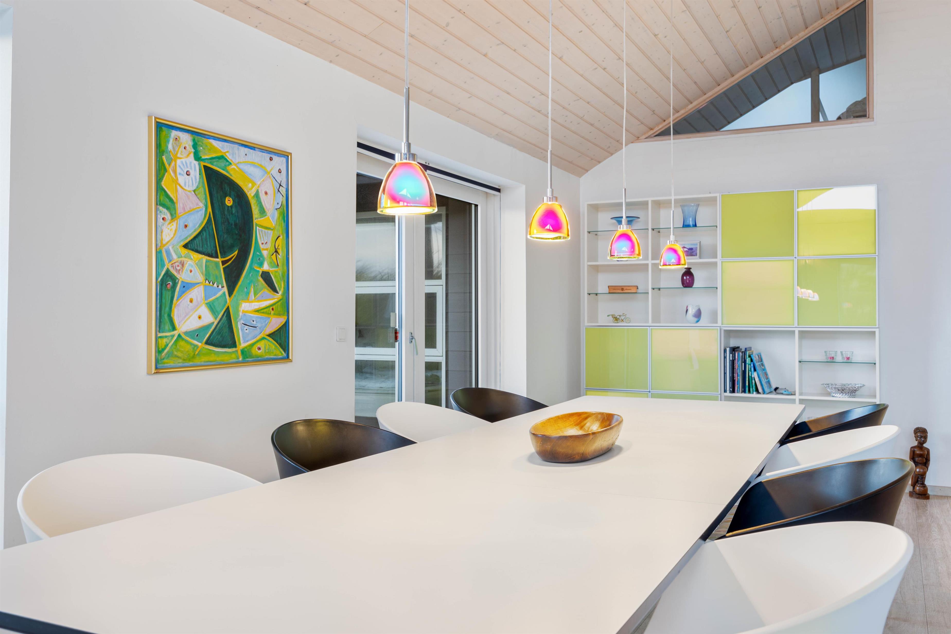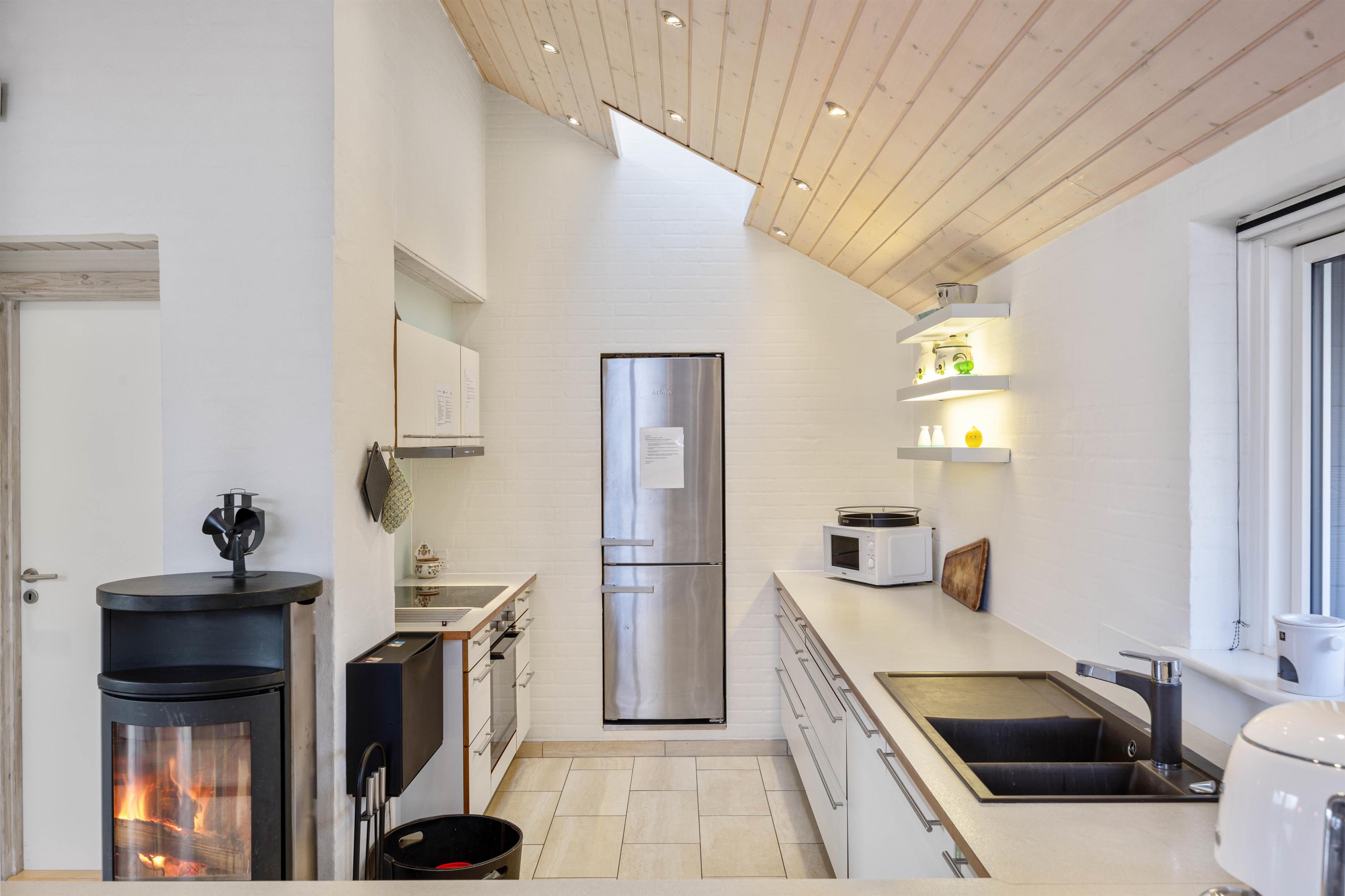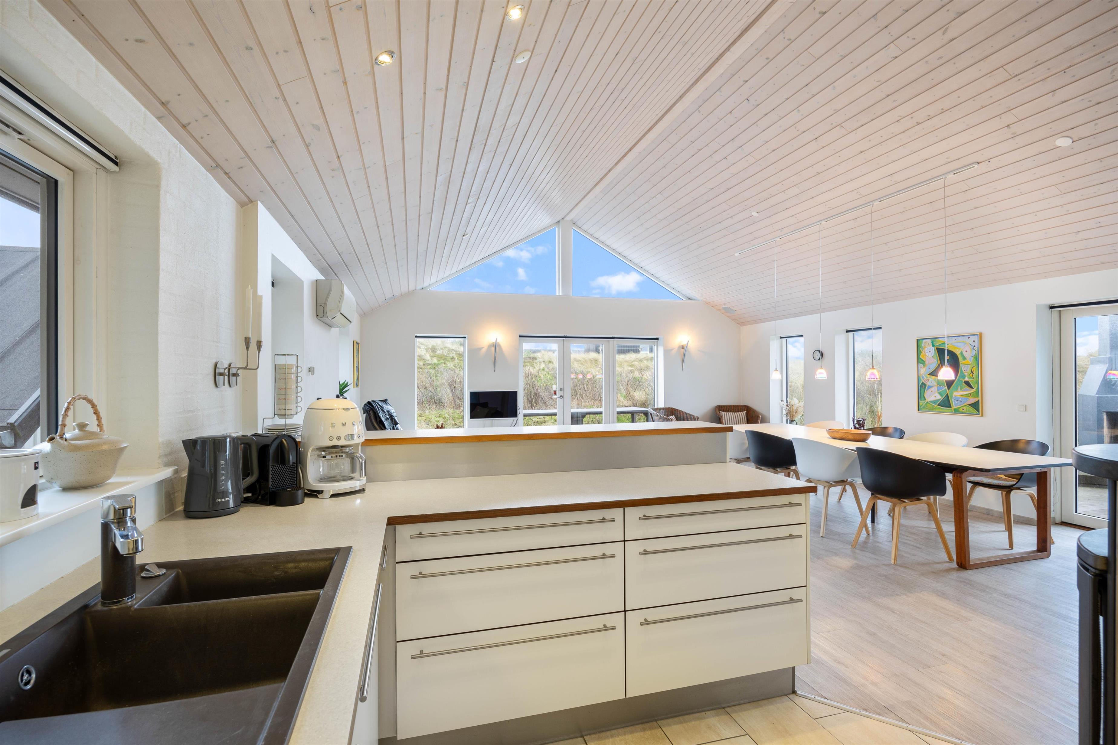 Fra første ferieøjeblik vil I blive mødt af de lyse og lækre omgivelser, som præger huset fra ende til anden. I vil især befinde jer godt i det store opholdsrum, der både indeholder spisestue og køkken og fungerer som sommerhusets hjerte og feriens mødested med et langt spisebord, et hyggeligt sofahjørne og den knitrende brændeovn.
