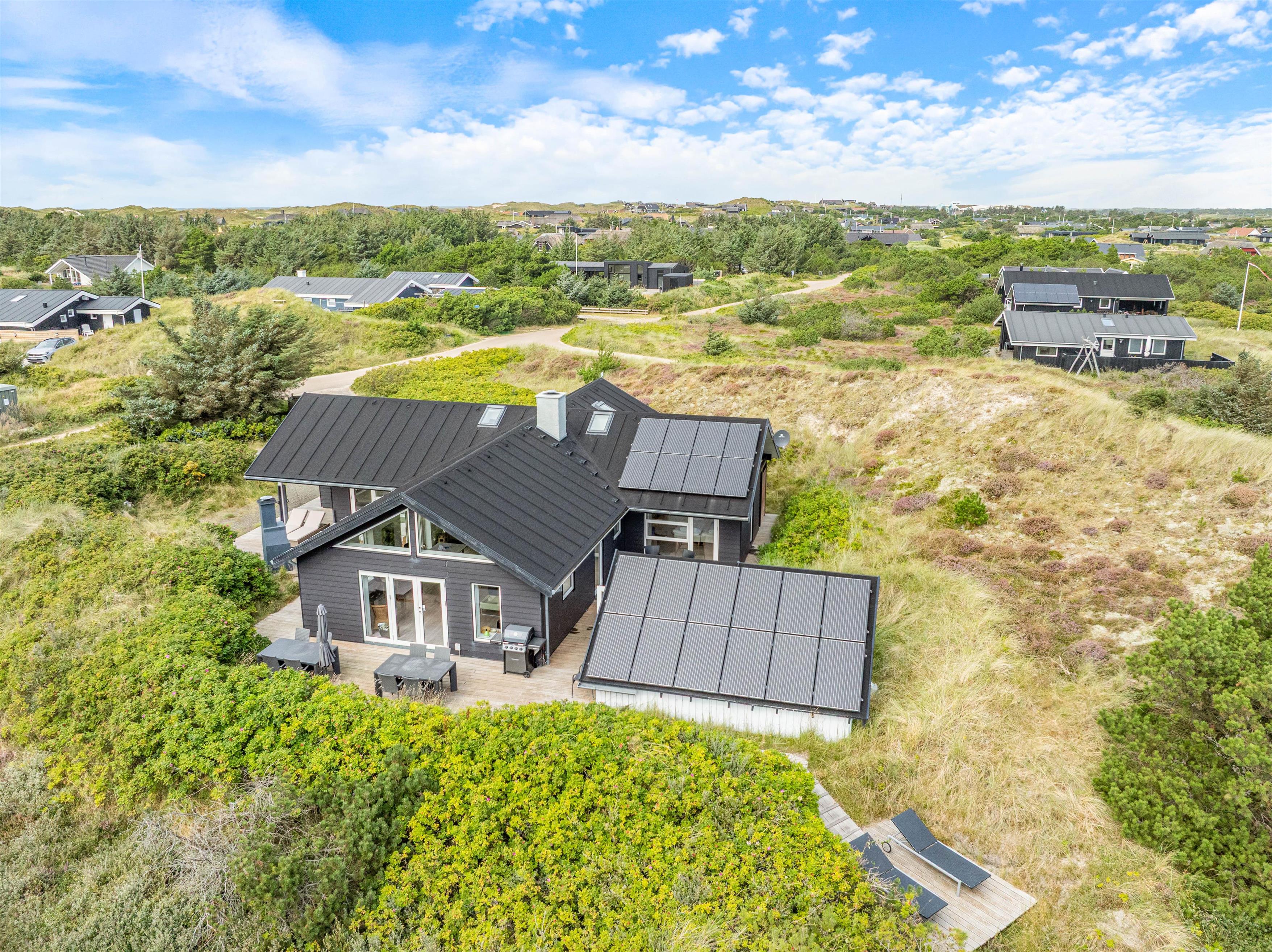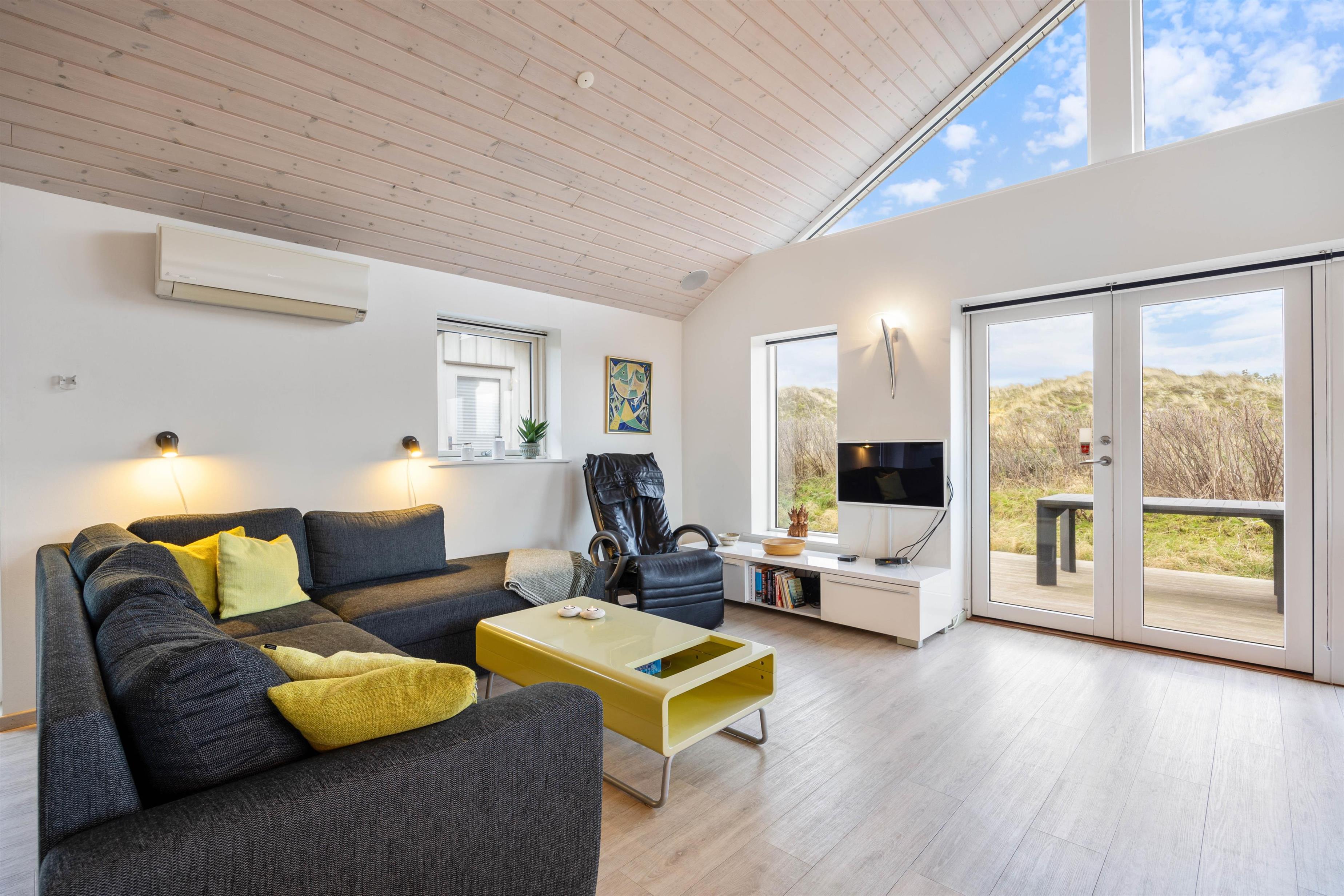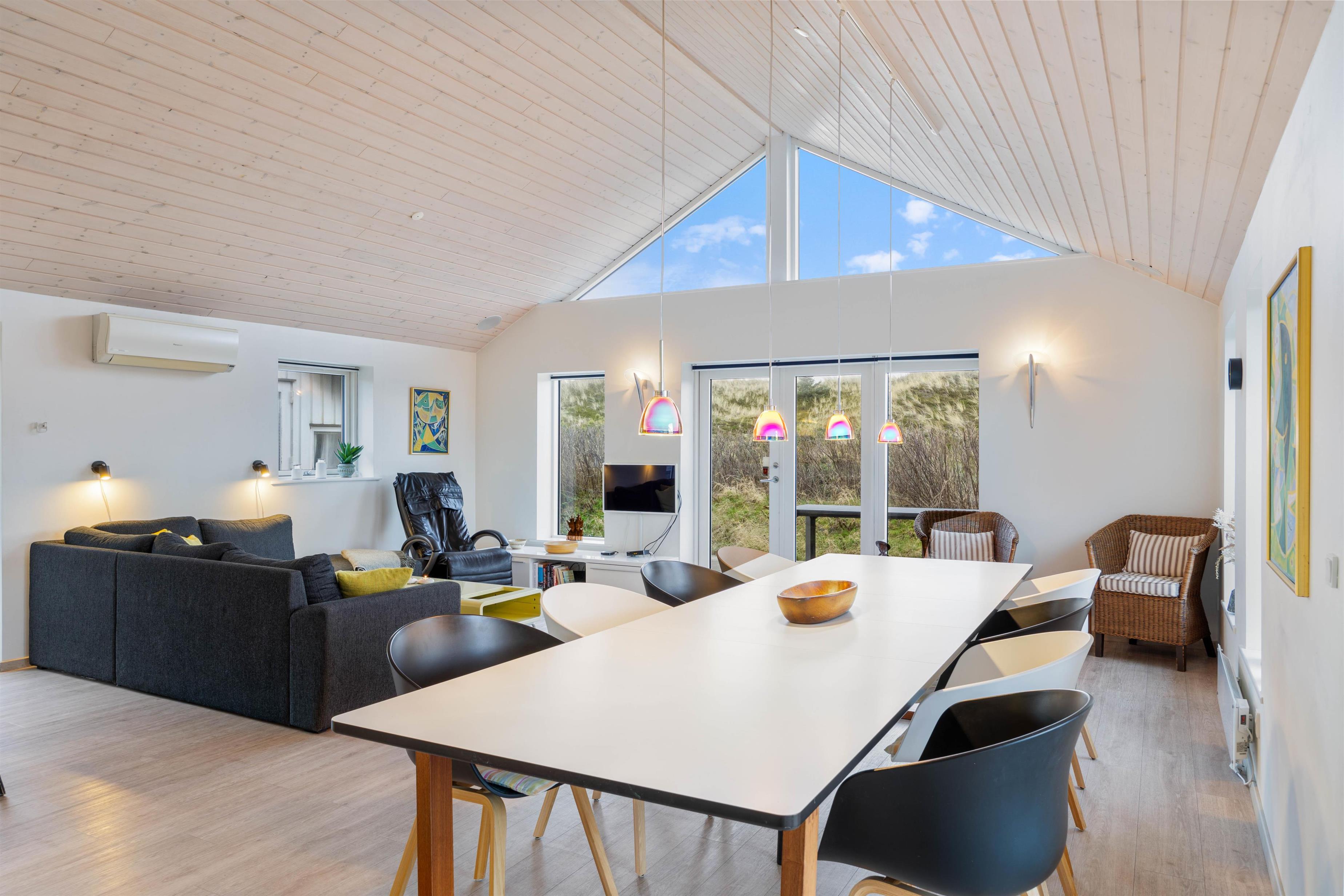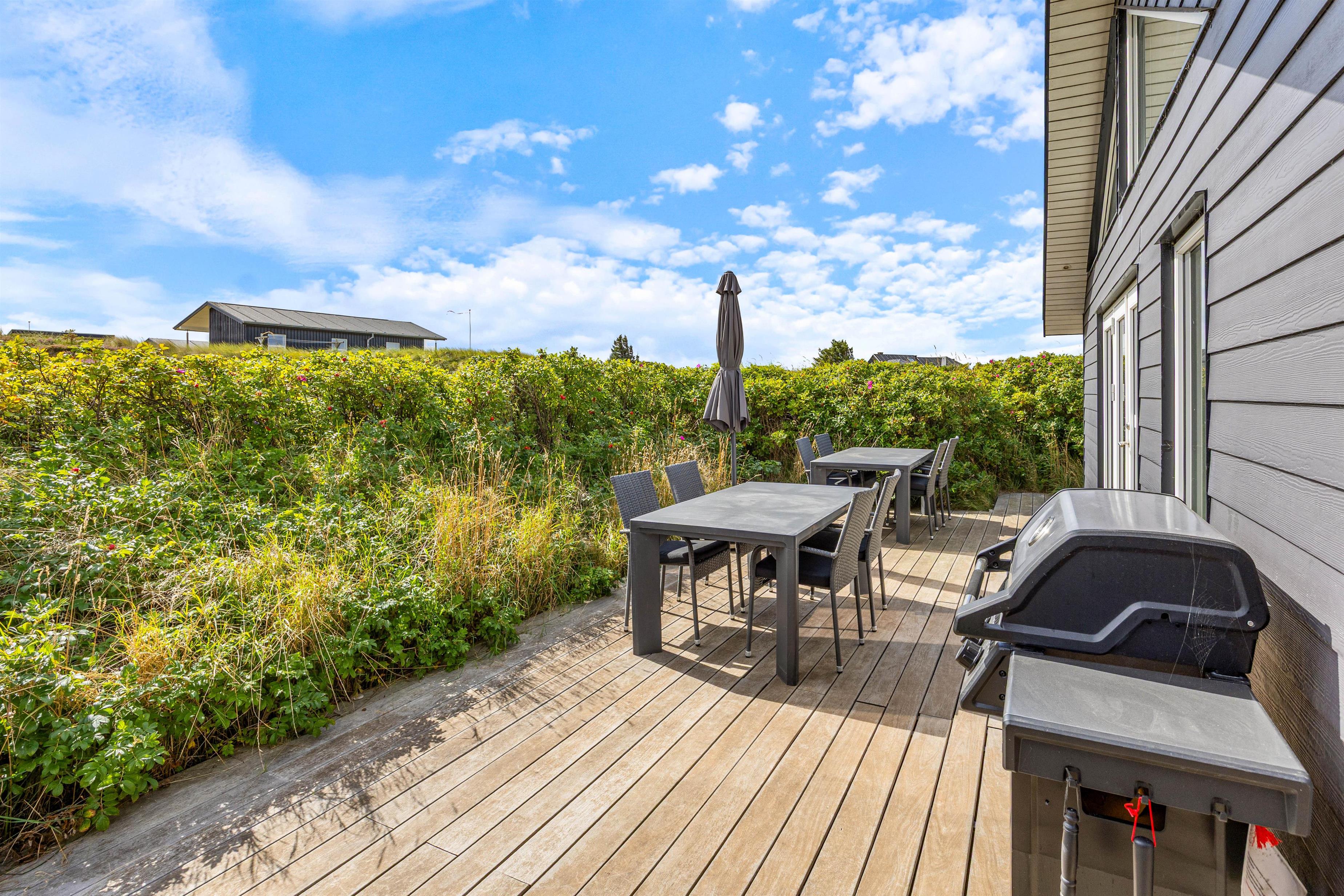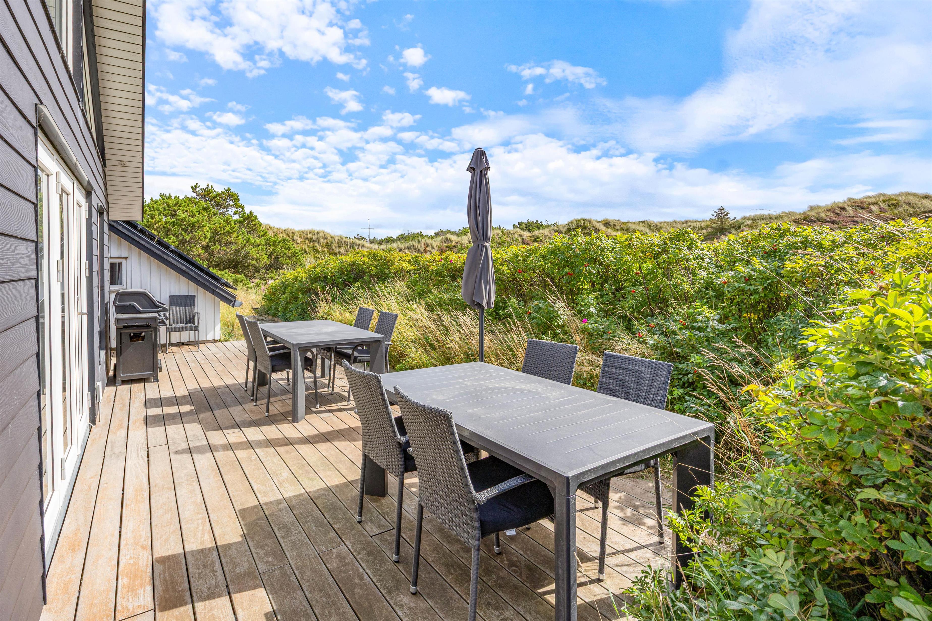 Midt i det smukke klitlandskab og ikke langt fra det brusende Vesterhav ligger dette skønne feriehus på Marehalmen 51. Den stilfulde indretning efterlader ikke meget til fantasien, og med både dampbad, massagestol, en lækker sauna, aktivitetsrum, hjemmebiograf og en fredfyldt og strandnær beliggenhed er I garanteret en fantastisk ferie her.
