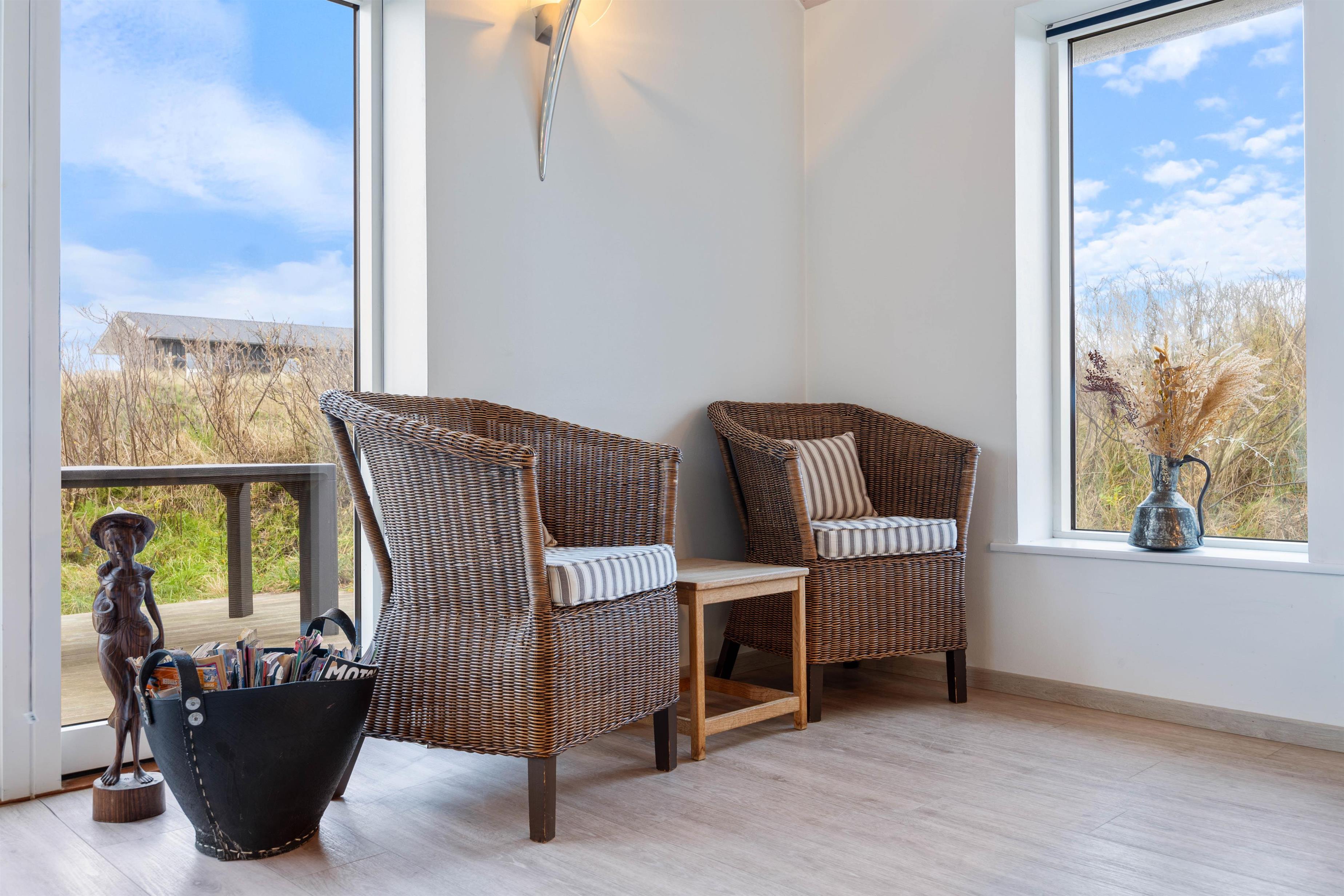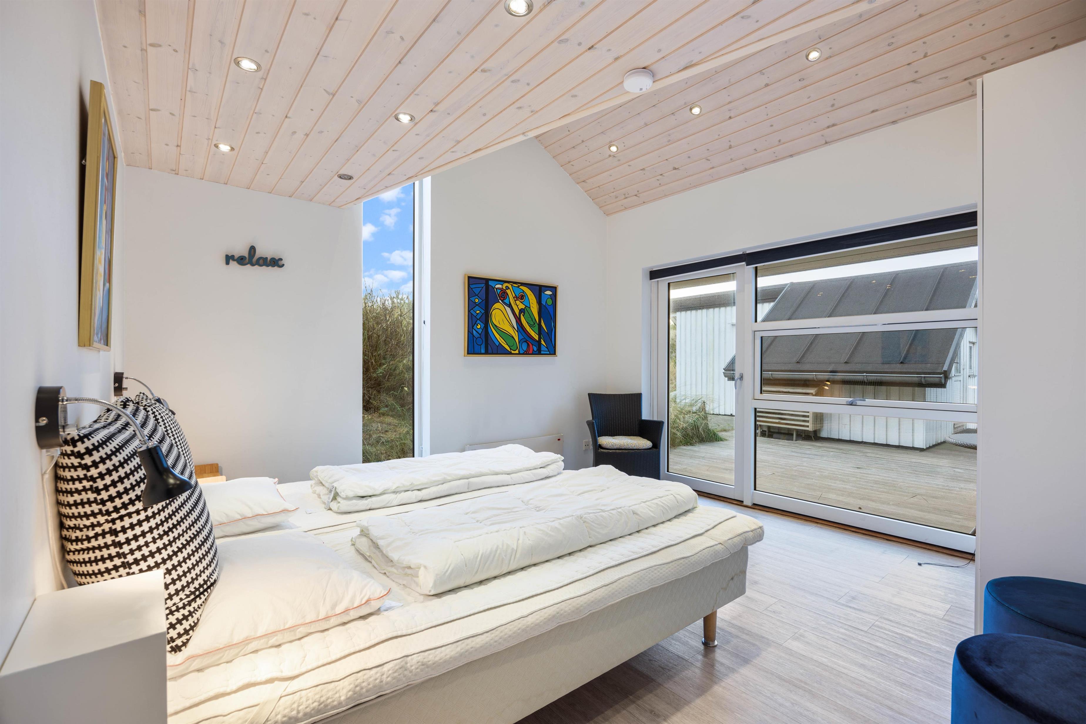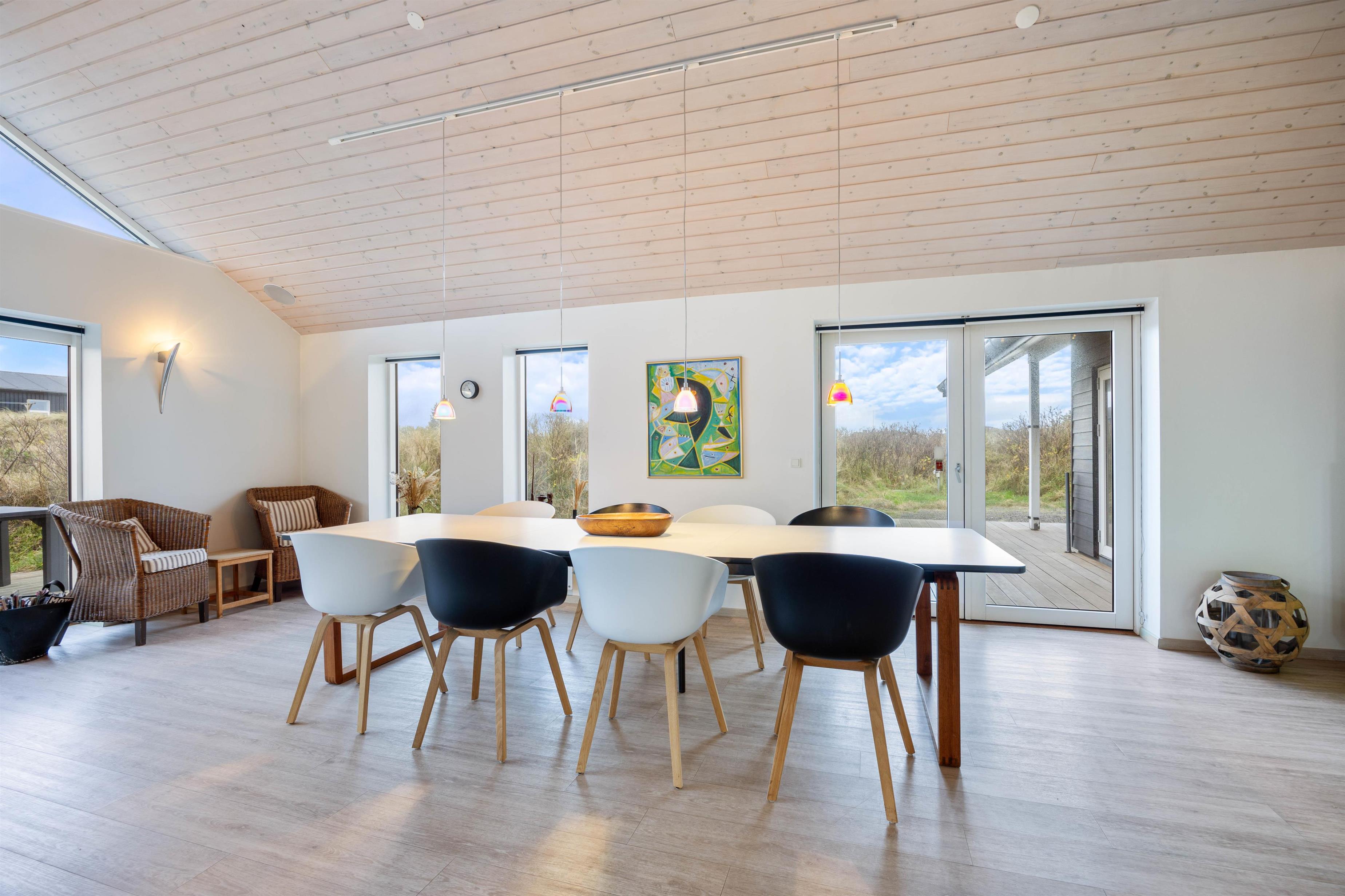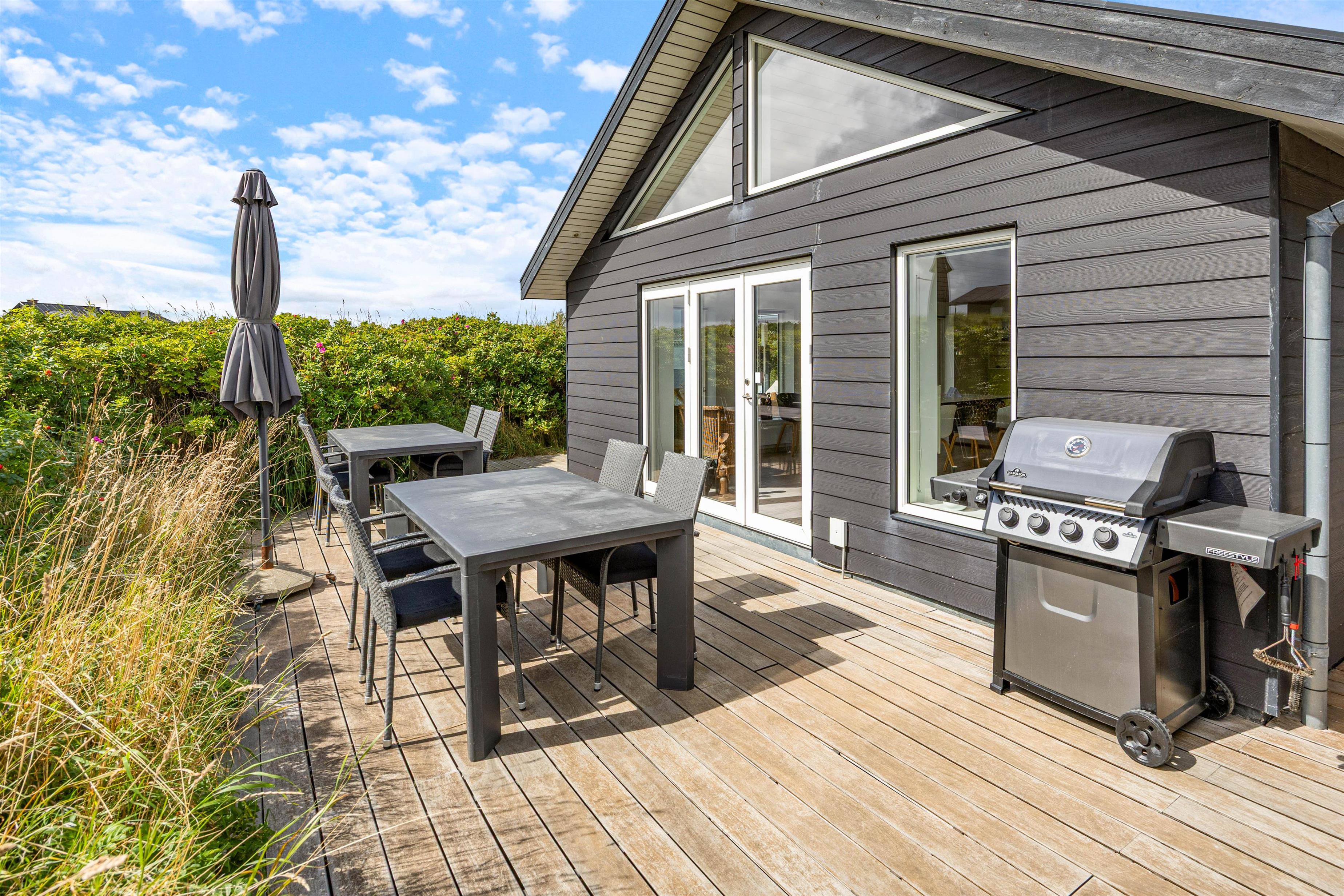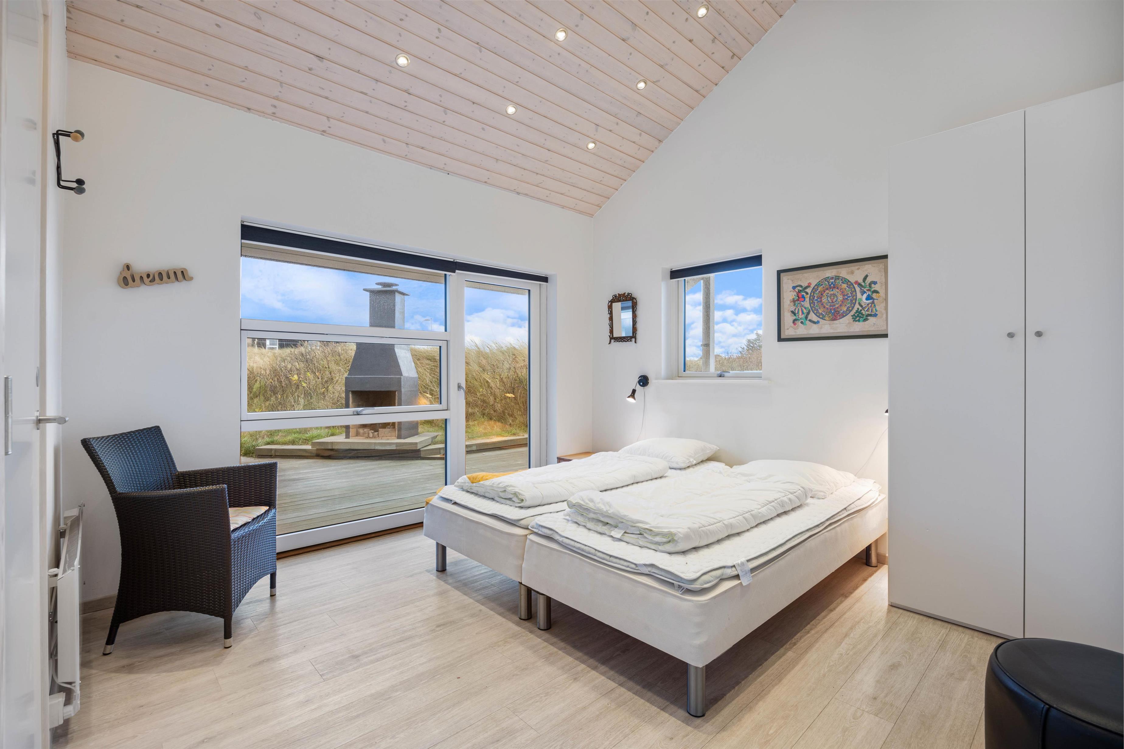 Midt i det smukke klitlandskab og ikke langt fra det brusende Vesterhav ligger dette skønne feriehus på Marehalmen 51. Den stilfulde indretning efterlader ikke meget til fantasien, og med både dampbad, massagestol, en lækker sauna, aktivitetsrum, hjemmebiograf og en fredfyldt og strandnær beliggenhed er I garanteret en fantastisk ferie her.