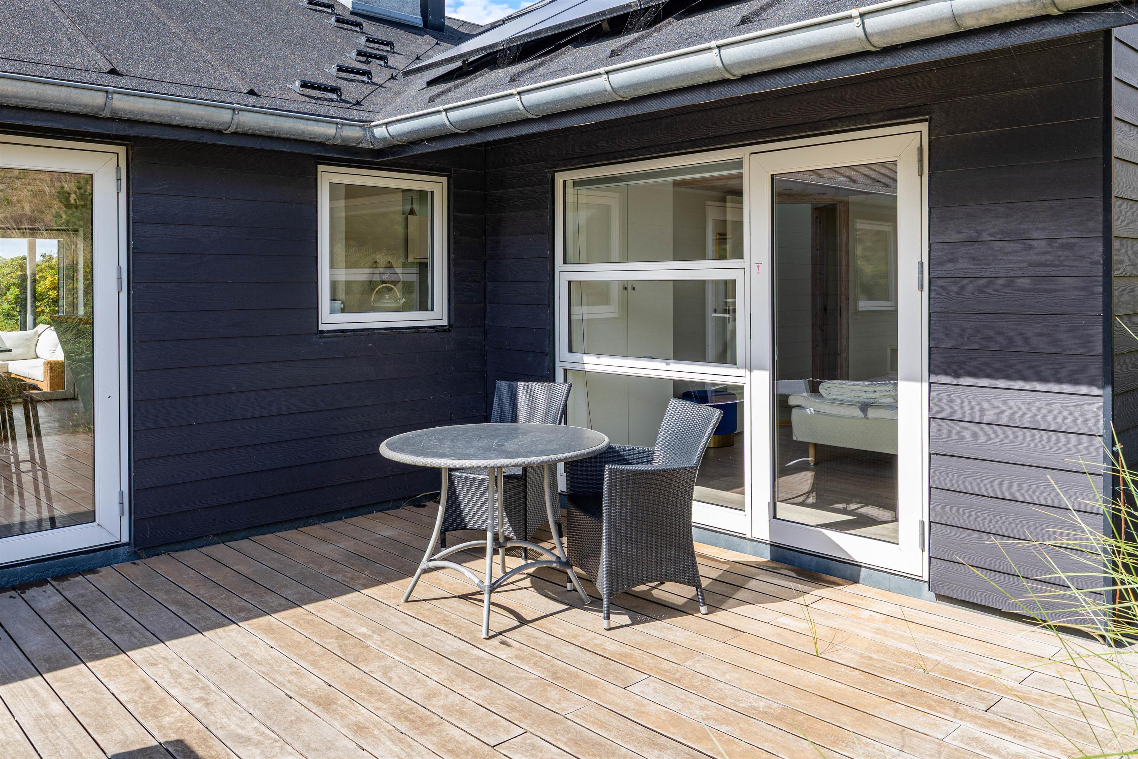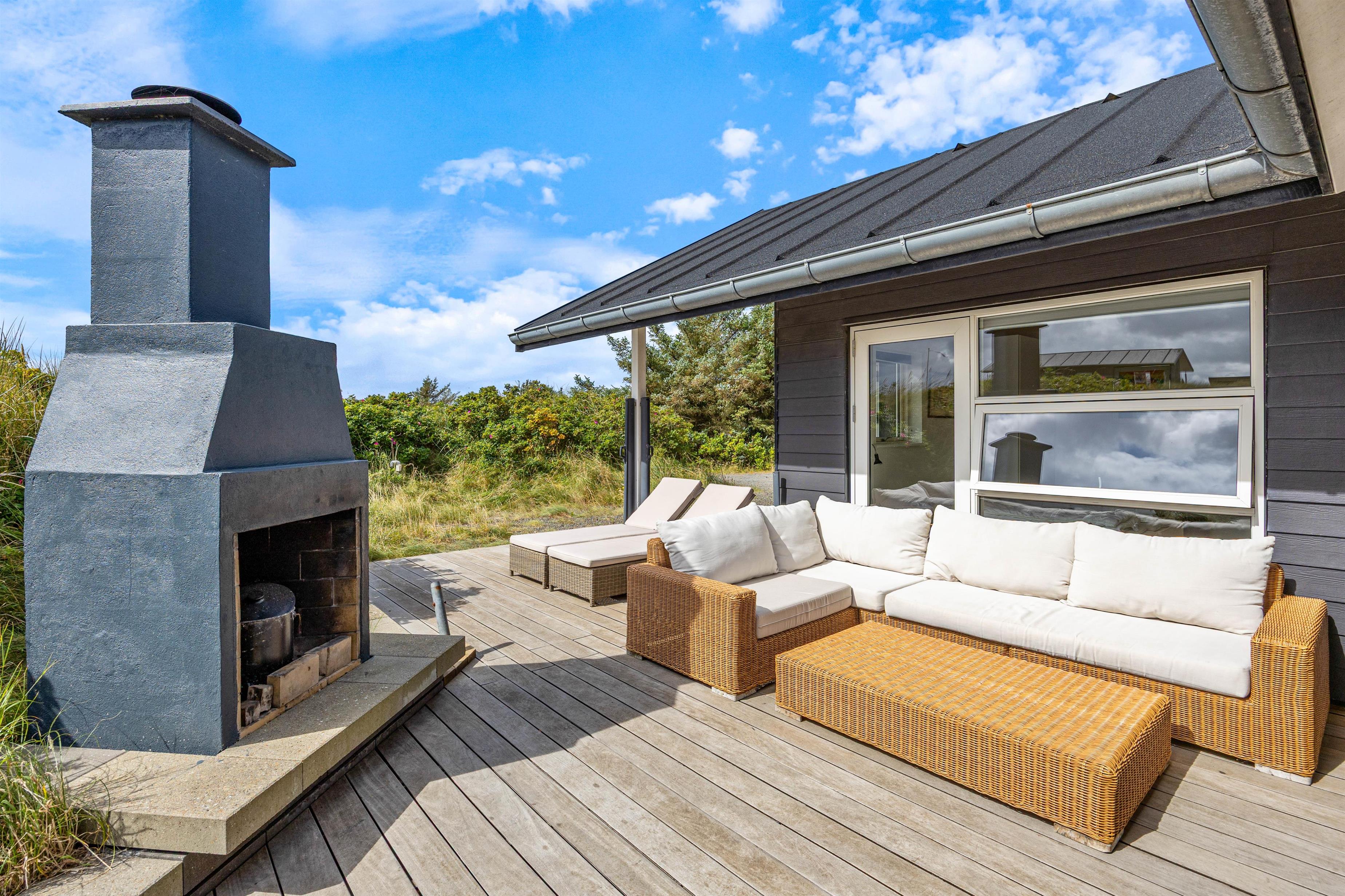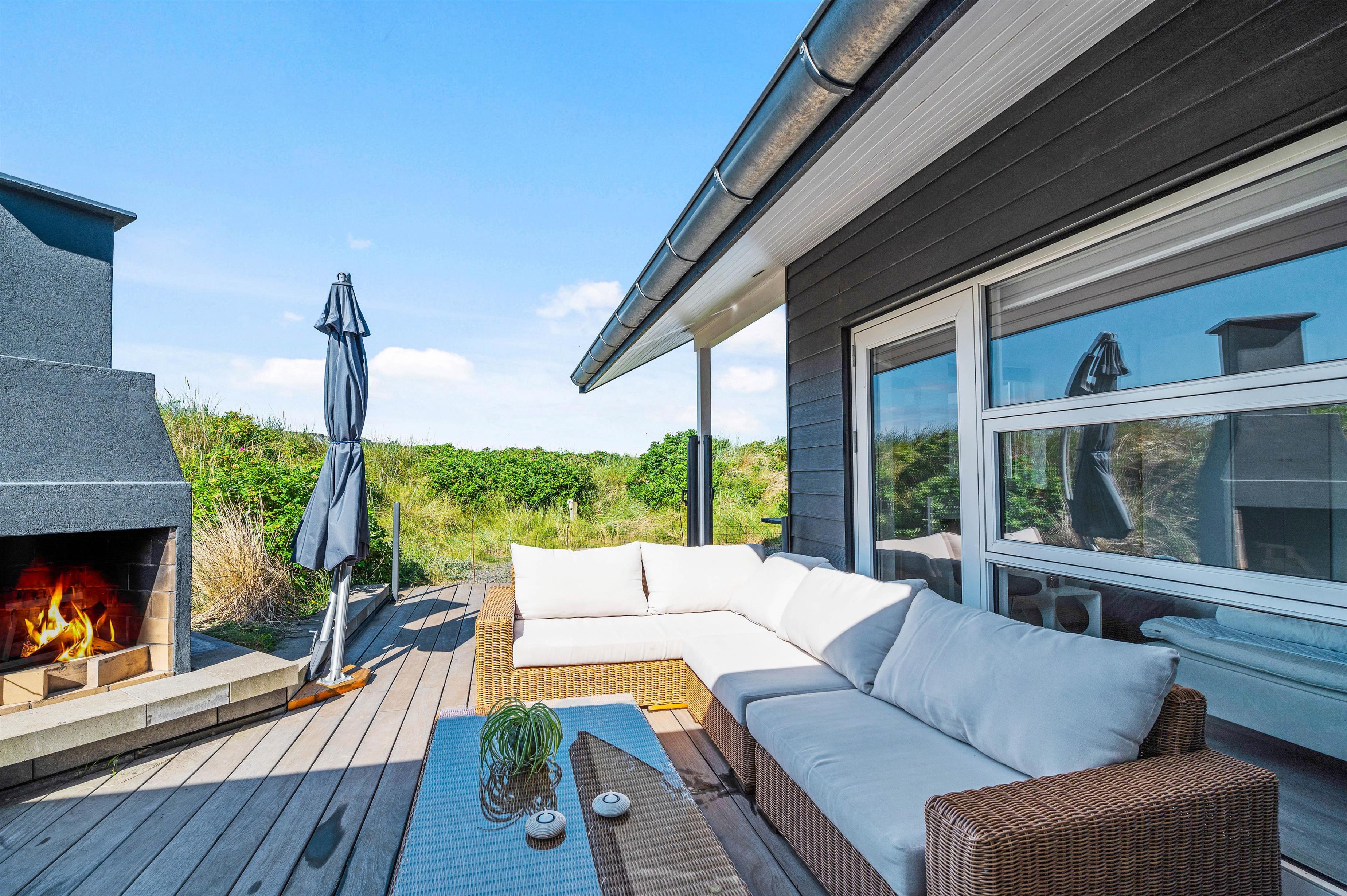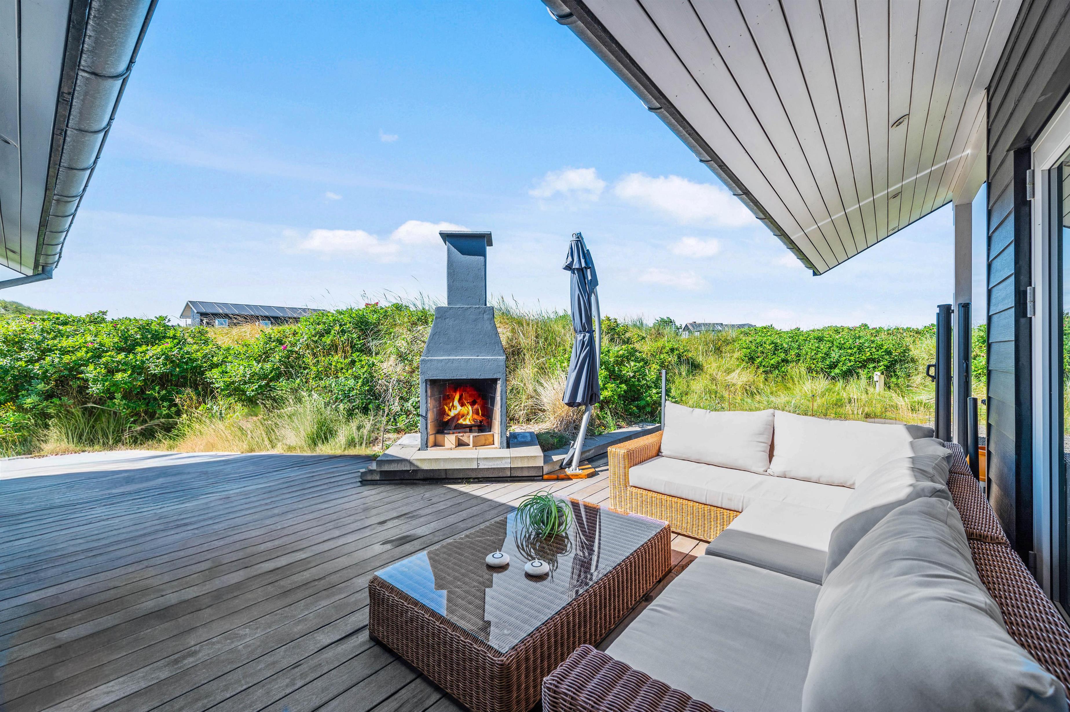 Fra både stuen og soveværelserne har I udgang til den store terrasse, der omgiver huset. Her er der flere små hyggekroge og masser af mulighed for at nyde de varme solskinsdage rundt om havebordet eller i liggestolene i god fred og ro. Om aftenen kan I tænde op i den udendørs pejs og lade dagens sidste timer rinde ud i skæret fra de knitrende flammer.