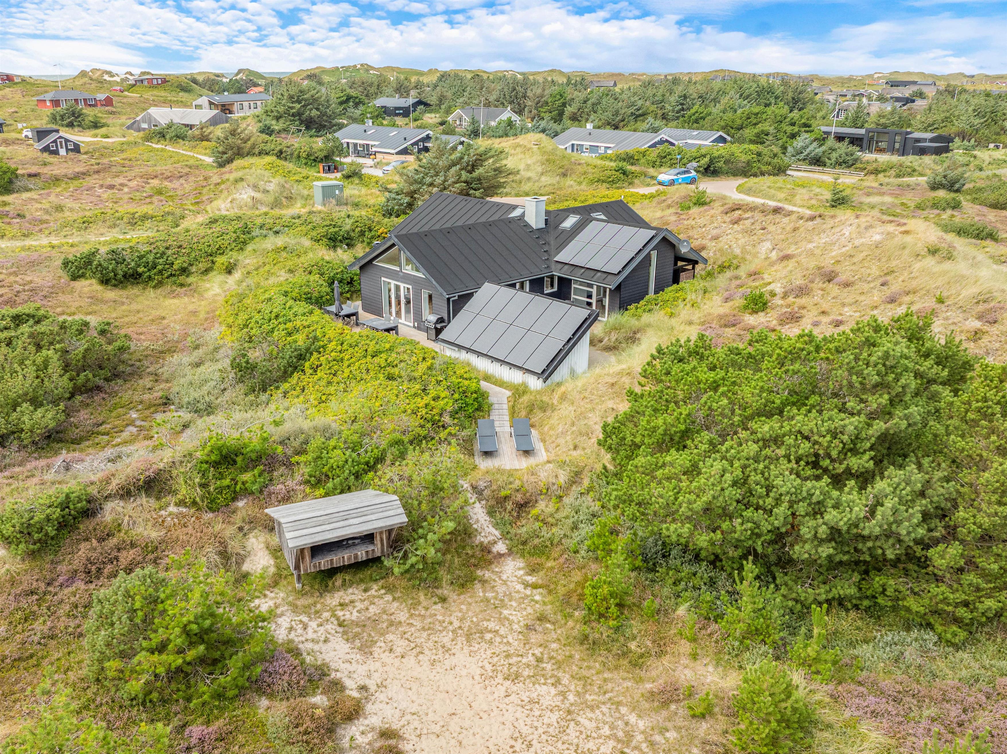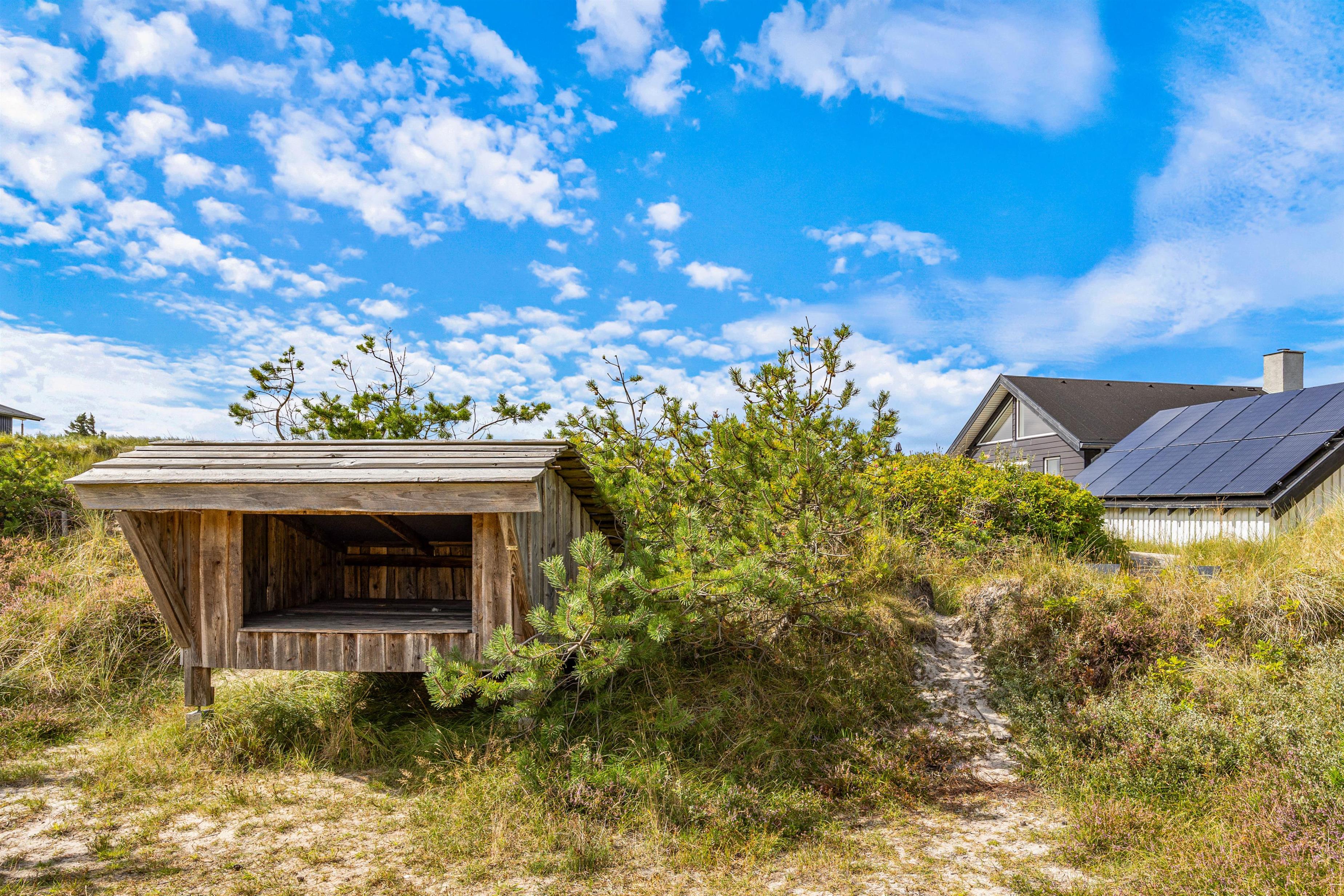 Ikke nok med at I har en dejlig og rolig beliggenhed – I bor også kun 300 meter fra Vesterhavet. På de små, snoede stier gennem det lyngbeklædte klitlandskab når I hurtigt det brusende Vesterhav, der hele året rundt er værd at opsøge. På de lune aftener kan I tænde op i grillen og lade dagen gå på hæld, mens I spiser et lækkert feriemåltid rundt om havebordet i varmen fra den murede udepejs. For ægte naturelskere er der mulighed for at overnatte under stjernerne i shelteret, som er opsat i en klitgryde. Der er heller ikke langt til Søndervig og de mange gode indkøbsmuligheder og hyggelige restauranter.