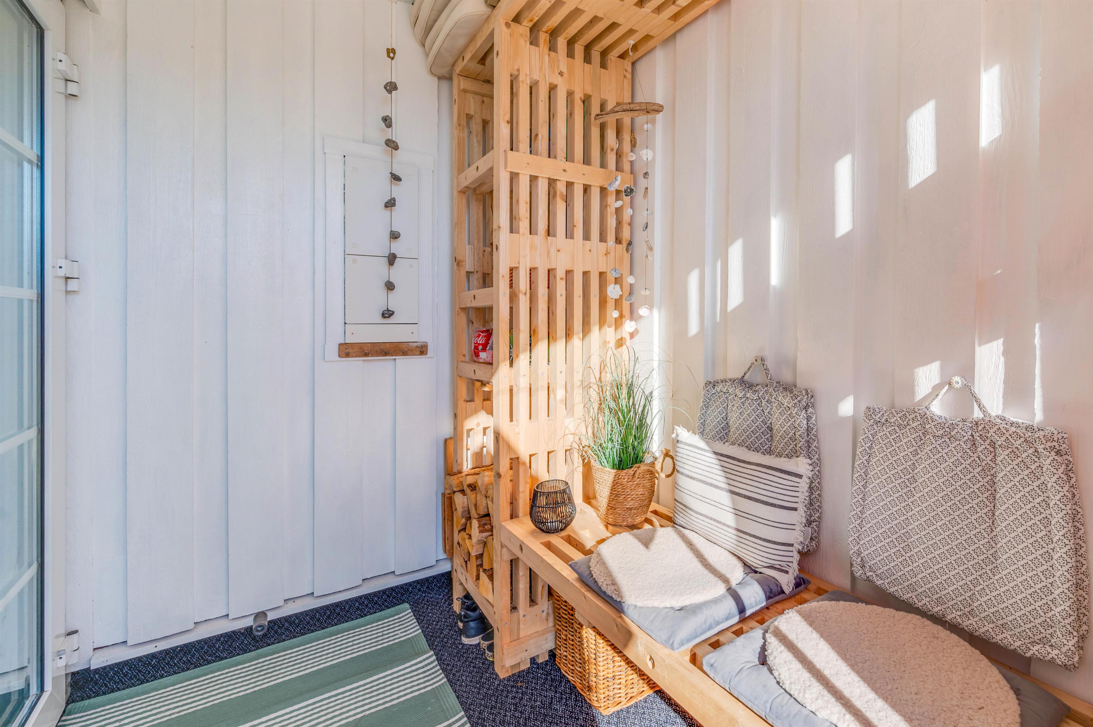 Fra opholdsstuen har I adgang til ferielejlighedens lukkede terrasse. Med det ruskende Vesterhav i baggrunden og en kop kaffe i hånden, har I opskriften på den bedste start på dagen. På terrassen har I havemøbler og liggestole til rådighed, og I kan nyde de skønneste solskinstimer direkte på terrassen.