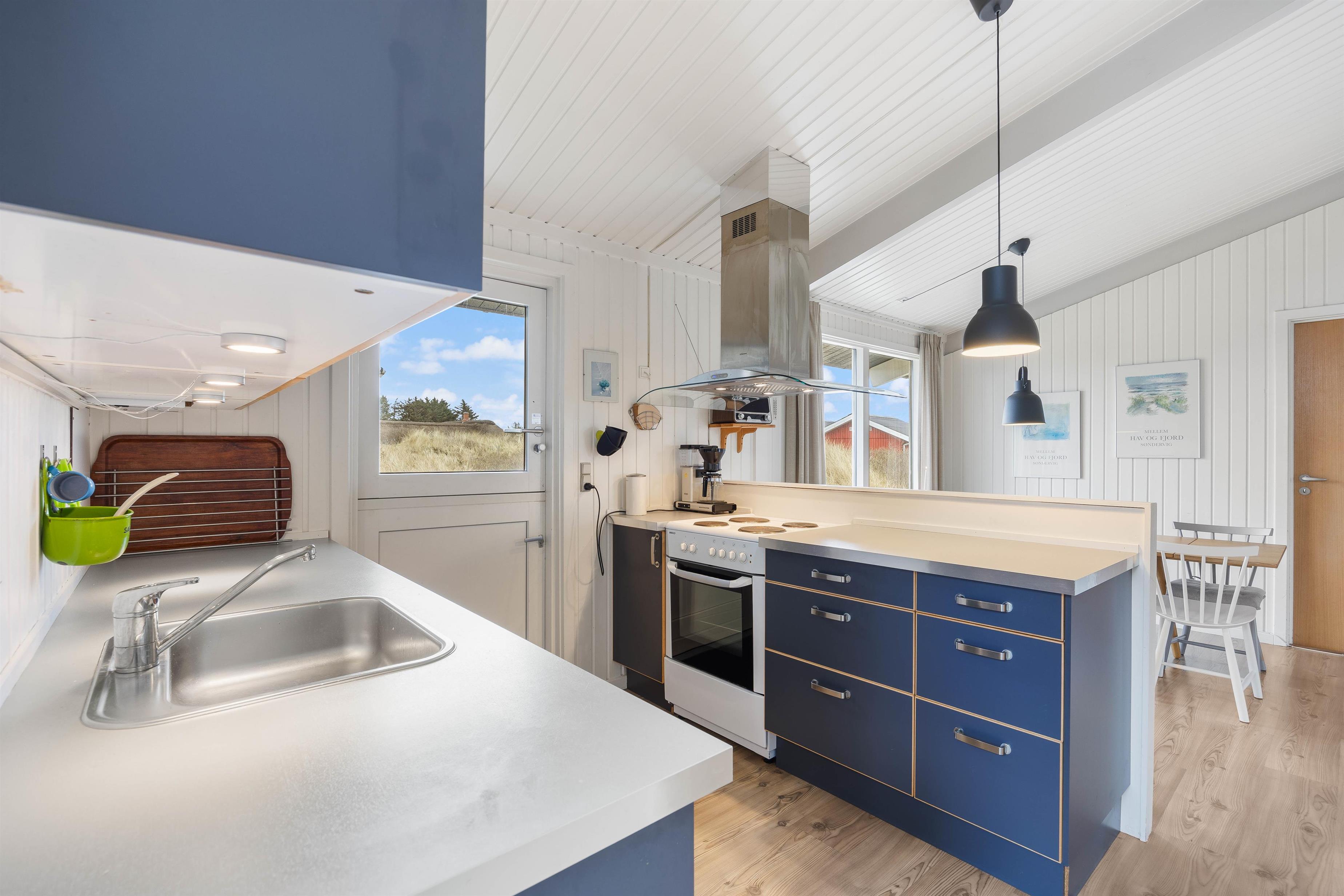 Sommerhuset ligger på en skøn naturgrund bare 300 meter fra det brusende og kraftfulde Vesterhav. En sti fra sommerhuset fører jer direkte ned til klitterne og den brede sandstrand med Vesterhavet i baggrunden. Den brede sandstrand inviterer til mange timers leg, hygge, lange gåture og samvær uanset vejret. I kan desuden nyde de smukke og betagende solnedgange over vandet.