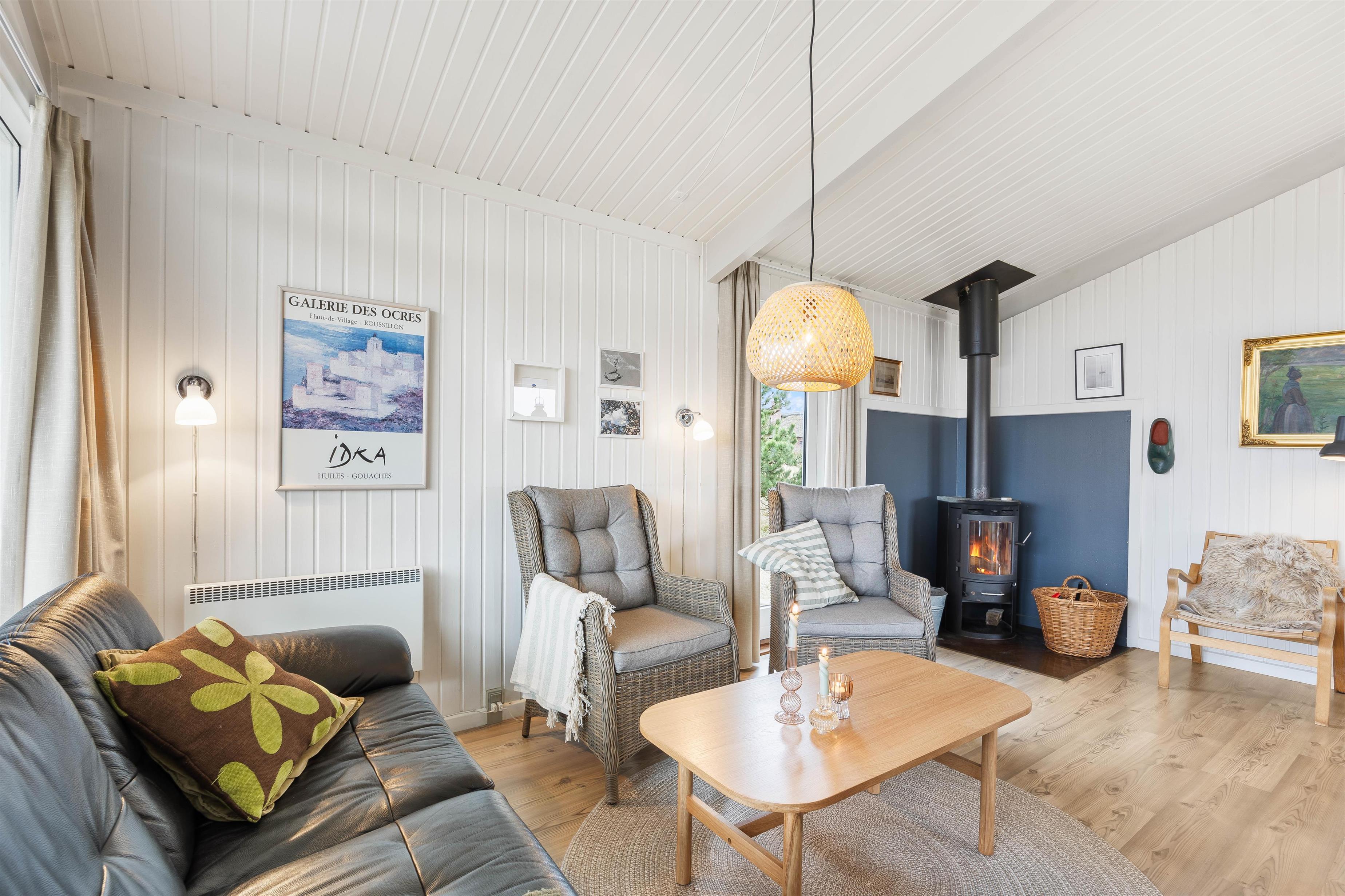 Den røde tråd går igen igennem hele huset. Hele sommerhuset er med loft til kip, hvilket giver en dejlig rumfornemmelse og samtidig giver de hvide trælofter et dejligt lyst indtryk, der er med til at I kommer i den helt rigtige feriestemning.