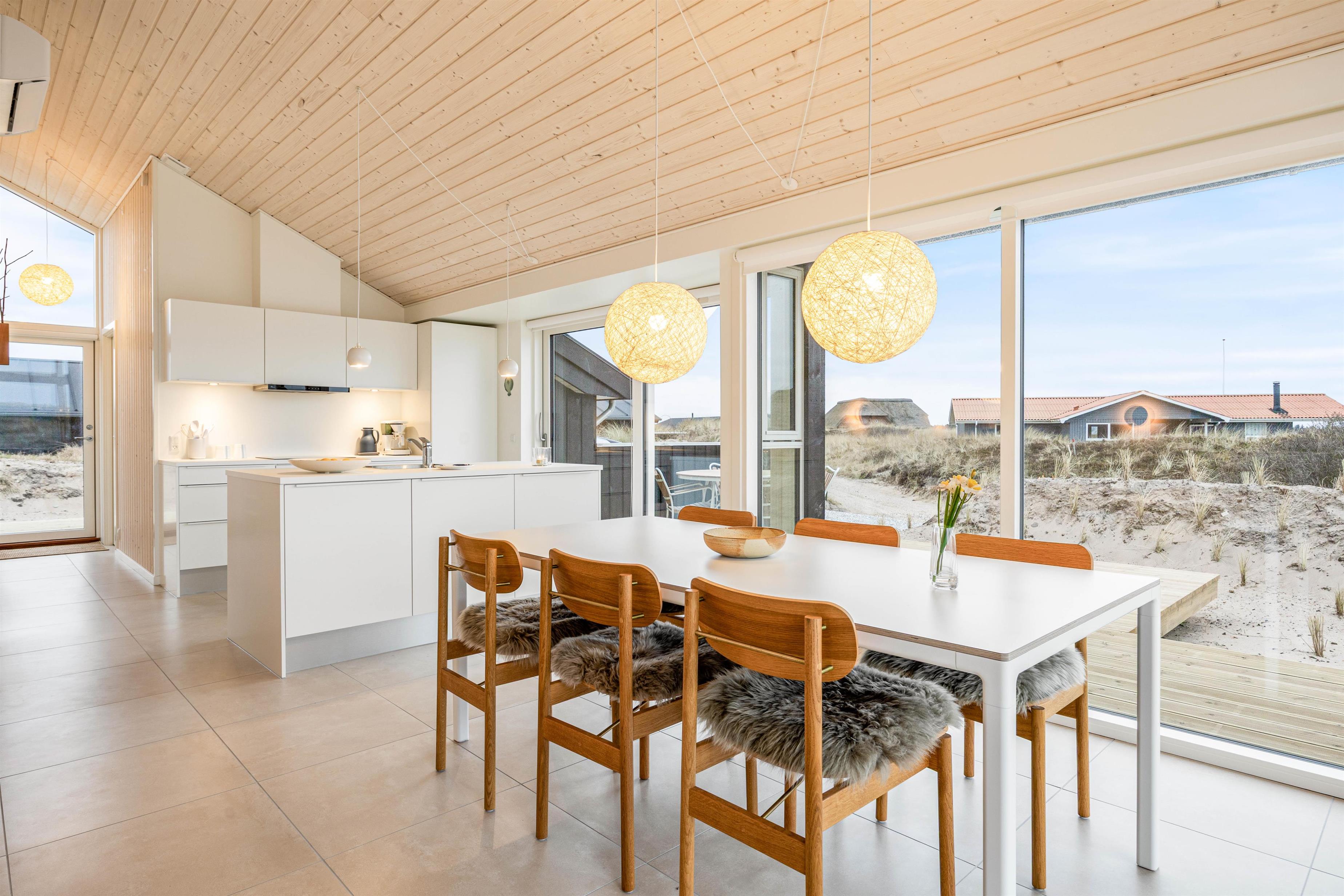 Meget af ferien vil naturligt samle sig i det lyse og åbne køkken-alrum, hvor der er gulvvarme, som bidrager til ekstra komfort. Køkkenet er veludstyret med alt, hvad feriekokkene kan få brug for, herunder opvaskemaskine og en separat fryser på 60 liter. Mens maden tilberedes, kan kokkene fortsat være en del af fællesskabet ved spisebordet eller i stuen, hvor der er rig mulighed for hygge med film eller brætspil. De store vinduespartier sikrer et skønt, naturligt lysindfald og bringer naturen helt tæt på.