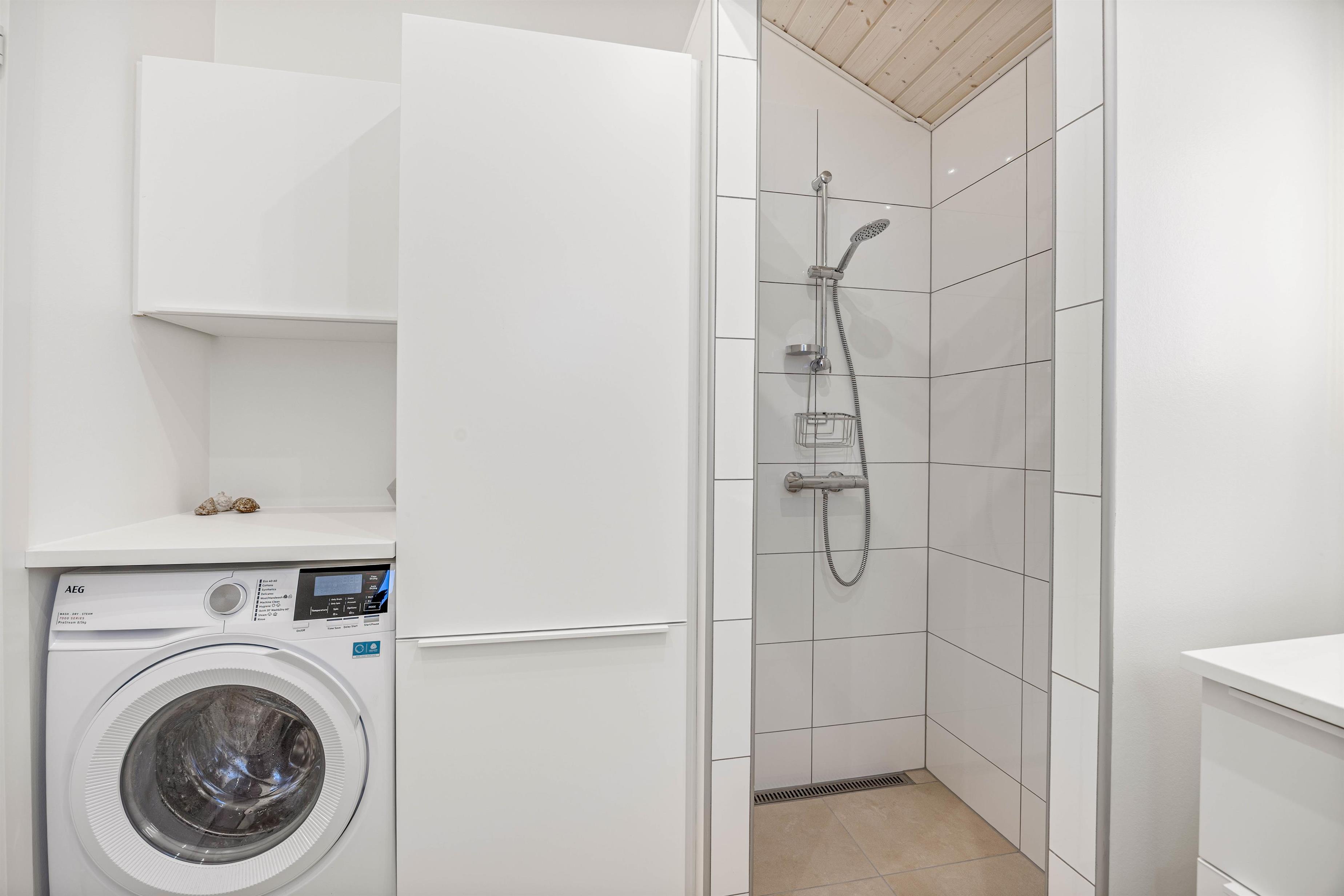 For ekstra komfort og bekvemmelighed er sommerhuset udstyret med en kombineret vaskemaskine og tørretumbler, så I kan nøjes med at pakke det mest nødvendige til ferien. Derudover sørger en energibesparende luft-til-luft-varmepumpe for et behageligt indeklima året rundt.