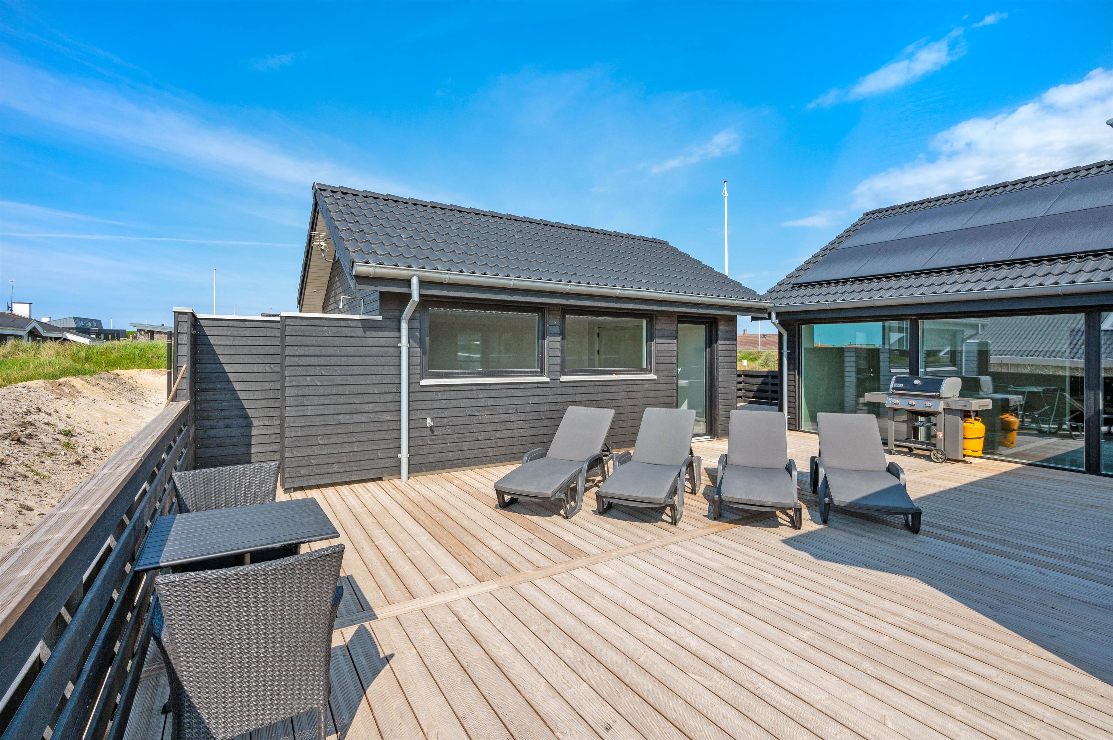 Der er en skøn, delvist overdækket lukket terrasse med udebruser. Her kan I forfriske jer efter en dag i solen eller skylle sandet af fødderne efter en lang gåtur på stranden. Udebruseren kan I benytte fra april til november. På terrassen står også havemøbler, terrassevarmer og gasgrill til fri afbenyttelse. Her kan I tilberede jer en lækker middag. For børnene er der både sandkasse og en gynge.
