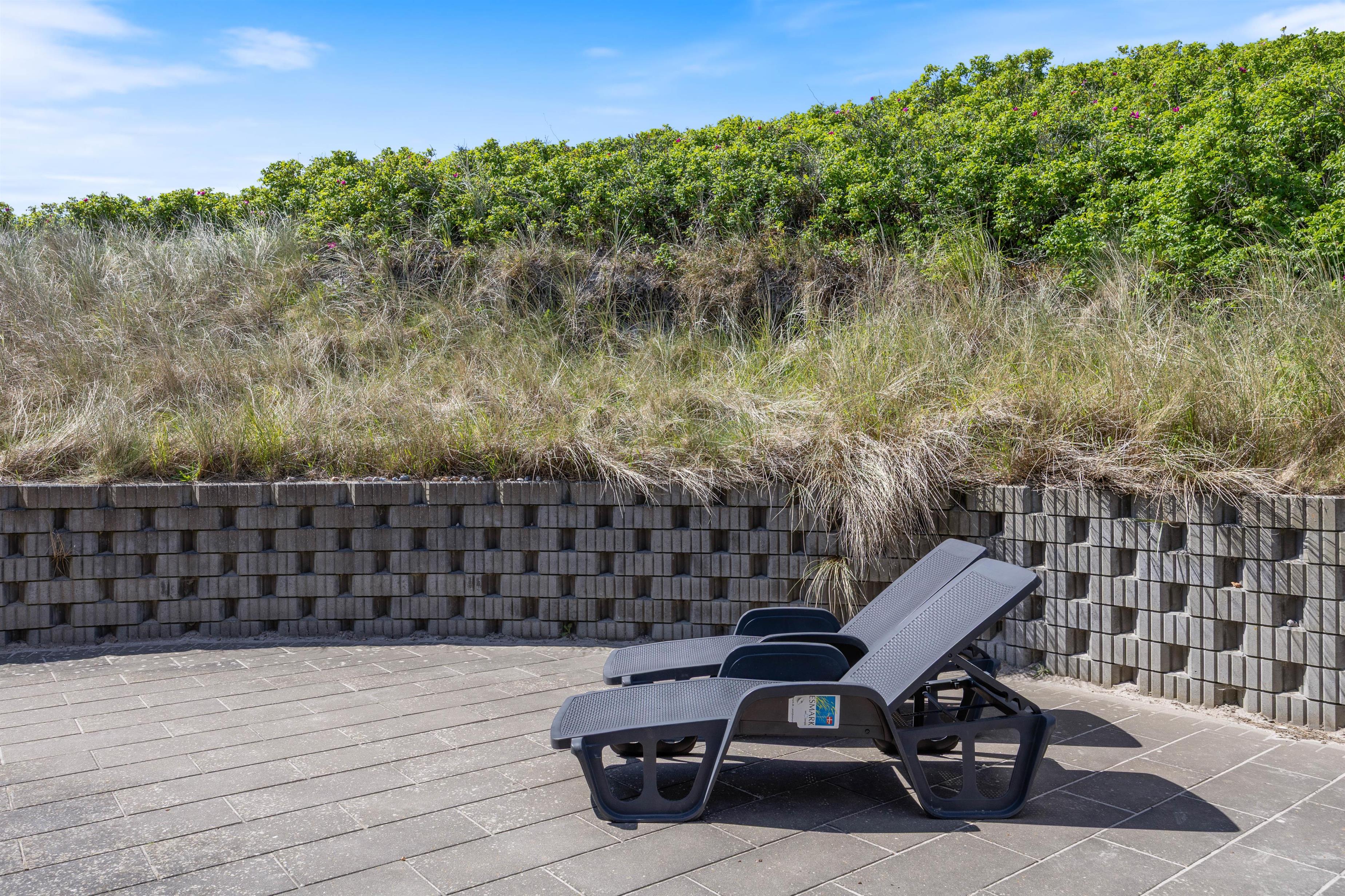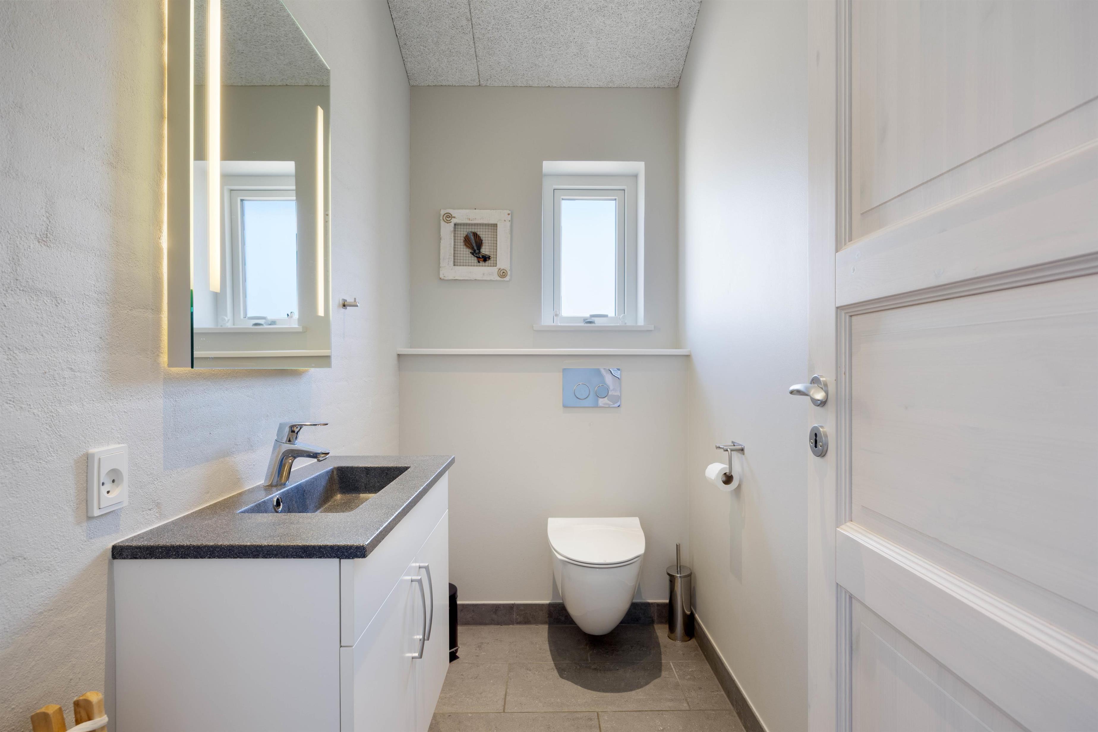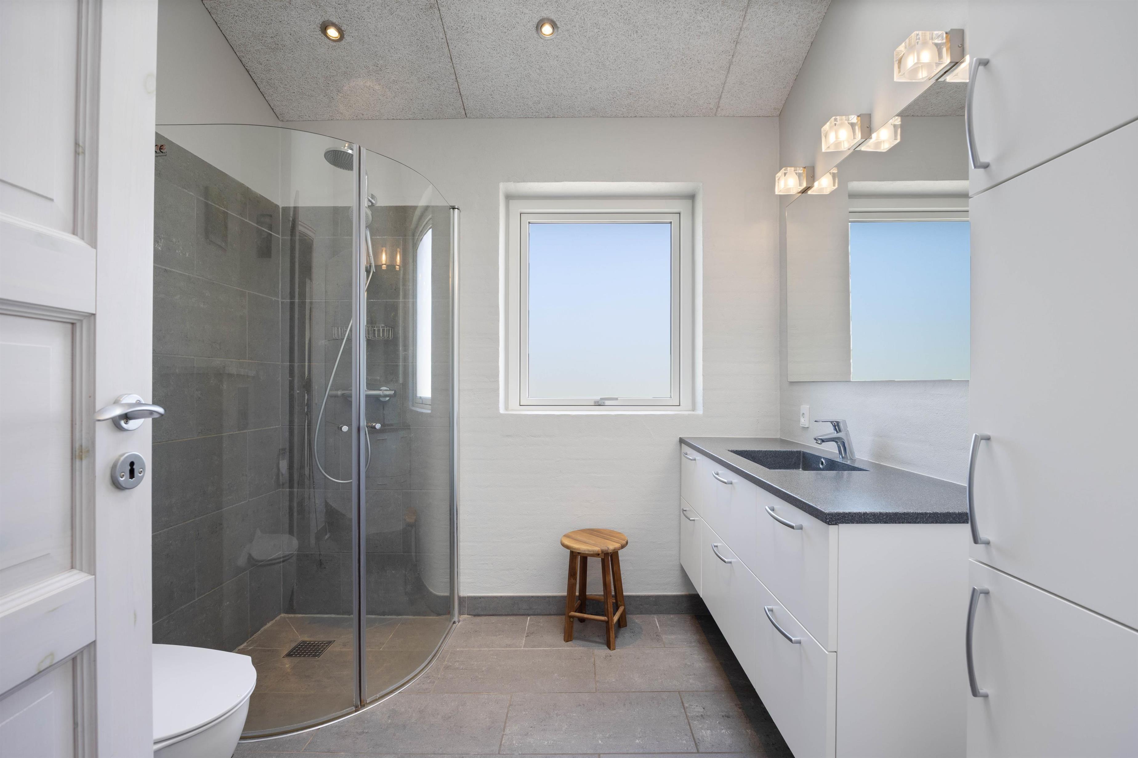 Feriehuset er indrettet med et stort moderne badeværelse og et gæstewc. Især i den koldere årstid vil I nyde, at der er gulvvarme i begge rum. Fra stuen har I direkte udgang til den skønne delvist afskærmede terrasse, der er udstyret med gode havemøbler. Her kan man virkeligt slappe af og nyde solens varme stråler på huden, lyden af bølgebrus i ørerne, duften af hav i næsen og udsigten til de hvide måger, der svæver hen over en blå himmel.