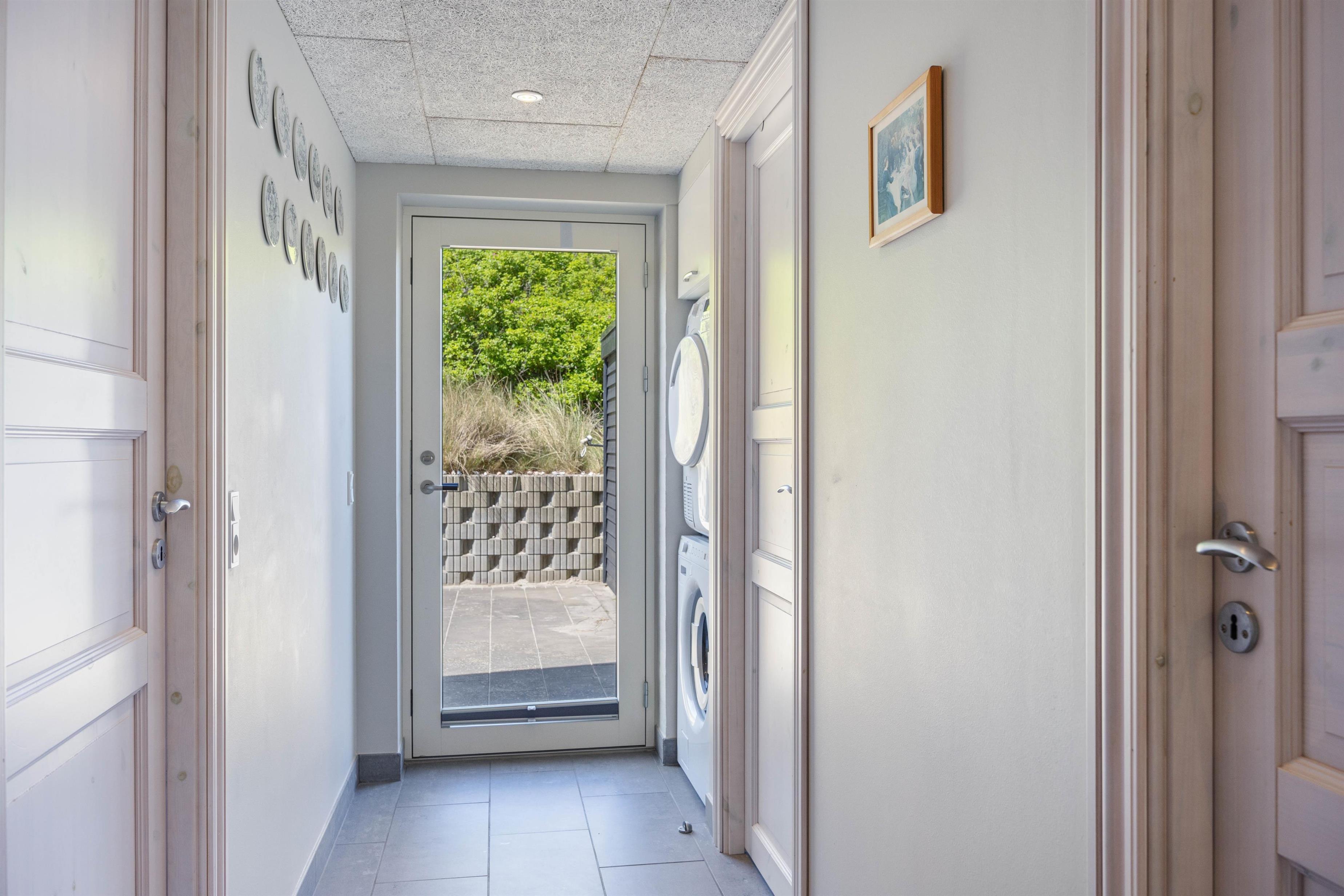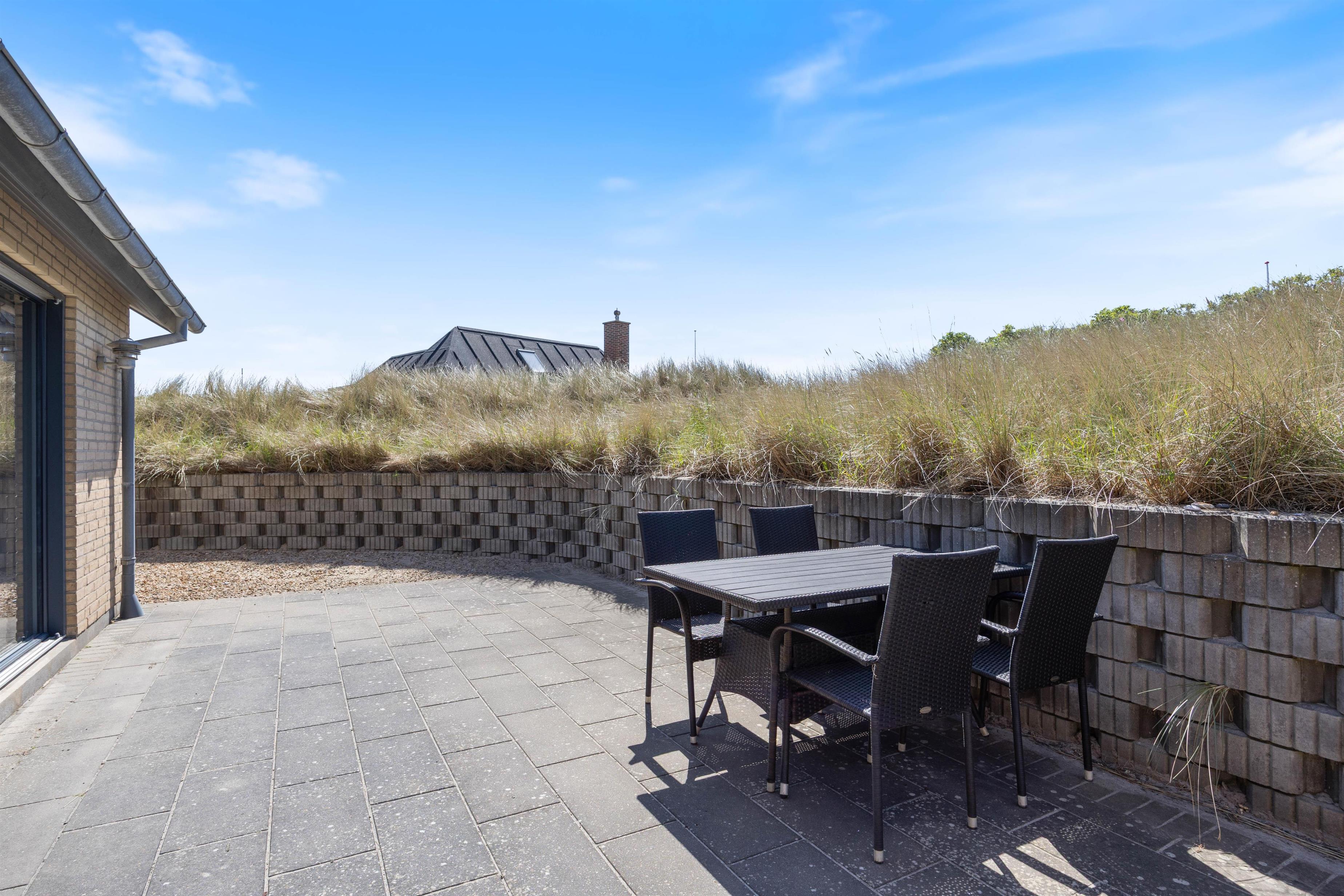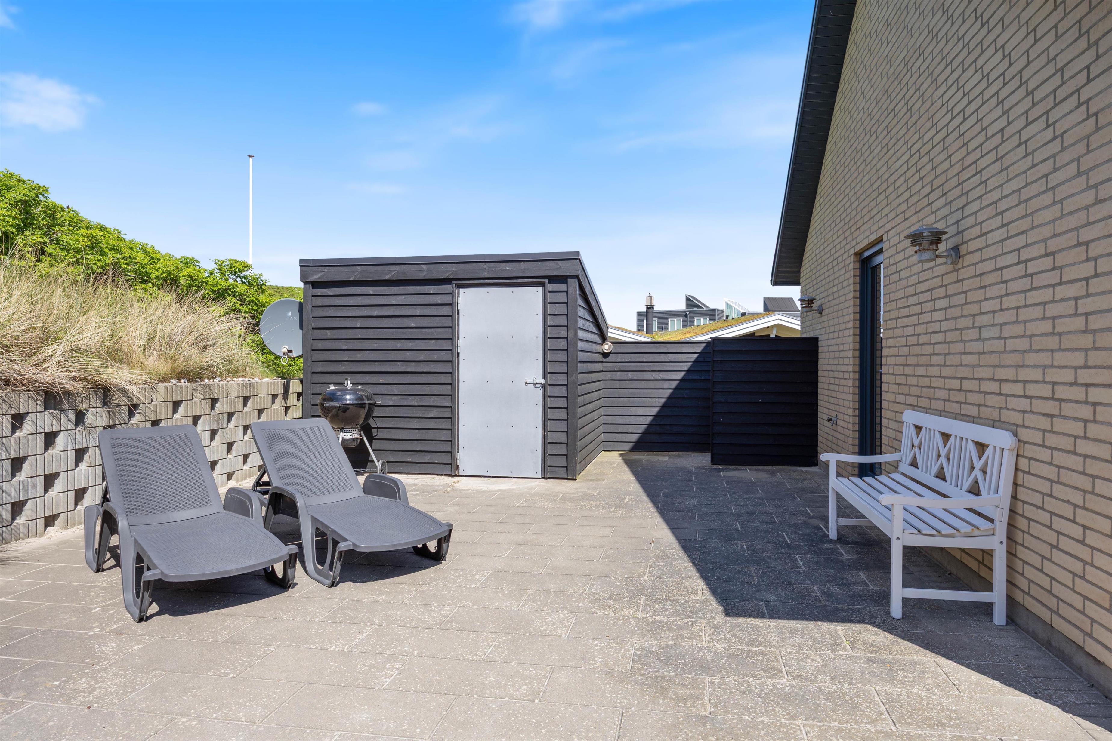 Feriehuset er indrettet med et stort moderne badeværelse og et gæstewc. Især i den koldere årstid vil I nyde, at der er gulvvarme i begge rum. Fra stuen har I direkte udgang til den skønne delvist afskærmede terrasse, der er udstyret med gode havemøbler. Her kan man virkeligt slappe af og nyde solens varme stråler på huden, lyden af bølgebrus i ørerne, duften af hav i næsen og udsigten til de hvide måger, der svæver hen over en blå himmel.