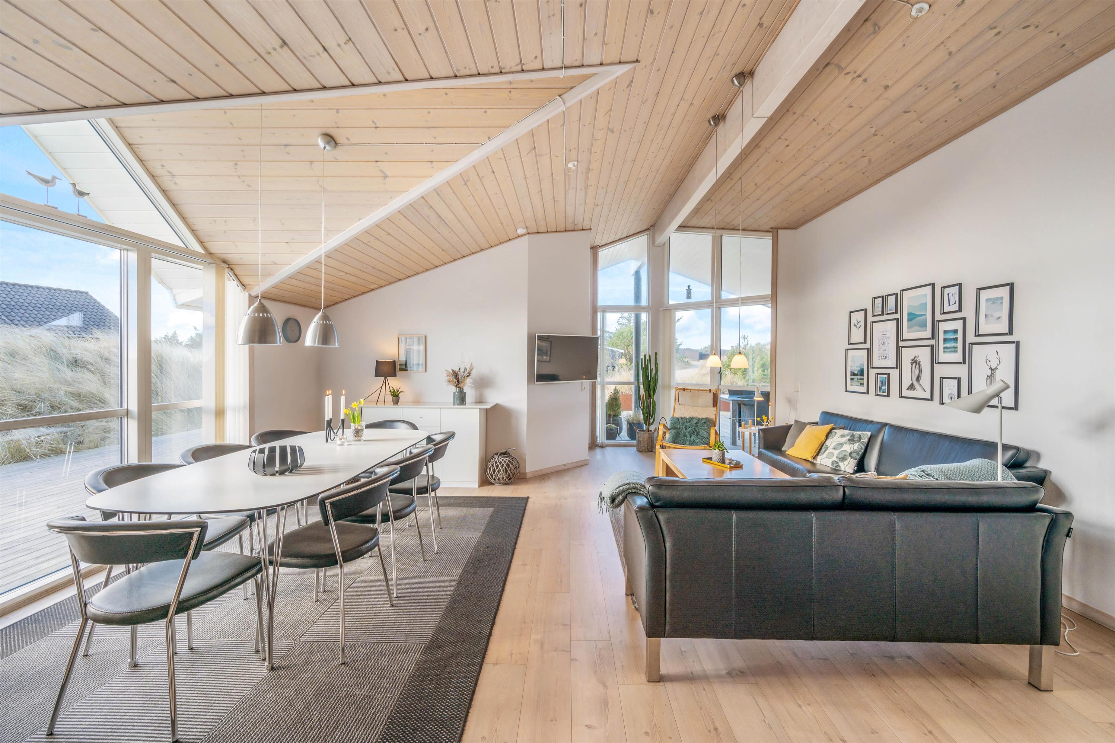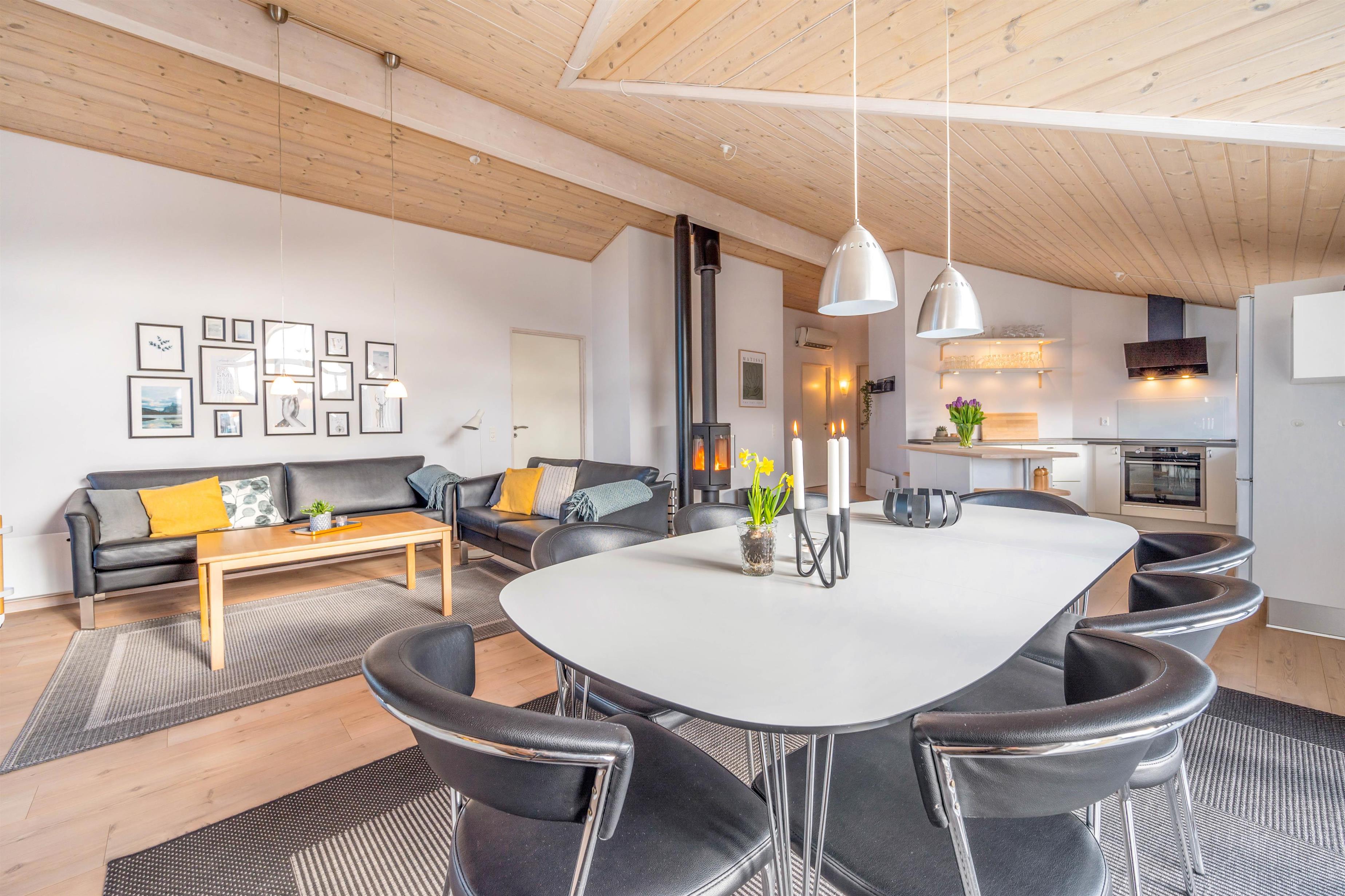 Det lyse opholdsrum hvor køkken og stuen befinder sig er feriehusets hjerte. Loftet til kip sørger for en dejlig rummelig følelse, og der er plads til at I alle kan sætte jer til rette i de stilfulde og behagelige møbler. Det store opholdsrum giver jer også mulighed for at bruge masser af kvalitetstid sammen og nyde jeres ferie sammen. Så imens nogle måske slapper af på sofaen, kan nogle andre forbedere en lækker middag i det fine køkken - Hvor der naturligvis er opvaskemaskine og en seperat fryser på 50L, så der er masser af tid og overskud til at hygge omkring spisebordet eller en aftentur til stranden.