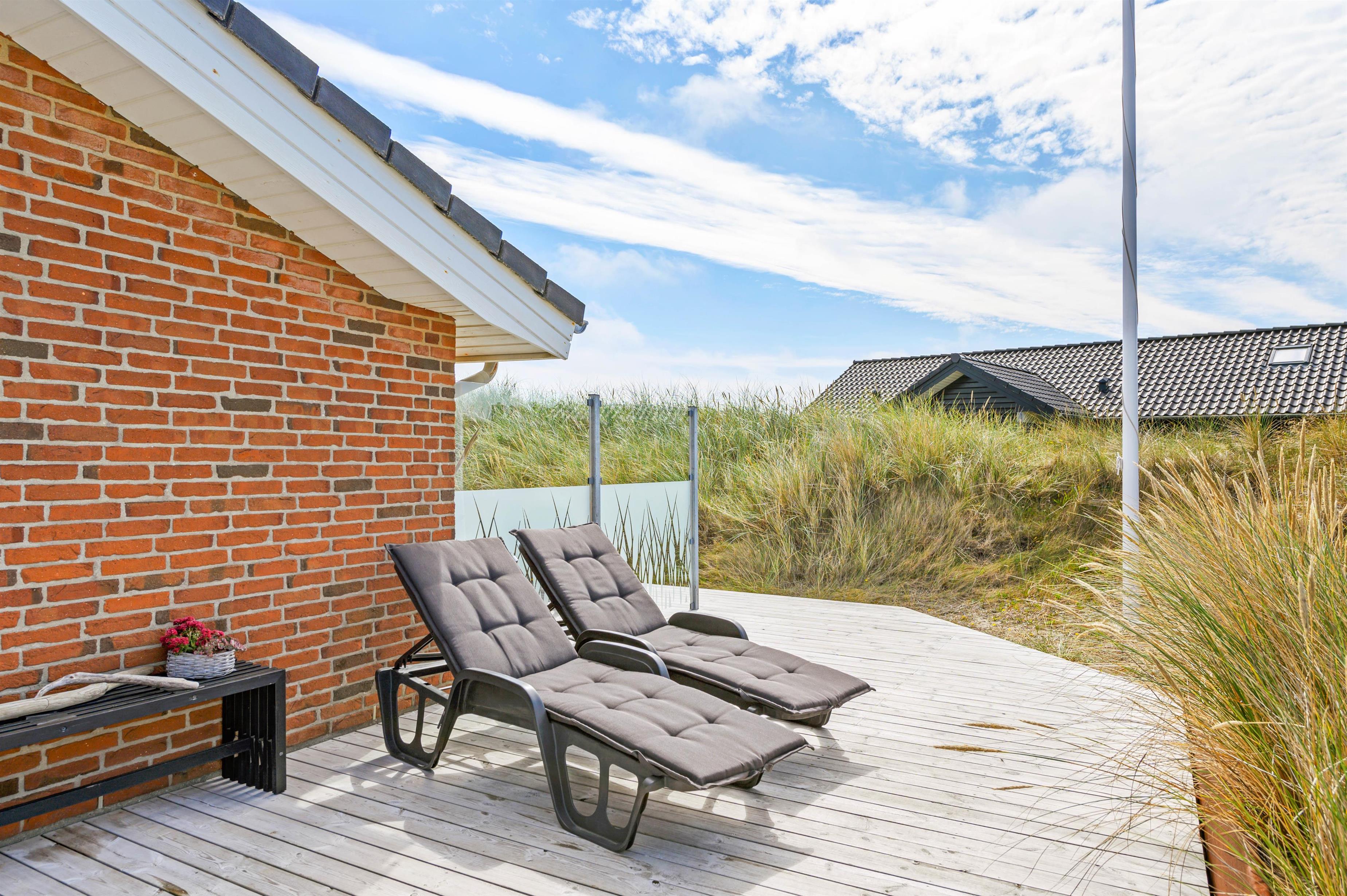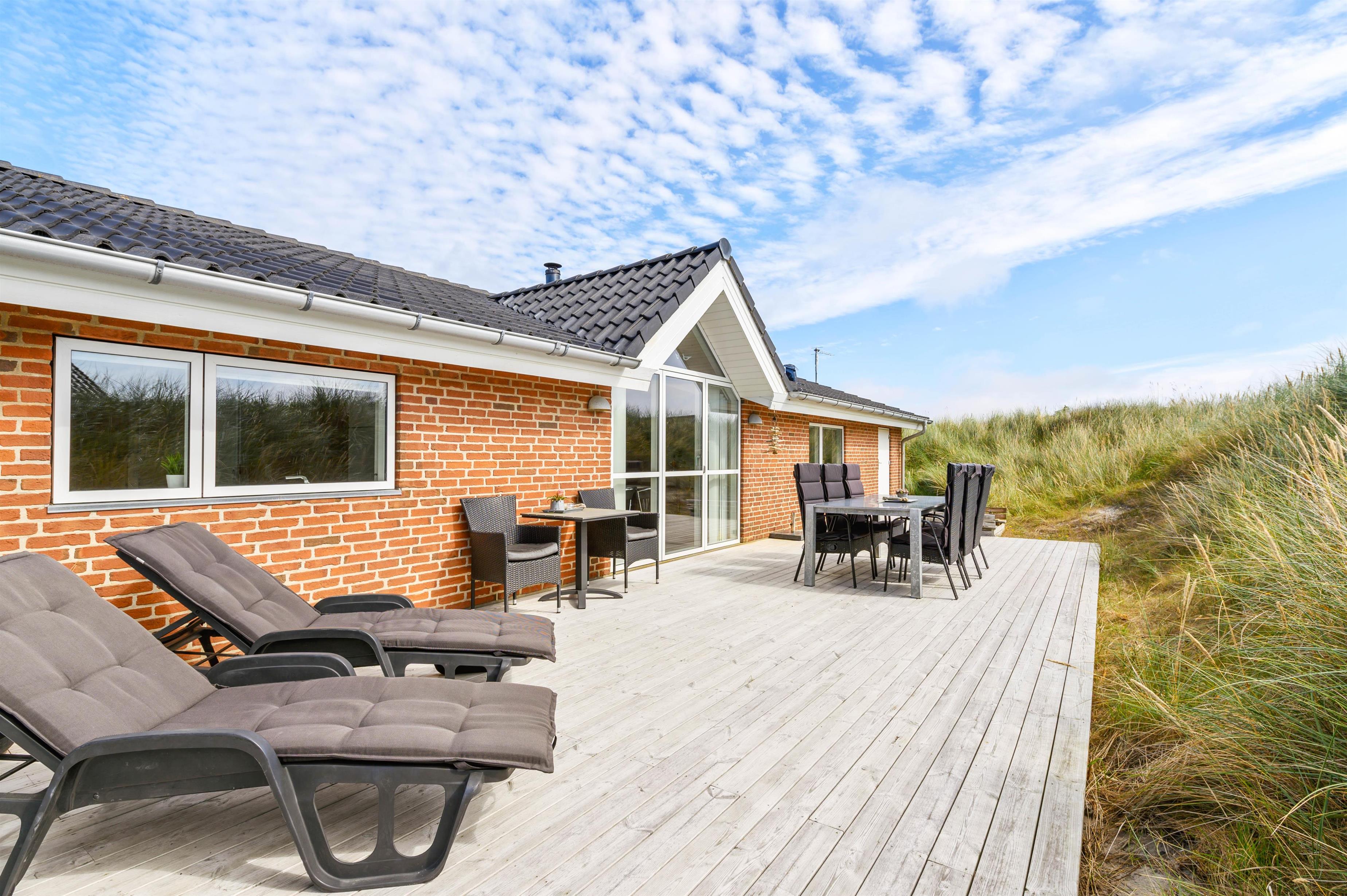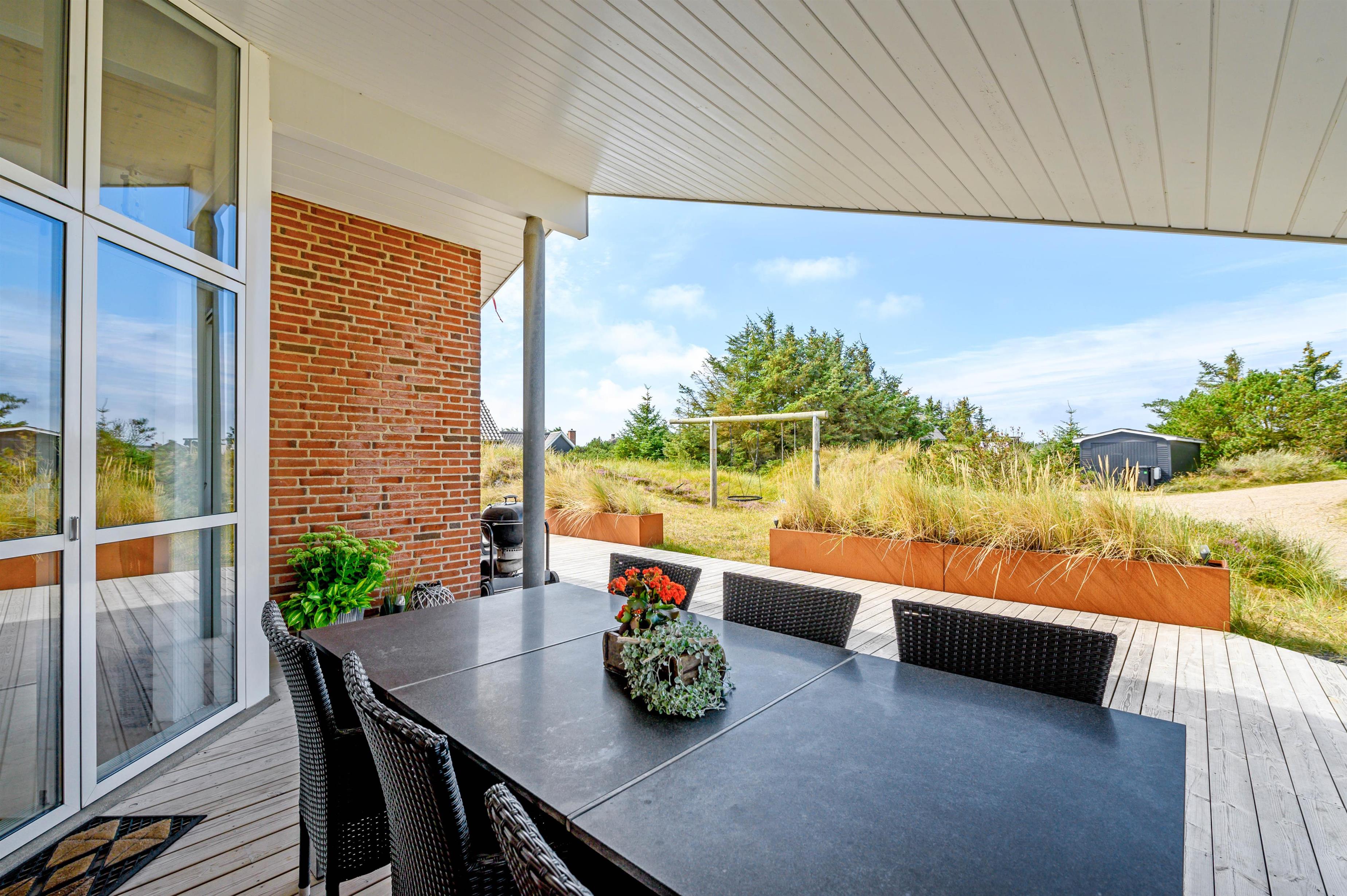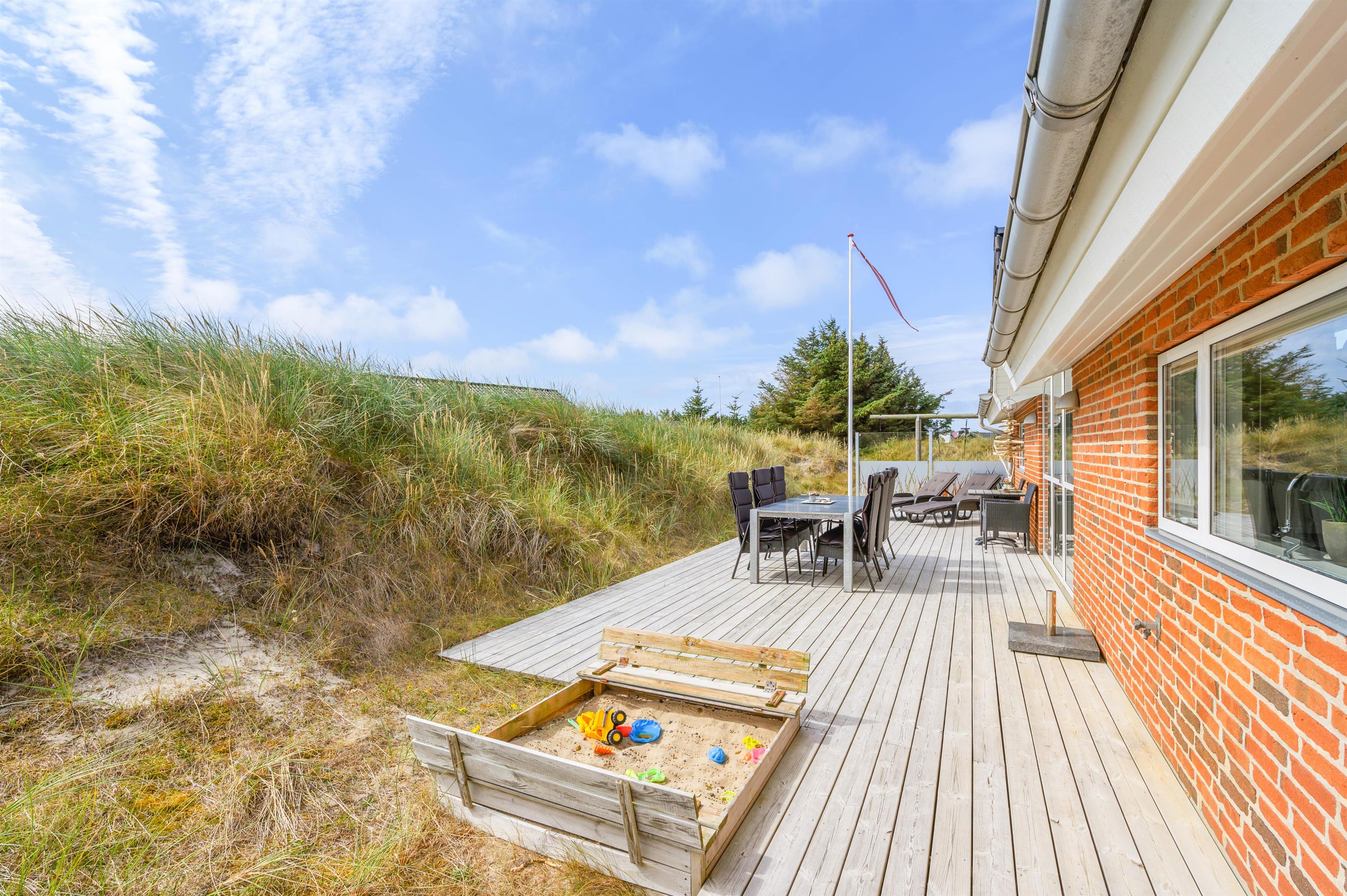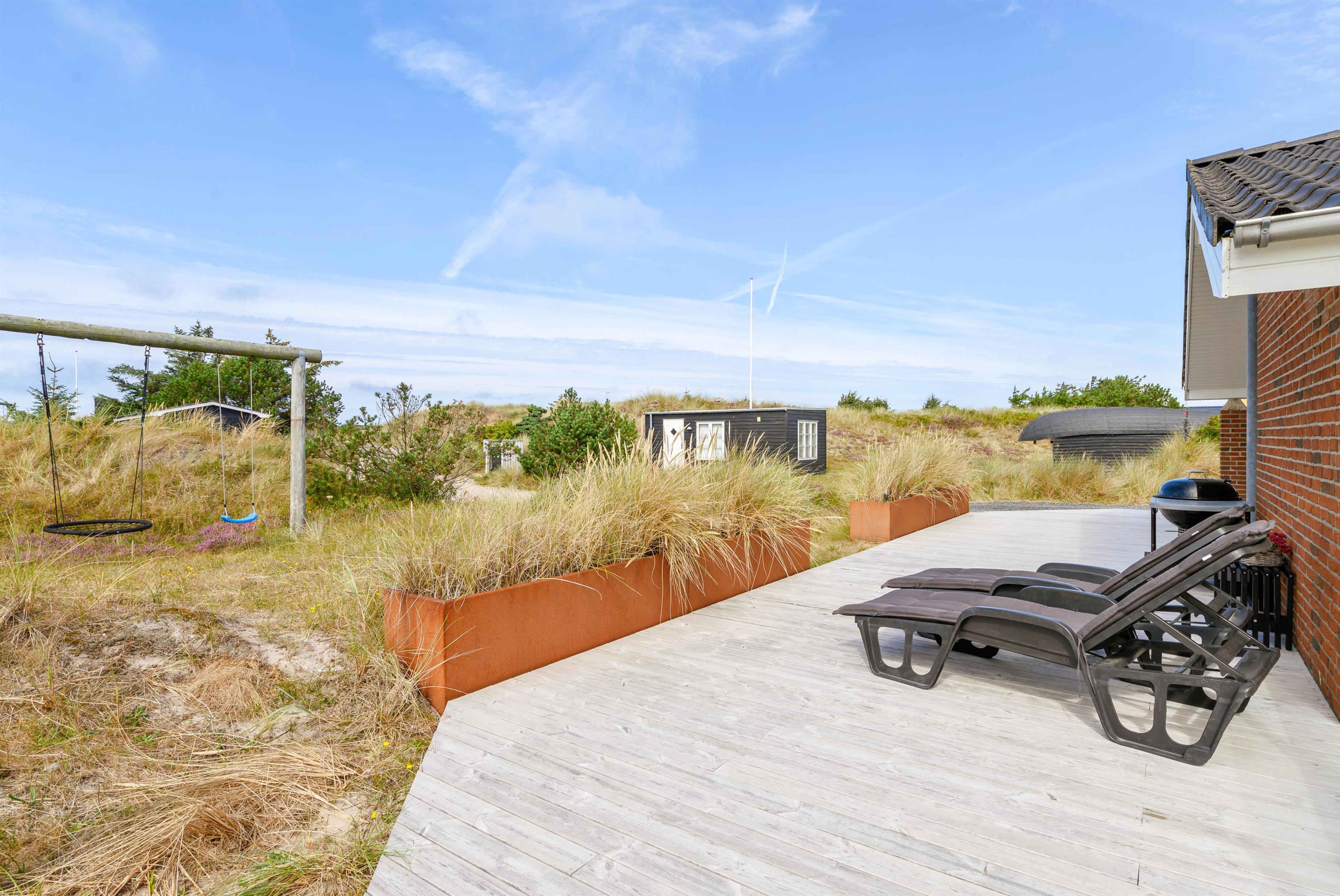 Det omkringliggende klitlandskab er ikke blot smukt, men sørger for naturlig læ. Bliver det for varmt, så er der kun 500 meter ned til en lækker sandstrand og de blågrønne forfriskende bølger. Solnedgangen og aftenstemningen kan I ligeledes nyde på terrasse, hvor I naturligvis også kan tænde op i husets gasgrill. Skulle vinden blive lidt kølig og duggen falde, så kan I søge ind under den overdækkede del af terrassen.