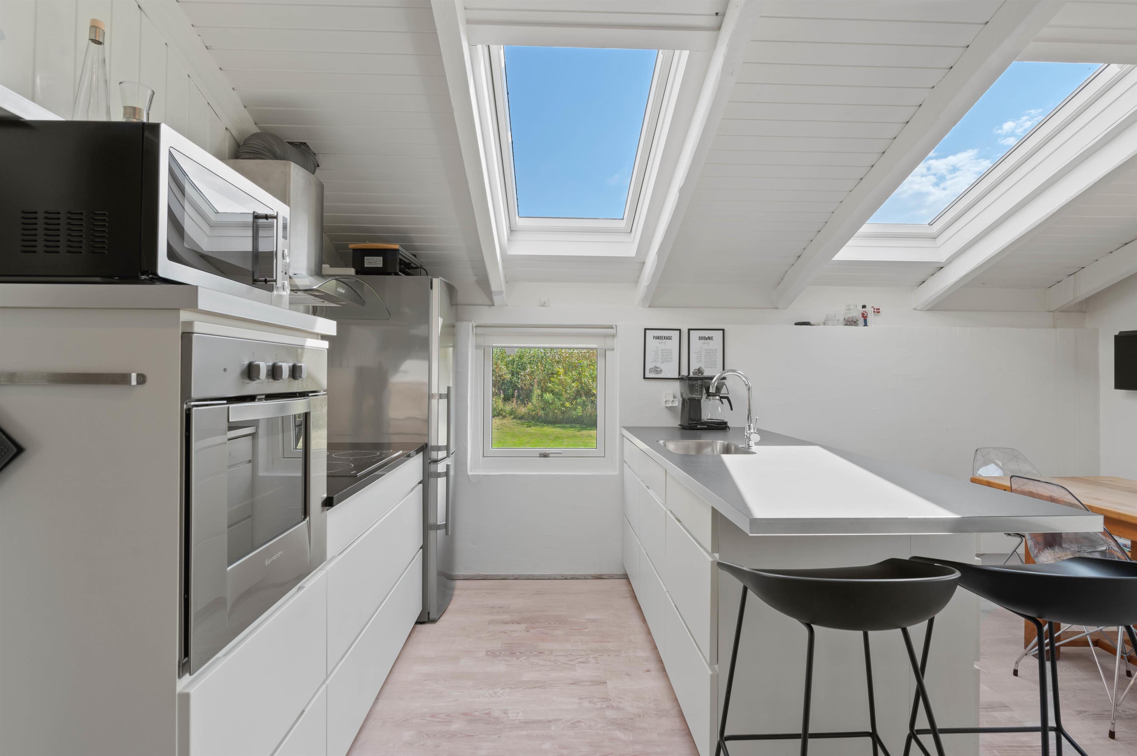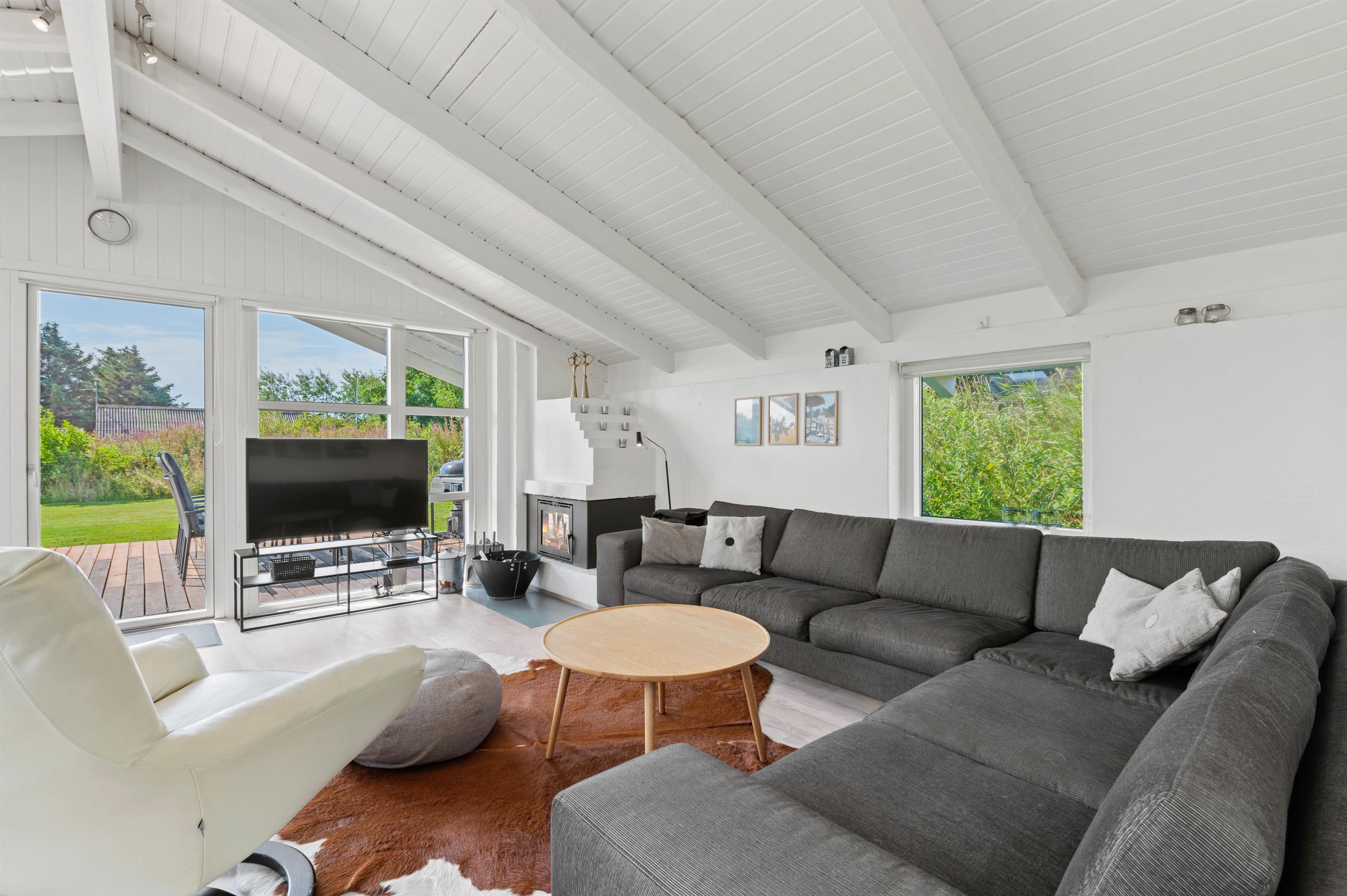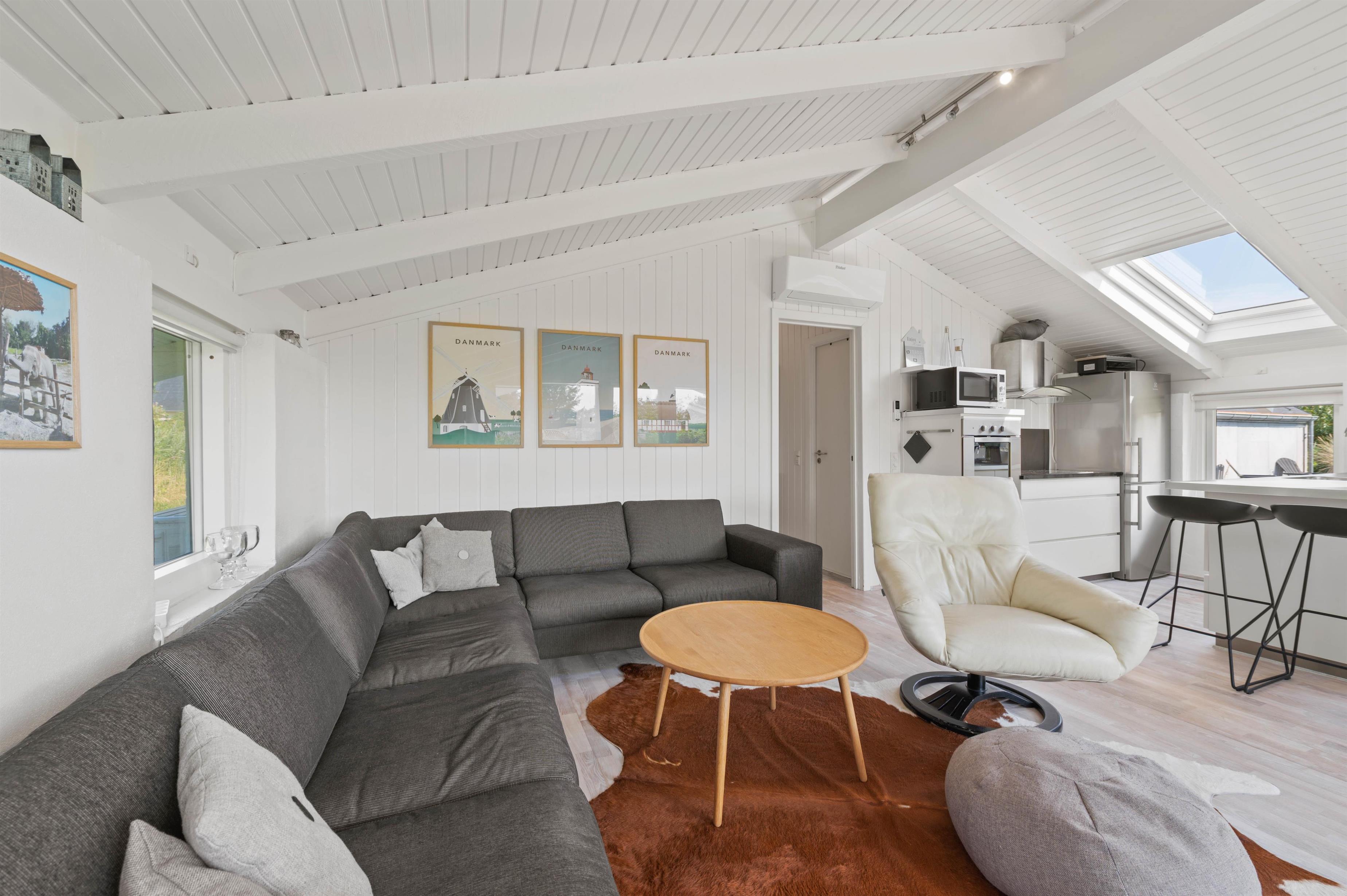 Feriehusets centrum er den dejlige, lyse stue der ligger i forlængelse af det fine køkken. Her kan I sætte jer i barstolene og nyde en lækker drink eller et glas koldt at drikke imens andre står for madlavningen samtidig med, at I nyder de knitrende lyde og den behagelige varme fra brændeovnen. Ovenlysvinduerne sørger for et fantastisk lysindfald, hvilket også hænger godt sammen med valget af de andre lyse møbler, vægge og lofter. Ydermere finder I i sommerhuset også en energisparende luft til luft varmepumpe, der kan være behjælpelig med at skabe et behageligt indeklima uanset årstiden.