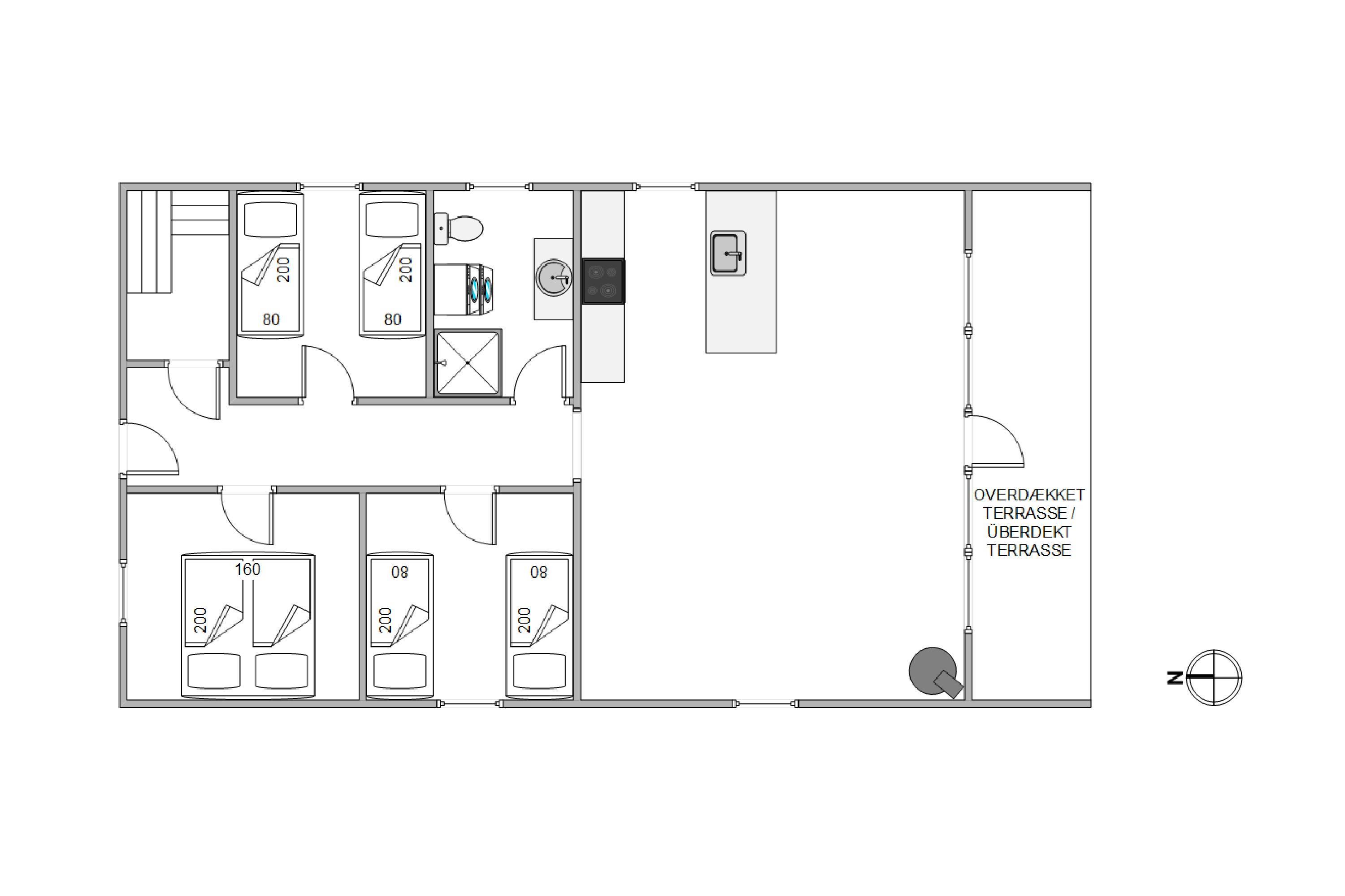 Det 72 m2 store sommerhus er lyst og dejligt indrettet med fokus på de små detaljer. De skønne vinduespartier giver et godt lysindfald i feriehuset og er med til at skabe en hyggelig atmosfære og feriestemning. Sommerhuset råder over 3 dejlige soverum og plads til 6 personer, hvoraf 2 af soveværelserne er indrettet med hver 2 enkeltsenge og det sidste med en dobbeltseng. Desuden råder feriehuset over både sauna, brændeovn, Smart-tv og gratis, trådløst internet i sommerhuset.