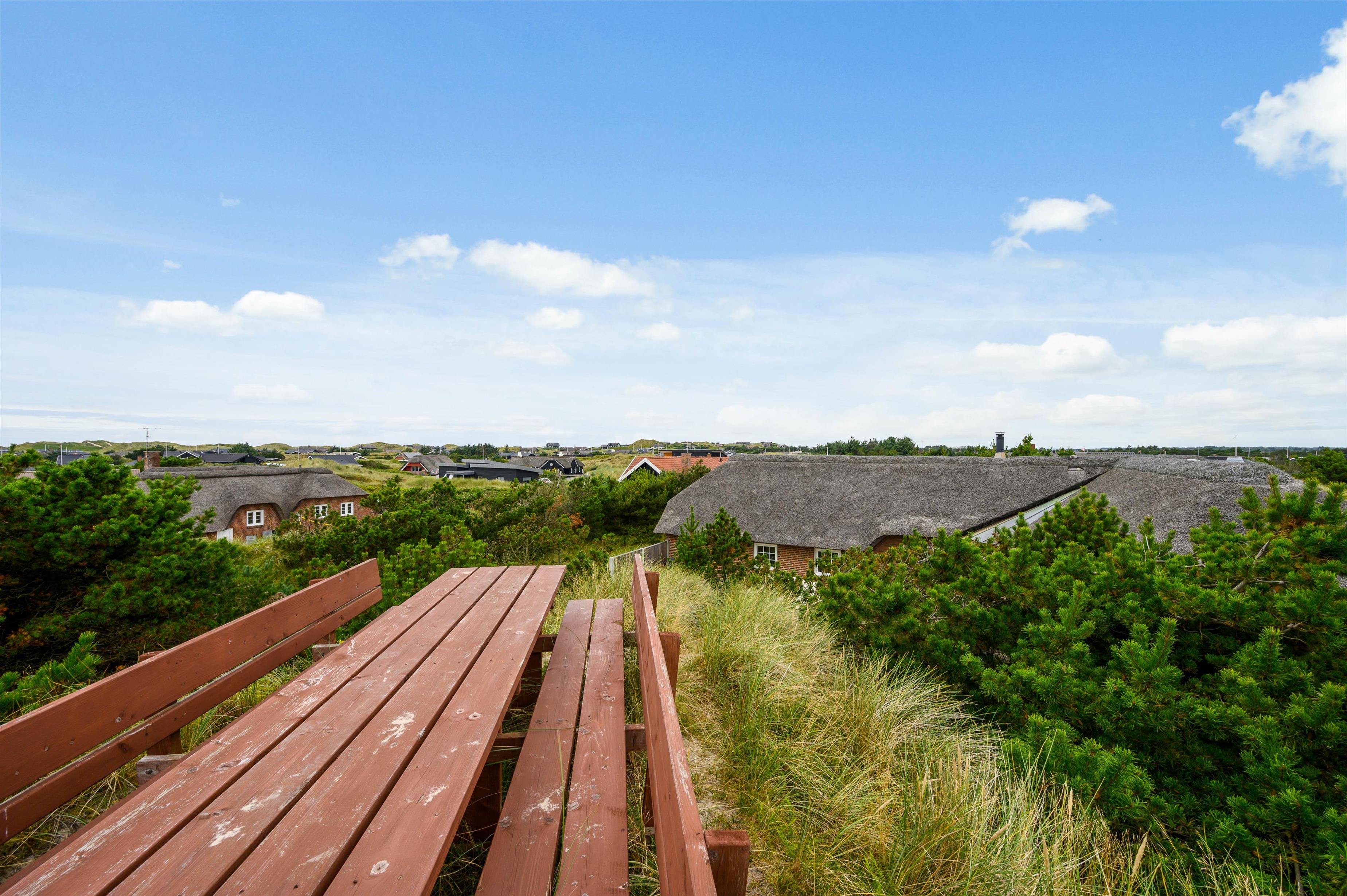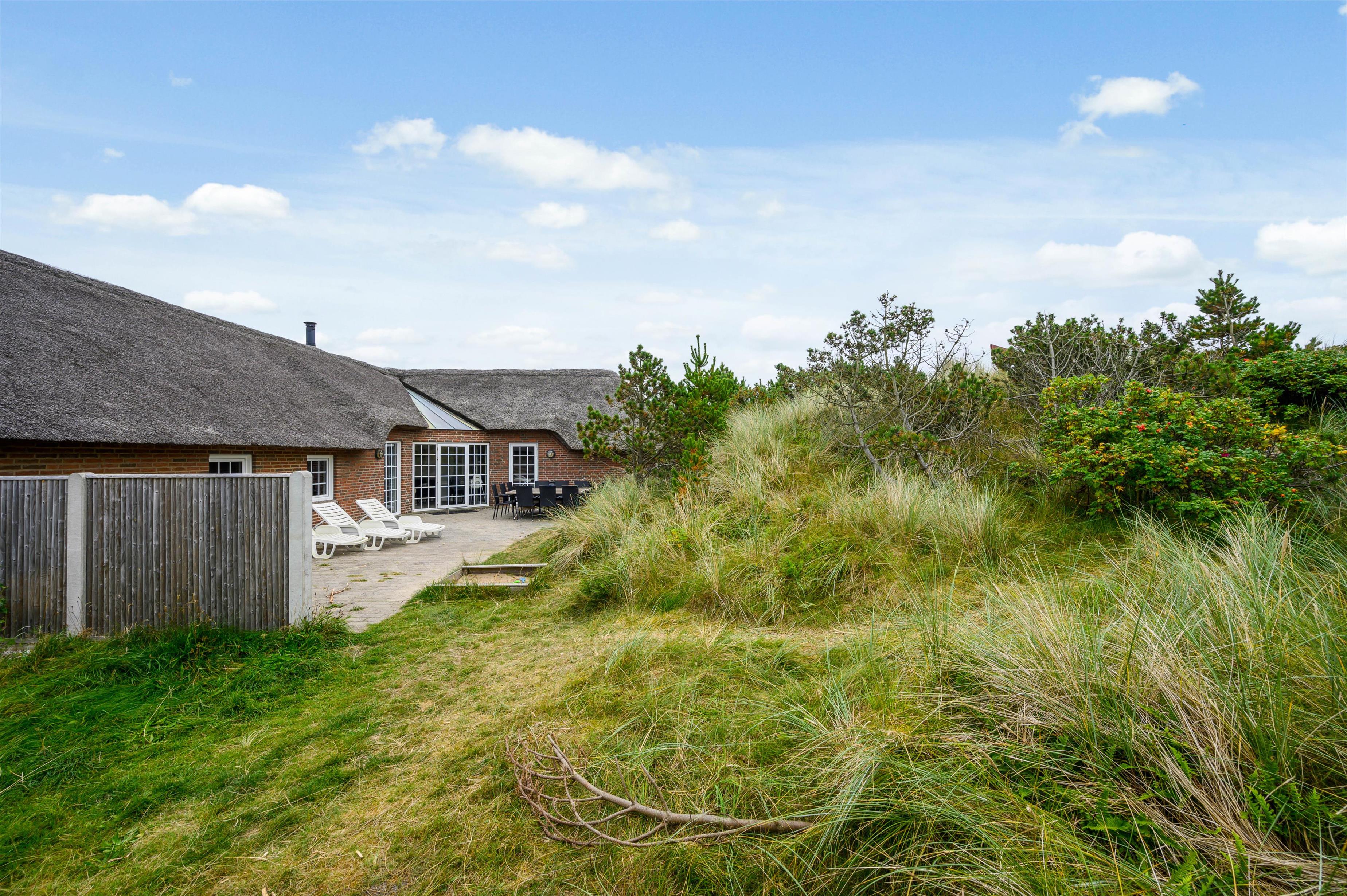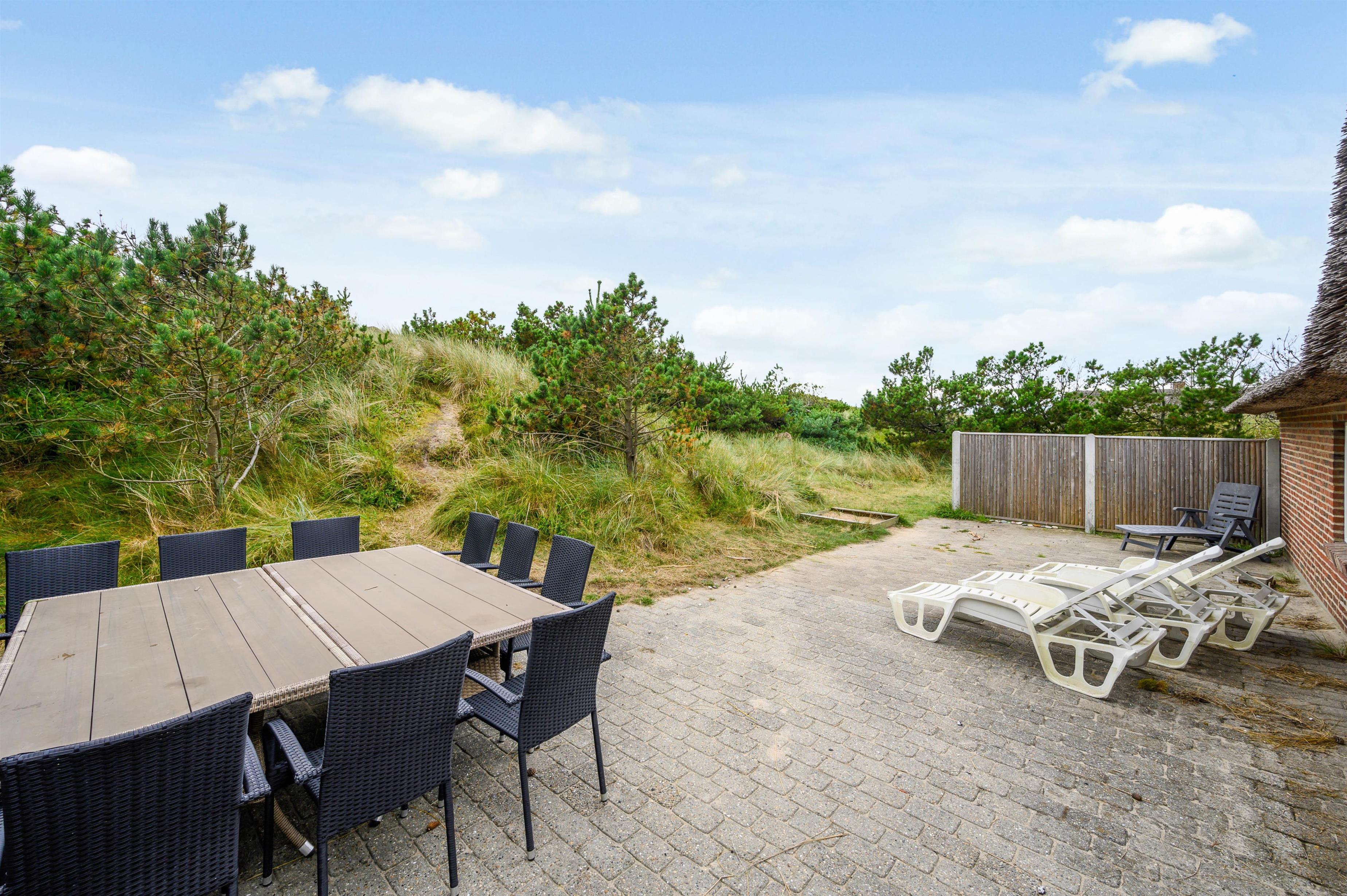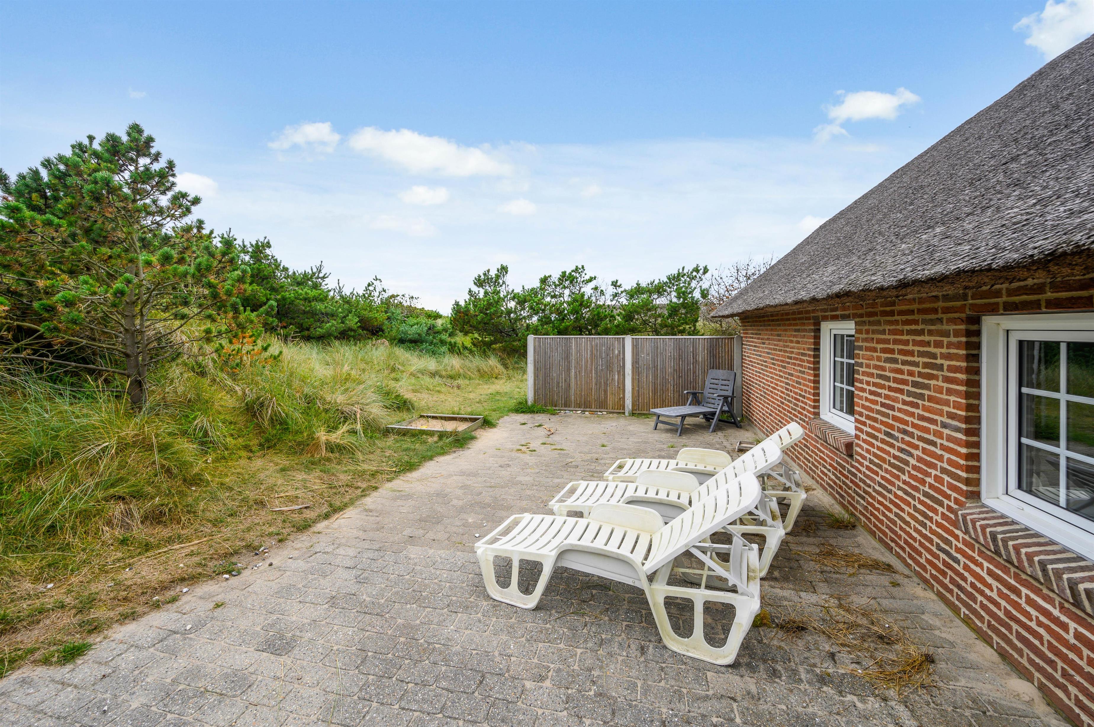 Sommerhuset har en rigtig skøn beliggenhed omgivet af høje klitbanker. Her kan I helt ugeneret nyde feriedagene på terrassen, hvor hele familien finder en plads i solen. På de lune sommeraftener kan I samles til en hyggelig grillmiddag i aftensolen, og I kan nyde et ekstra glas rødvin rundt om havebordet, mens børnene og hundene leger rundt omkring ved huset eller bygger sandslotte i sandkassen.