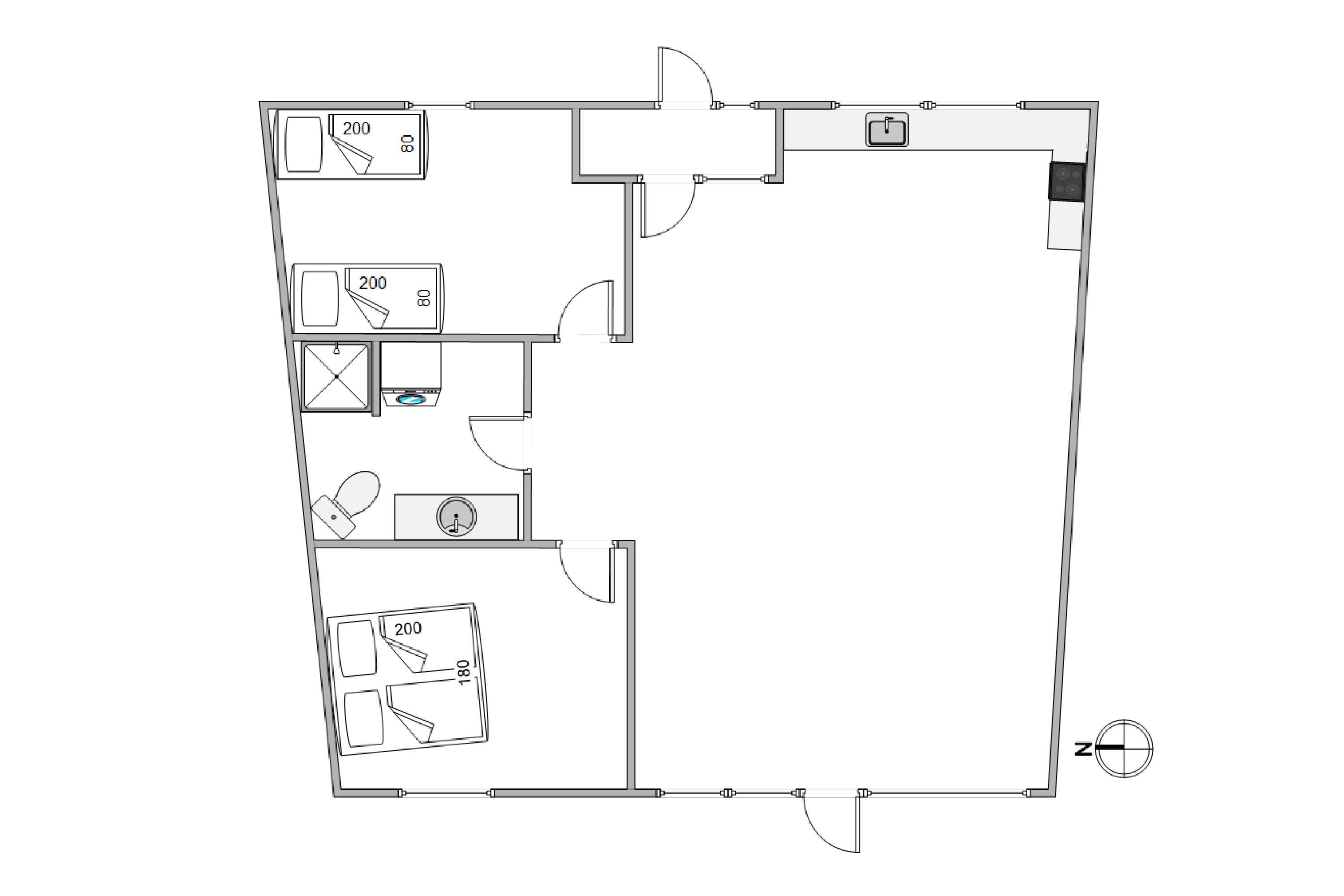 Ferieboligens seks sovepladser har alle gulvvarme og er fordelt med et værelse med dobbeltseng, et værelse med to enkeltsenge og en sovesofa i stuen. Derudover er der et rummeligt badeværelse med gulvvarme, bruseniche, vaskemaskine og tørretumbler.