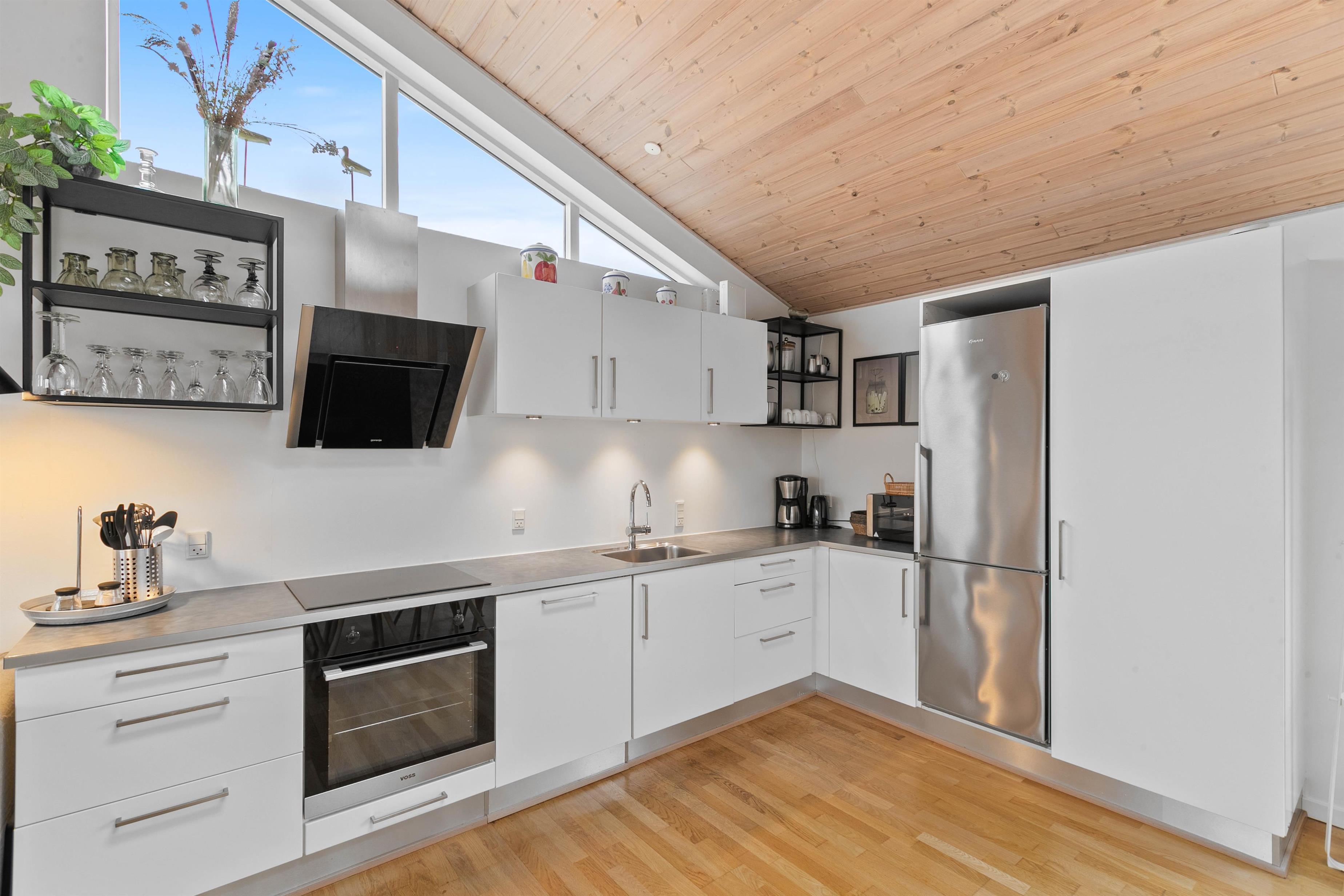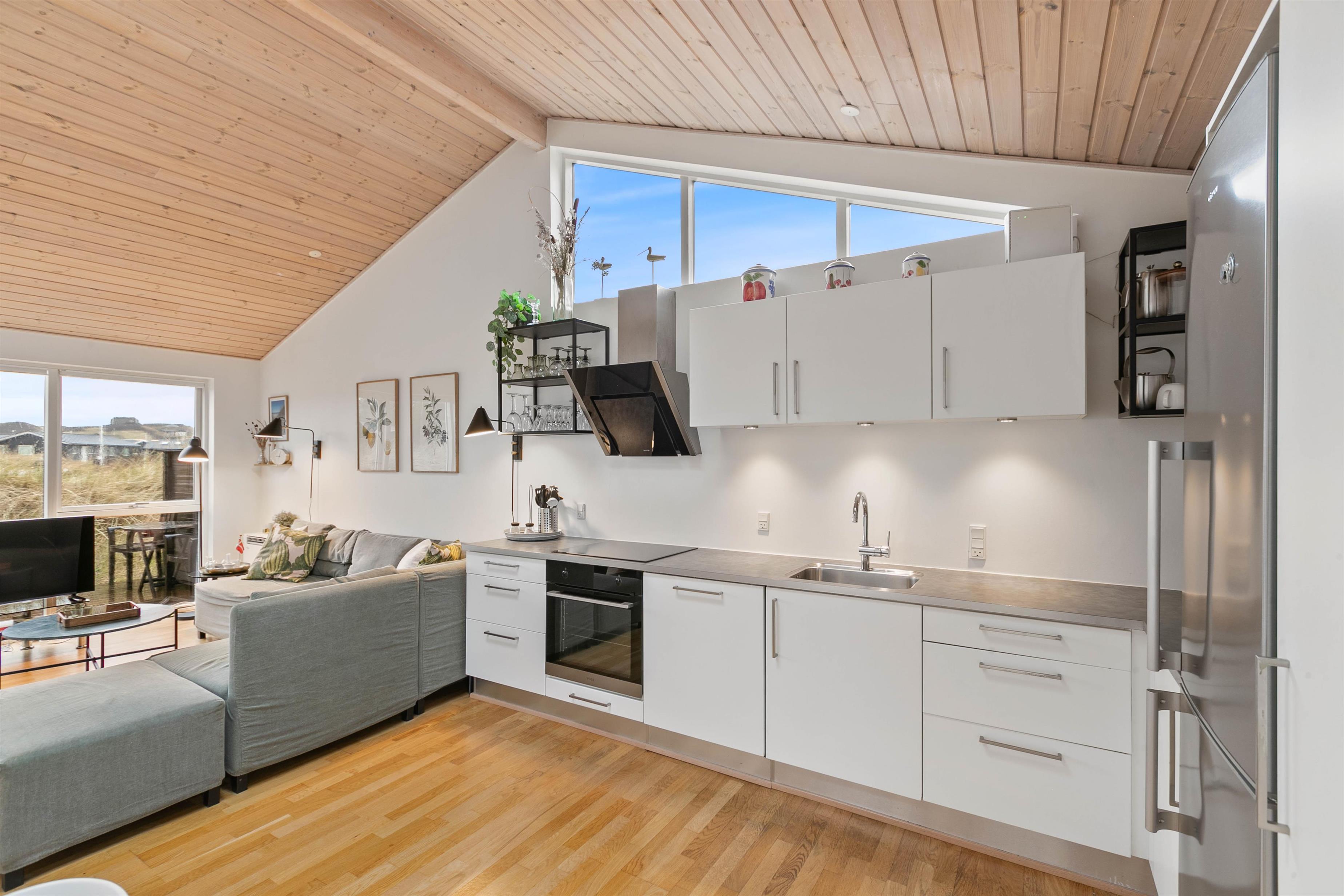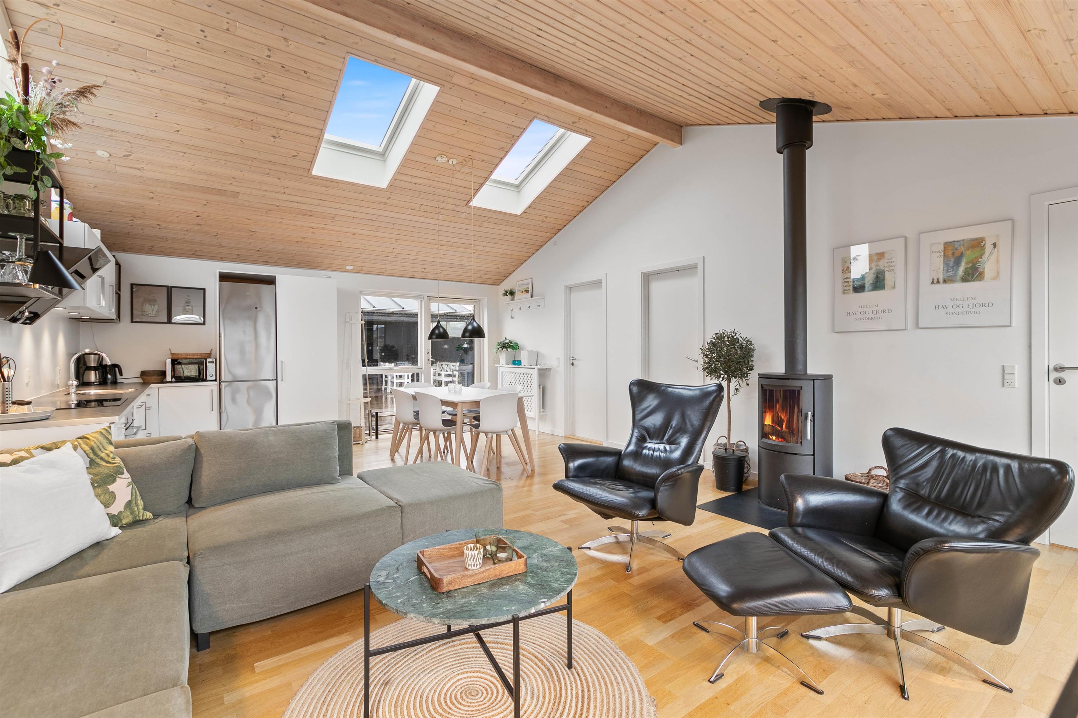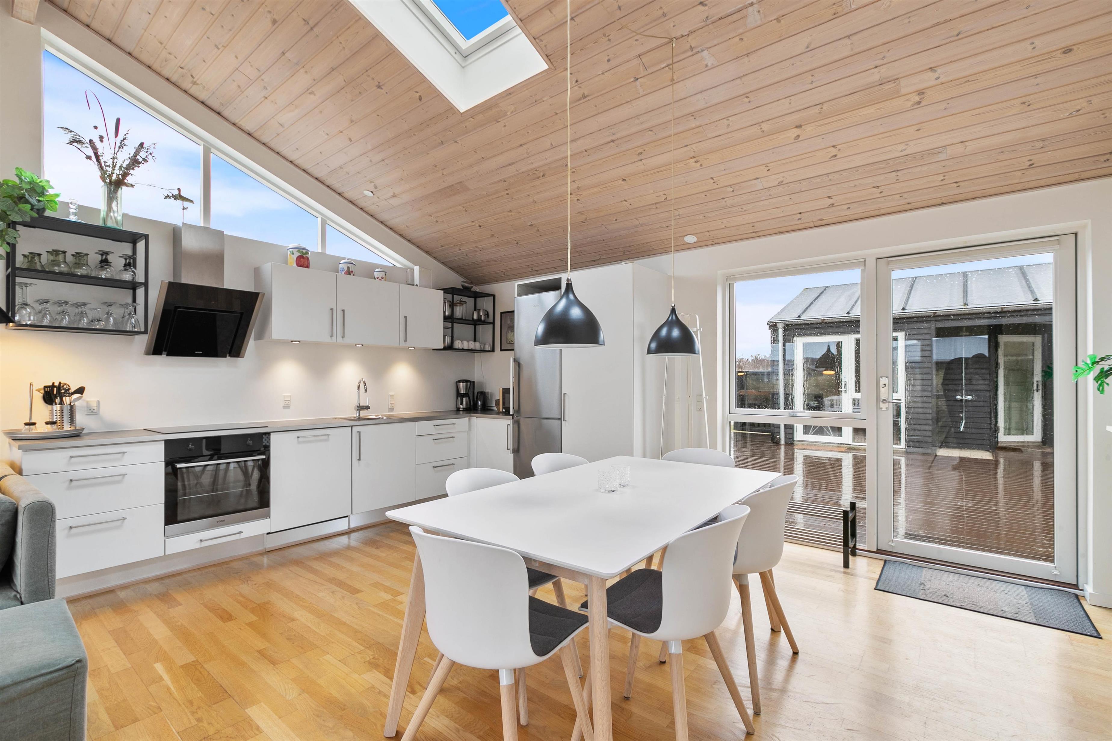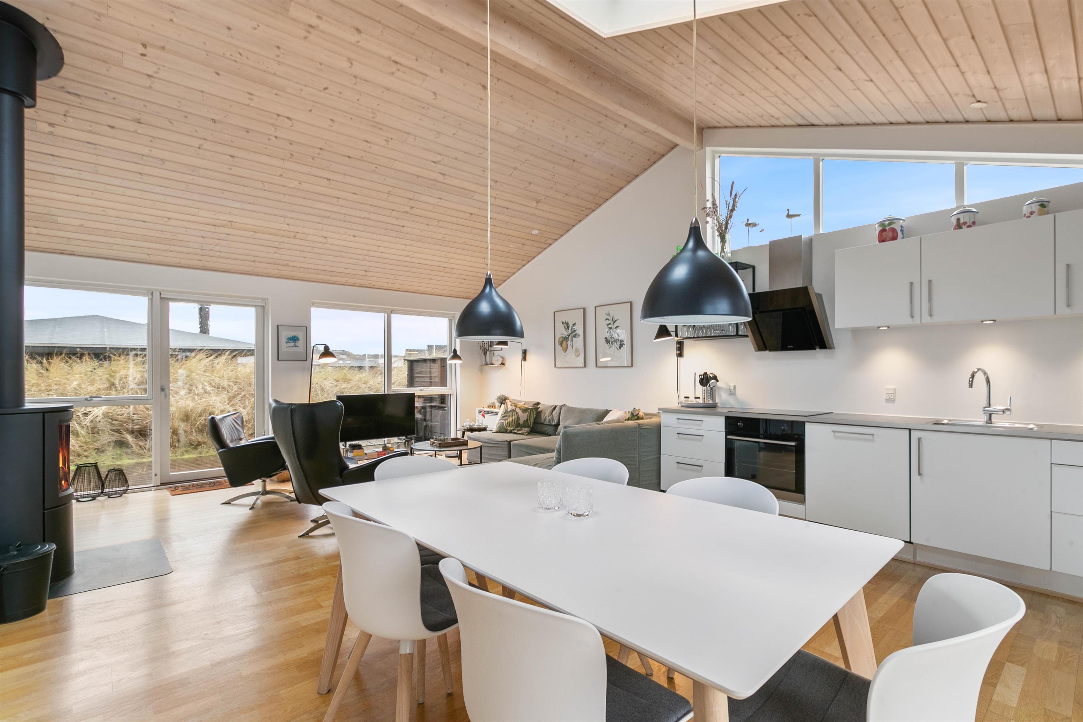 Lyset er en vigtig ingrediens i feriehusets indretning. Kombinationen af store vinduesfag, lyse vægge og lofter skaber en rolig og lys atmosfære i huset, som indbyder til afslapning og nærvær. Det flotte køkken ligger i åben forbindelse med spise- og opholdsrum, så familien kan være samlet og en energibesparende luft-til-luft varmepumpe sørger for et behageligt indeklima. Annekset med eget bad og soveværelse er ideelt for medrejsende teenager.