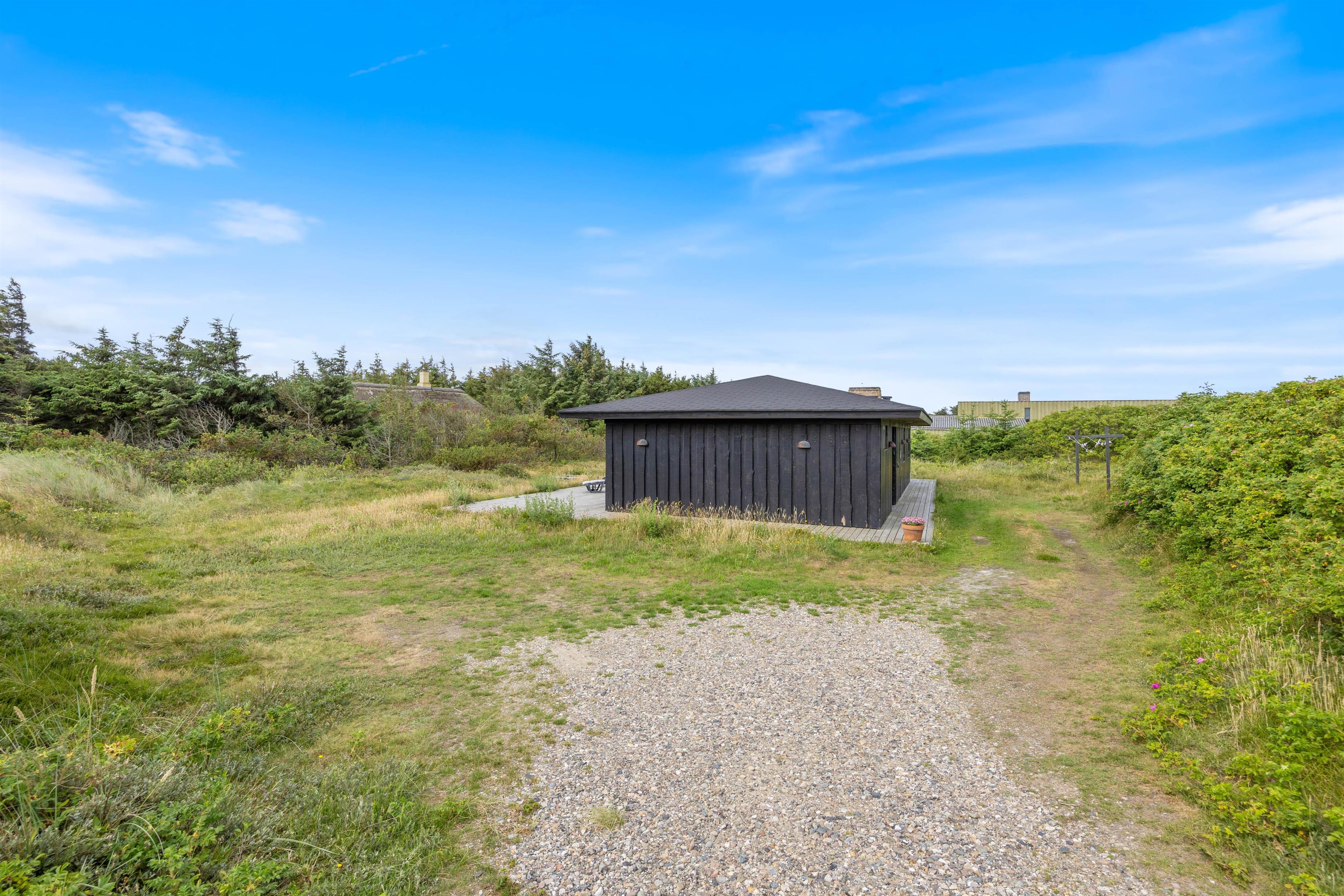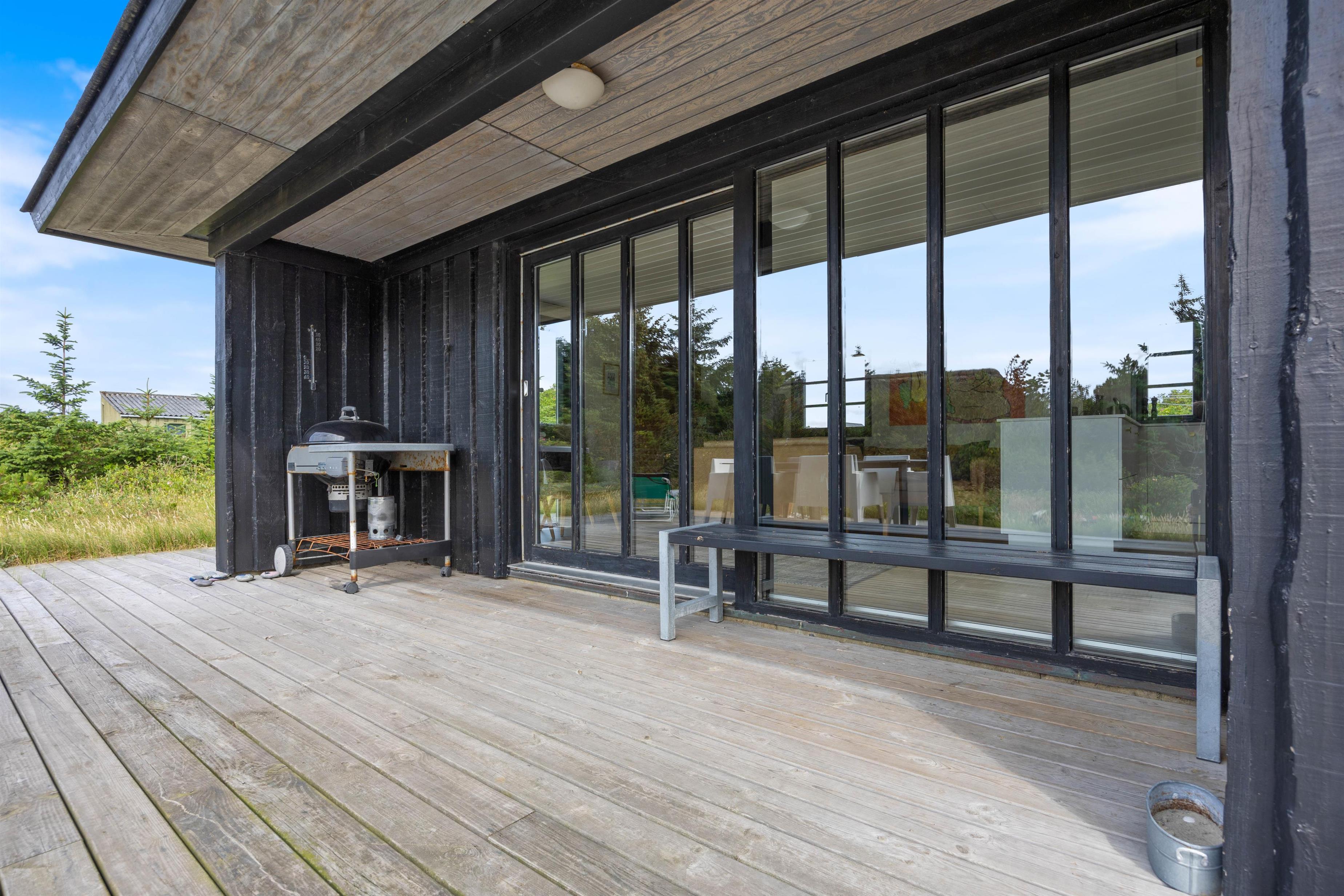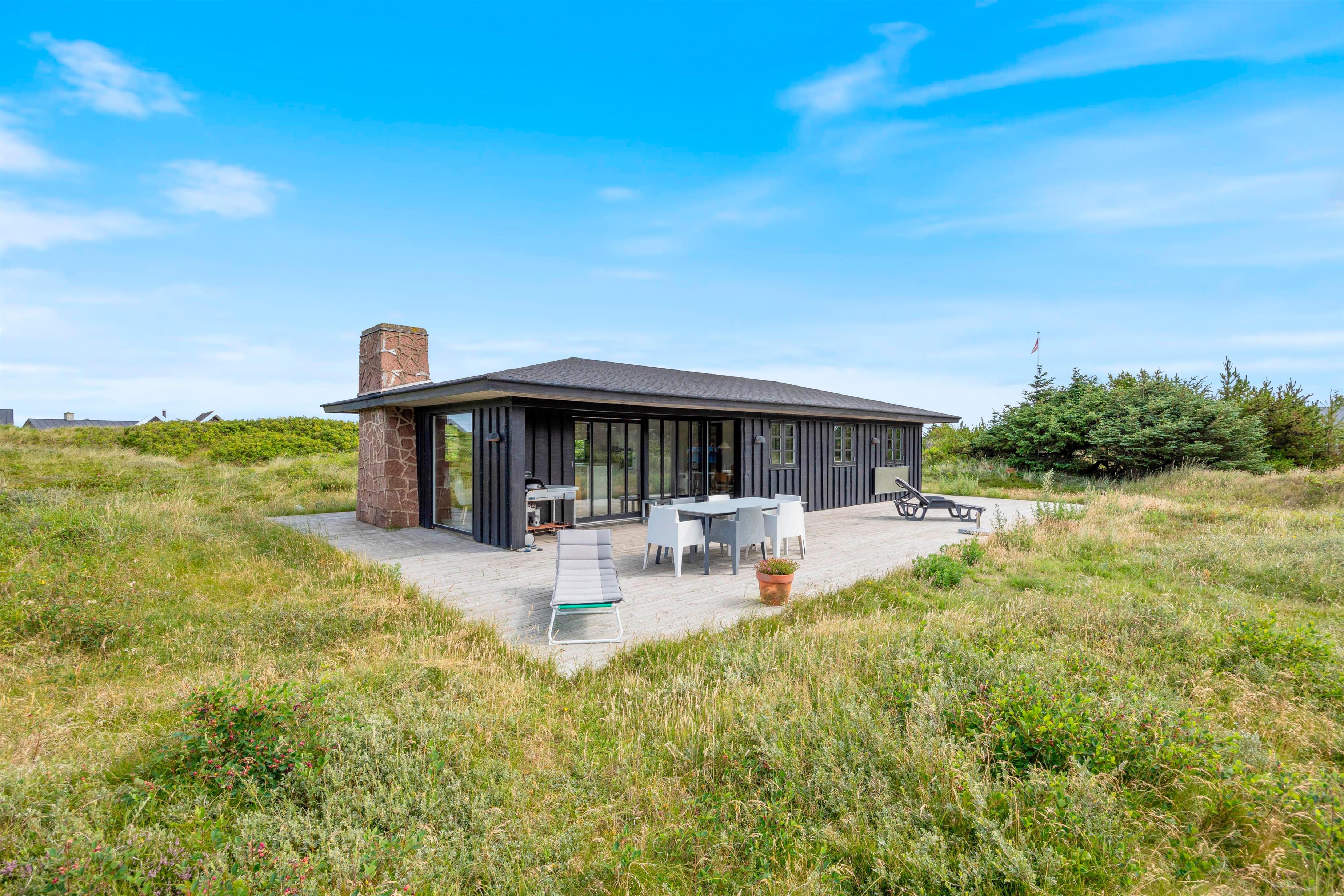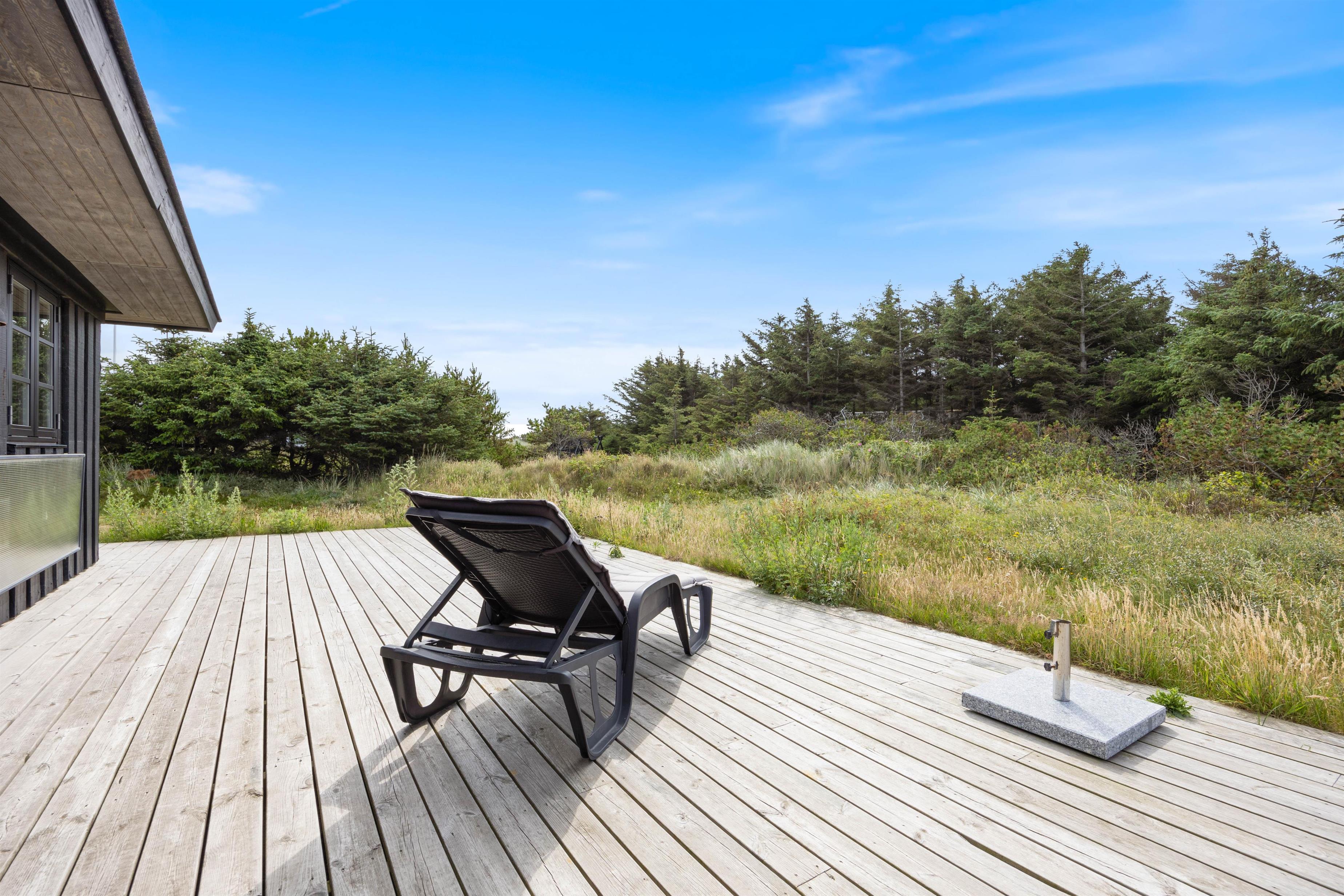 Rundt om huset går en lækker, stor terrasse, hvor I rigtig kan brede jer ud og nyde de solrige dage. Den naturskønne beliggenhed er helt ugeneret, og I har udsigt til det lyngklædte klitlandskab hele vejen rundt.