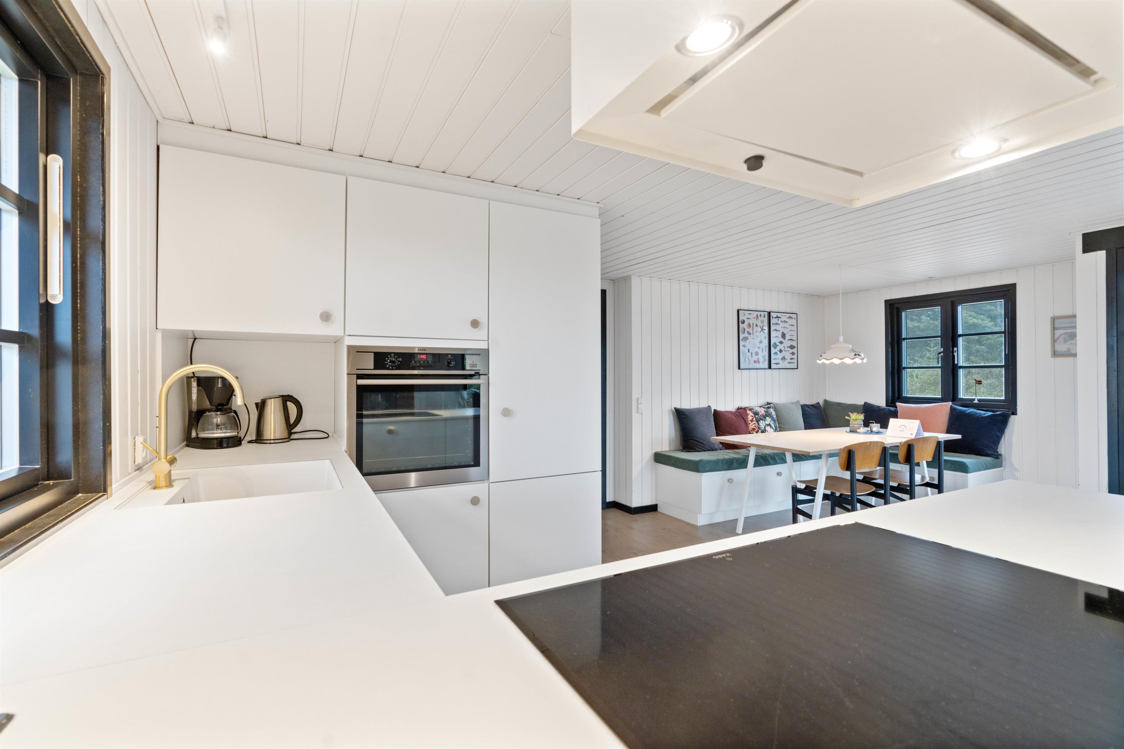 Det dejlige køkkenalrum i huset, er helt perfekt til at nyde en dejlig ferie. Her er god plads til jer alle, og I ville alle kunne finde lige netop jeres yndlingsspot i nogle af de lækre og komfortable møbler. Her er samtidig også flere store vinduespartier, hvilket altid er hyggeligt, da vinduerne lukker en masse god lys ind og gør, at I kan nyde den omkringliggende natur fra sofaen af.