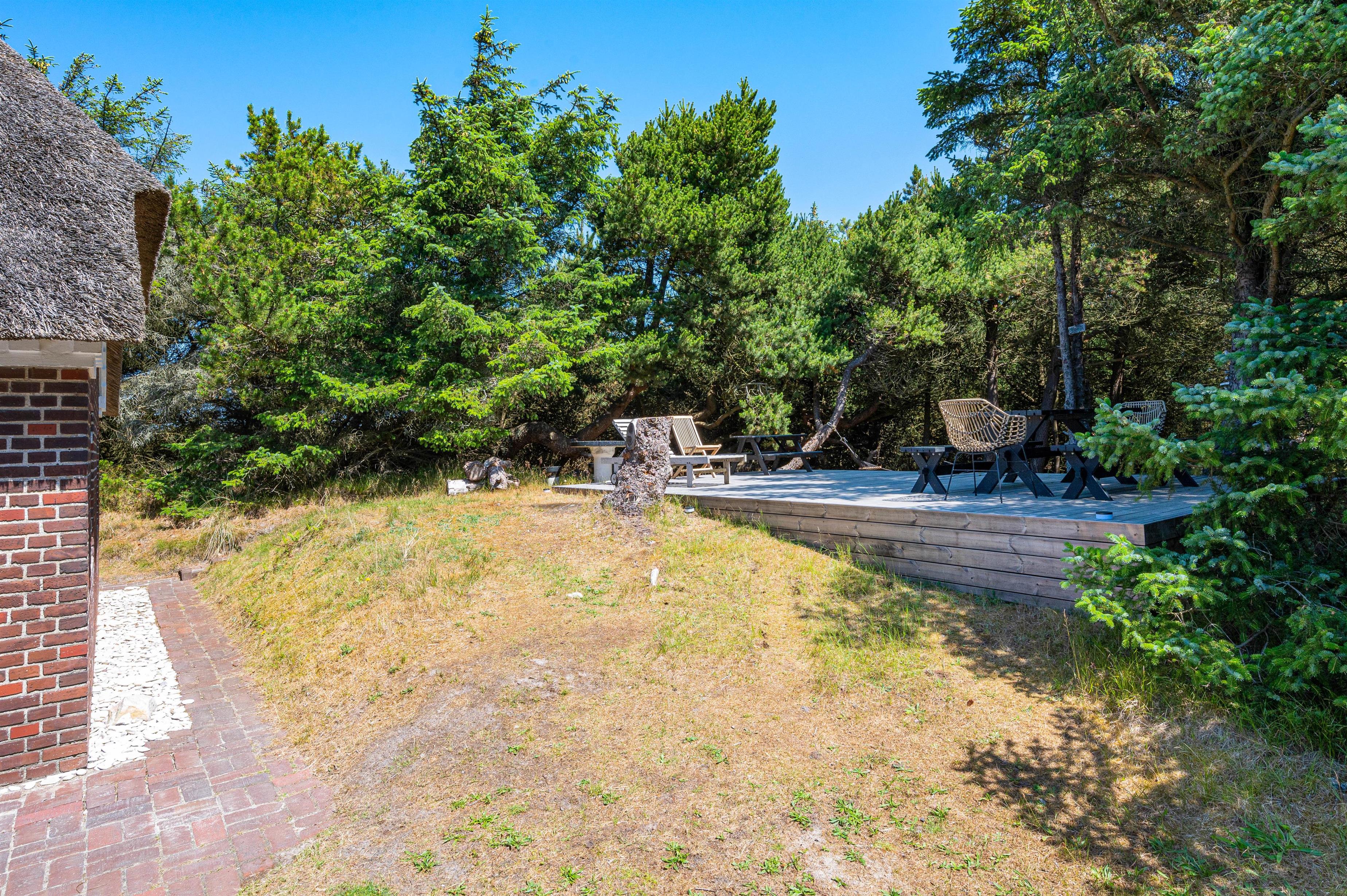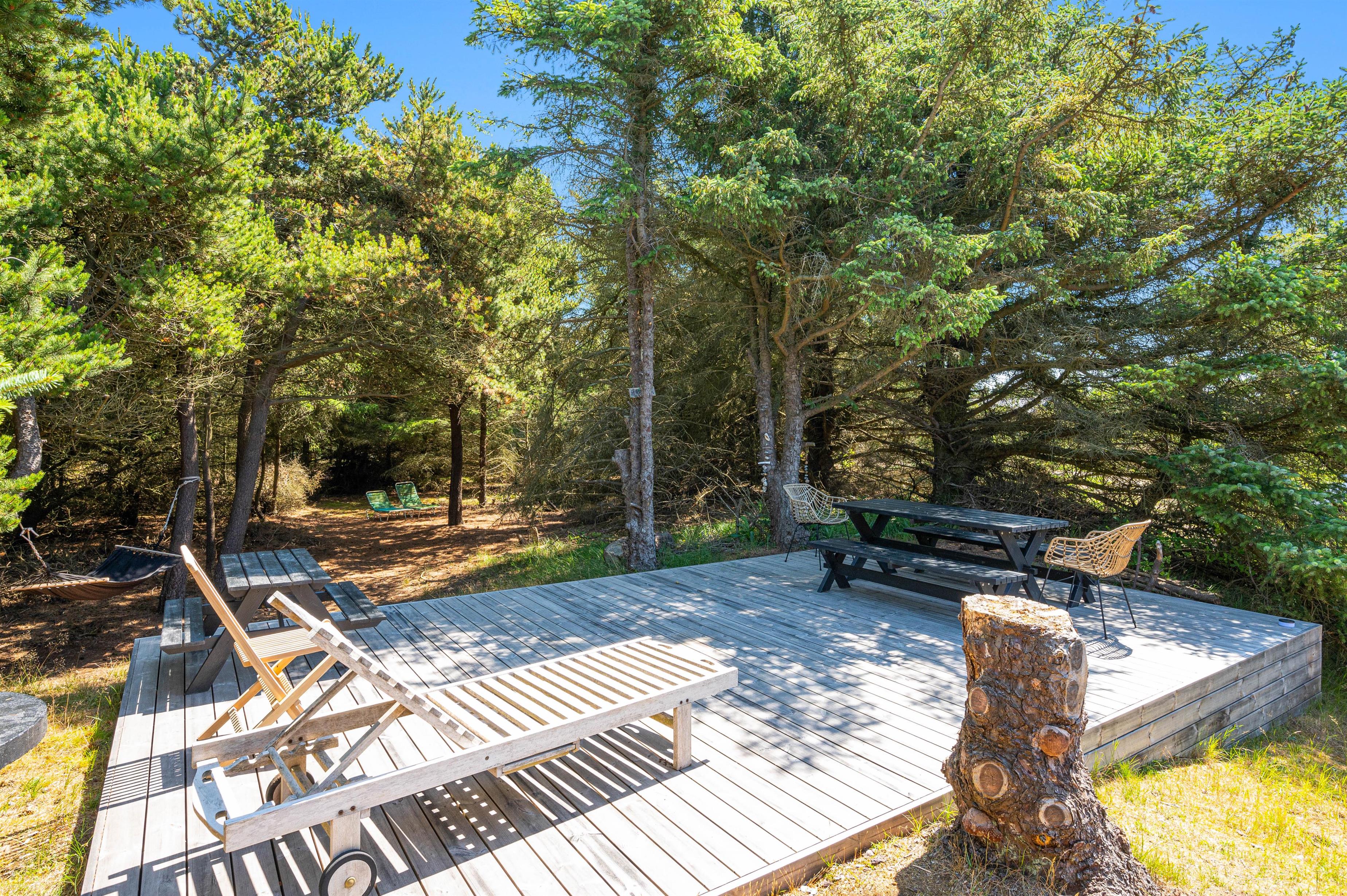Placeringen af dette sommerhus, så tæt på den yderste klitrække og på en unik beliggenhed, er intet mindre end enestående. Huset ligger ugeneret for enden af en stille og rolig vej og er i fuldstændig pagt med naturen. I skal ikke træde mange skridt ud ad døren, førend I har sand mellem tæerne. Grunden er tillige omkranset af høje nåletræer, der giver illusionen af at befinde sig i sin helt egen lille oase med egen skov.