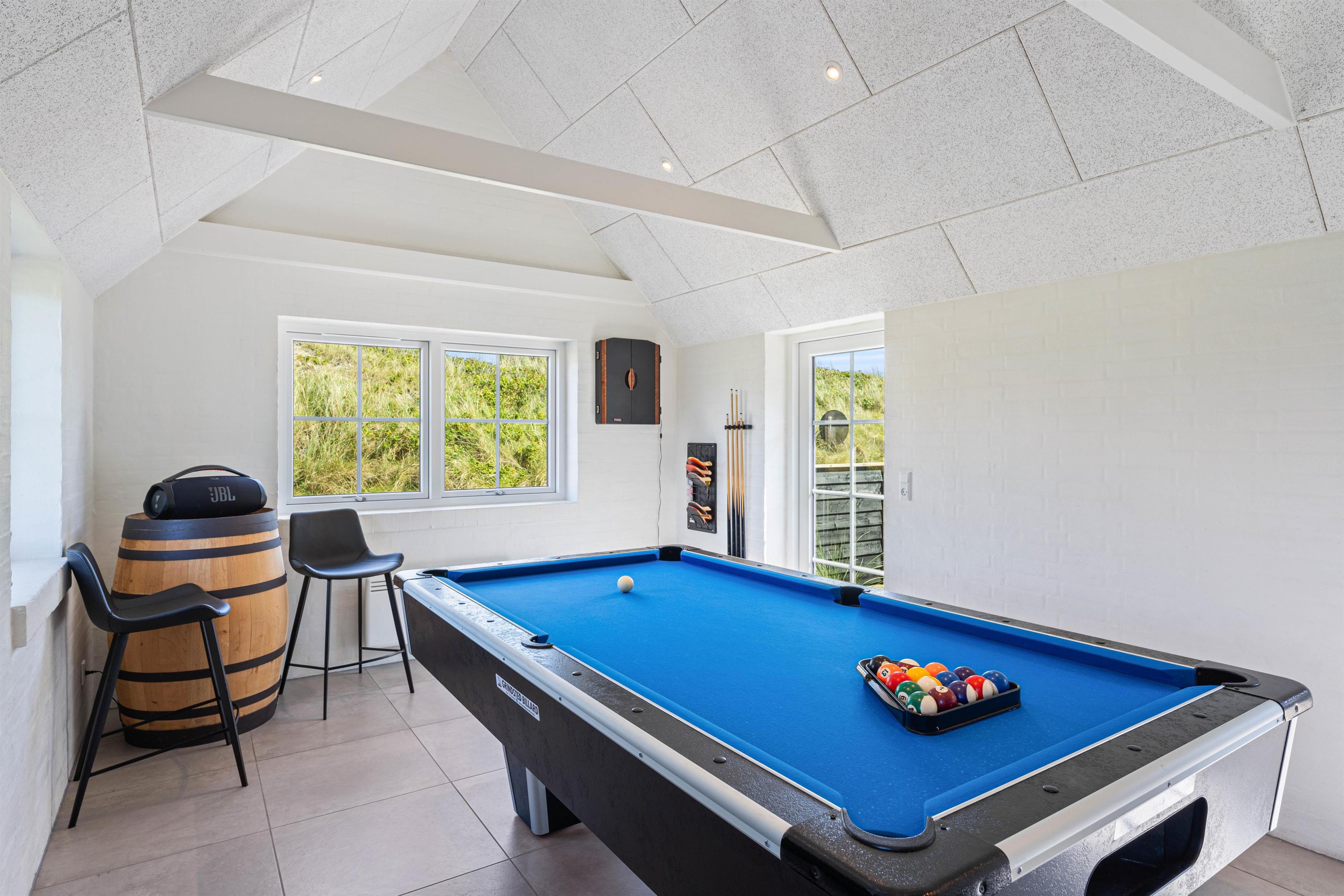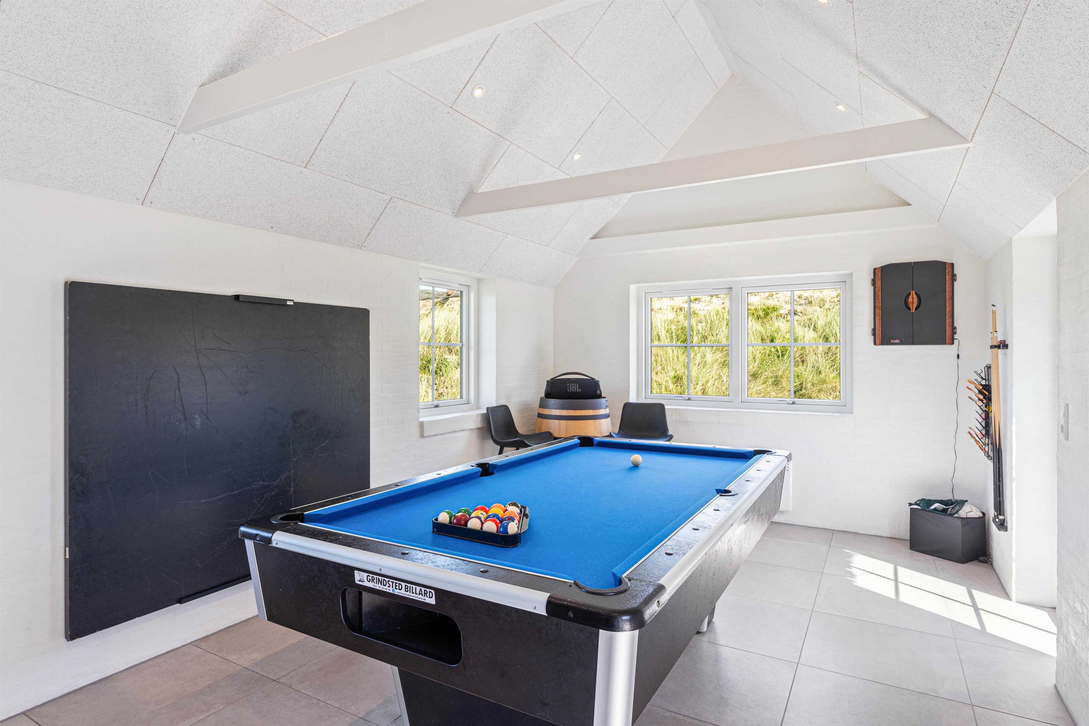 Der er sørget for underholdning i form af et dart, billard- og bordtennisbord, og huset har også et ekstra tv.