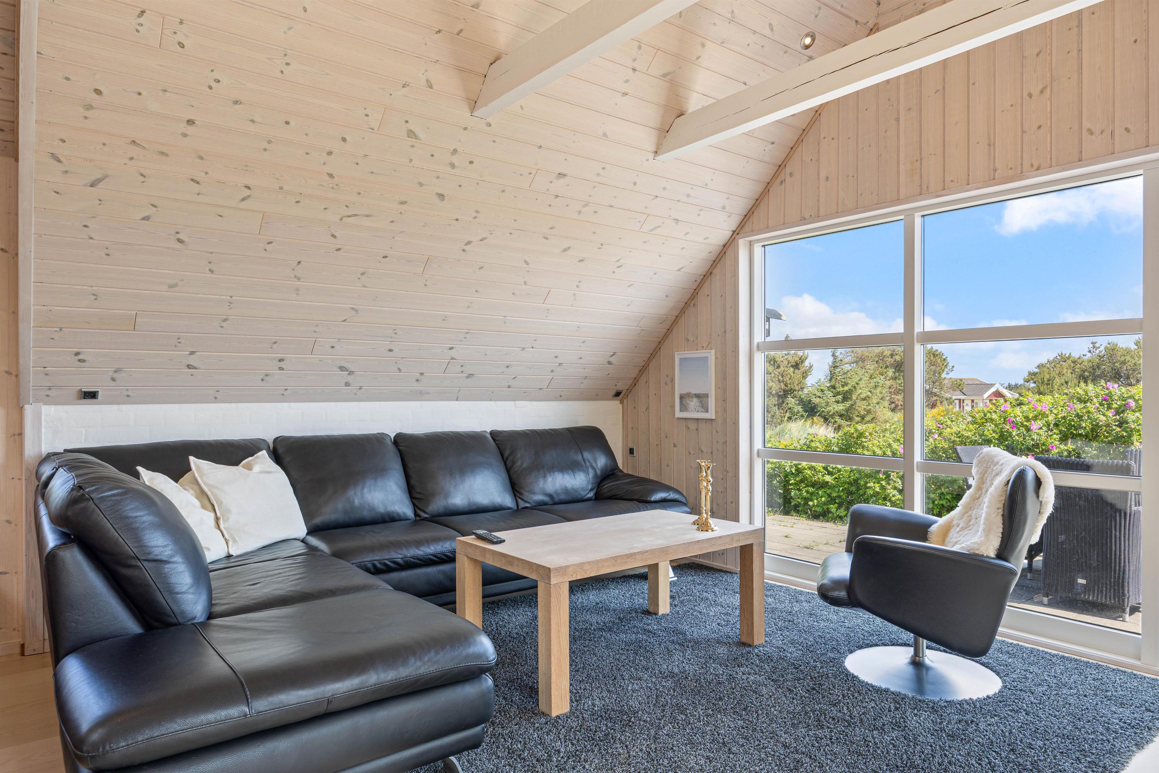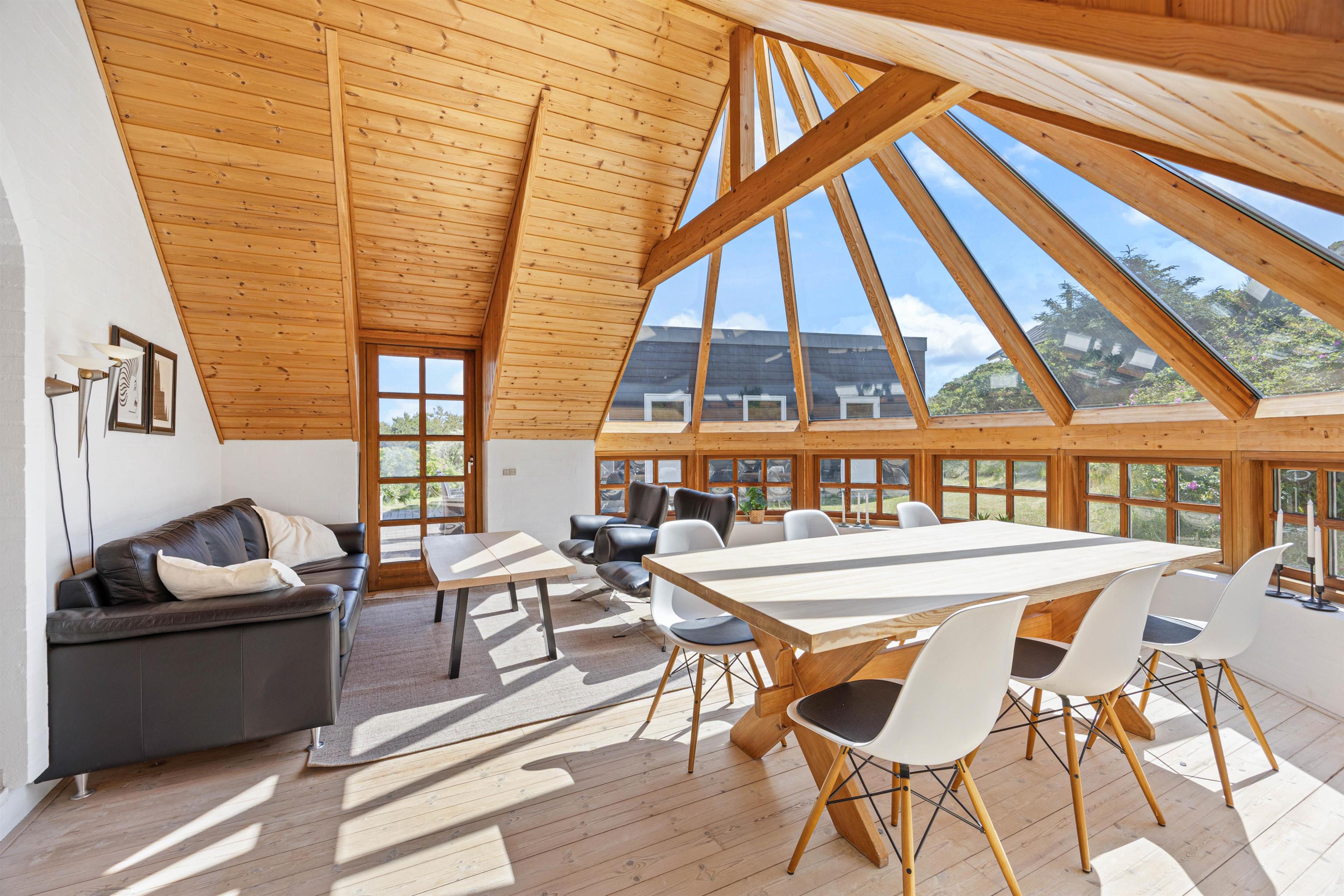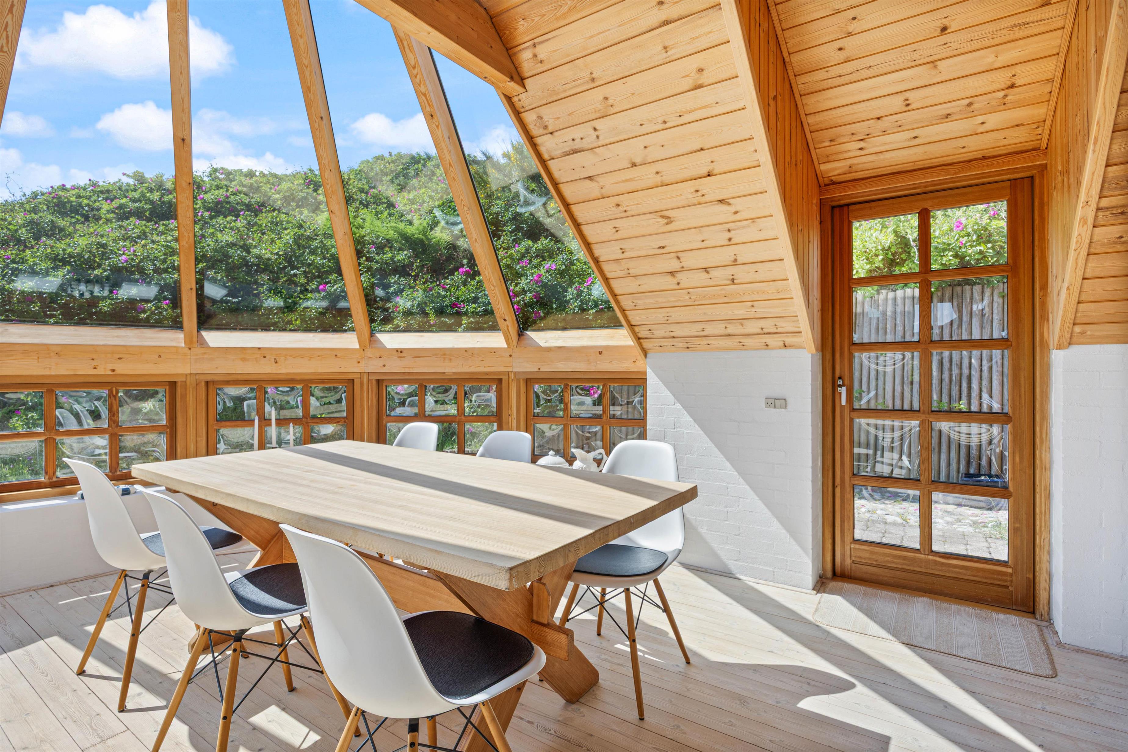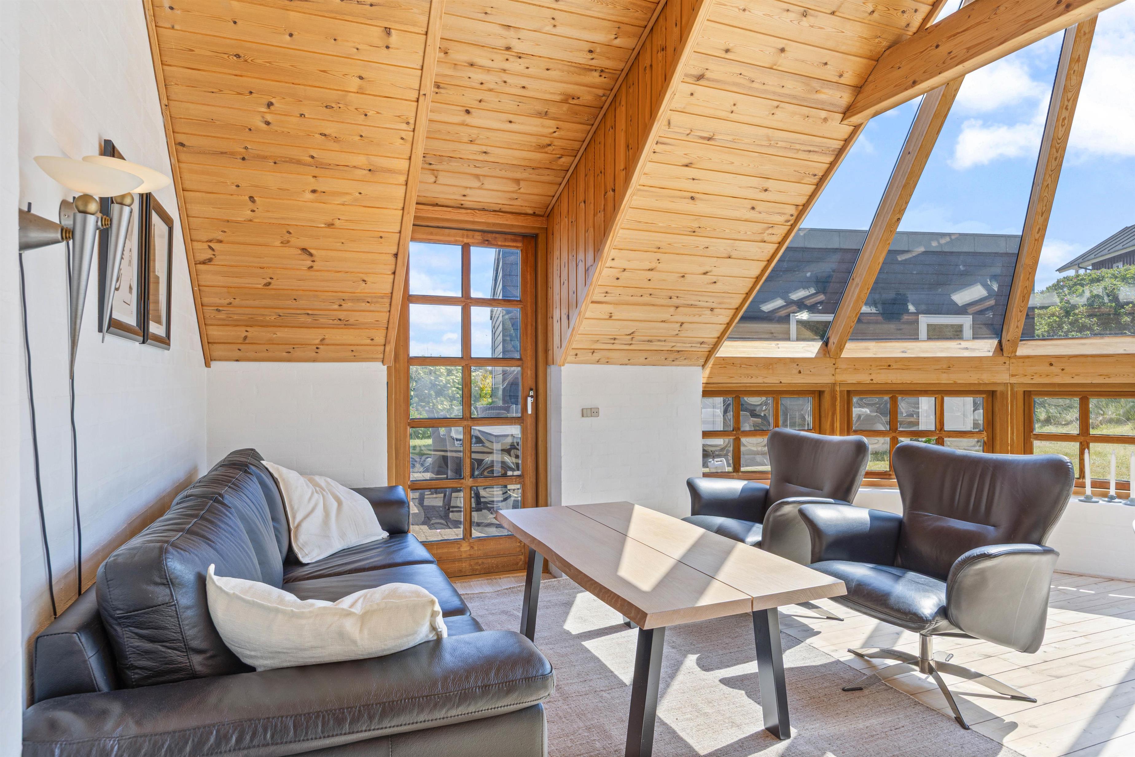 En af de mest fremtrædende funktioner ved dette sommerhus i Søndervig er den charmerende udestue. Dette dejlige rum bliver hurtigt en favorit, hvor I kan trække jer tilbage med en bog eller nyde middagen i det naturlige lys fra det store vinduesparti. Uanset om solen skinner eller regnen trommer mod ruden, tilbyder udestuen en perfekt kulisse for afslapning og hygge.