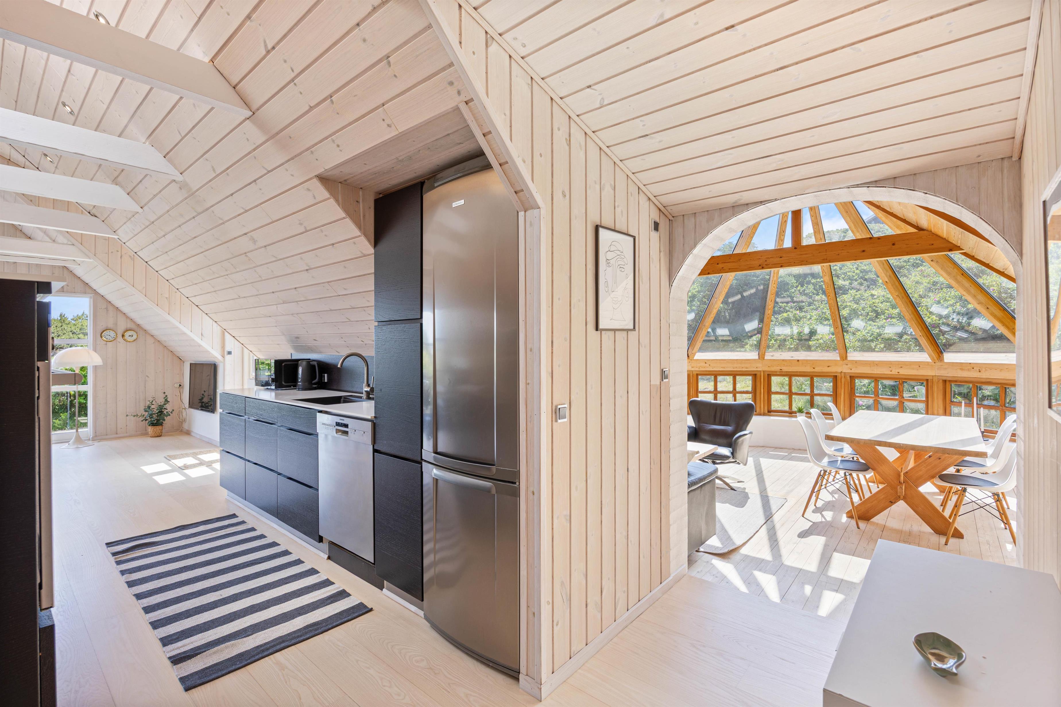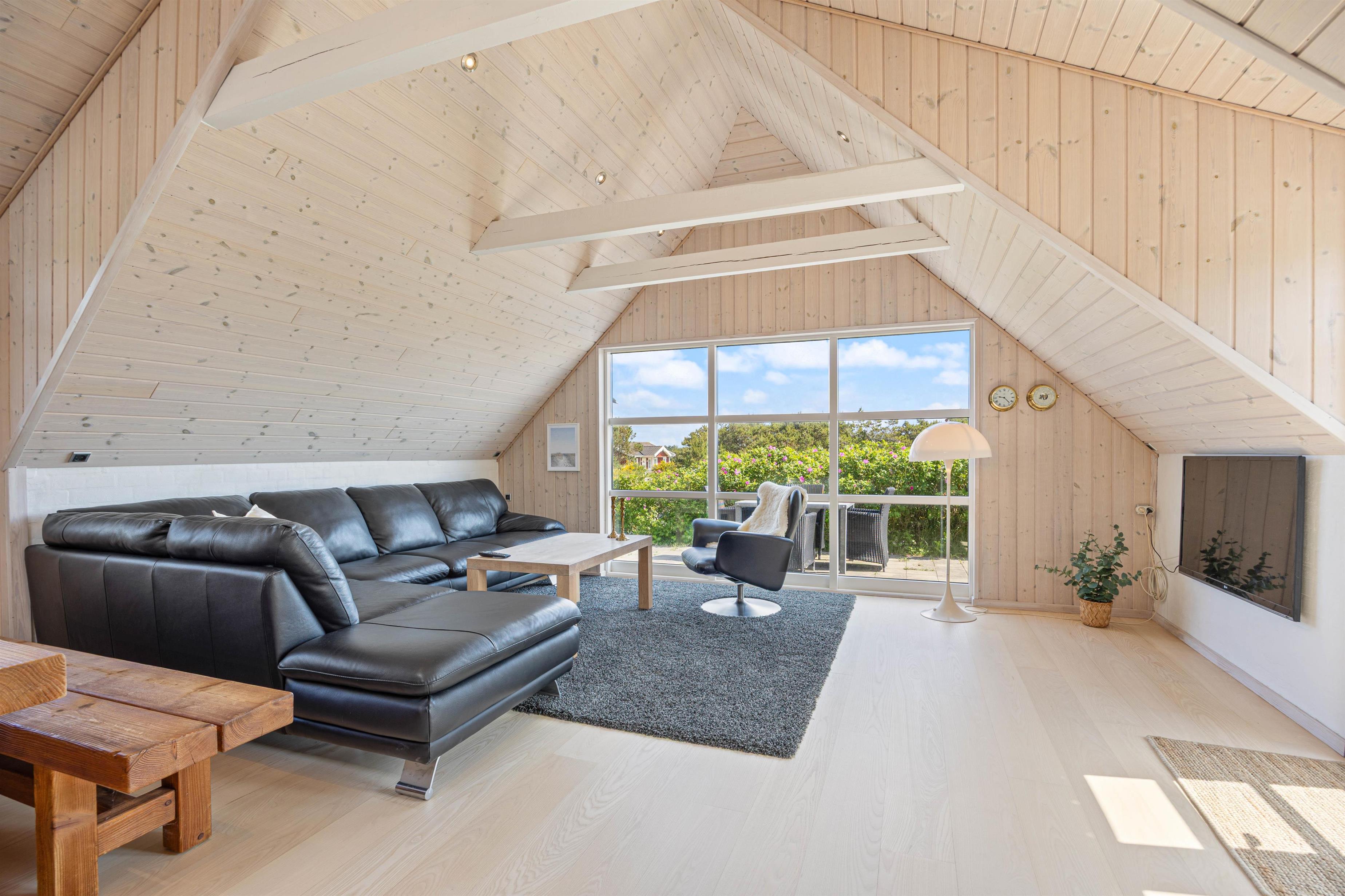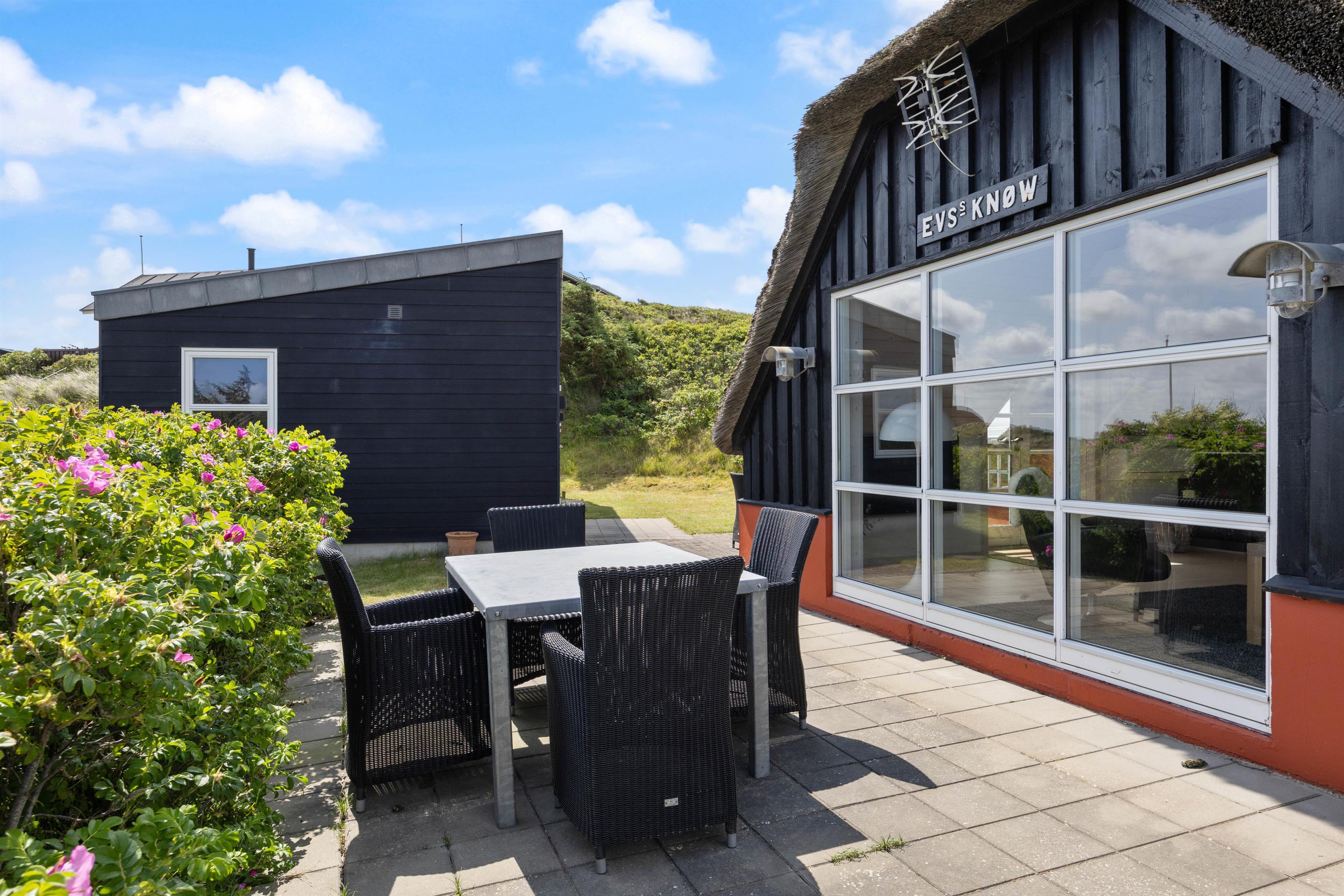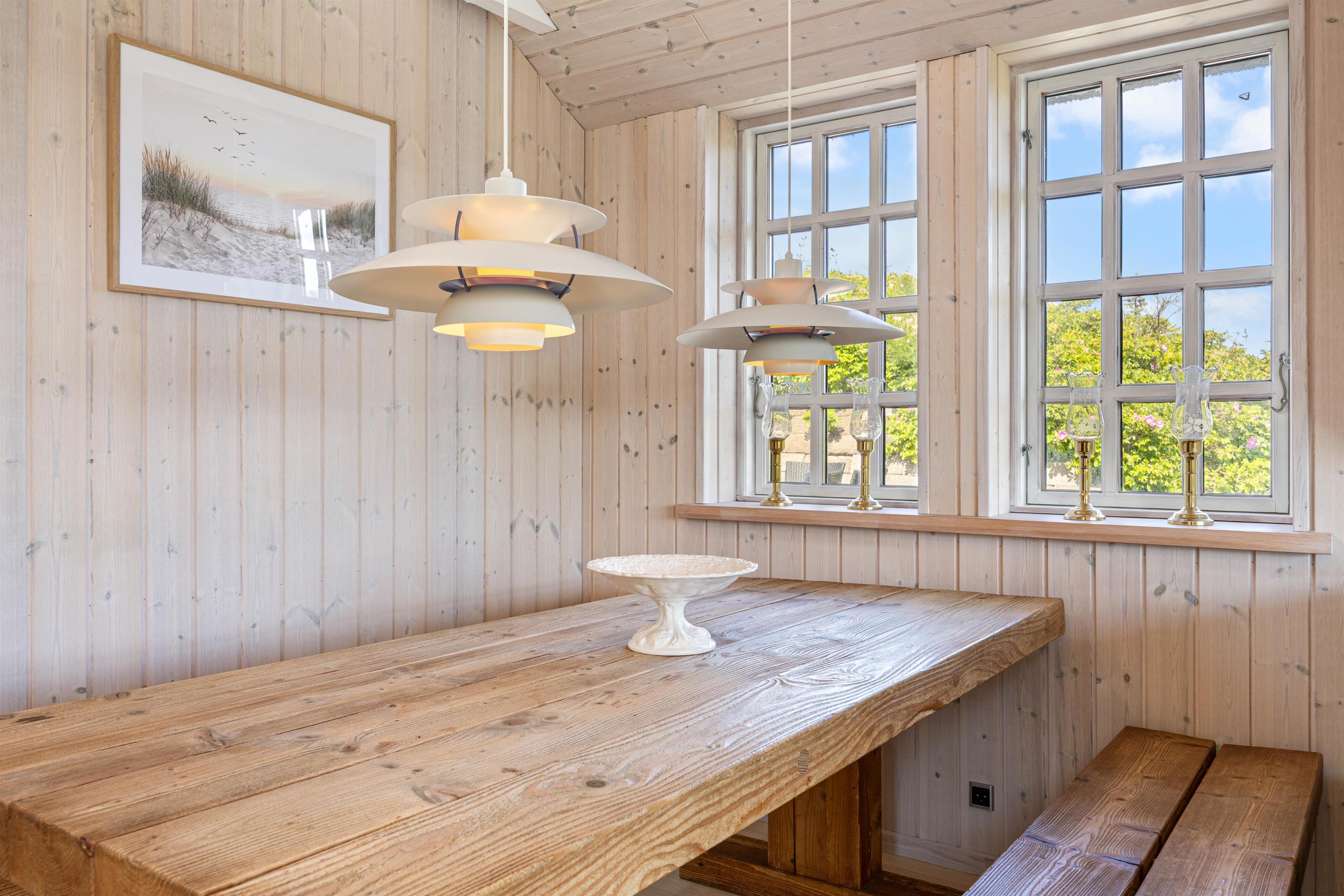 En af de mest fremtrædende funktioner ved dette sommerhus i Søndervig er den charmerende udestue. Dette dejlige rum bliver hurtigt en favorit, hvor I kan trække jer tilbage med en bog eller nyde middagen i det naturlige lys fra det store vinduesparti. Uanset om solen skinner eller regnen trommer mod ruden, tilbyder udestuen en perfekt kulisse for afslapning og hygge.